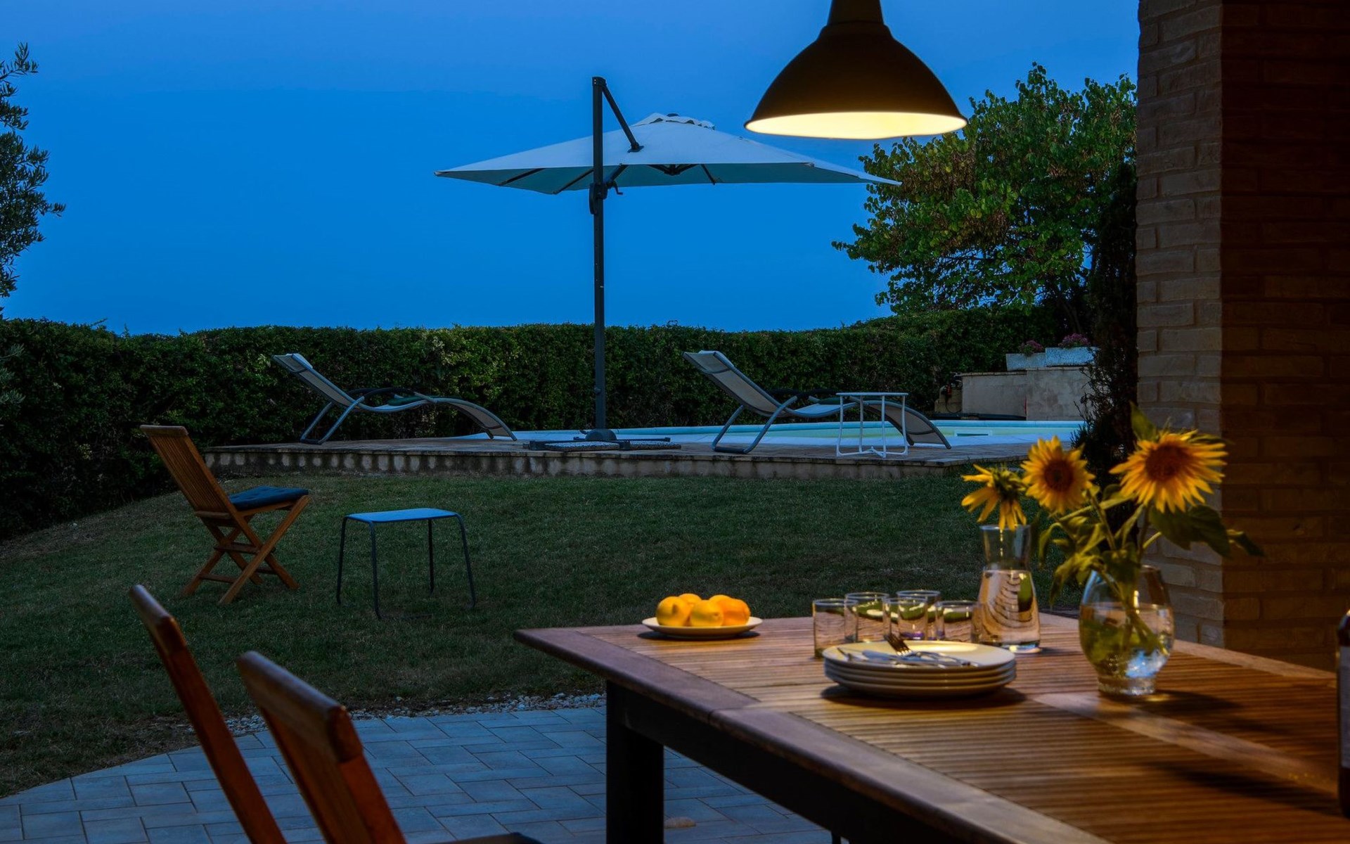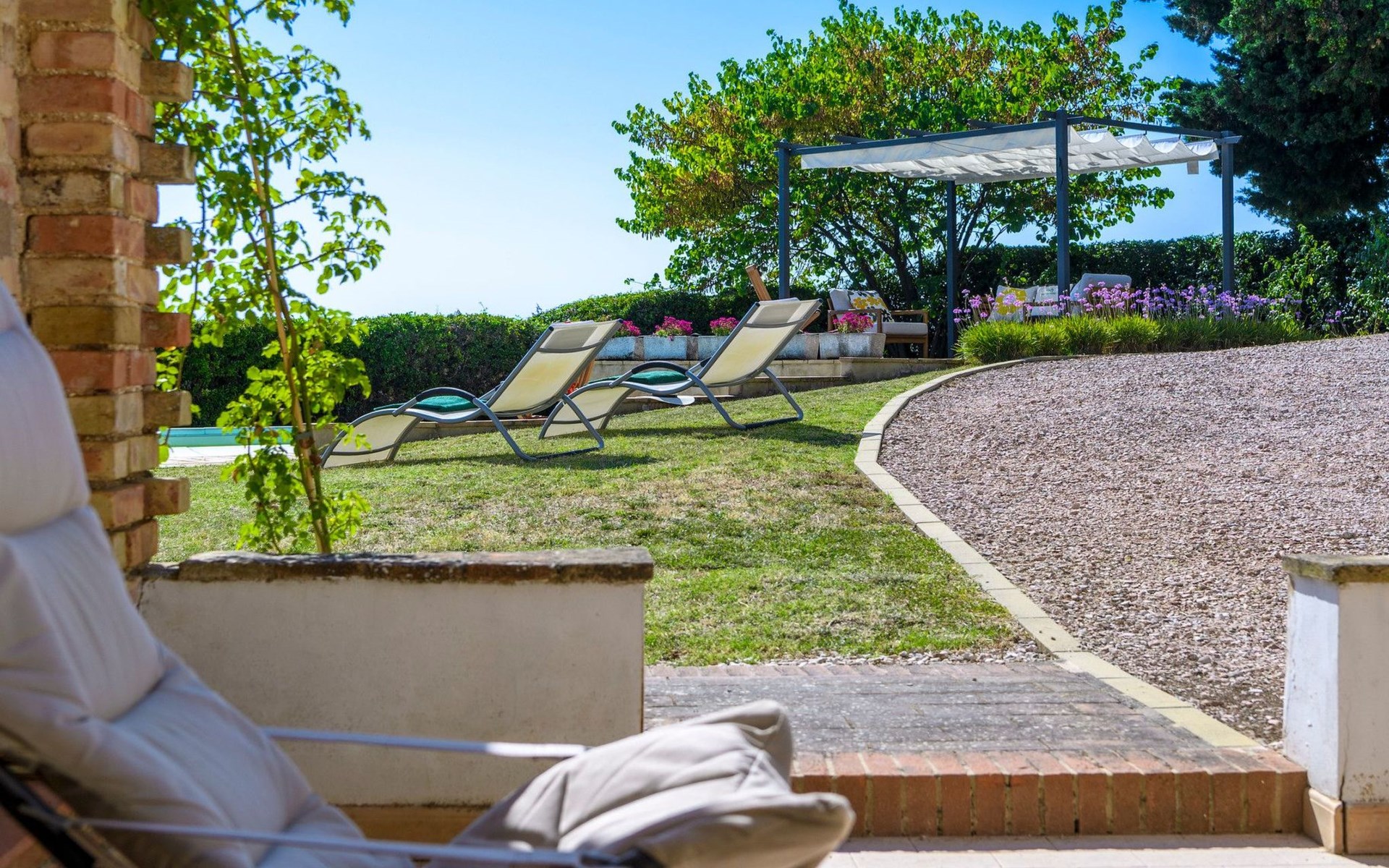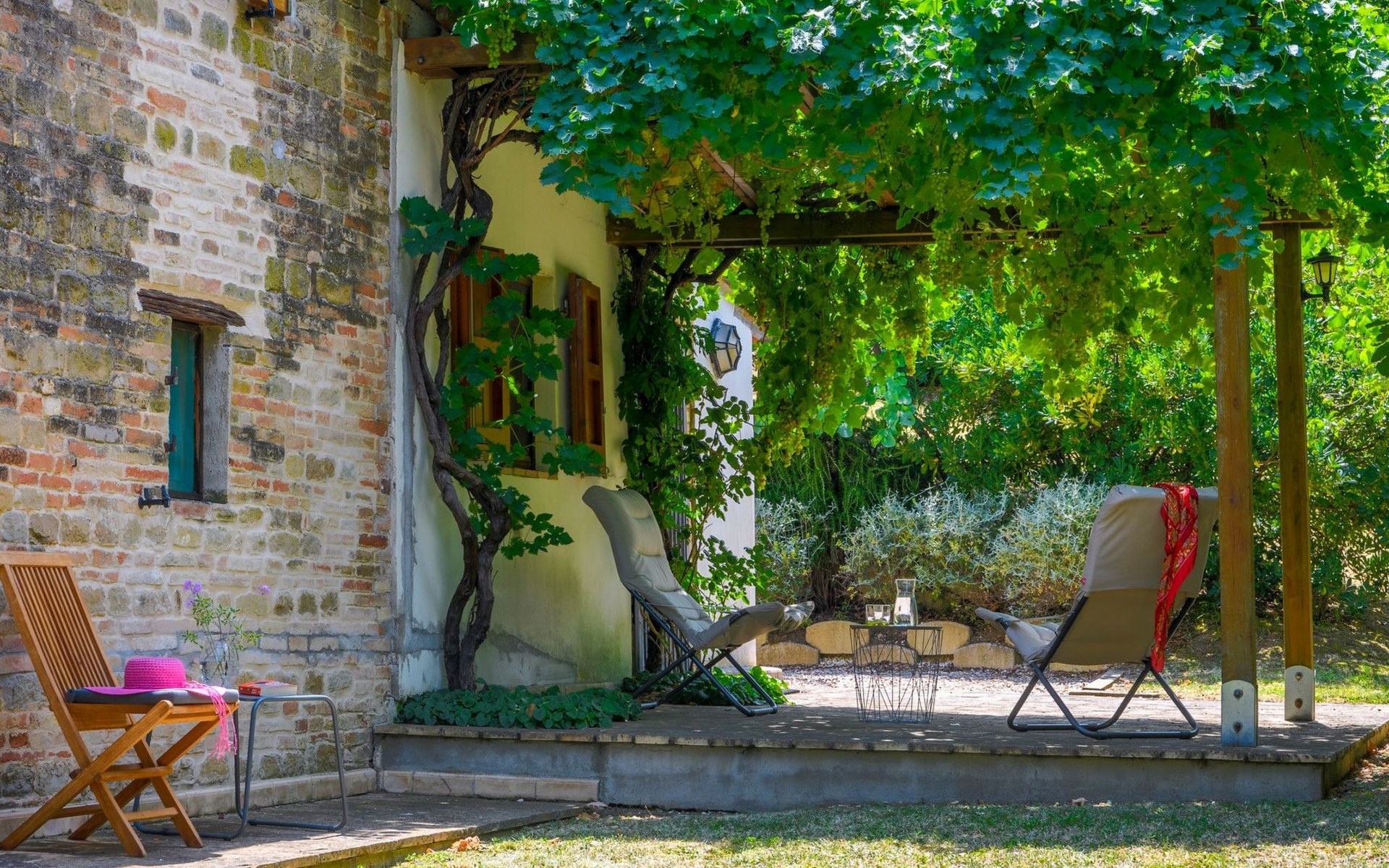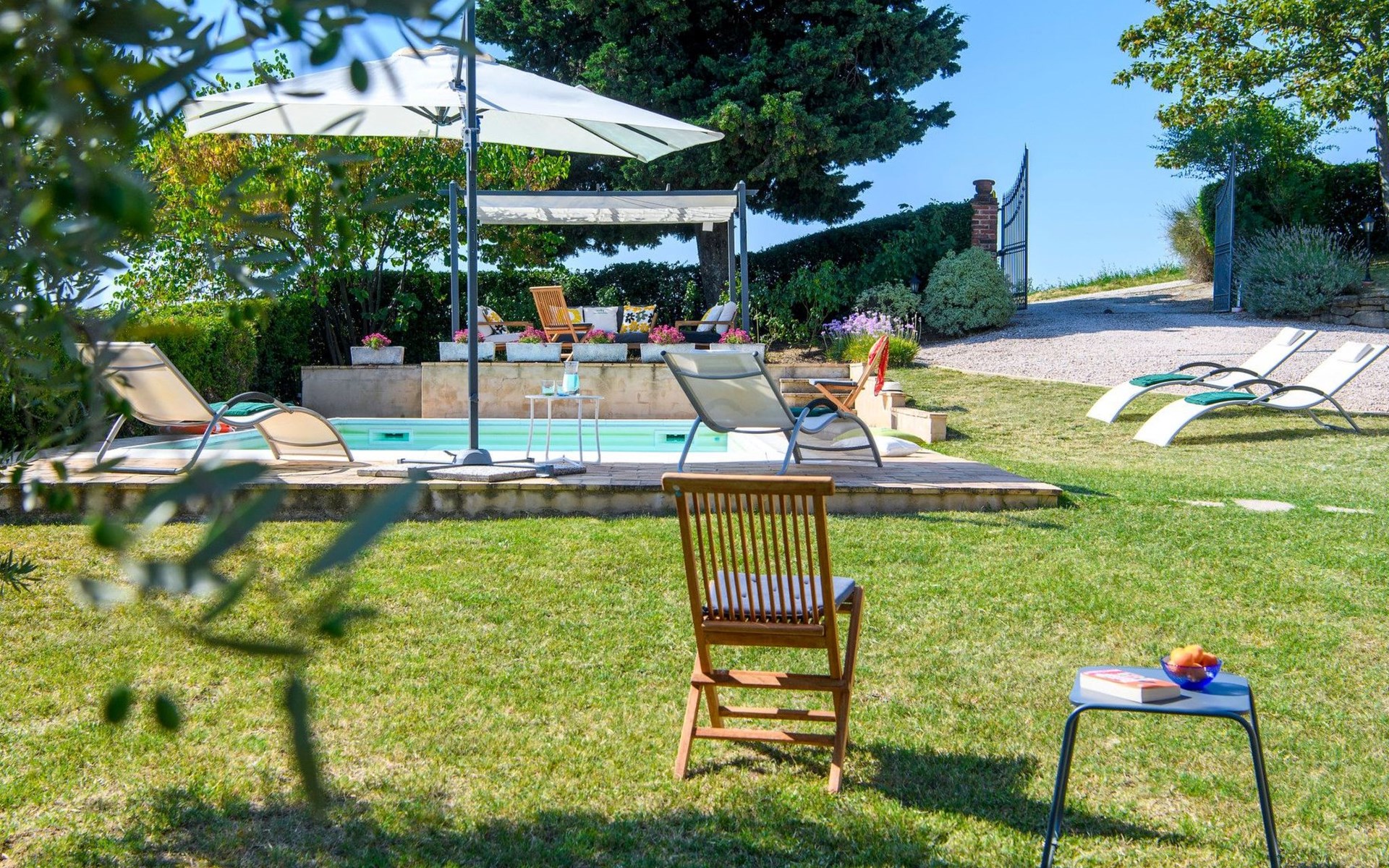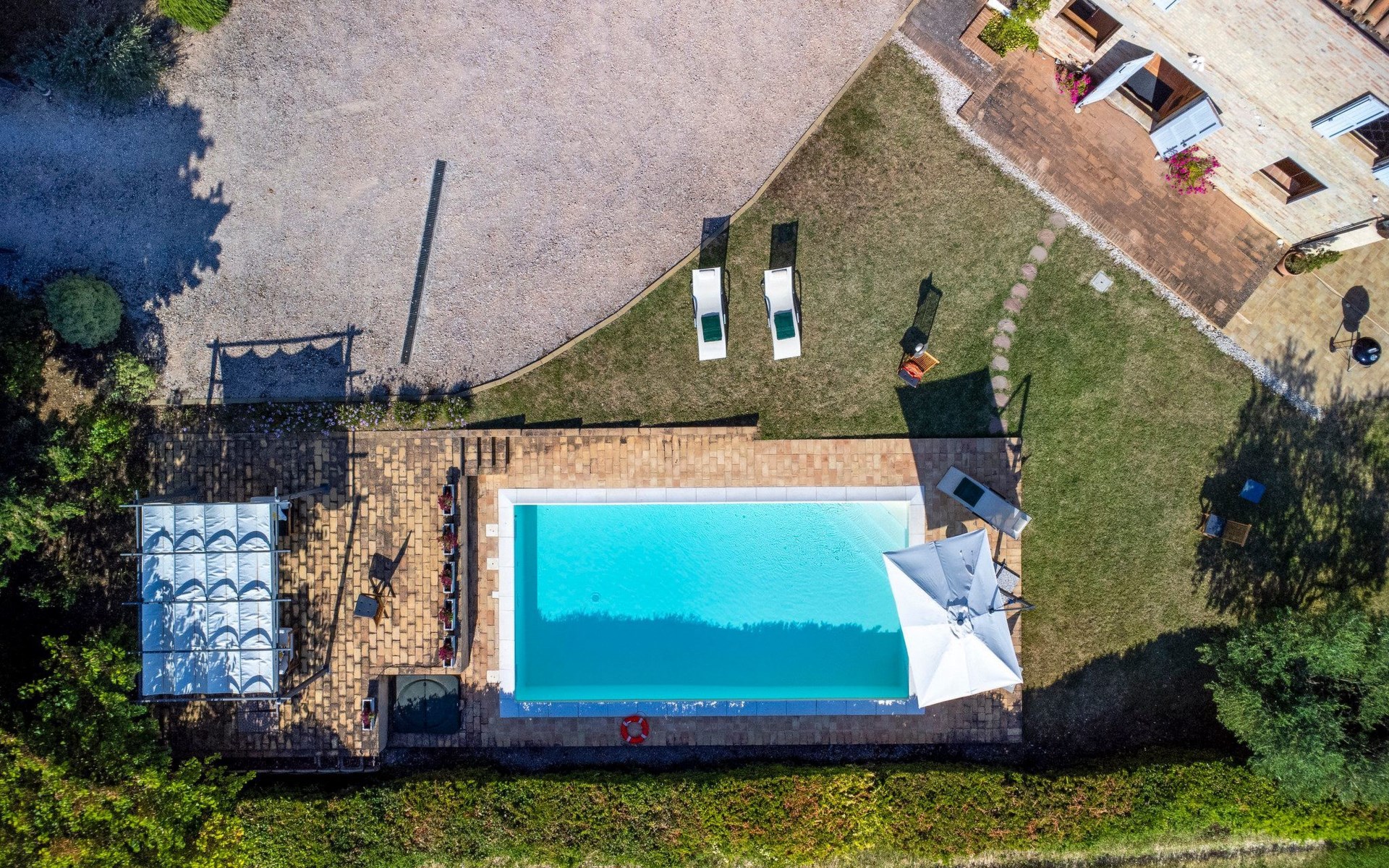 Das Grundstück ist komplett eingezäunt, der Swimmingpool lädt zu einem erfrischenden Bad ein und unter dem Pavillon kann man sich auf den Sofas entspannen und die Aussicht genießen, oder für die Aktiven Tischtennis spielen. Auf der Rückseite des Hauses gibt es eine schöne Pergola, die von Weinreben beschattet wird, eine ruhige Ecke, die von Grün umgeben ist.