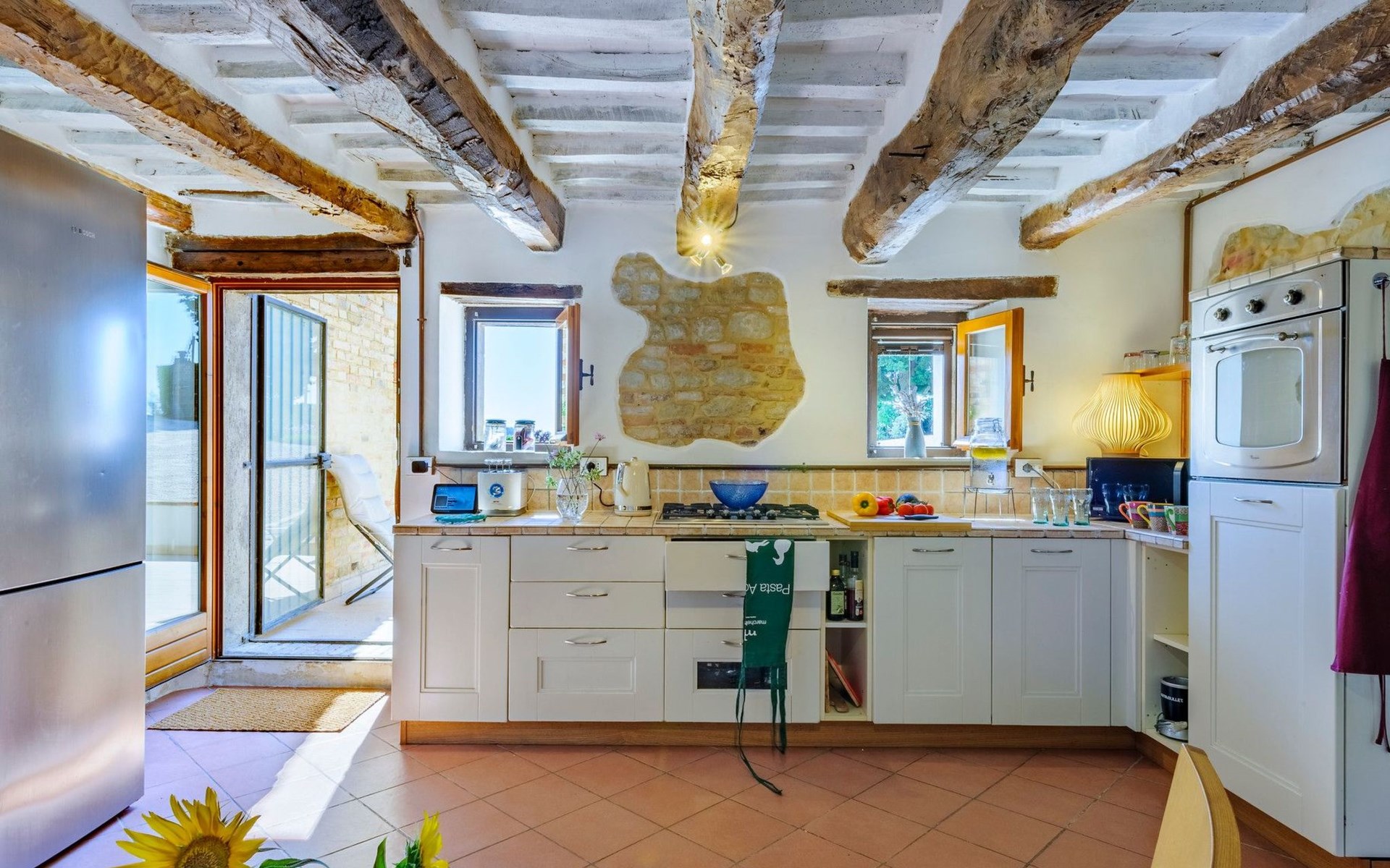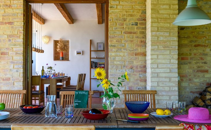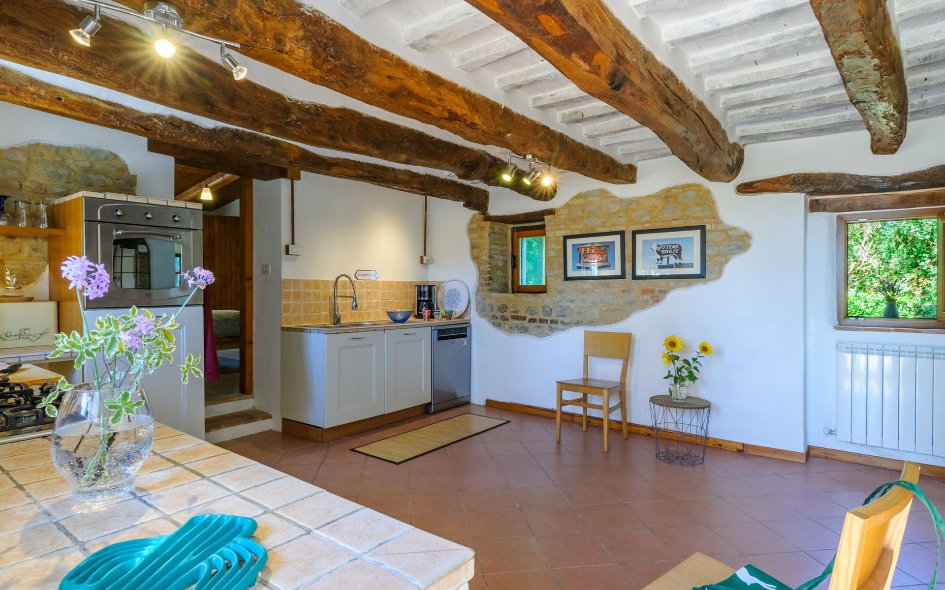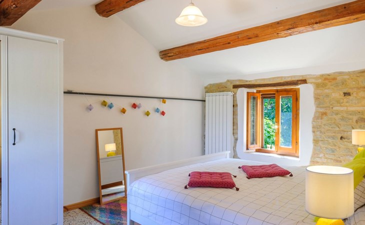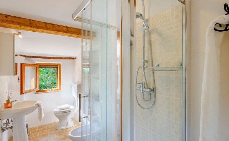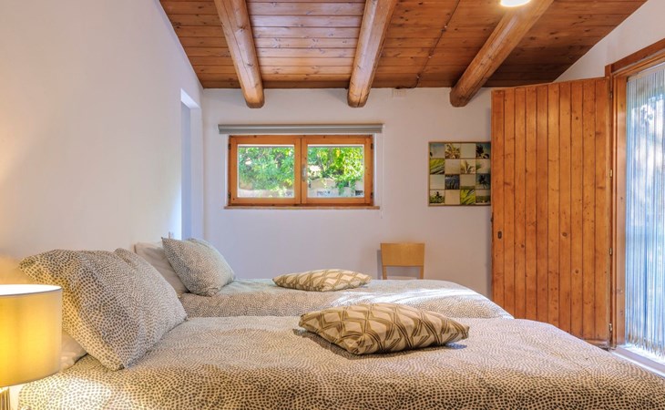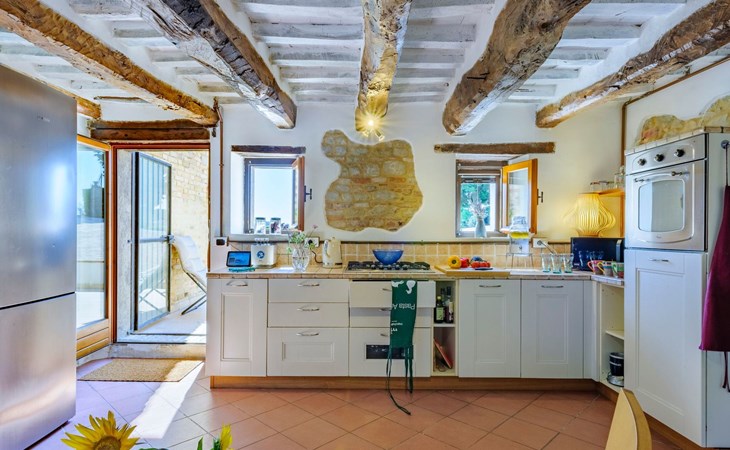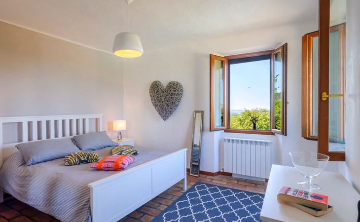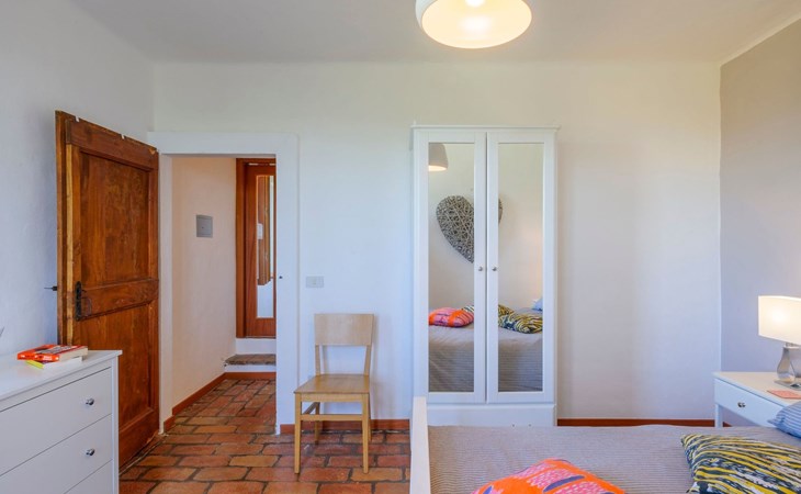 Im Erdgeschoss befindet sich ein großes und helles Wohnzimmer mit Essecke und Blick auf die Loggia, die zum Essen und Entspannen im Freien einlädt und über einen Holzofen verfügt. Die gut ausgestattete Küche hat einen direkten Ausgang nach draußen, dann finden wir ein Doppelzimmer mit Klimaanlage, ein Bad mit Dusche und die Waschküche. Im ersten Stock gibt es 3 Doppelzimmer und 2 Bäder, eines mit Dusche und eines mit Badewanne.