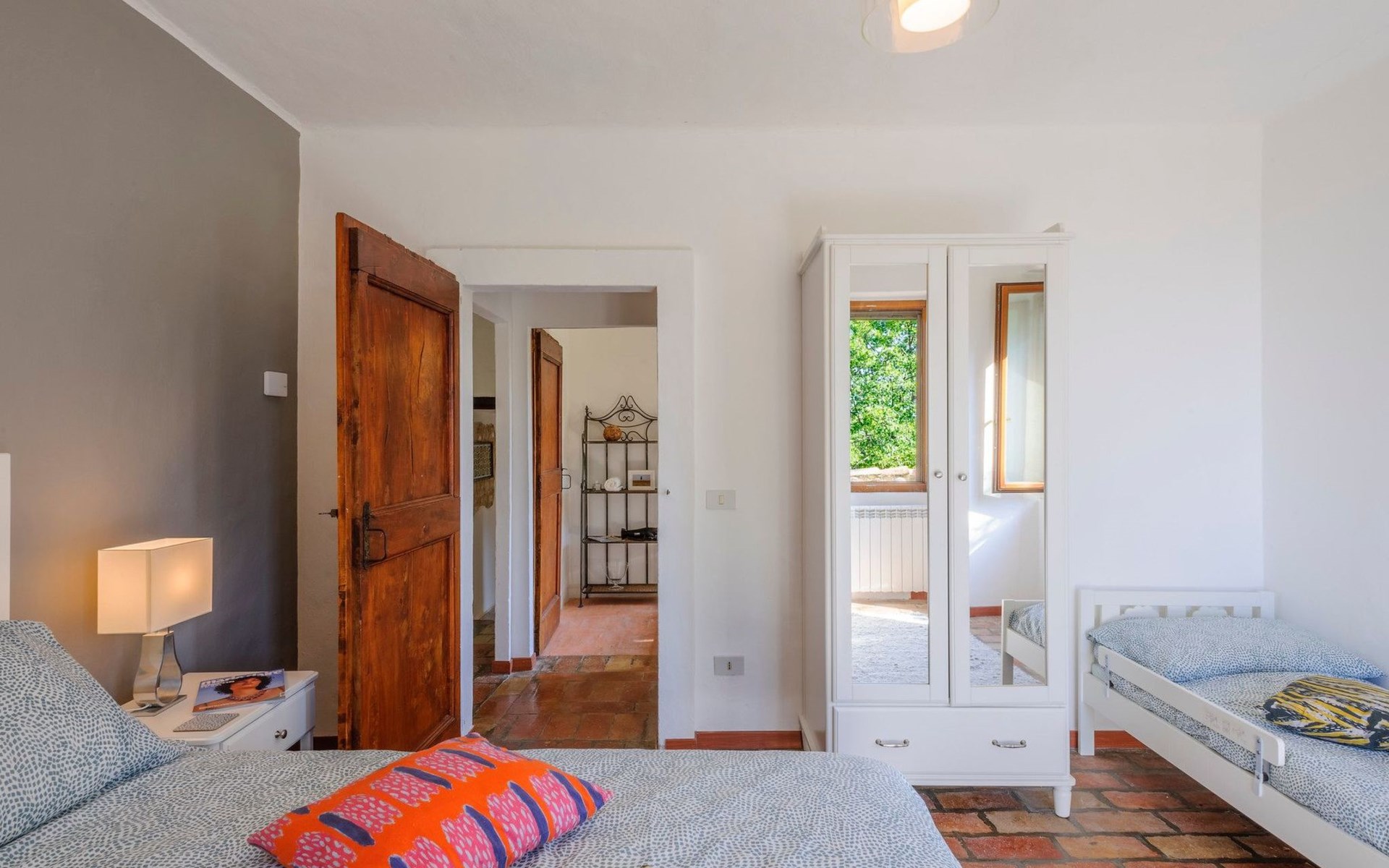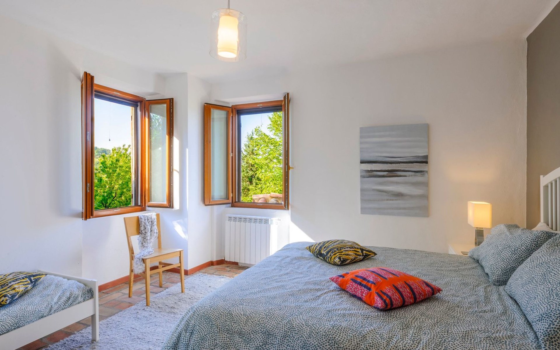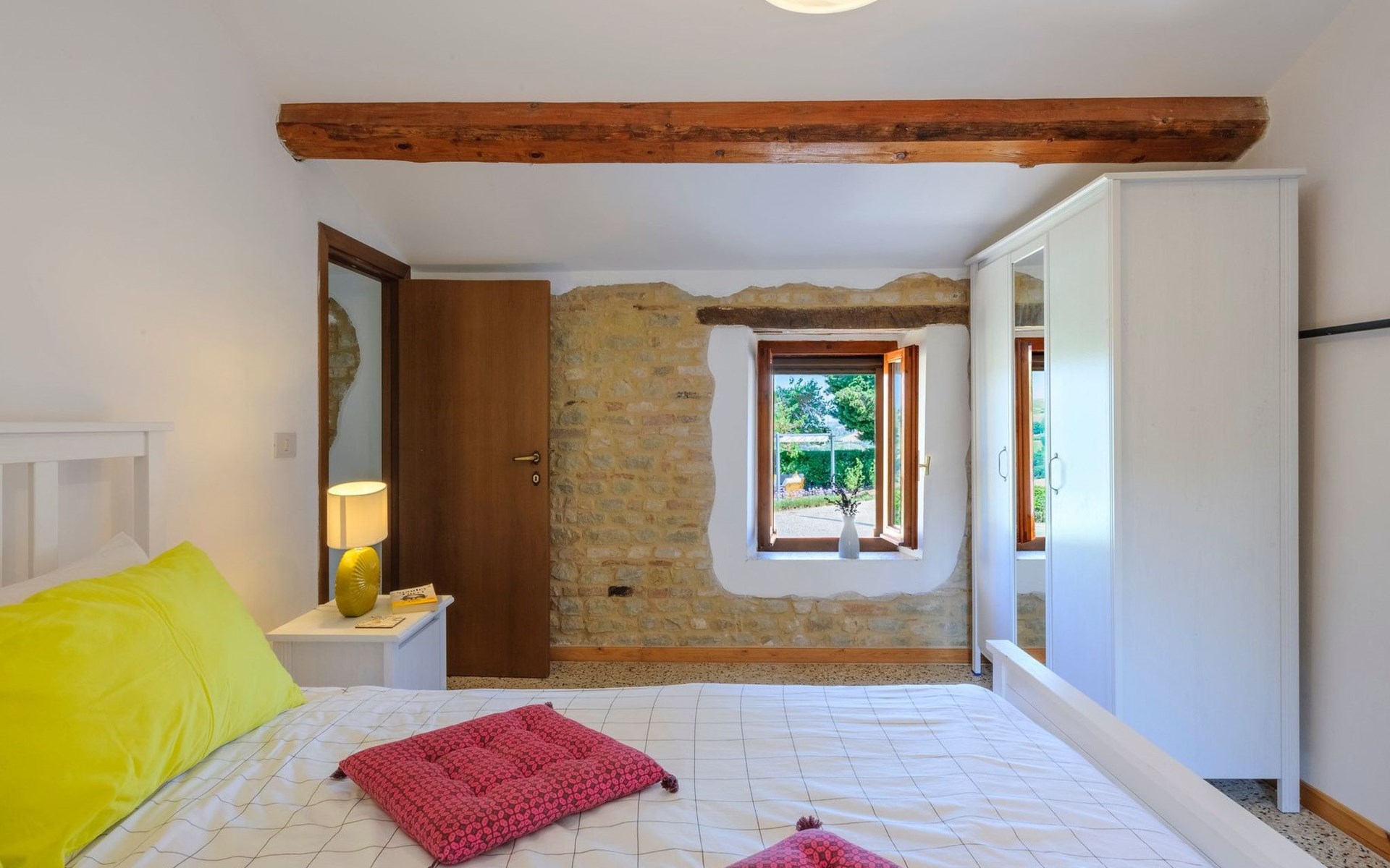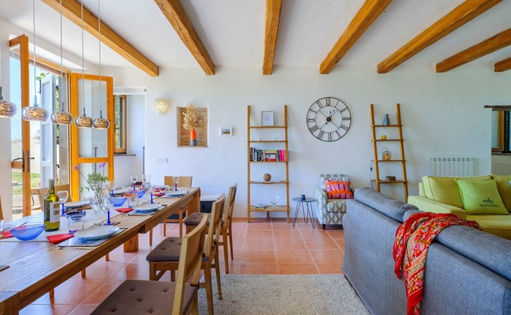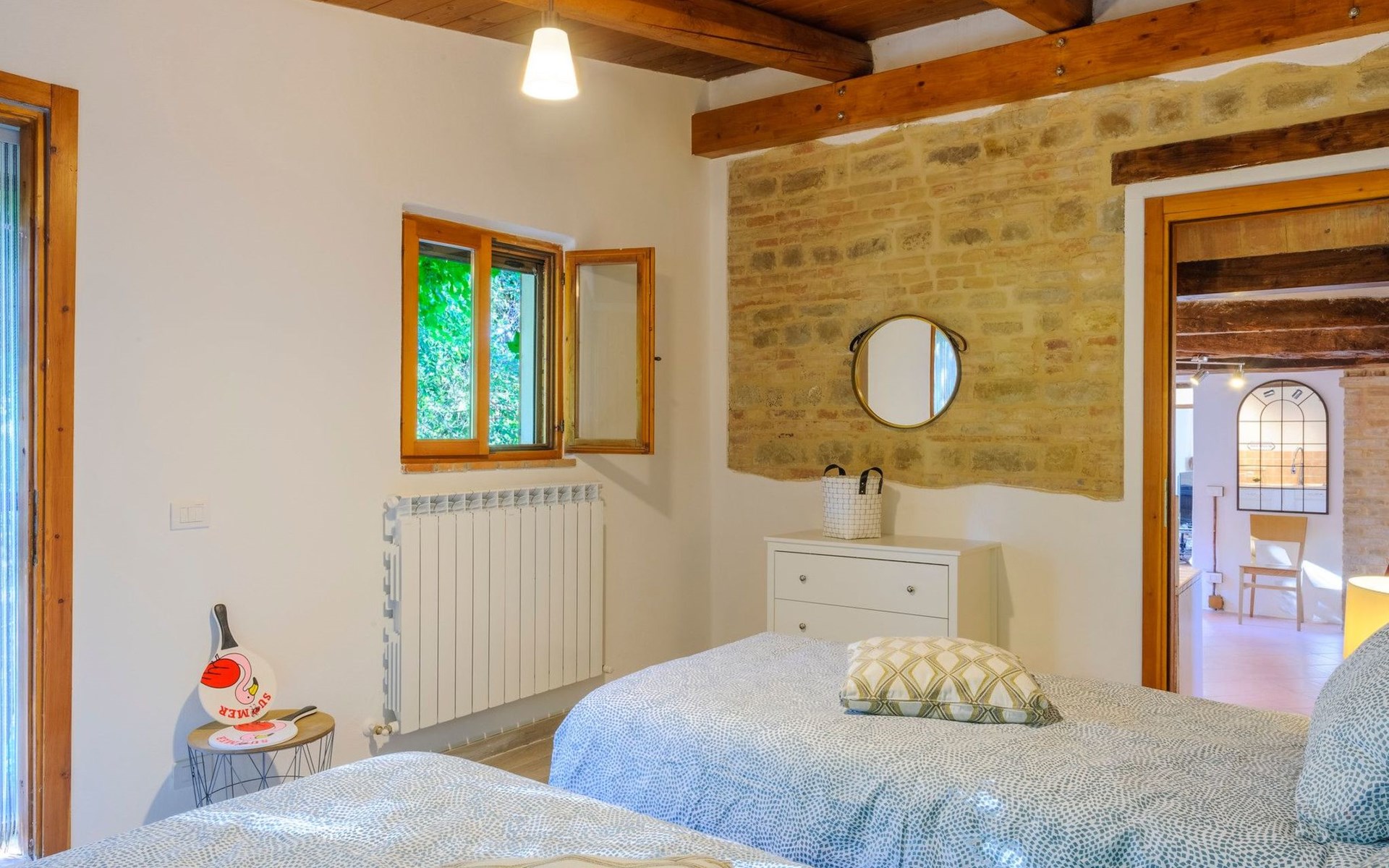 Im Erdgeschoss befindet sich ein großes und helles Wohnzimmer mit Essecke und Blick auf die Loggia, die zum Essen und Entspannen im Freien einlädt und über einen Holzofen verfügt. Die gut ausgestattete Küche hat einen direkten Ausgang nach draußen, dann finden wir ein Doppelzimmer mit Klimaanlage, ein Bad mit Dusche und die Waschküche. Im ersten Stock gibt es 3 Doppelzimmer und 2 Bäder, eines mit Dusche und eines mit Badewanne.