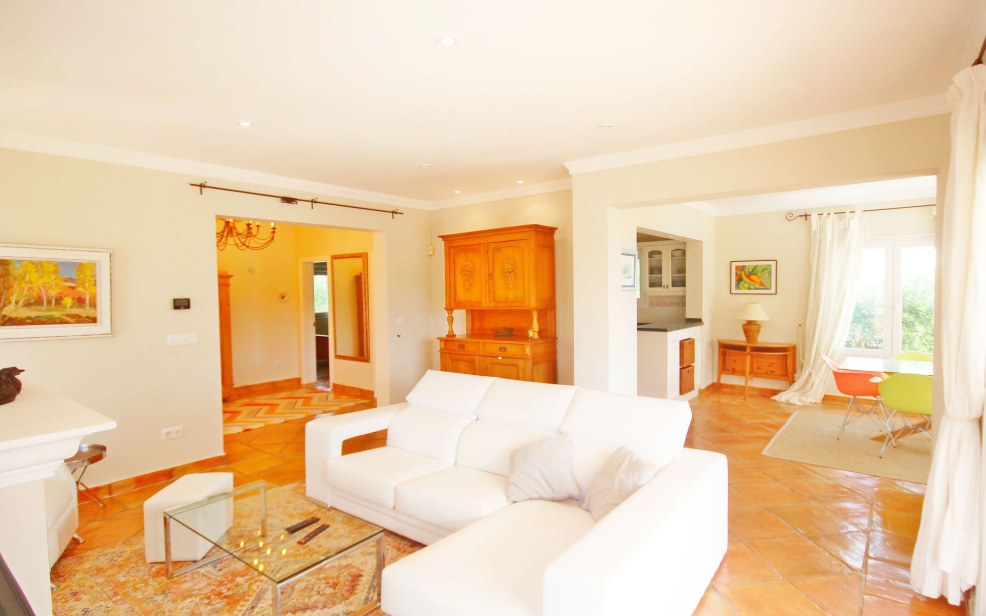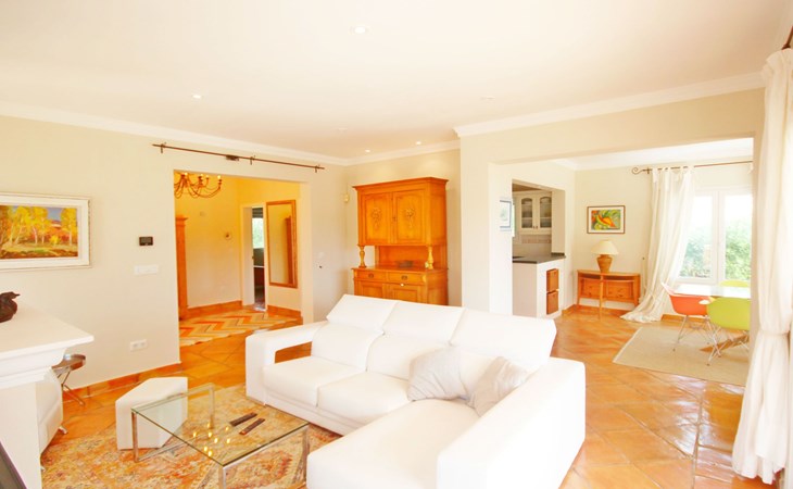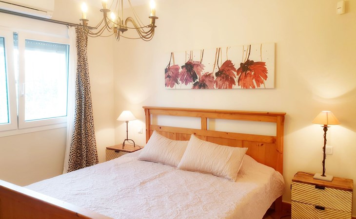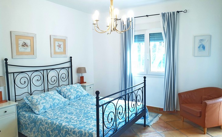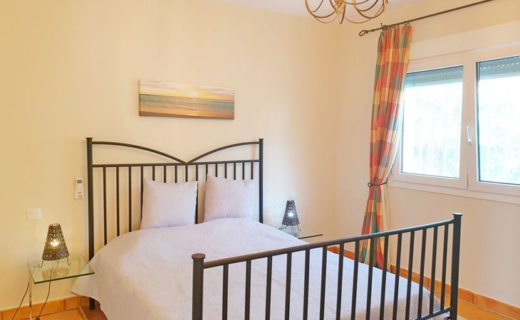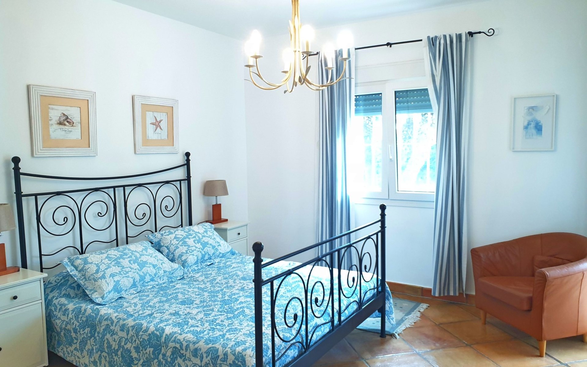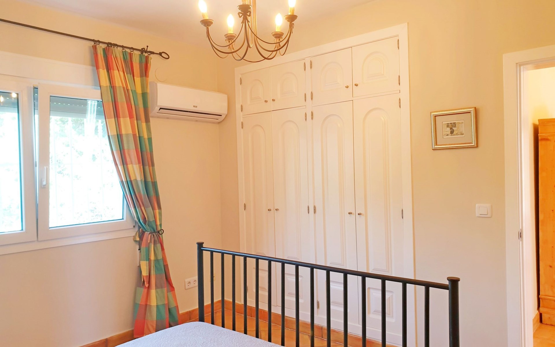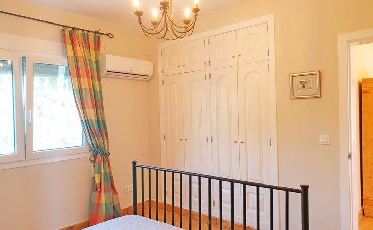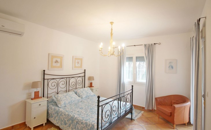 Im Inneren der Villa empfängt Sie ein großzügiger Eingangsbereich, der in ein einladendes Wohnzimmer mit einem offenen Kamin übergeht. Die moderne Küche mit Frühstückstheke und der Zugang zum Esszimmer, ausgestattet mit einer verglasten Wand in Südausrichtung, bietet einen atemberaubenden Blick über das Tal bis zum Meer. Beide Ebenen bieten komfortable Schlafmöglichkeiten, darunter ein Hauptschlafzimmer mit Klimaanlage, Ankleideraum und einem en-suite Badezimmer mit Doppelwaschbecken, sowie weitere Schlafzimmer und Badezimmer für Gäste oder Familie. Alle Schlafzimmer sind mit der Klimaanlage ausgestattet.