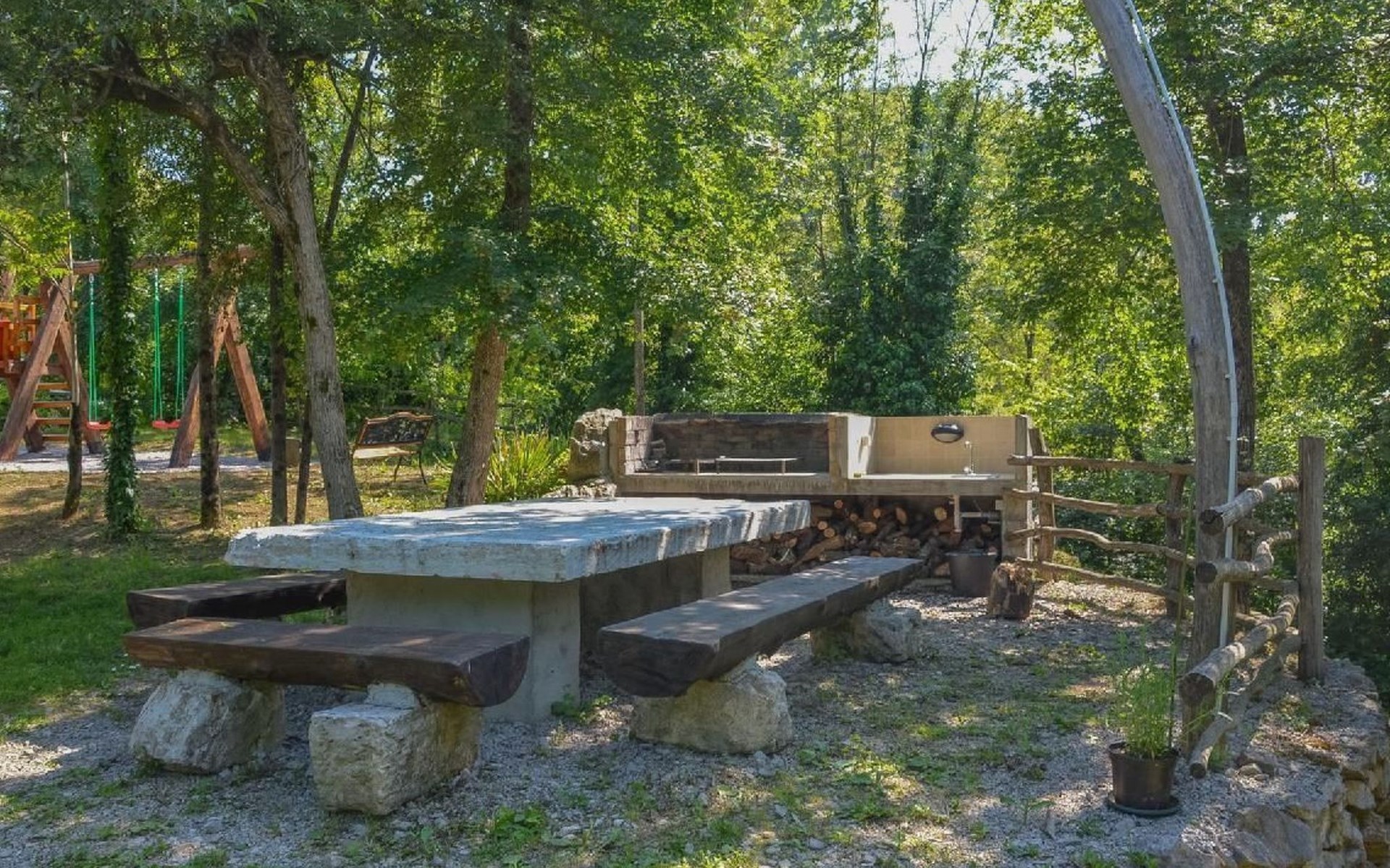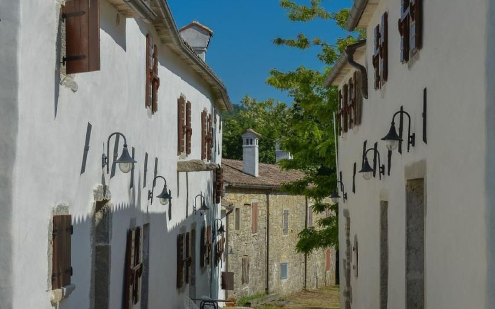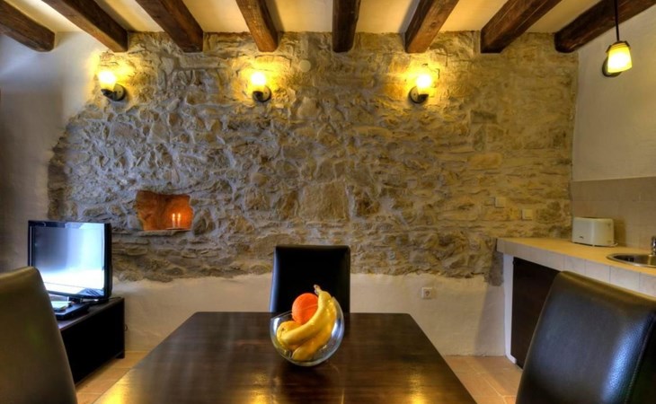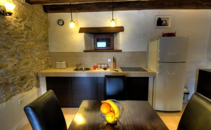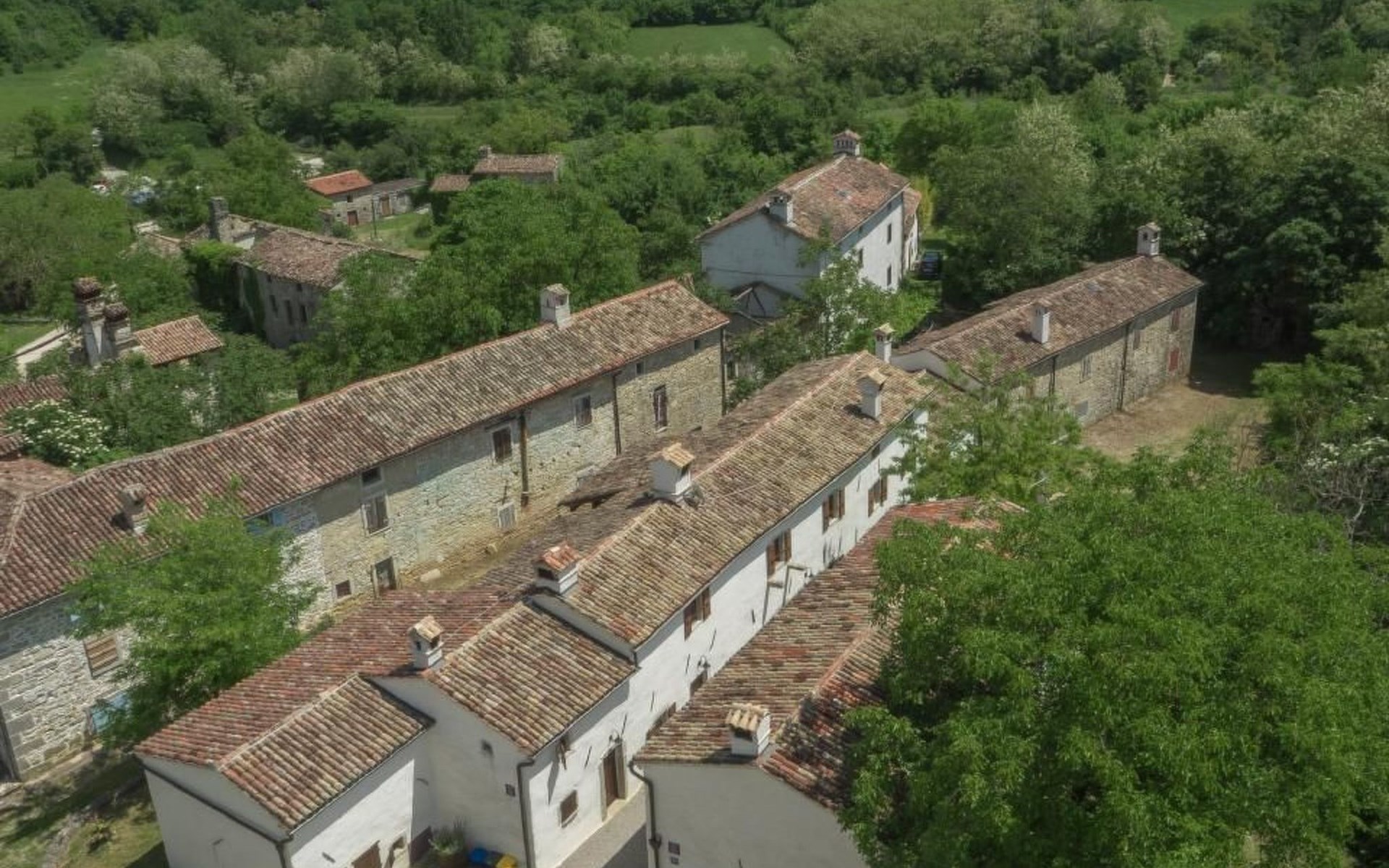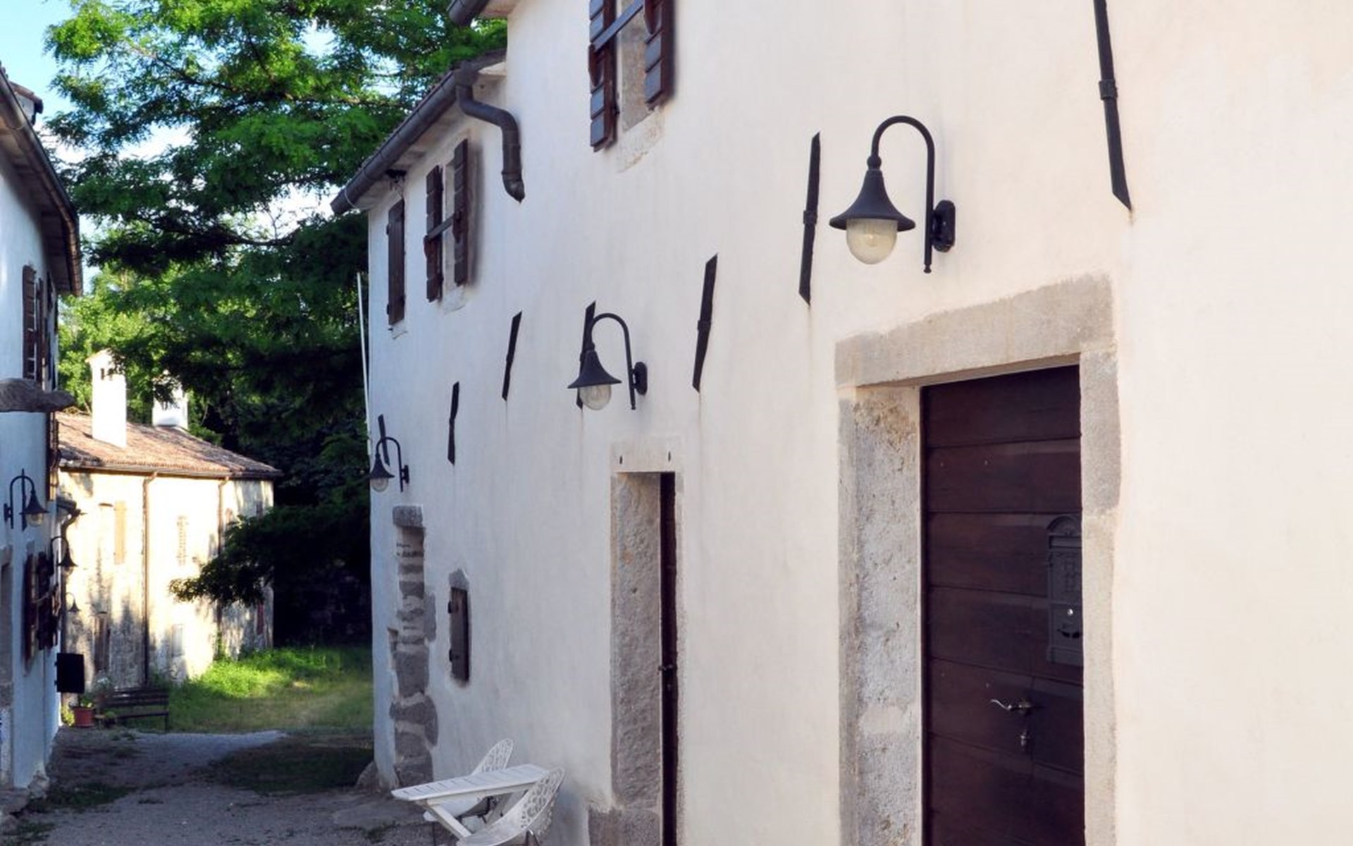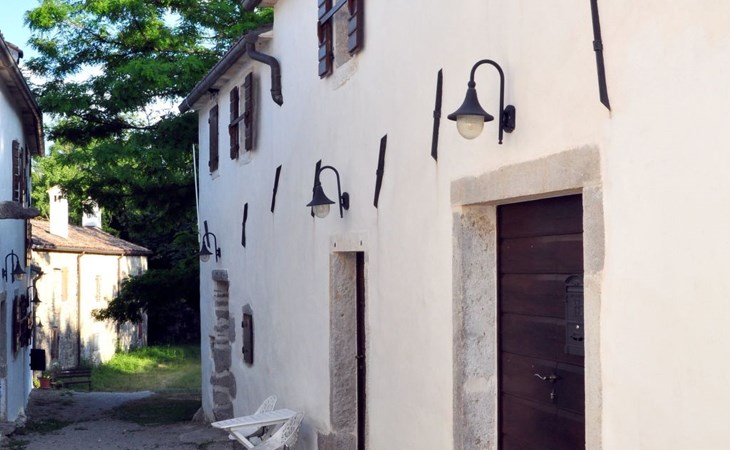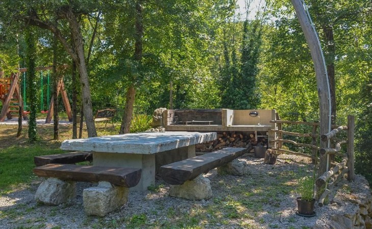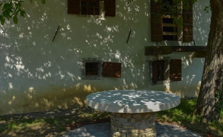 Wenn Sie nach draußen treten, werden Sie von gut erhaltenen Höfen, Außentreppen, gewölbten Durchgängen und malerischen Schornsteinen begrüßt, die das Gefühl vermitteln, die Zeit sei stehen geblieben. Der Garten ist mit Möbeln, einem Grill für gemütliche Grillabende und Spielgeräten für die kleinen Gäste ausgestattet. Zu den Außenanlagen gehört auch ein herrlicher Swimmingpool zur gemeinsamen Nutzung, der ein erfrischendes Bad unter freiem Himmel verspricht. Das sanfte Fließen des Flusses Mirna und die malerischen Wasserfälle bilden eine ruhige Kulisse für Entspannung und Freizeit.