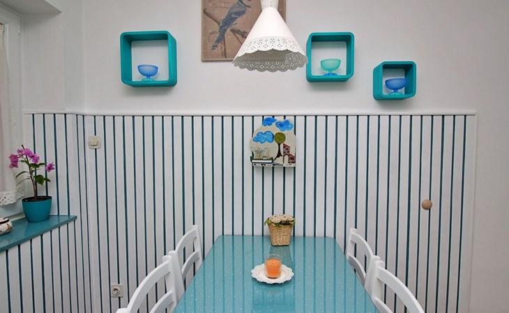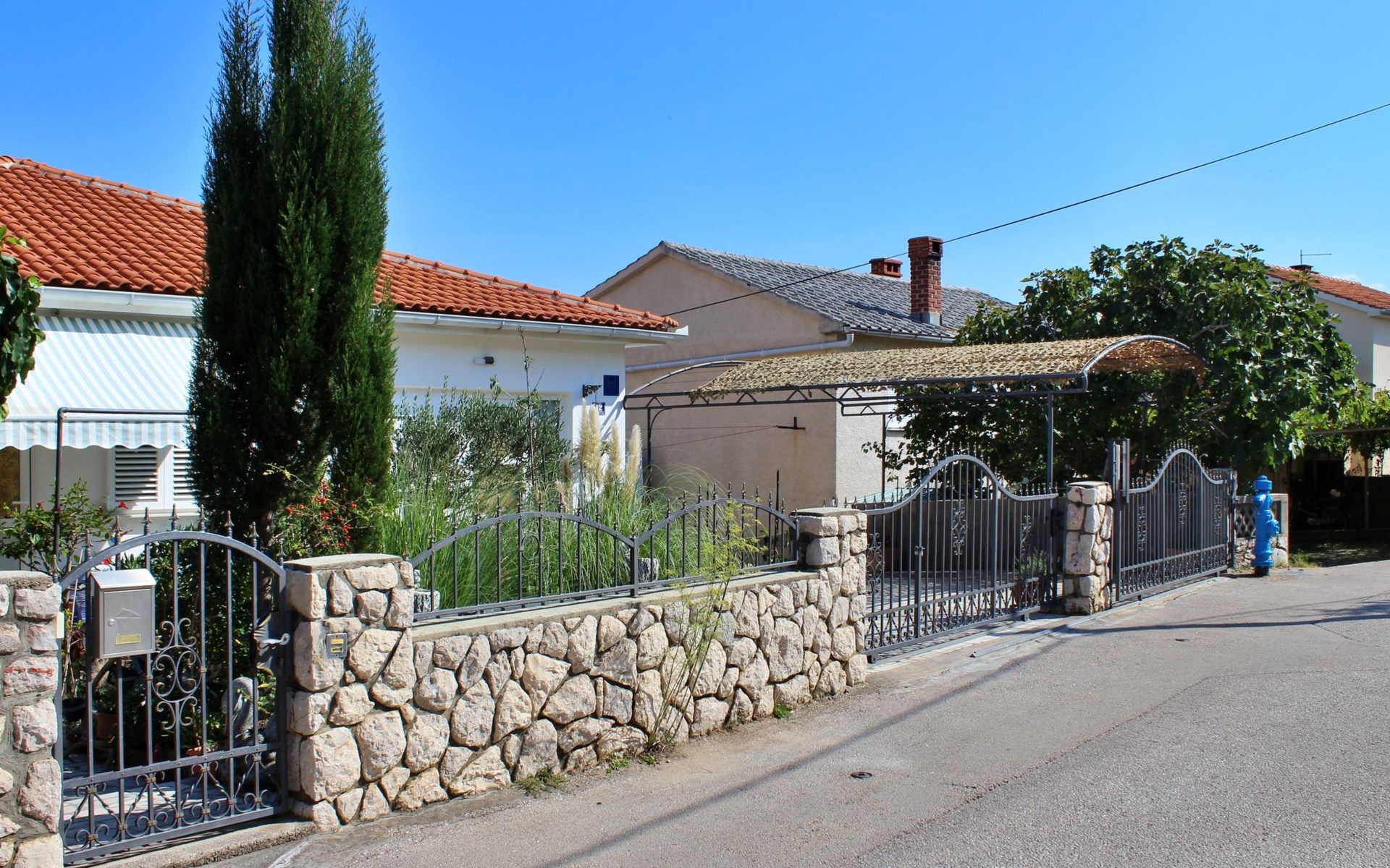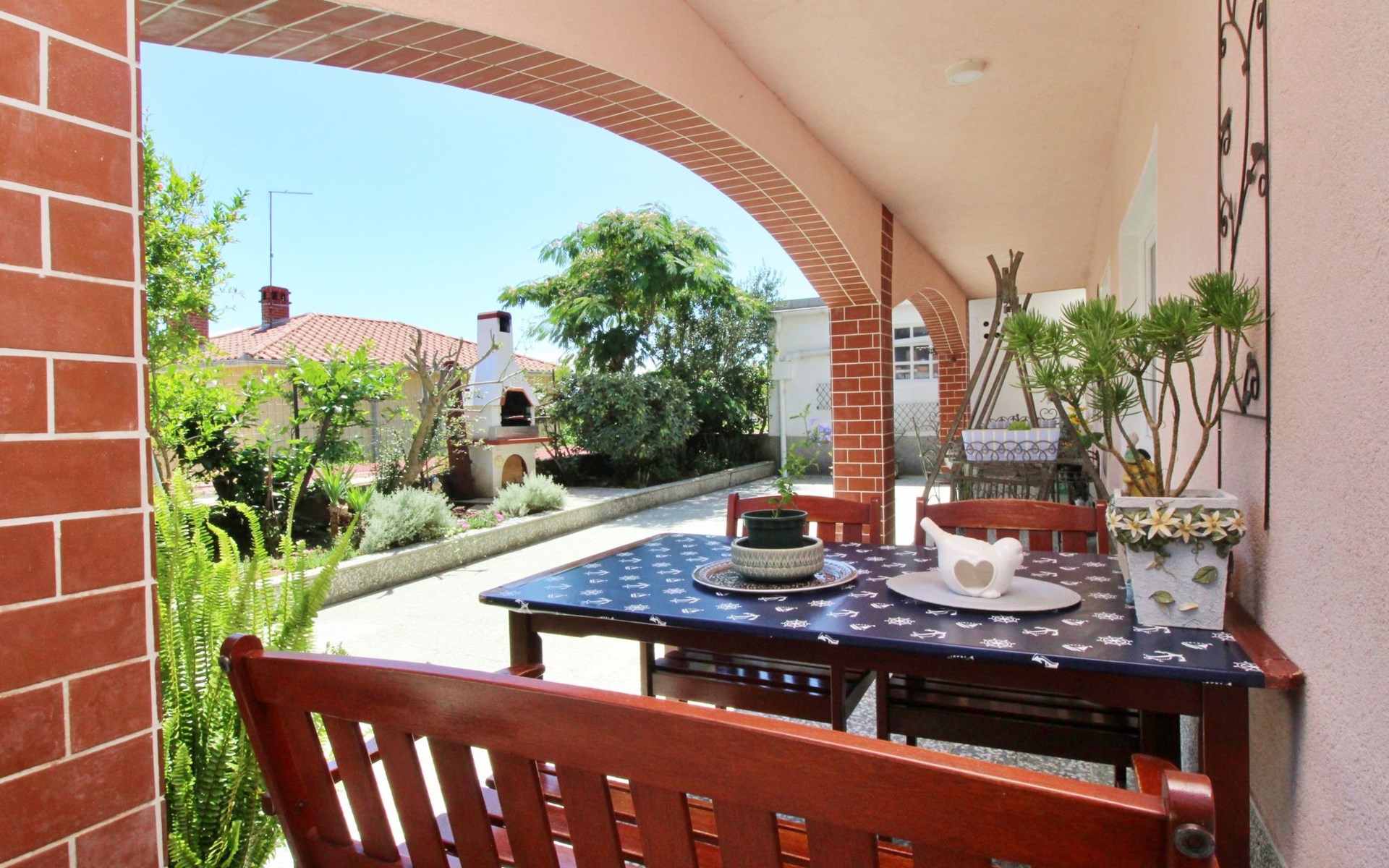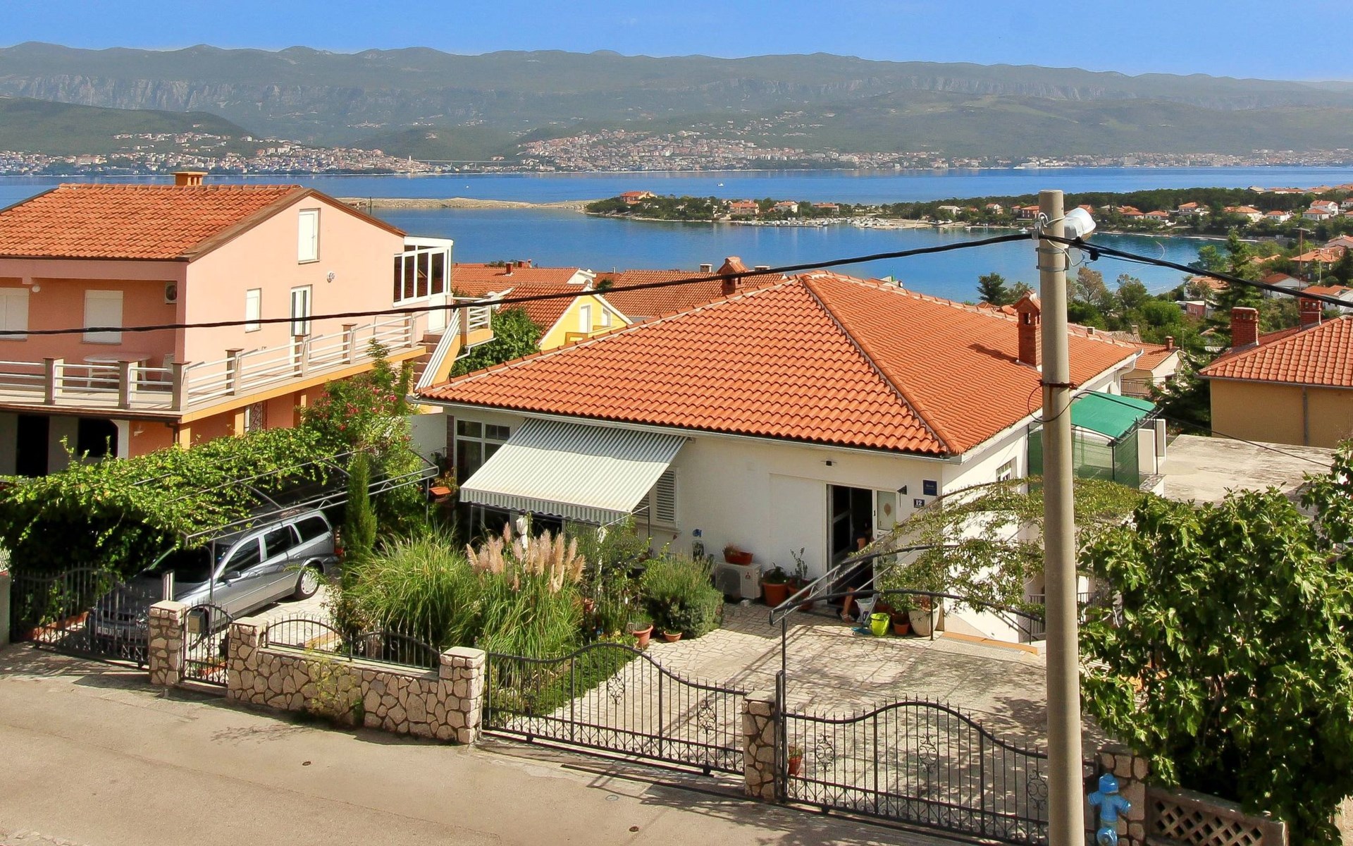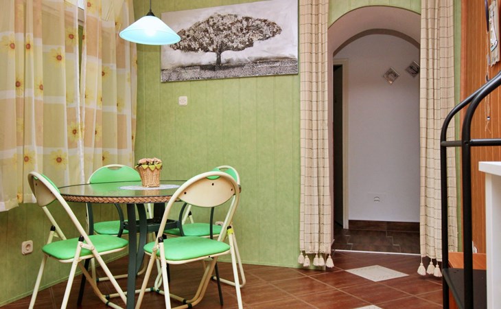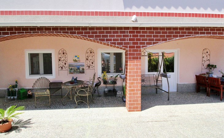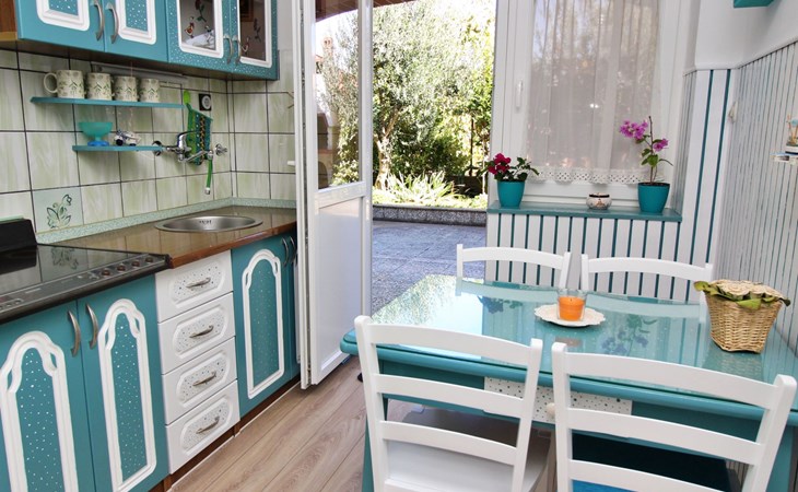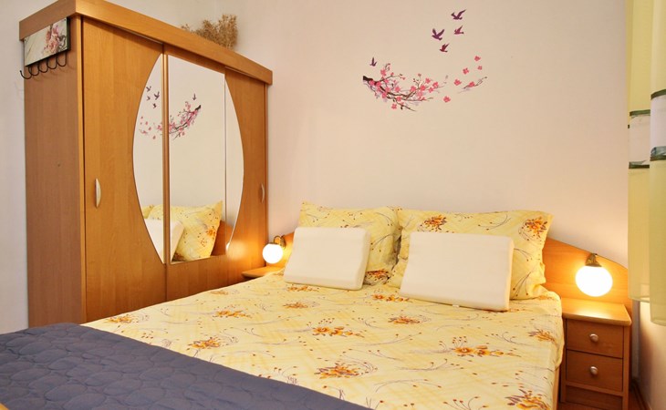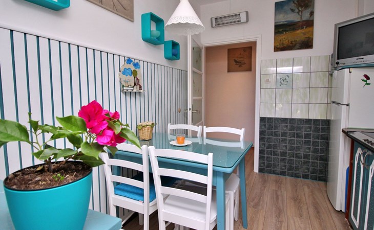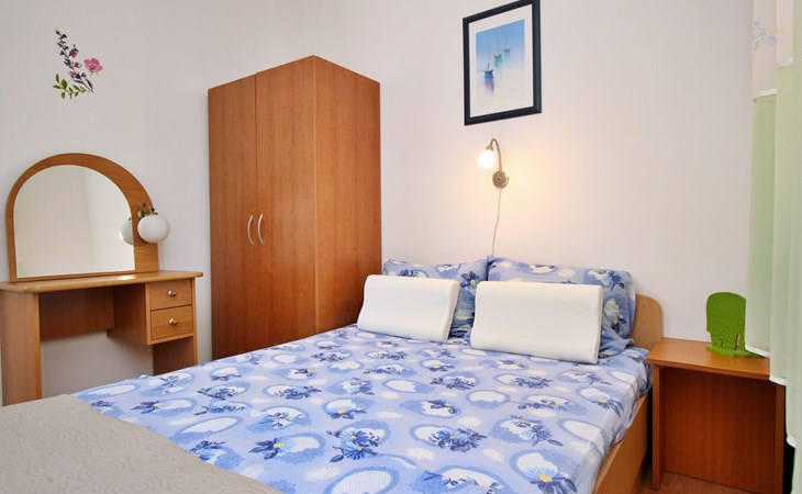 Im Inneren finden Sie zwei Schlafzimmer mit Doppelbetten, eine gut ausgestattete Küche (Elektroherd, Kühlschrank mit Gefrierfach, Kaffeemaschine, Wasserkocher, Mikrowelle), einen Essbereich und ein Badezimmer mit Dusche und Toilette. Eine zusätzliche Toilette ist ebenfalls vorhanden. WLAN und Klimaanlage sind im Preis inbegriffen, während der Fernseher nur kroatische Kanäle bietet.
