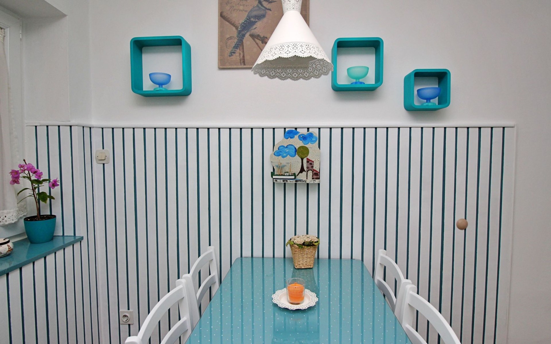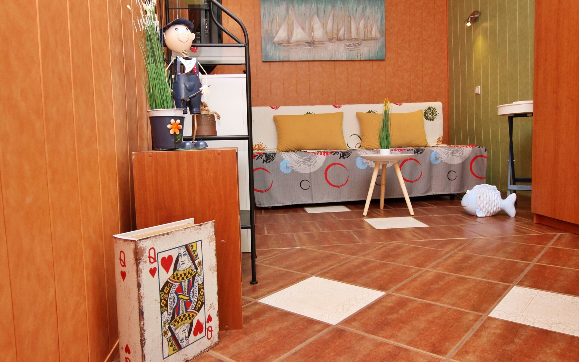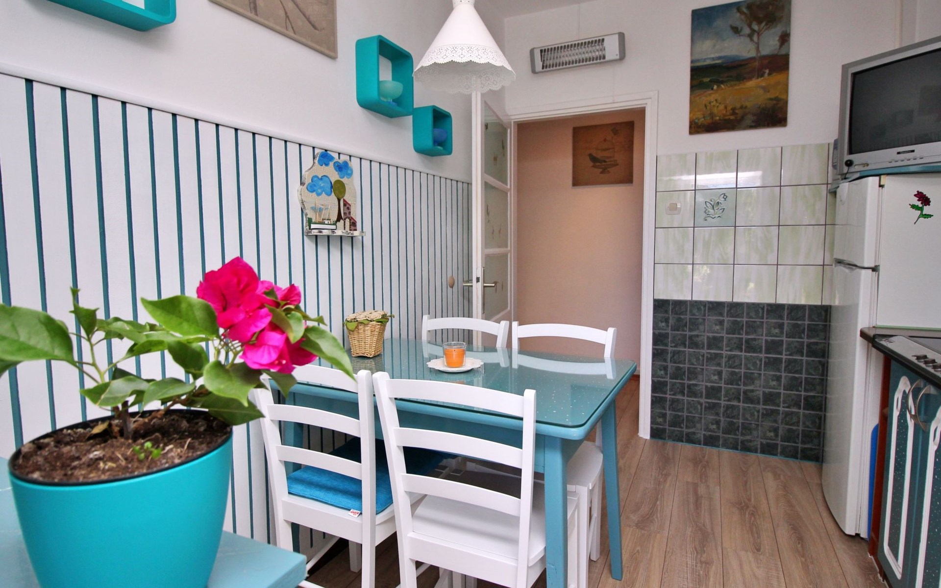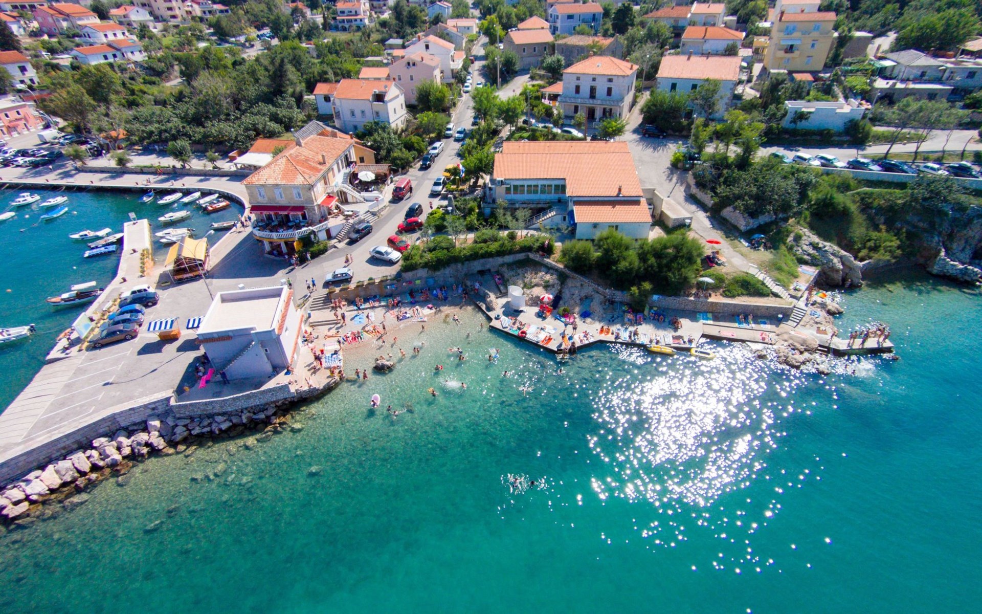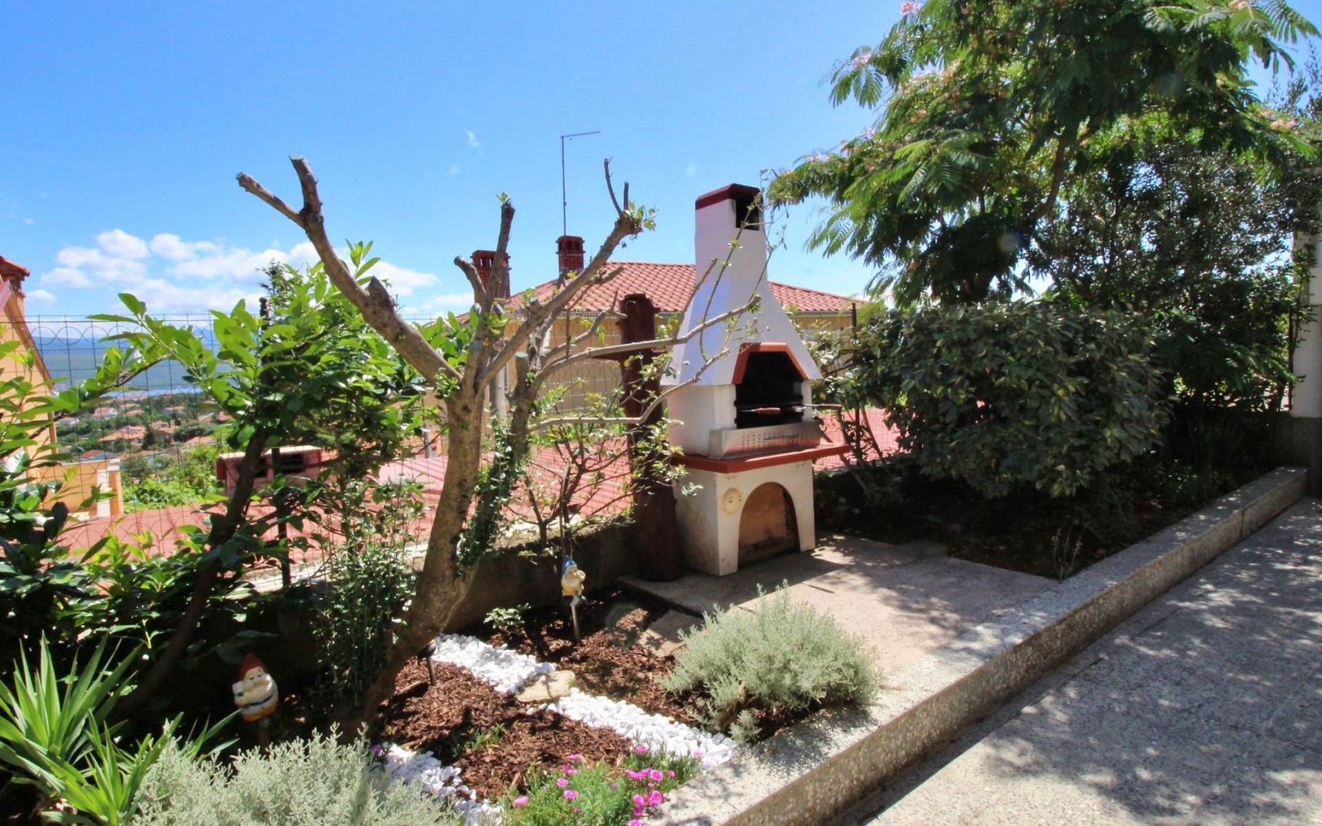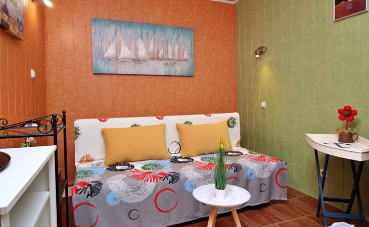 Im Inneren finden Sie zwei Schlafzimmer mit Doppelbetten, eine gut ausgestattete Küche (Elektroherd, Kühlschrank mit Gefrierfach, Kaffeemaschine, Wasserkocher, Mikrowelle), einen Essbereich und ein Badezimmer mit Dusche und Toilette. Eine zusätzliche Toilette ist ebenfalls vorhanden. WLAN und Klimaanlage sind im Preis inbegriffen, während der Fernseher nur kroatische Kanäle bietet.