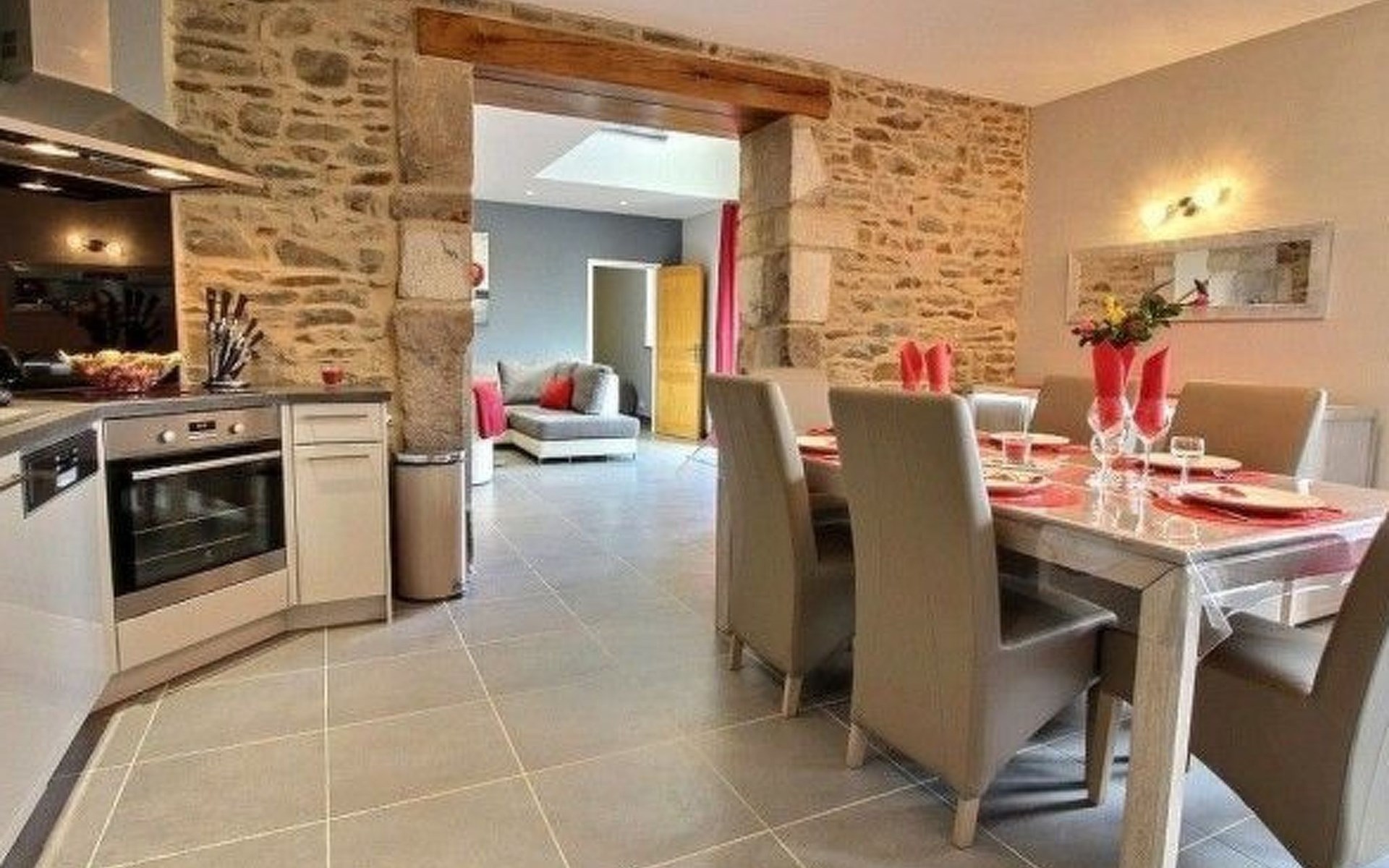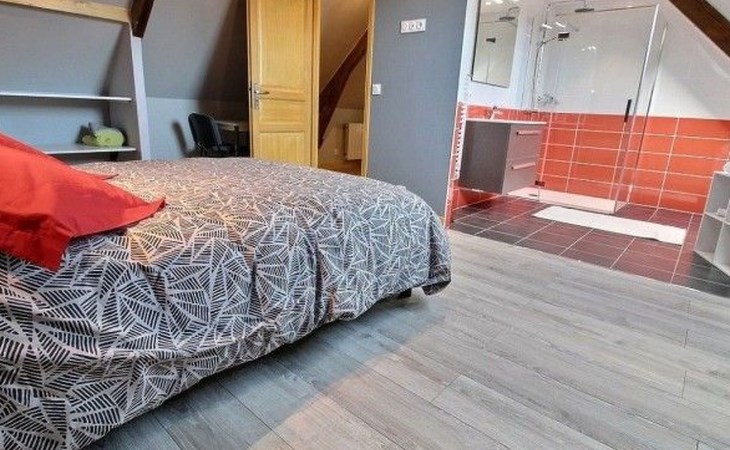 Das Innere des Hauses wurde sorgfältig für Ihren Komfort und Ihr Wohlbefinden eingerichtet. Im Erdgeschoss profitieren Sie von einer Fußbodenheizung, die einen Hauch von Wärme und Gemütlichkeit vermittelt. Die zum großen Wohnzimmer hin offene Küche ist komplett mit einem Induktionskochfeld, einer Filterkaffeemaschine sowie einer Kaffeepadmaschine, einem Geschirrspüler und einem Wasserkocher ausgestattet und erfüllt somit alle Ihre kulinarischen Bedürfnisse. Zu Ihrer Bequemlichkeit stehen Ihnen in der Unterkunft auch eine Waschmaschine und ein Trockner zur Verfügung. Die drei Schlafzimmer, die jeweils über ein eigenes Badezimmer verfügen, garantieren jedem Bewohner einen komfortablen Privatbereich. Eines dieser Zimmer, das sich im Erdgeschoss befindet, ist für Personen mit eingeschränkter Mobilität zugänglich, was unser Engagement für einen inklusiven Empfang unterstreicht.