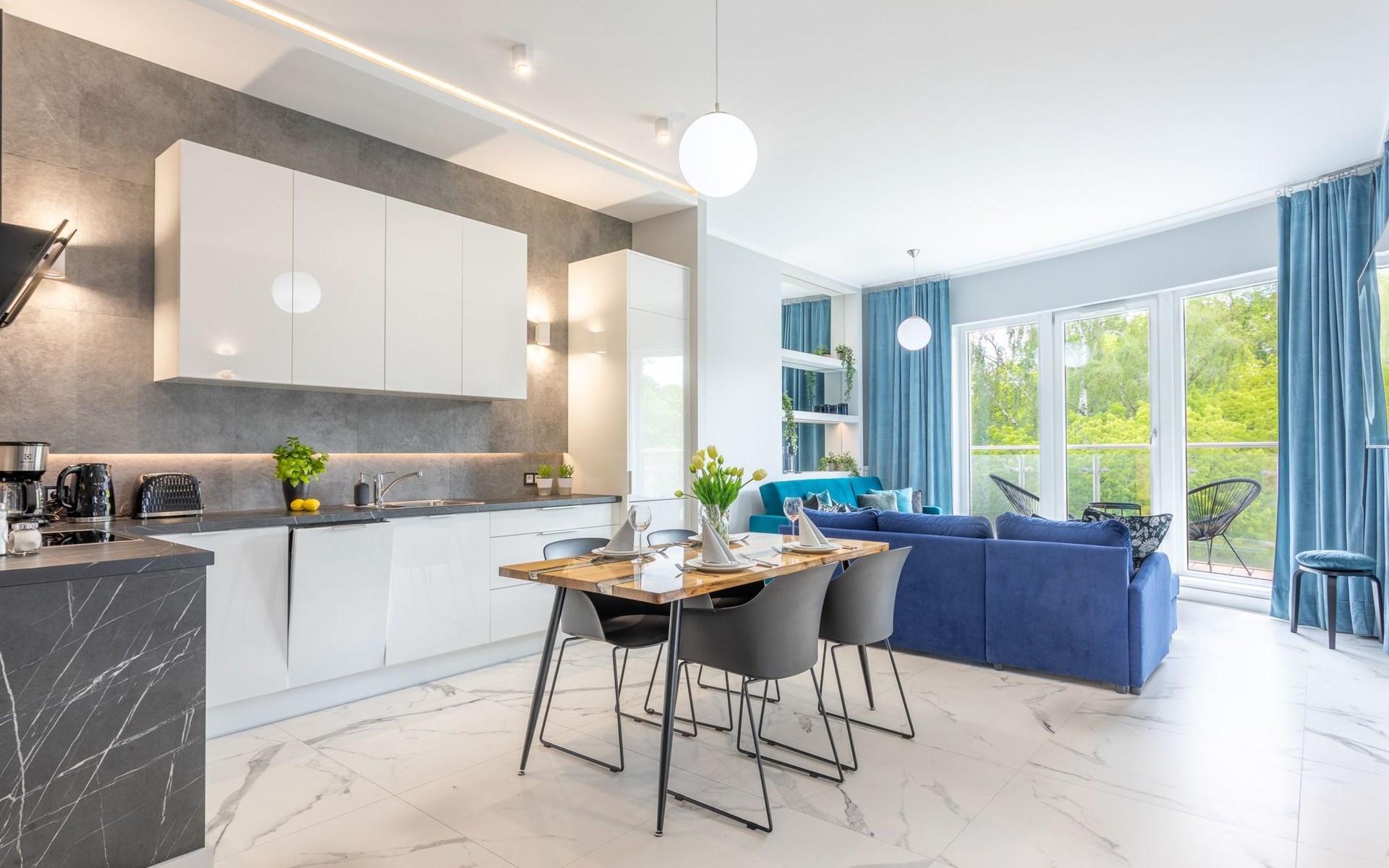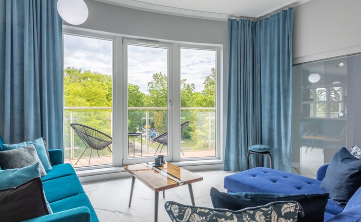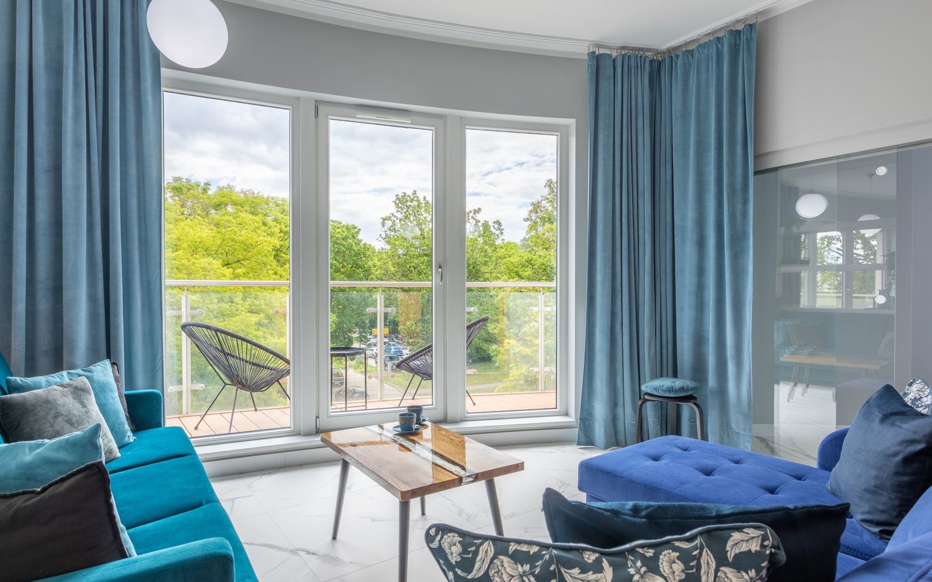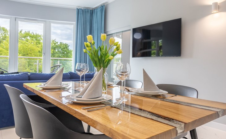 Die Wohnung ist in einem minimalistischen Stil eingerichtet, dominiert von Grau- und Weißtönen, die mit einem tiefen Blauton gebrochen sind, sowie schönen Holzdetails, die dezent in moderne Möbel oder Accessoires eingeschmuggelt werden, die das Interieur erwärmen und mit ihrer Textur und ihrem unkonventionellen Aussehen begeistern. Zudem gelangt dank der großen und zahlreichen Verglasungen viel Tageslicht in den Innenraum, was den Raum zusätzlich optisch vergrößert und ihm Schwung verleiht. Die Aufmerksamkeit wird auch auf ausdrucksstarke und sehr moderne Accessoires sowie interessante Formen und Texturen gelenkt - alle mit zarten und originellen Meeresmotiven. Sie müssen ohne Zweifel an Bord dieses Decks gehen!