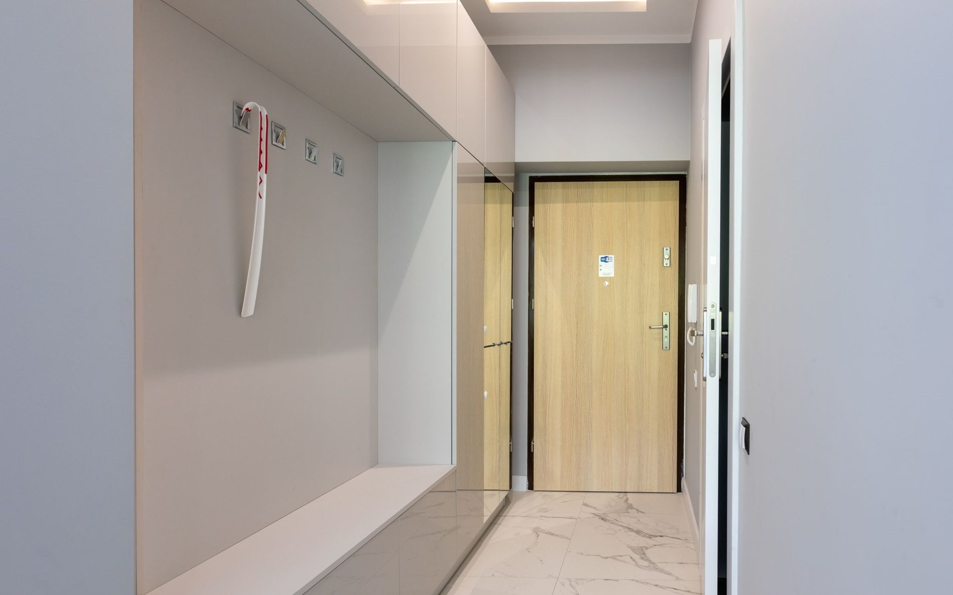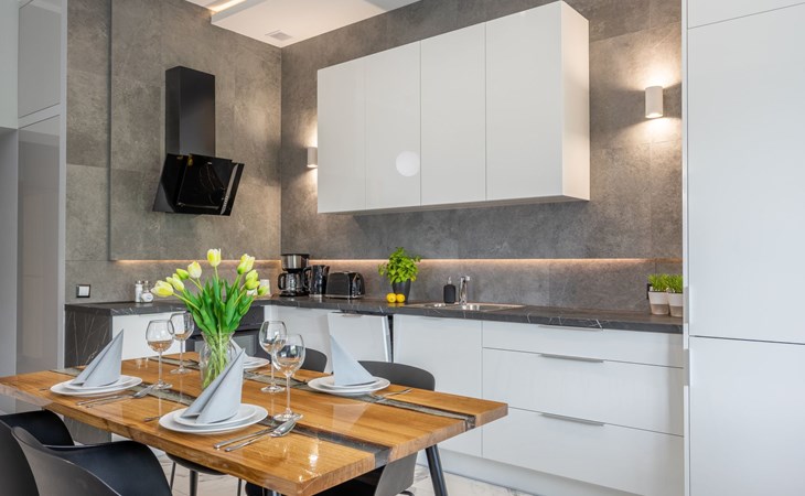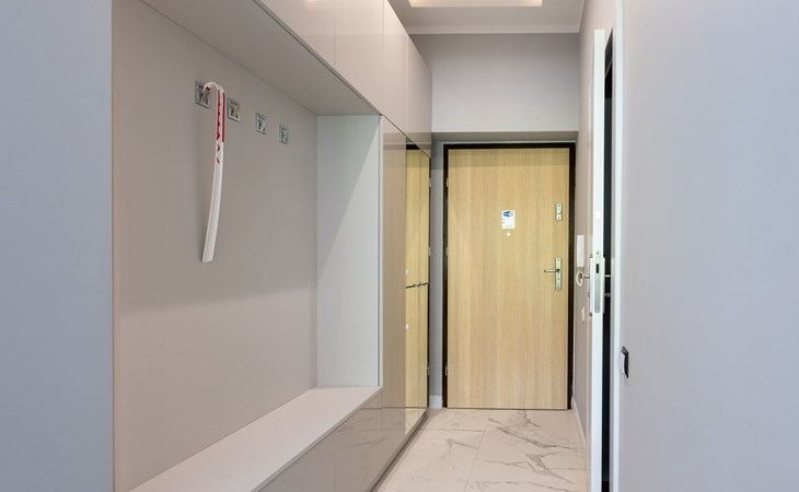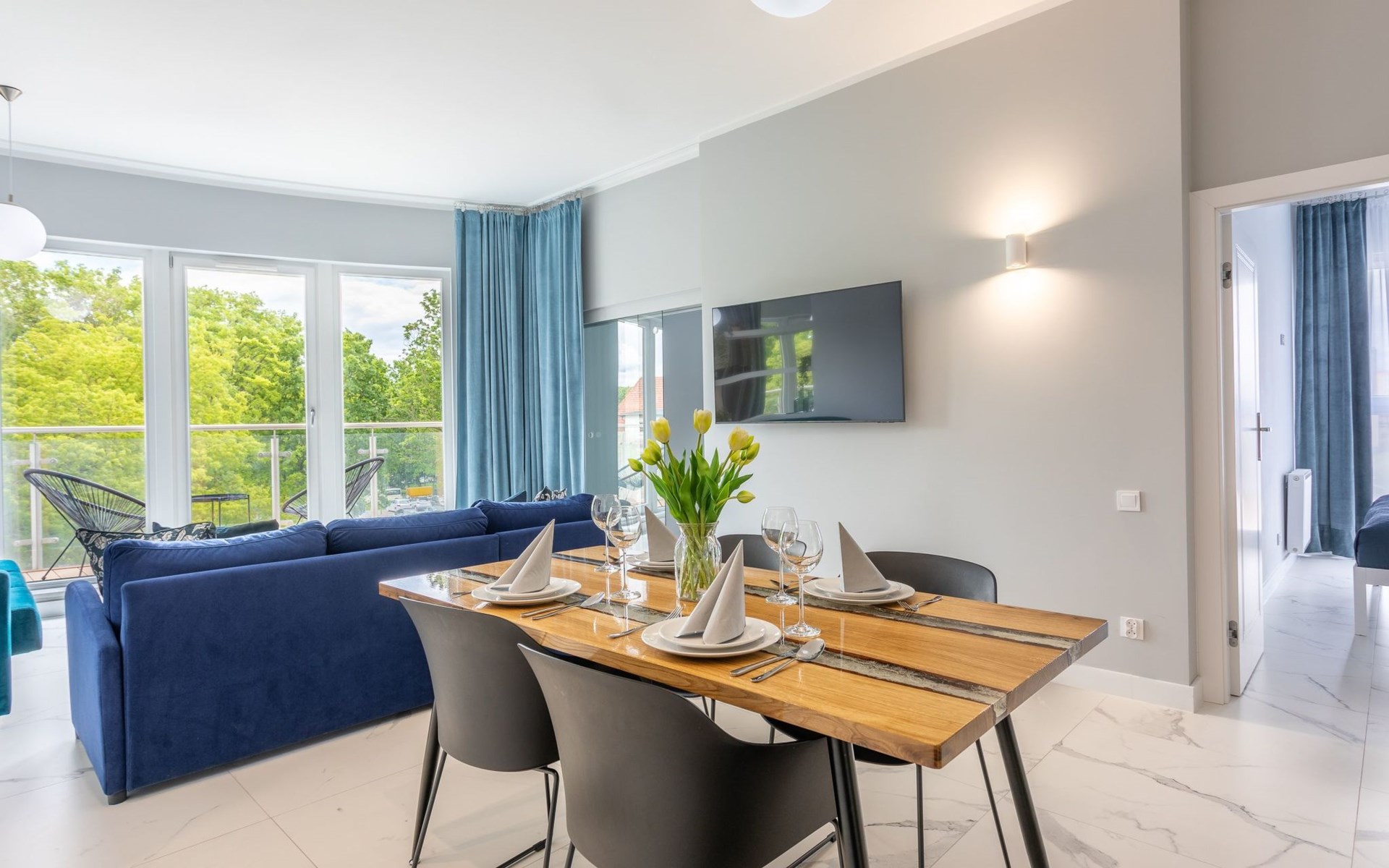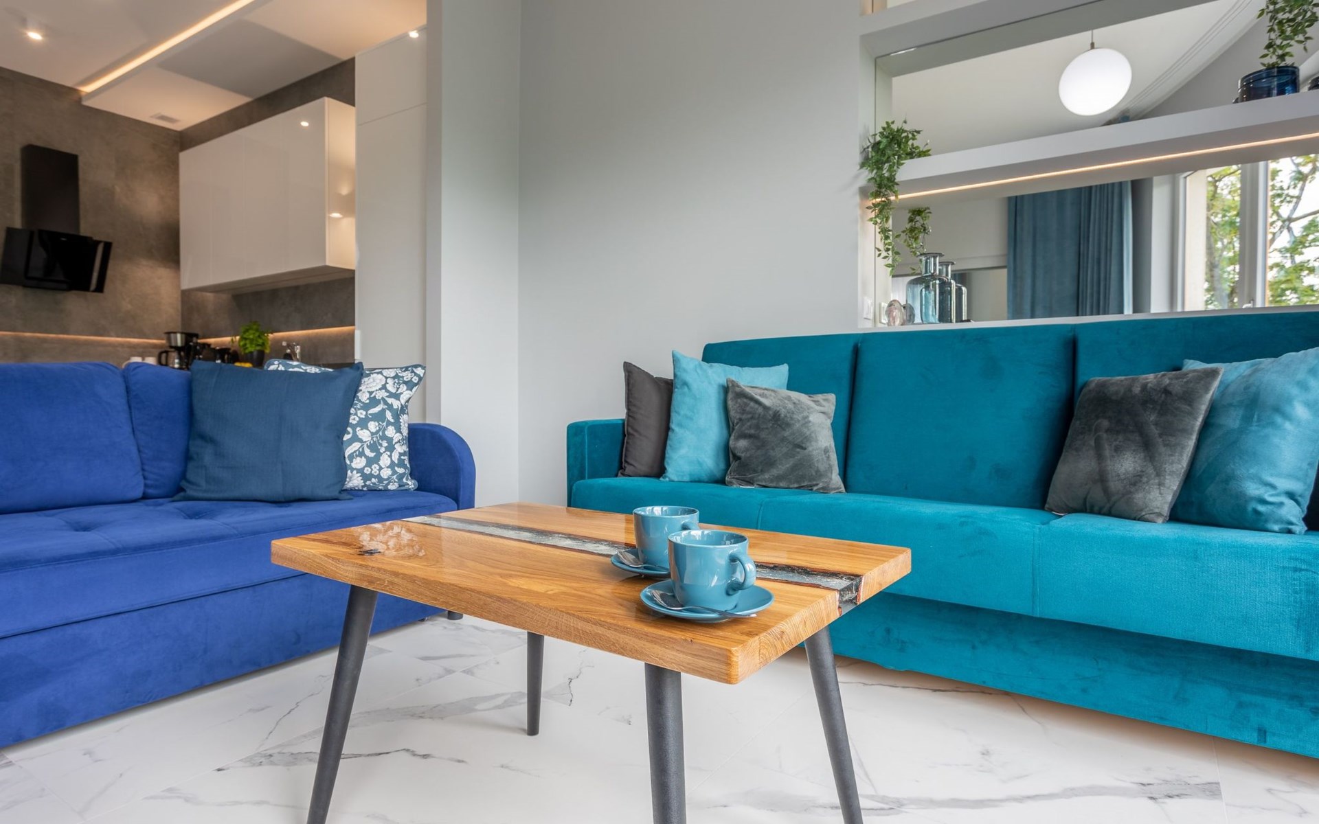 Die Wohnung ist in einem minimalistischen Stil eingerichtet, dominiert von Grau- und Weißtönen, die mit einem tiefen Blauton gebrochen sind, sowie schönen Holzdetails, die dezent in moderne Möbel oder Accessoires eingeschmuggelt werden, die das Interieur erwärmen und mit ihrer Textur und ihrem unkonventionellen Aussehen begeistern. Zudem gelangt dank der großen und zahlreichen Verglasungen viel Tageslicht in den Innenraum, was den Raum zusätzlich optisch vergrößert und ihm Schwung verleiht. Die Aufmerksamkeit wird auch auf ausdrucksstarke und sehr moderne Accessoires sowie interessante Formen und Texturen gelenkt - alle mit zarten und originellen Meeresmotiven. Sie müssen ohne Zweifel an Bord dieses Decks gehen!