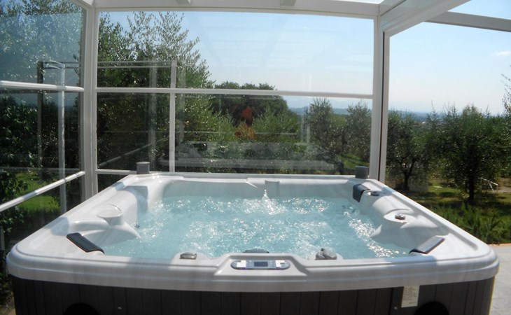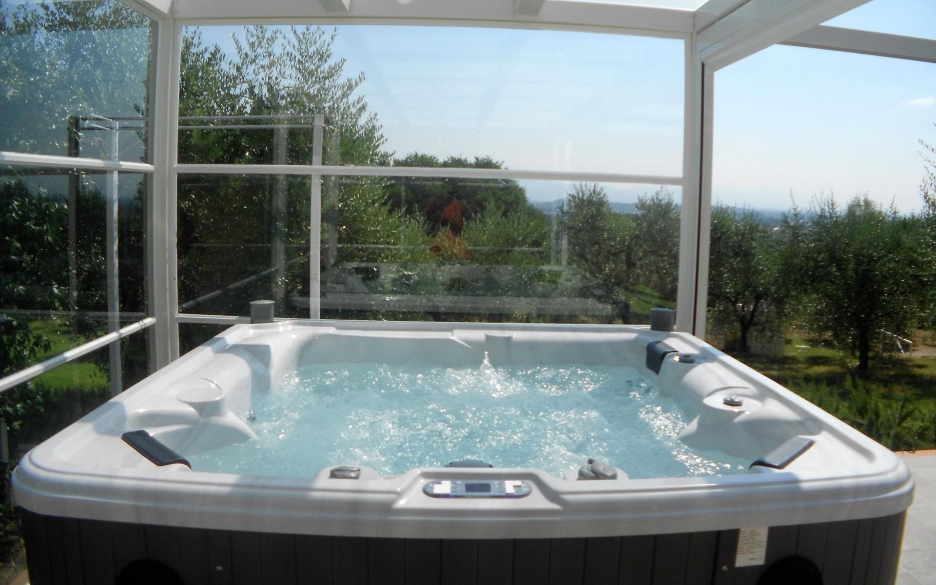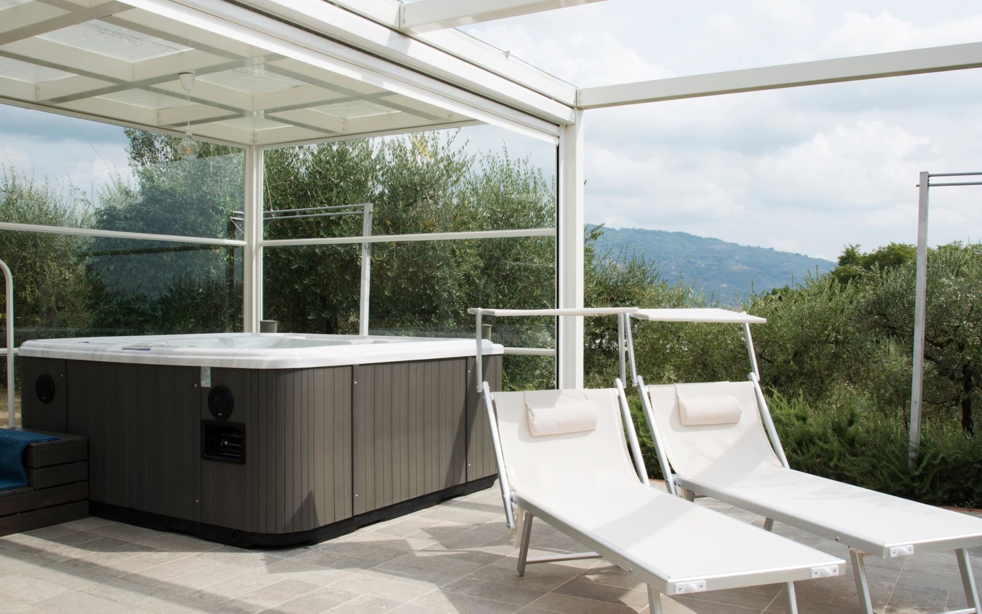 Draußen gibt es einen überdachten Pavillon mit Jacuzzi, der von Anfang Mai bis Ende September geöffnet ist, einen privaten Garten mit Grill und einen Essbereich mit Panoramablick.