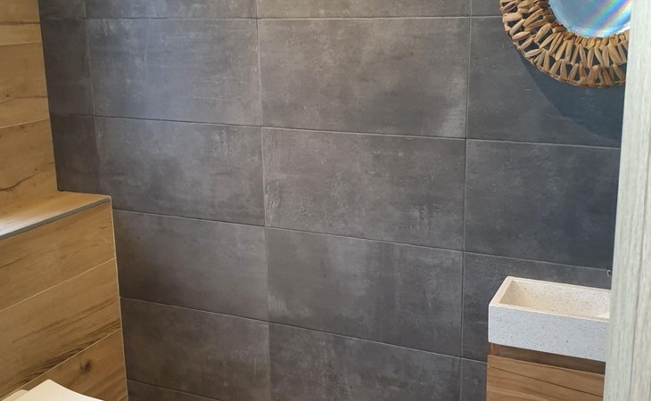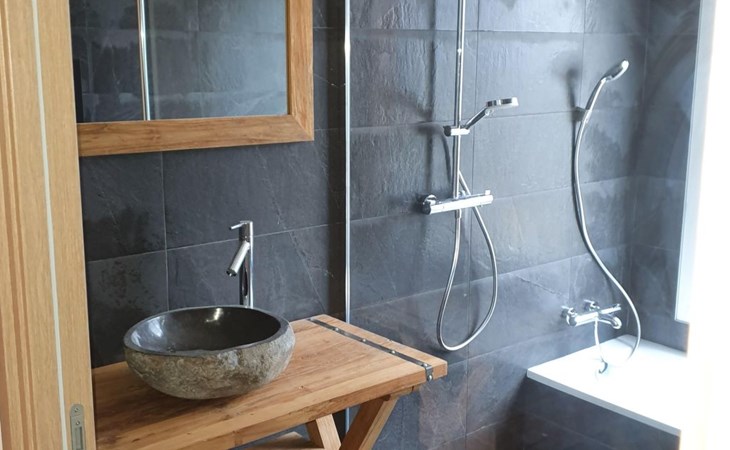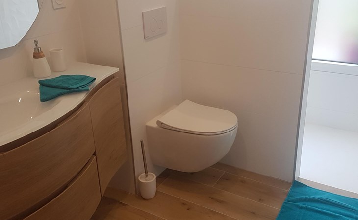 2 Badezimmer (1 mit italienischer Dusche und 1 mit italienischer Dusche und Badewanne), 2 WCs, Waschküche mit Waschmaschine und Wäschetrockner. Babyset auf Anfrage erhältlich.