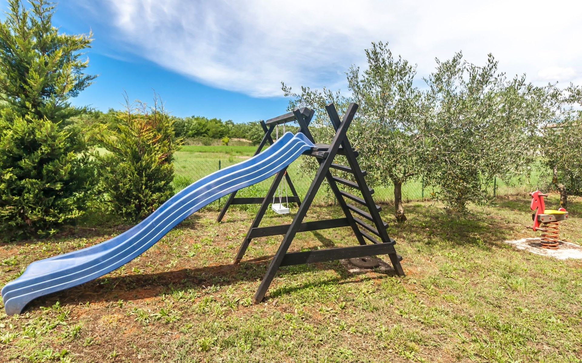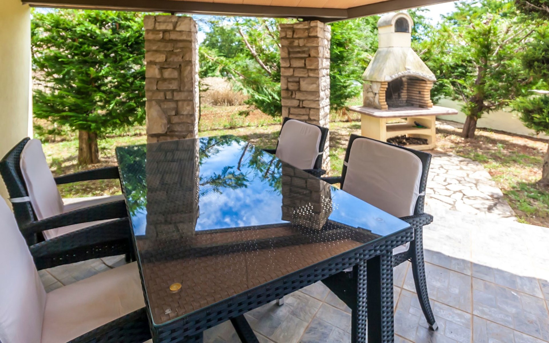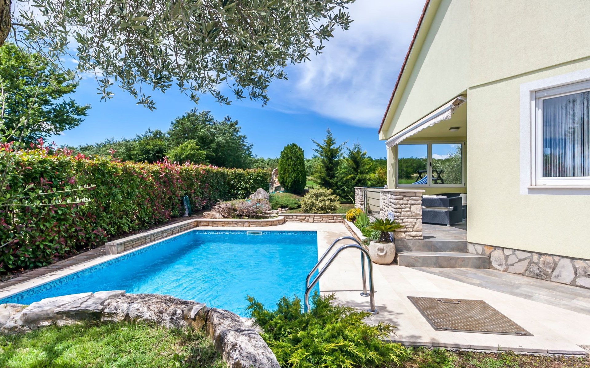 Direkt vor dem Wohnraum schließt sich die mit bequemen Flechtmöbeln ausgestattete Terrasse an. Eine Markise spendet bei Bedarf Schatten. Gleich davor liegt der 6 x 4 Meter große, eigene Pool. Auf dem Rasen neben dem Pool stehen Liegestühle für die Gäste bereit. Auf der anderen Seite des Gartens ist für die Kinder ein kleiner Spielplatz eingerichtet. Des Weiteren gibt es noch ein kleines Nebengebäude mit einer Feuerstelle, die im Winter für Grillparties genutzt werden kann. Im Sommer befindet sich hier das Spielzimmer, in dem ein Kicker steht. Zum Grillen kann man dann draußen den gemauerten Grill benutzen.