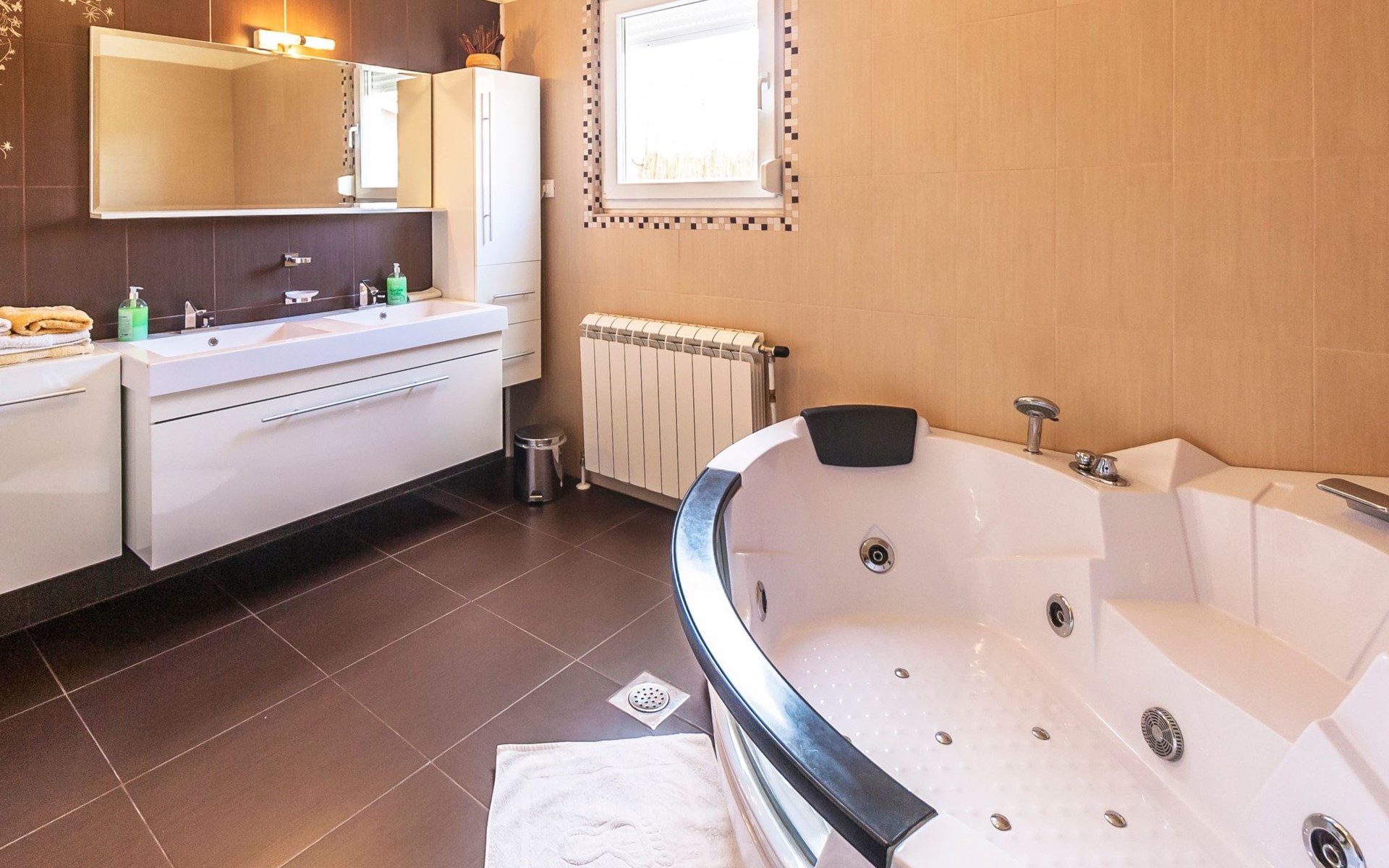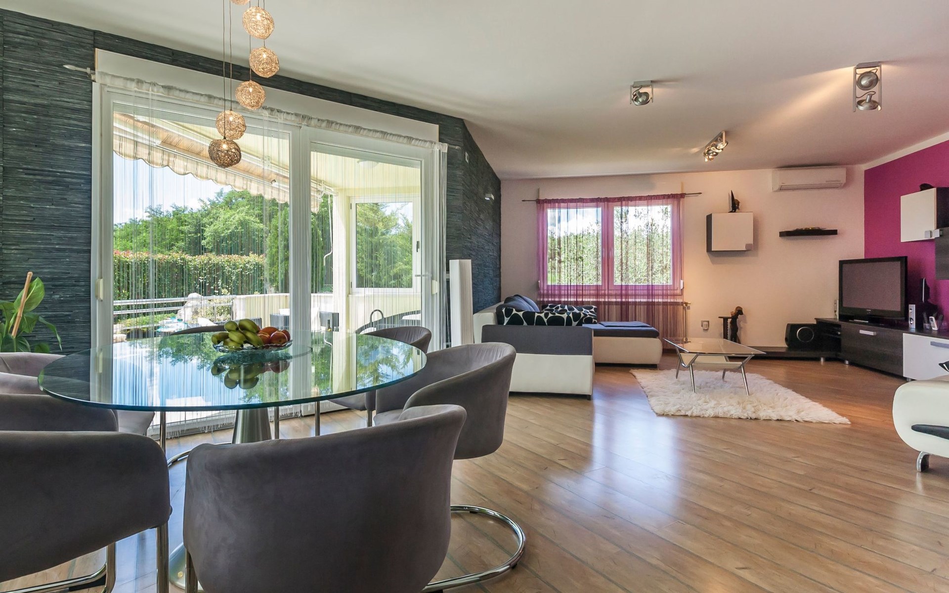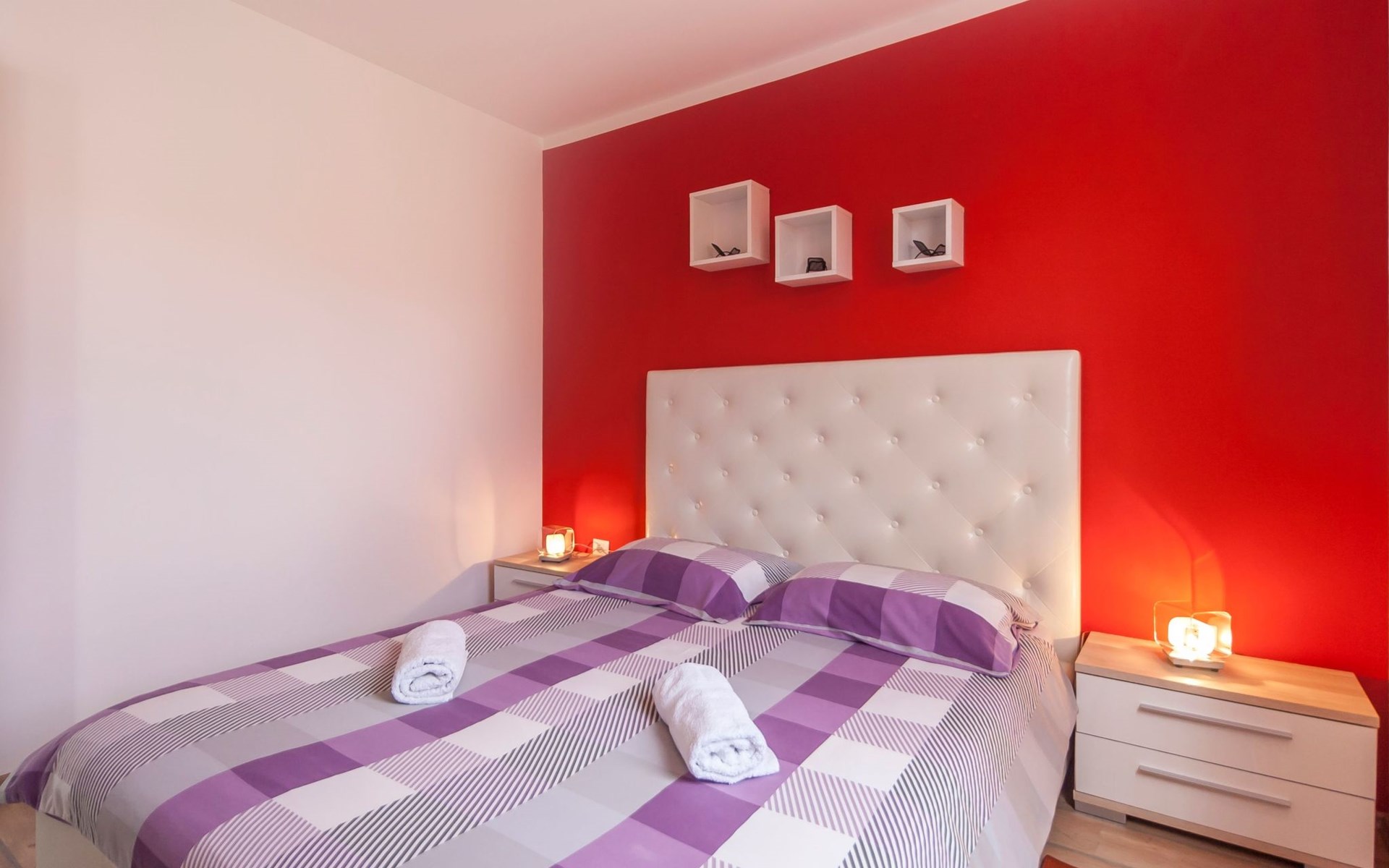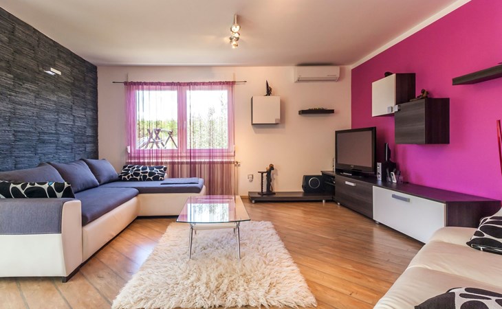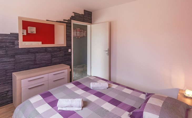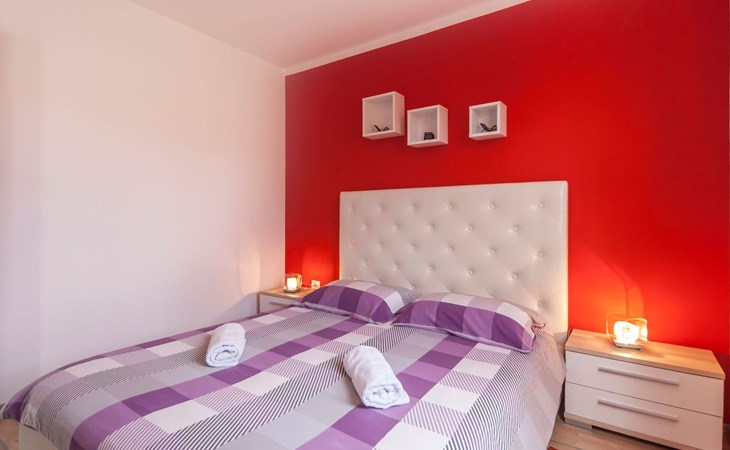 Das helle Ferienhaus ist farbenfroh eingerichtet. Es bietet auf 130 m² allen modernen Komfort mit funktionalem Design für fünf Personen. Es verfügt über zwei farblich harmonisch gestaltete Schlafzimmer mit einem Doppelbett im ersten und einem Doppel- sowie einem Einzelbett im zweiten Zimmer. Zwischen den beiden Räumen befindet sich ein Schrank. Eines der zwei Badezimmer ist mit Dusche, WC und Waschmaschine ausgestattet. Im zweiten Bad gibt es eine Hydromassagewanne, ein Doppelwaschbecken mit Stauraum sowie ein WC und ein Bidet. Der geräumige, klimatisierte Wohnraum bekommt durch die großen Fenster viel Helligkeit. Er besteht aus dem Sitzbereich mit Sofalandschaft vor dem Fernseher, dem modernen Essplatz mit Glastisch und der offenen Küche, die komplett mit allen modernen Geräten ausgestattet ist.