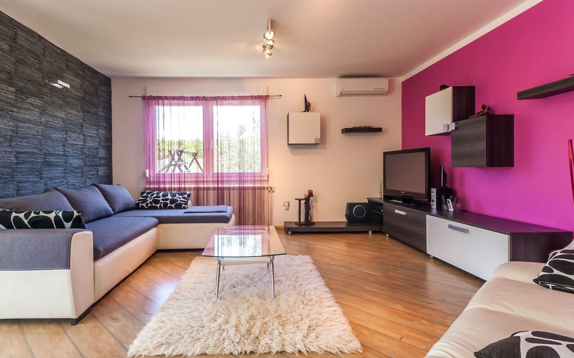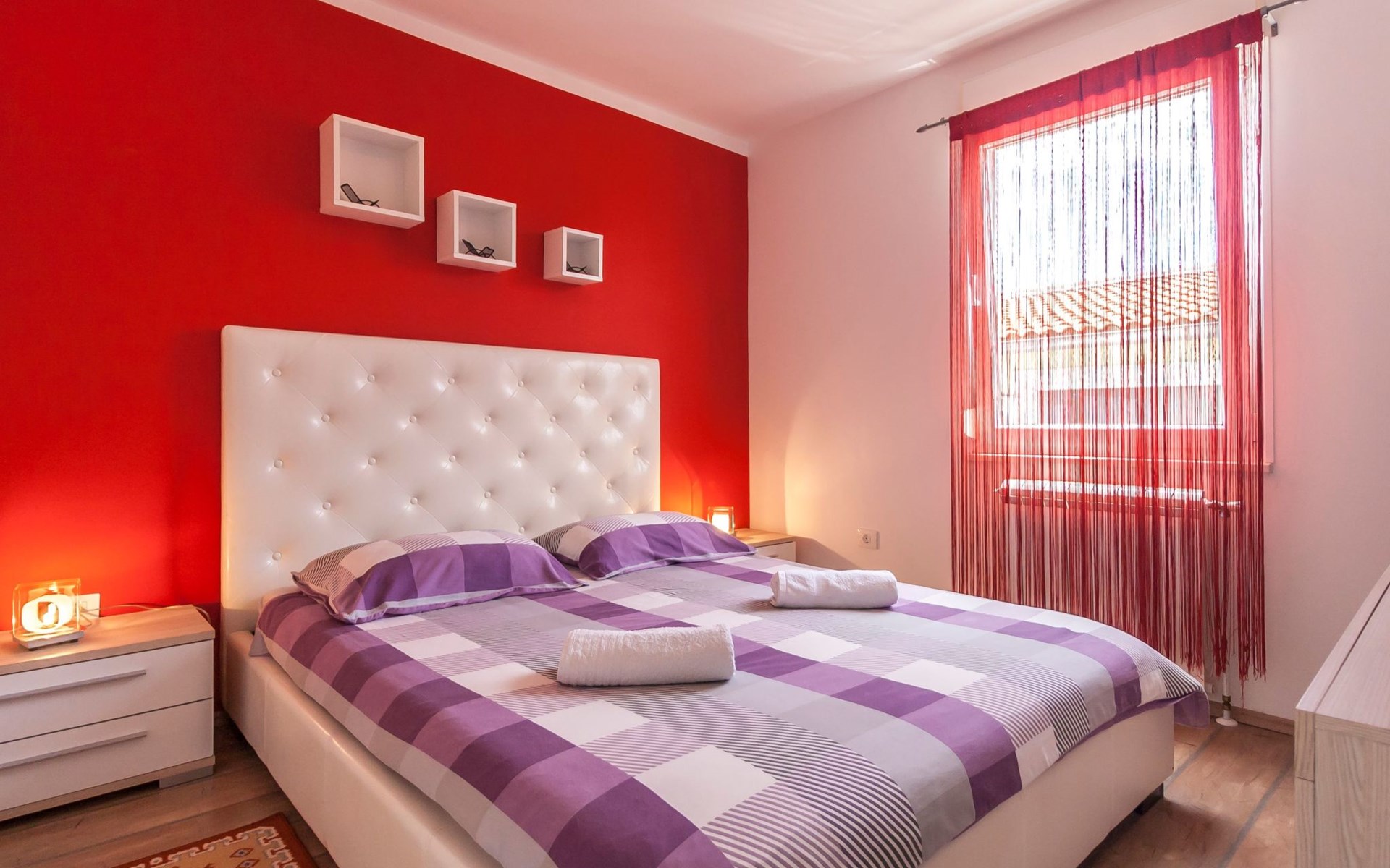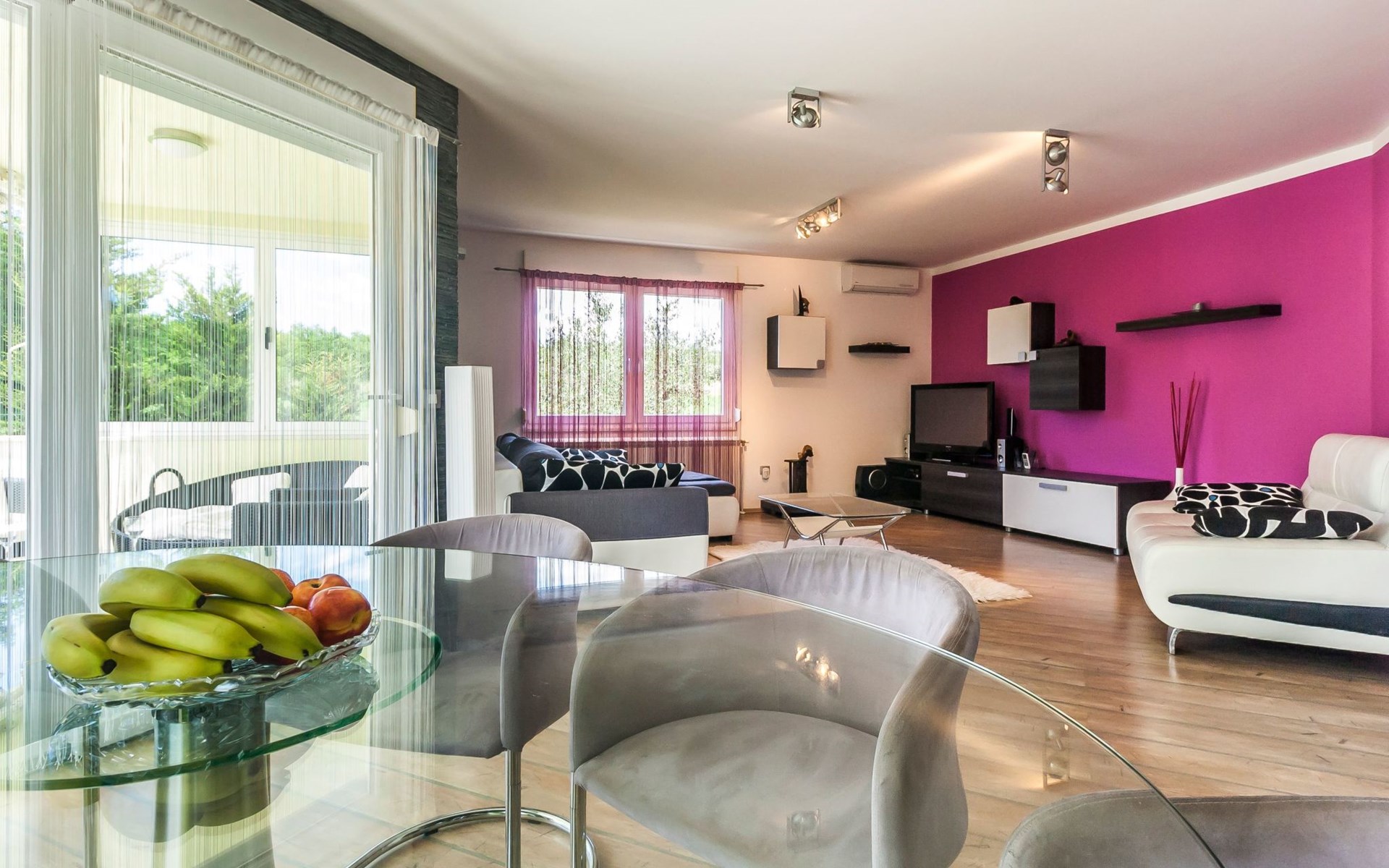 Das helle Ferienhaus ist farbenfroh eingerichtet. Es bietet auf 130 m² allen modernen Komfort mit funktionalem Design für fünf Personen. Es verfügt über zwei farblich harmonisch gestaltete Schlafzimmer mit einem Doppelbett im ersten und einem Doppel- sowie einem Einzelbett im zweiten Zimmer. Zwischen den beiden Räumen befindet sich ein Schrank. Eines der zwei Badezimmer ist mit Dusche, WC und Waschmaschine ausgestattet. Im zweiten Bad gibt es eine Hydromassagewanne, ein Doppelwaschbecken mit Stauraum sowie ein WC und ein Bidet. Der geräumige, klimatisierte Wohnraum bekommt durch die großen Fenster viel Helligkeit. Er besteht aus dem Sitzbereich mit Sofalandschaft vor dem Fernseher, dem modernen Essplatz mit Glastisch und der offenen Küche, die komplett mit allen modernen Geräten ausgestattet ist.