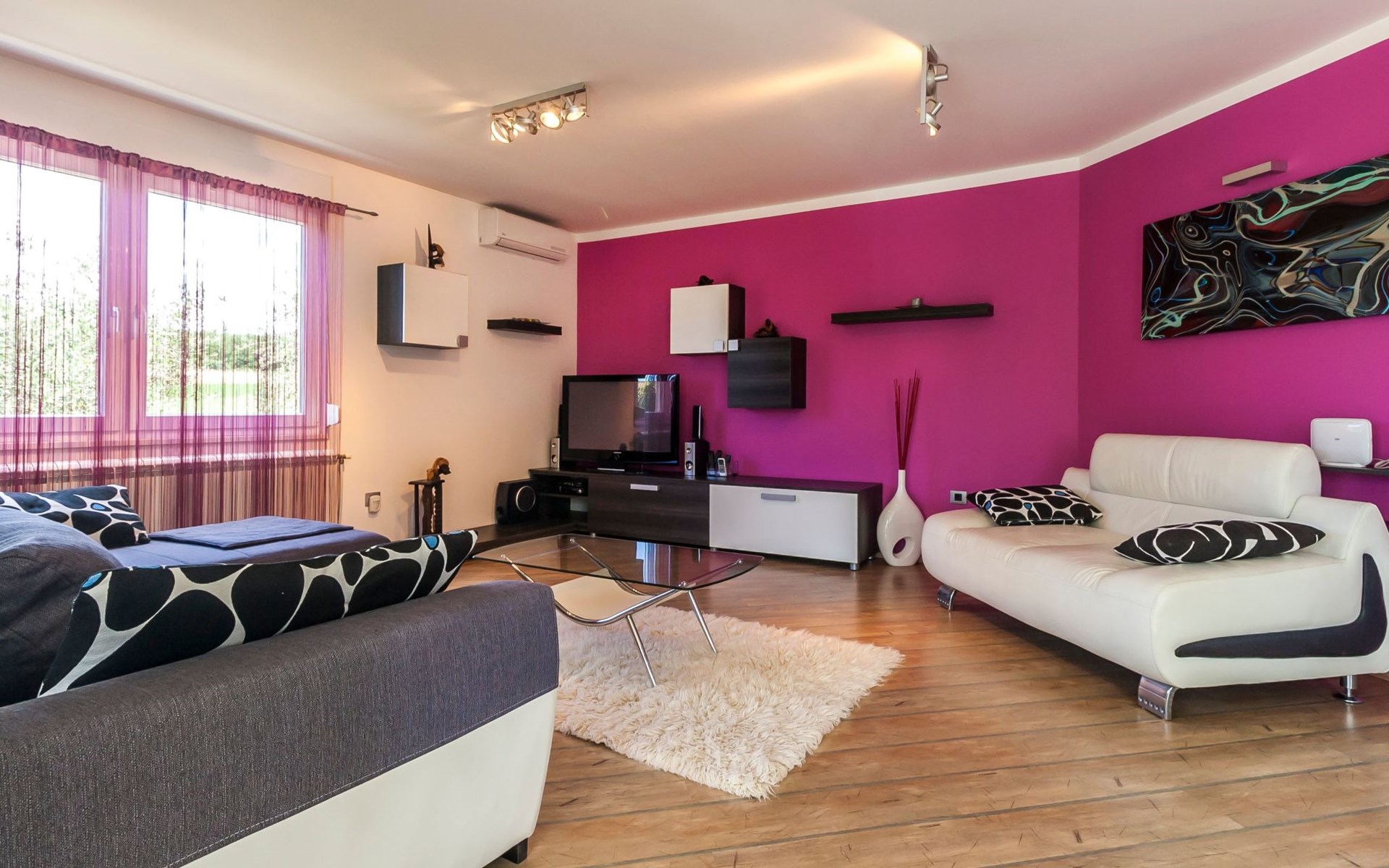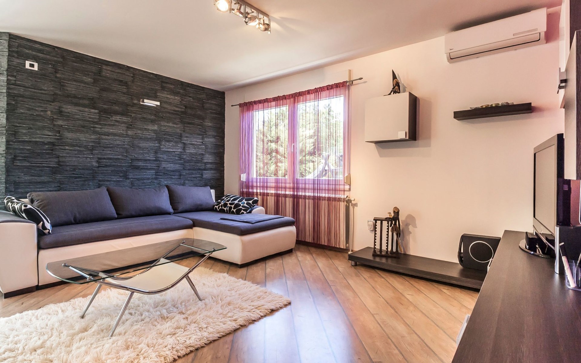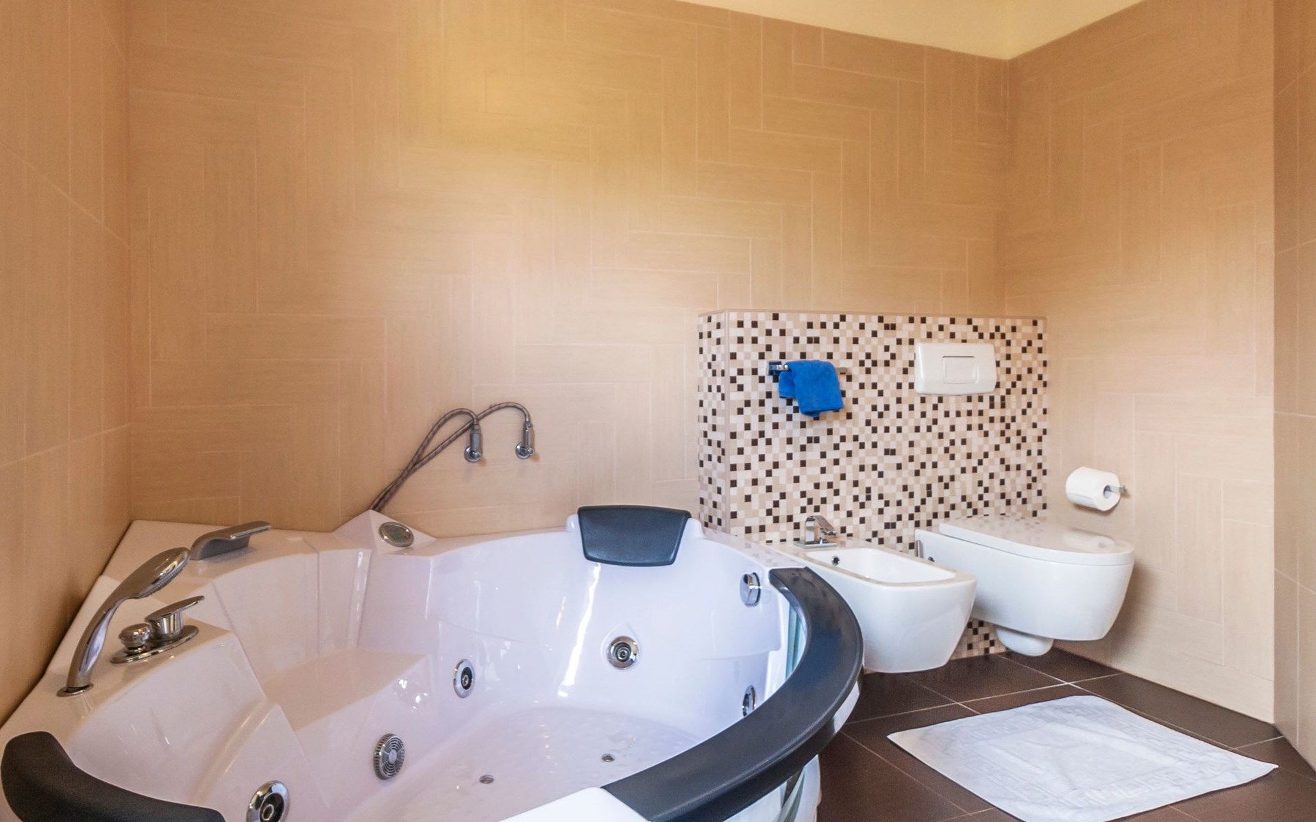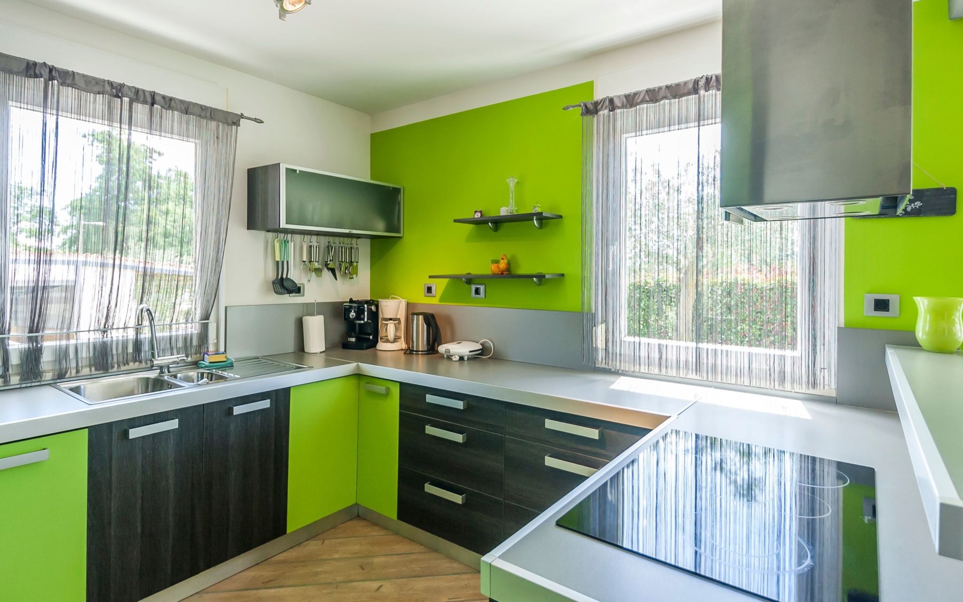 Das helle Ferienhaus ist farbenfroh eingerichtet. Es bietet auf 130 m² allen modernen Komfort mit funktionalem Design für fünf Personen. Es verfügt über zwei farblich harmonisch gestaltete Schlafzimmer mit einem Doppelbett im ersten und einem Doppel- sowie einem Einzelbett im zweiten Zimmer. Zwischen den beiden Räumen befindet sich ein Schrank. Eines der zwei Badezimmer ist mit Dusche, WC und Waschmaschine ausgestattet. Im zweiten Bad gibt es eine Hydromassagewanne, ein Doppelwaschbecken mit Stauraum sowie ein WC und ein Bidet. Der geräumige, klimatisierte Wohnraum bekommt durch die großen Fenster viel Helligkeit. Er besteht aus dem Sitzbereich mit Sofalandschaft vor dem Fernseher, dem modernen Essplatz mit Glastisch und der offenen Küche, die komplett mit allen modernen Geräten ausgestattet ist.