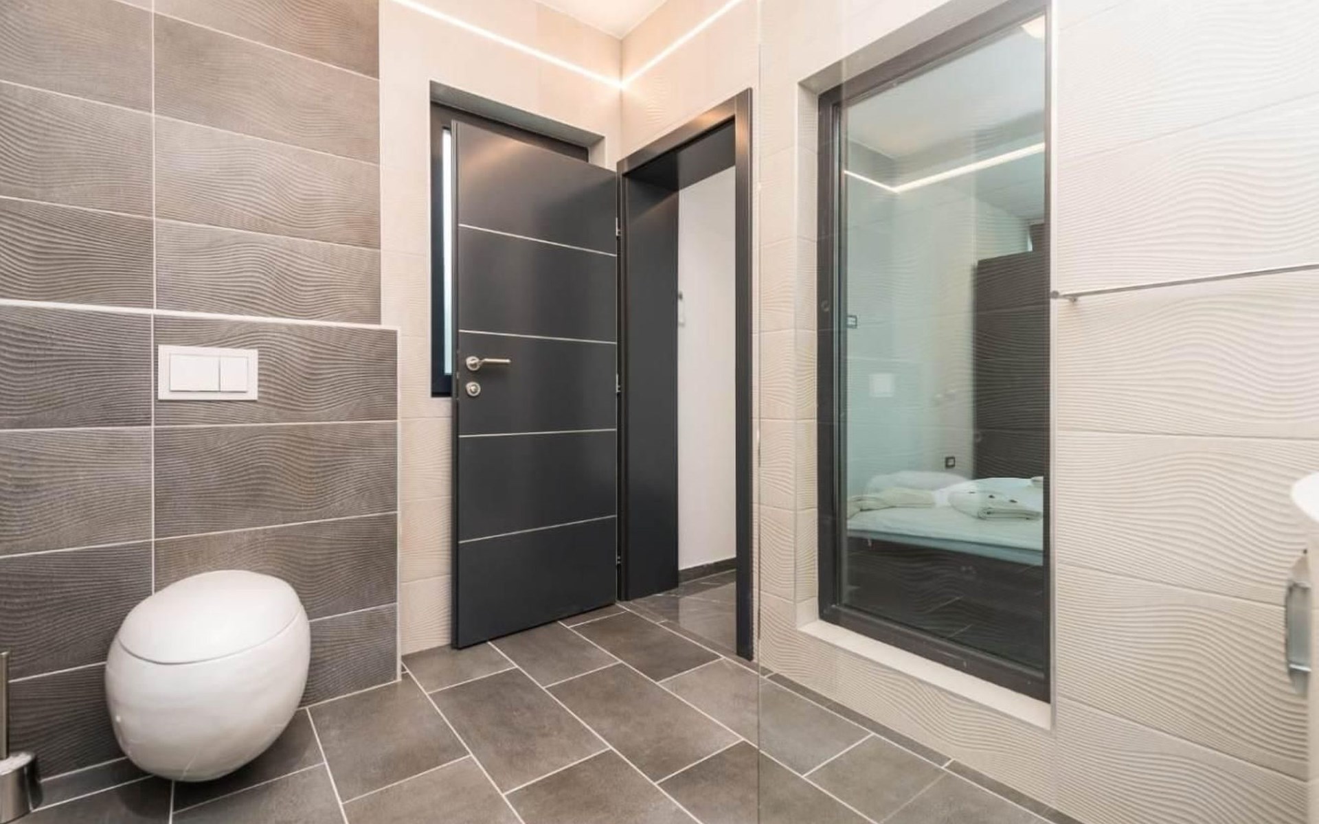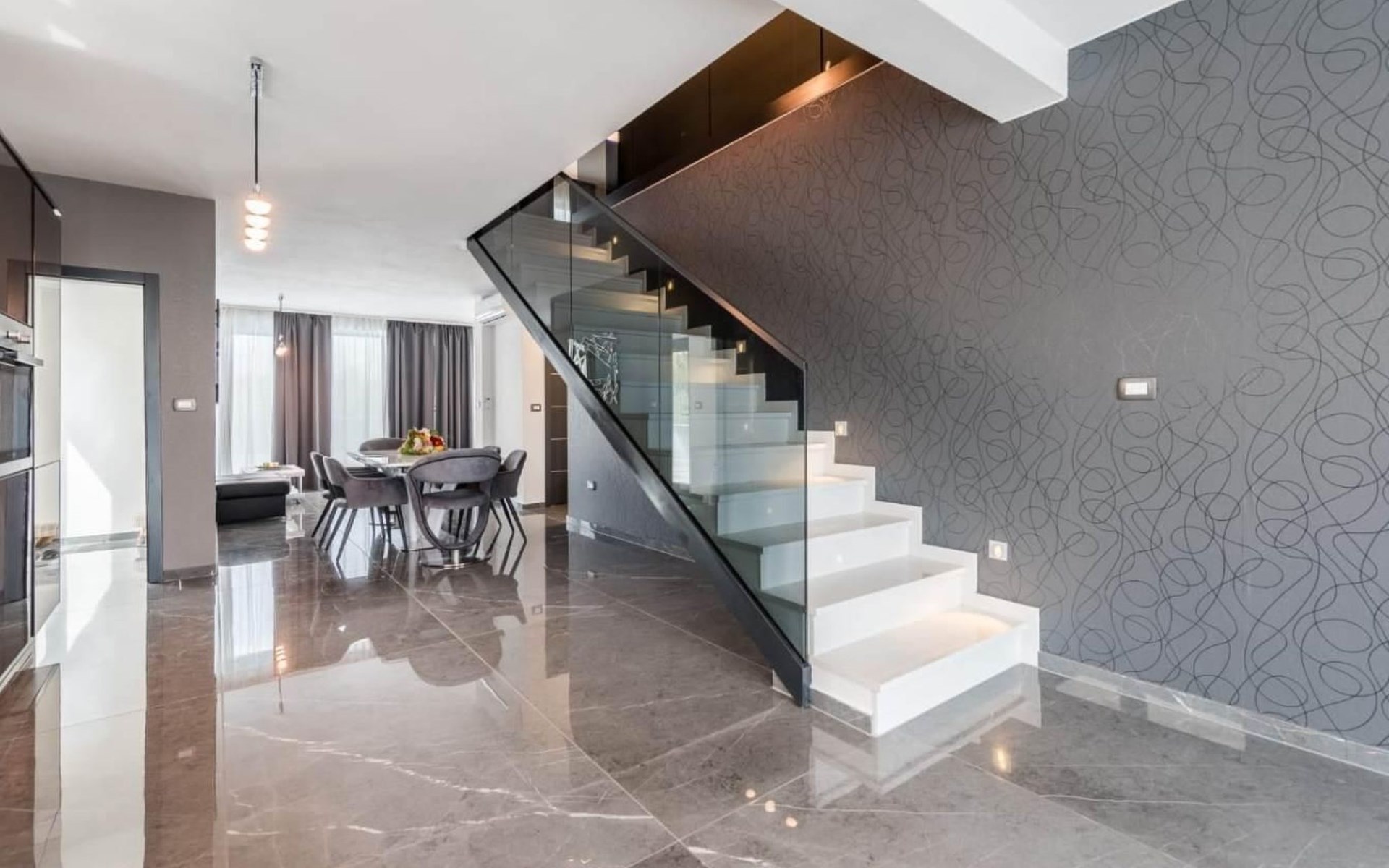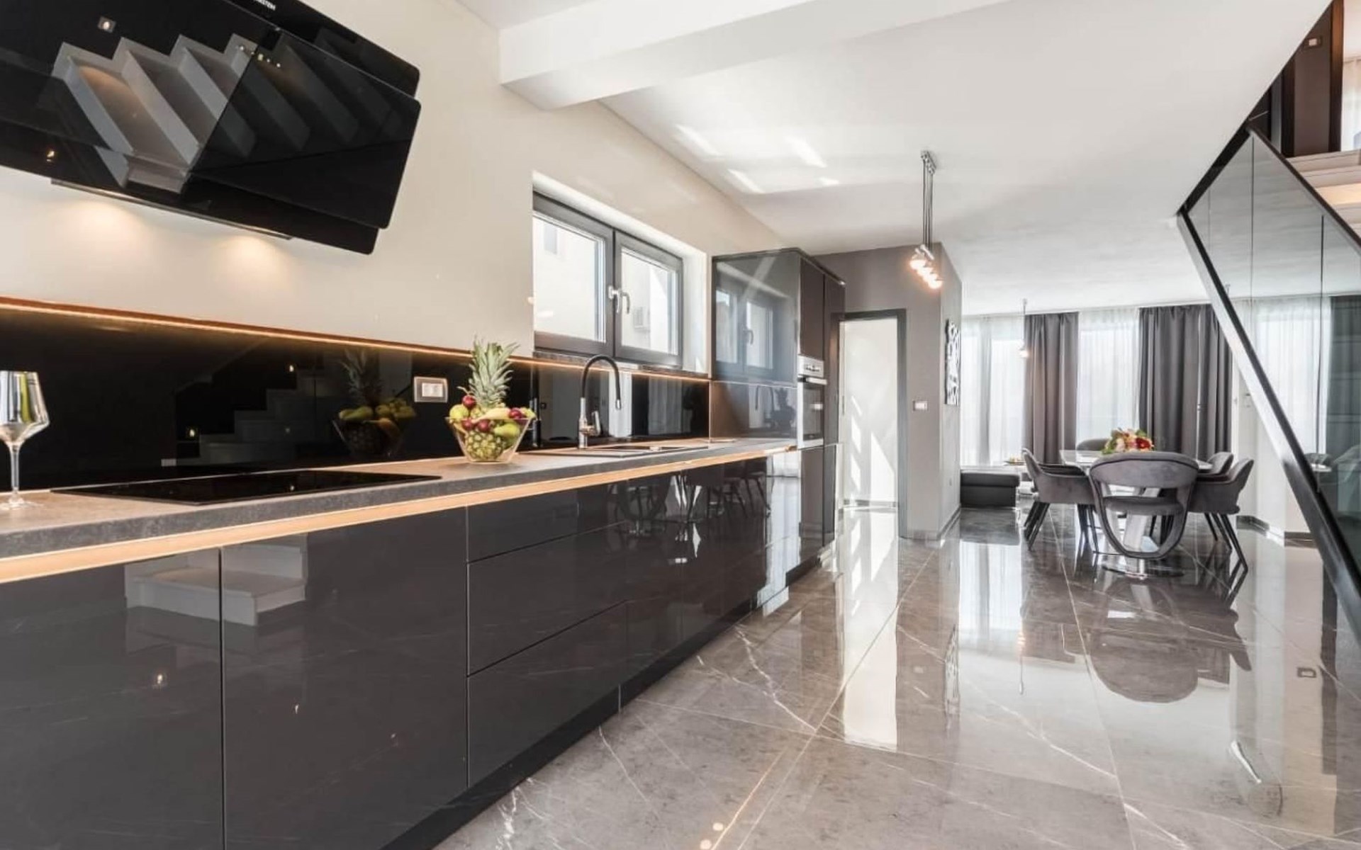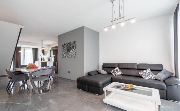Außerdem können Sie sich auf dem gesamten Grundstück an einer erstaunlichen und sorgfältig ausgewählten Inneneinrichtung in Grautönen erfreuen, die dieser Villa einen zusätzlichen Hauch von anspruchsvollem Luxus verleiht. In der ersten Etage gibt es eine voll ausgestattete Küche, ein Esszimmer und ein geräumiges, modernes Wohnzimmer, das zum Entspannen und zum gemütlichen Beisammensein mit der Familie einlädt.