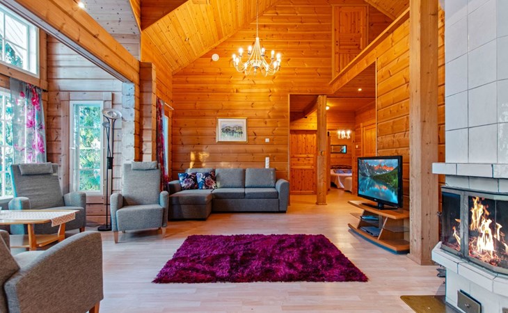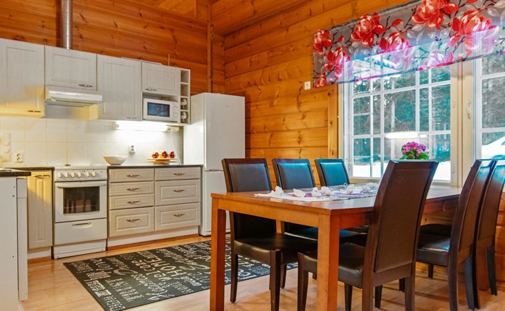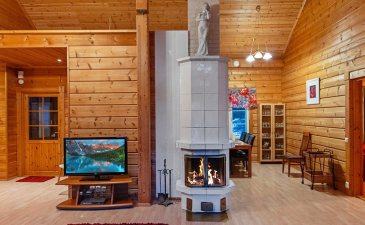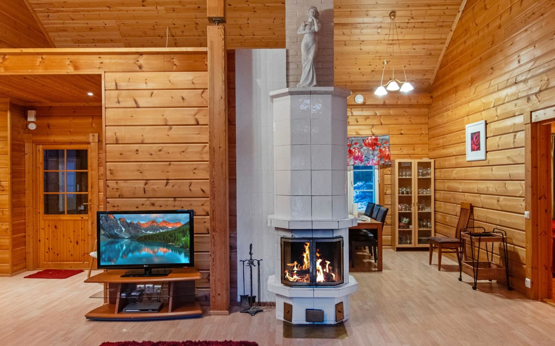 The log villa, built in 2006, features a spacious living room, dining area, and combined living room/kitchen. There are three bedrooms, one with two beds and the other with three beds. Additionally, the living room includes a sofa bed (140 x 200 cm) that can accommodate two more guests.
