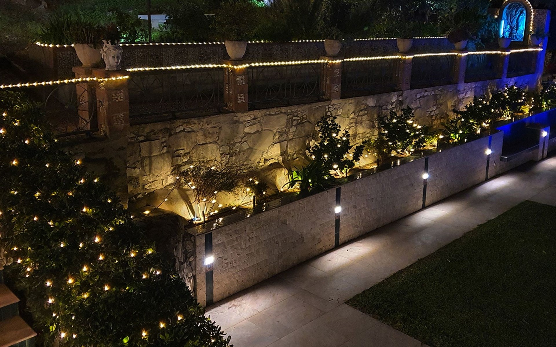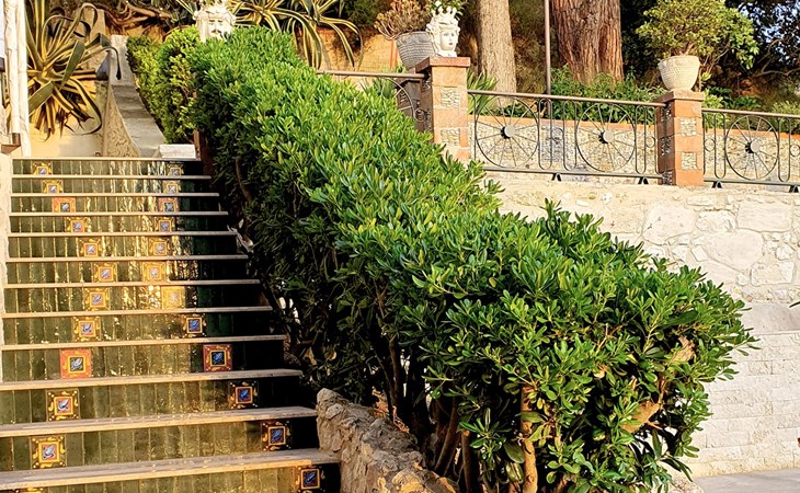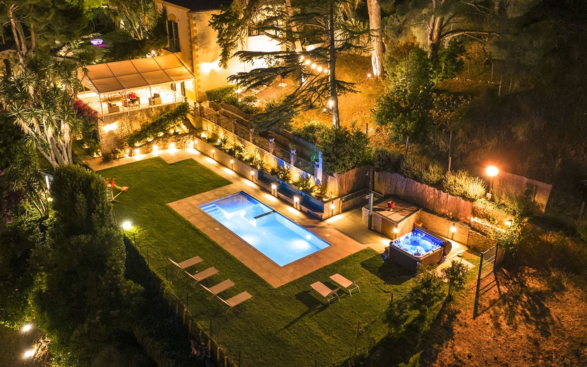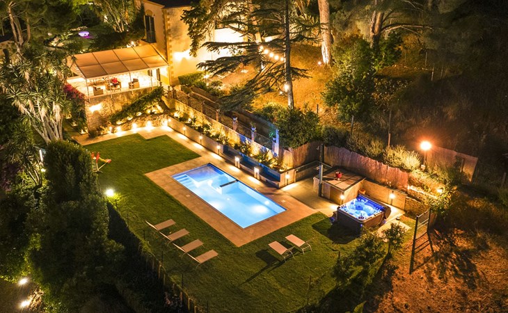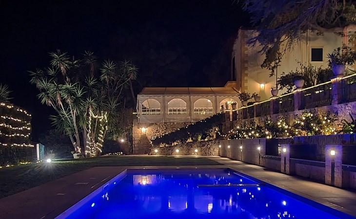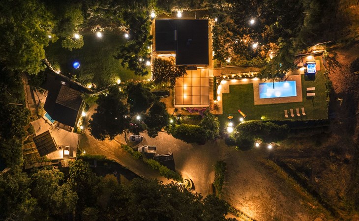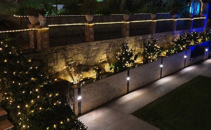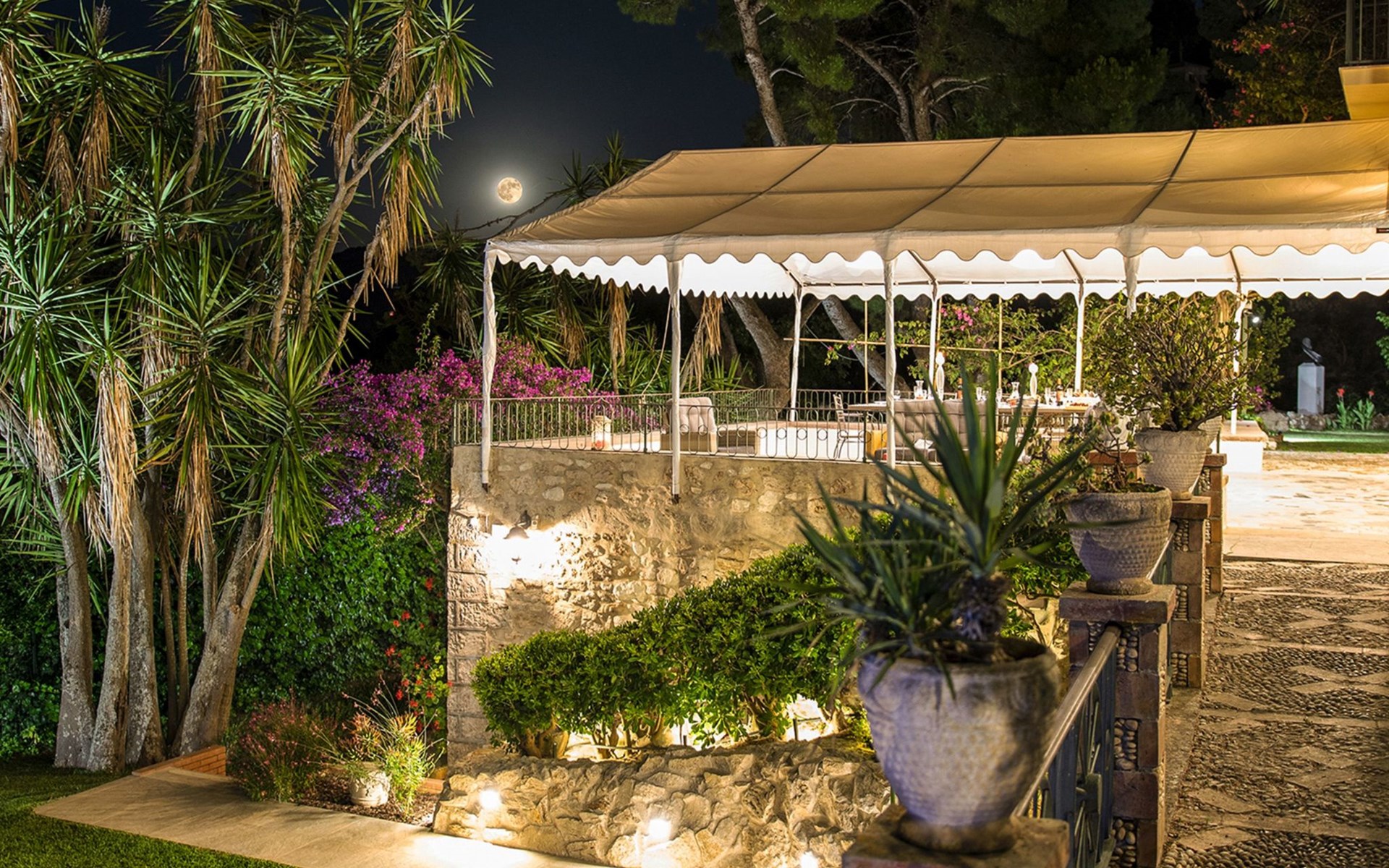 Beeindruckend ist der nachts beleuchtete Garten mit üppiger Vegetation, mediterraner Macchia und einem Zitronenhain.