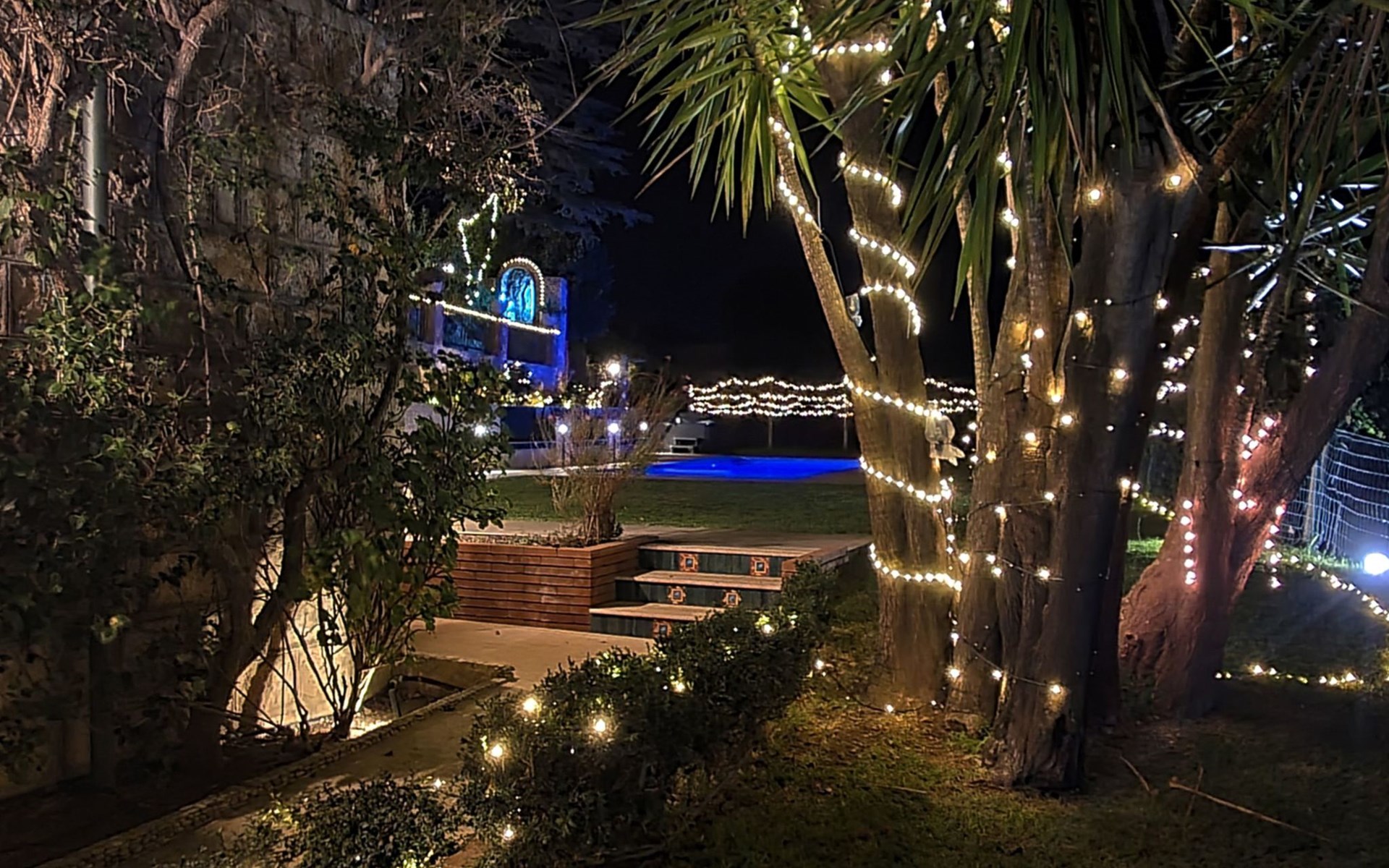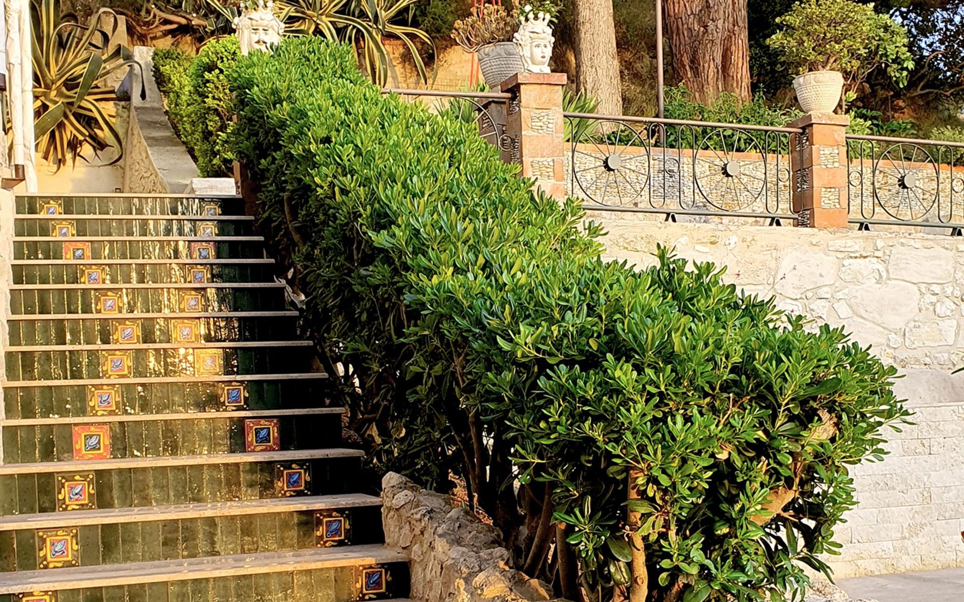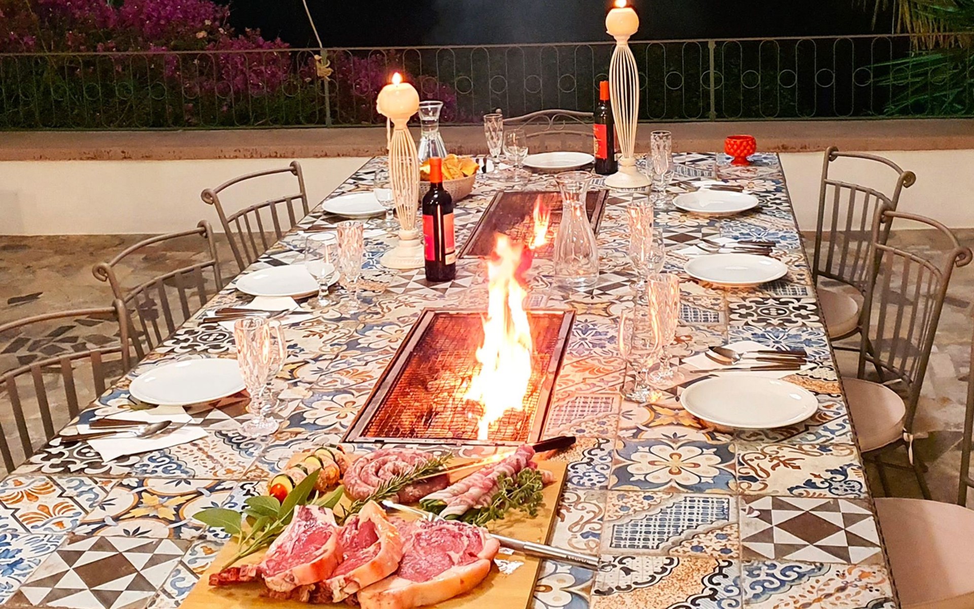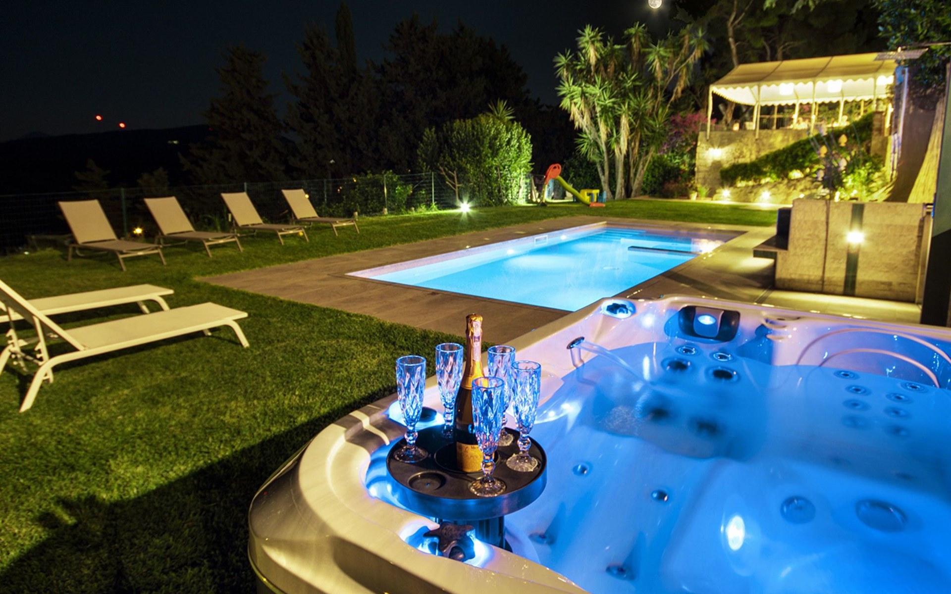 Beeindruckend ist der nachts beleuchtete Garten mit üppiger Vegetation, mediterraner Macchia und einem Zitronenhain.