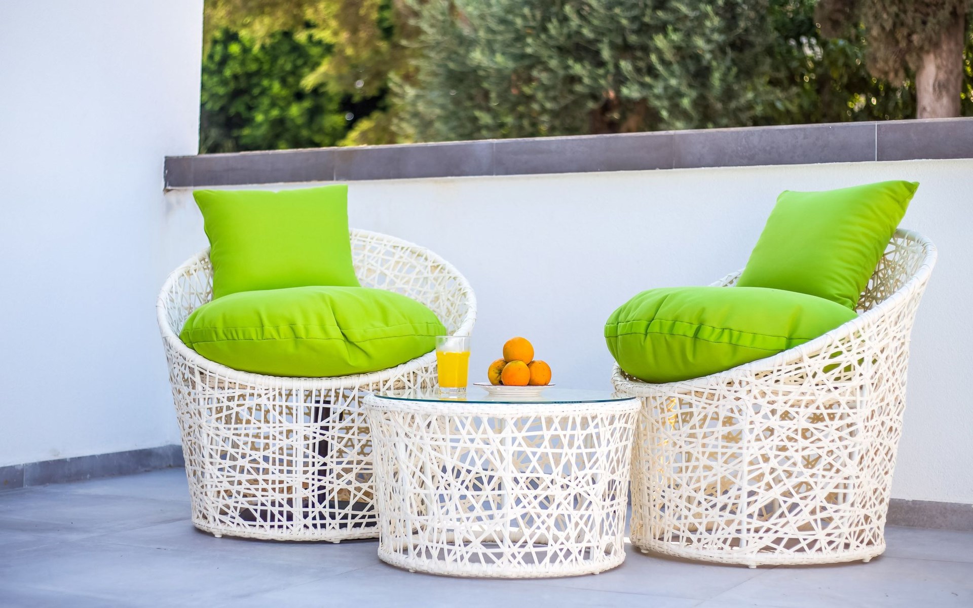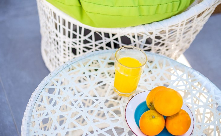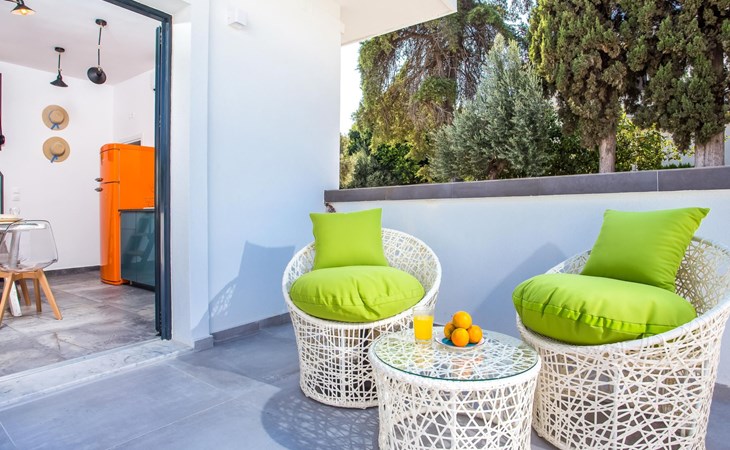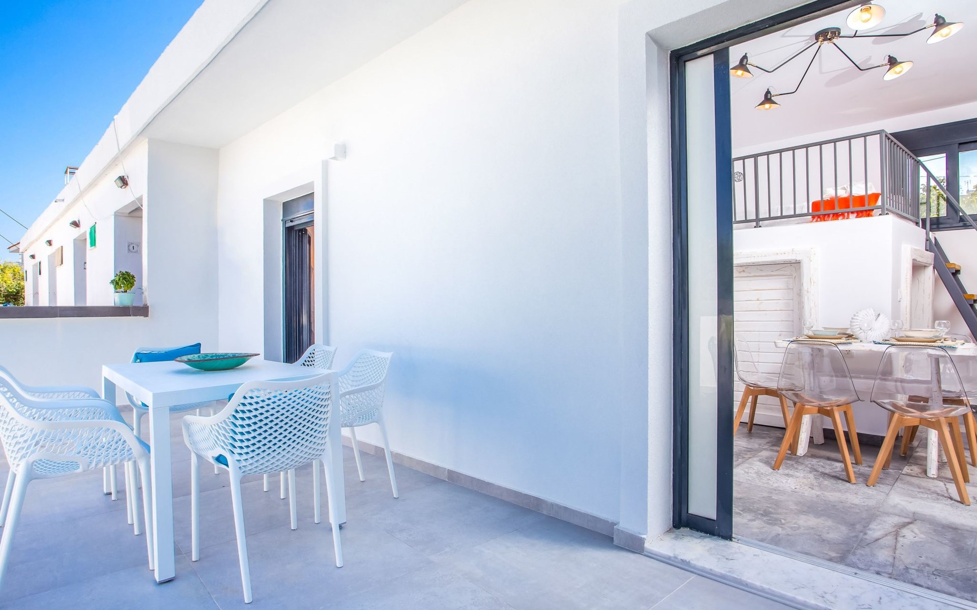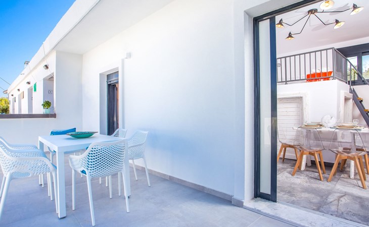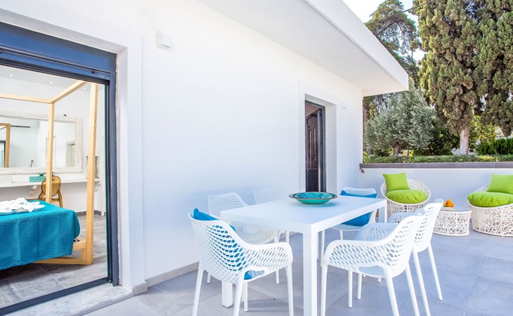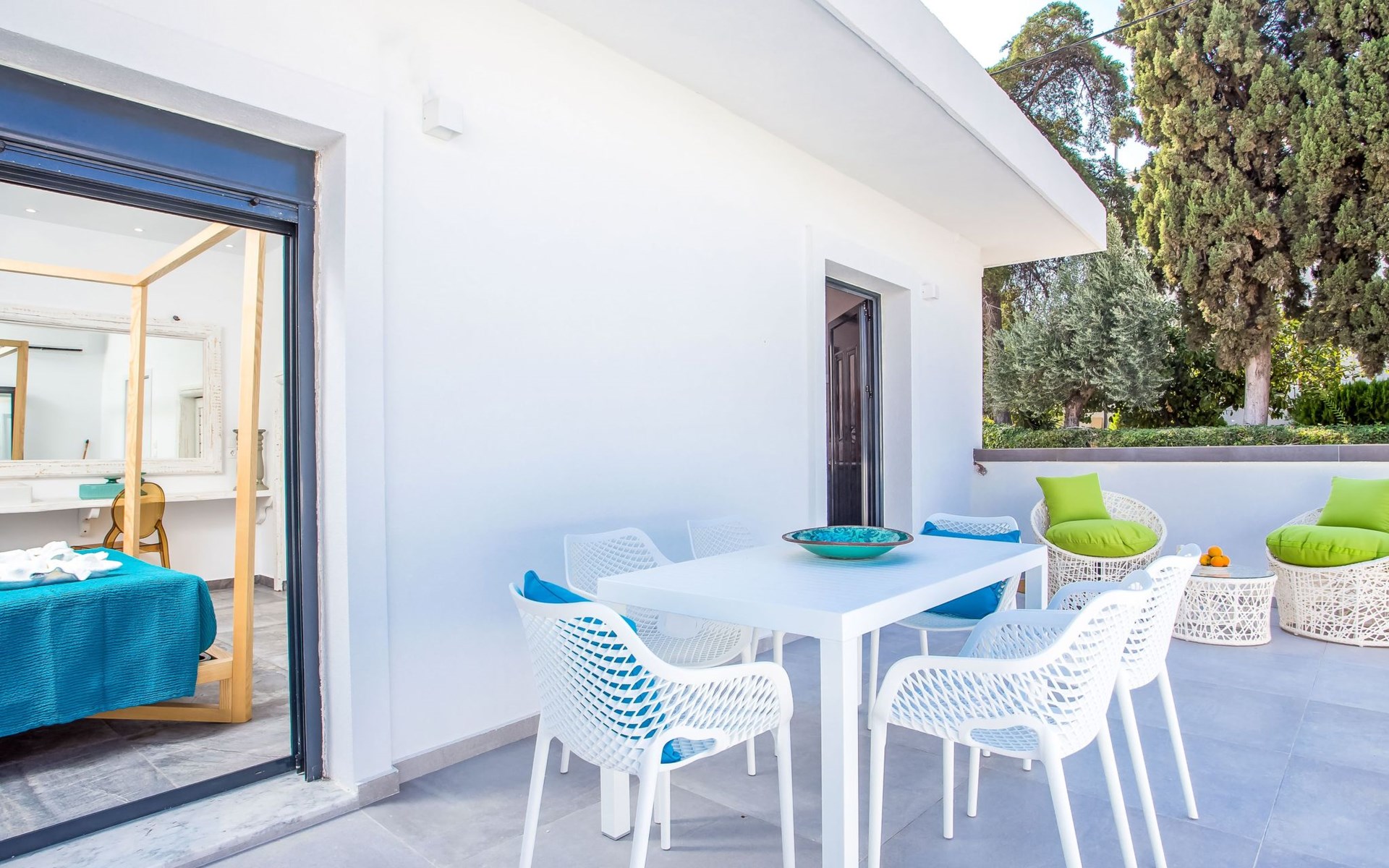 Eine sehr komfortable private Terrasse, die von einer Mauer und einem privaten Eingang umgeben ist, verfügt über einen großen Sonnenschirm und Gartenmöbel für die Gäste, um die Sonne im Sommer zu genießen.