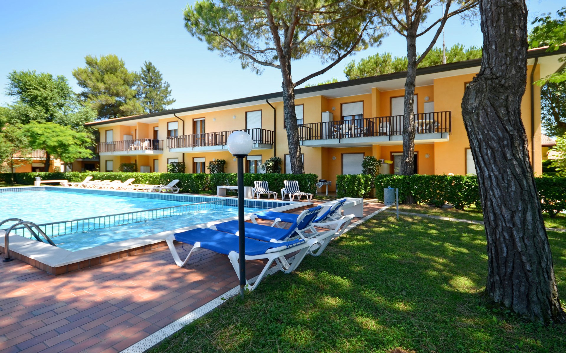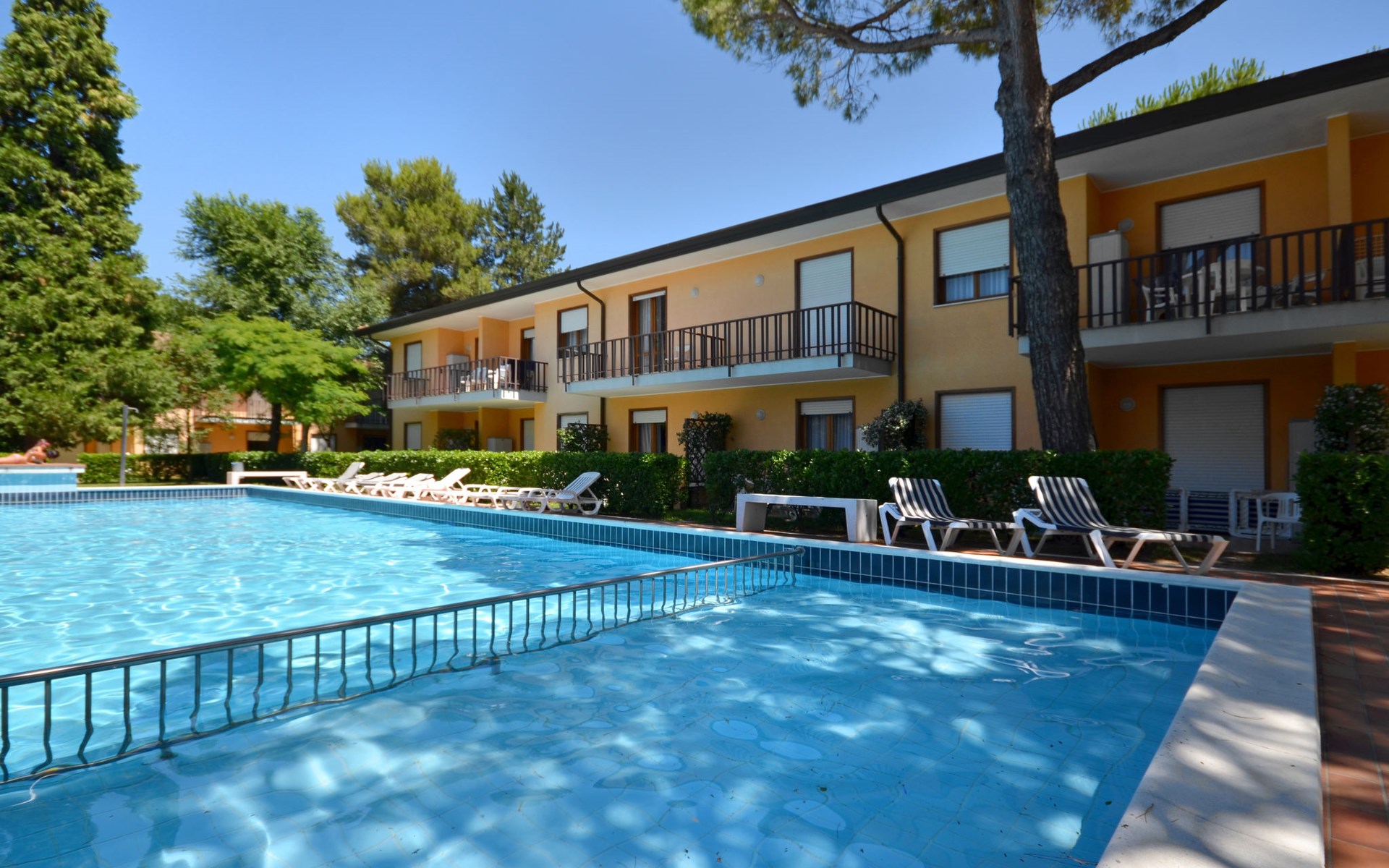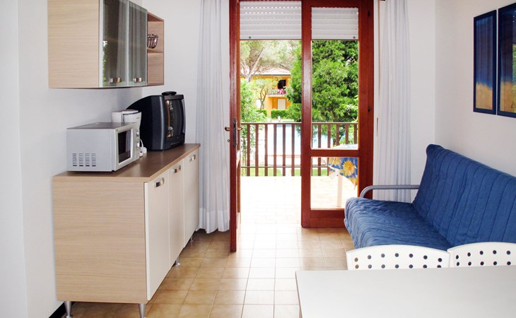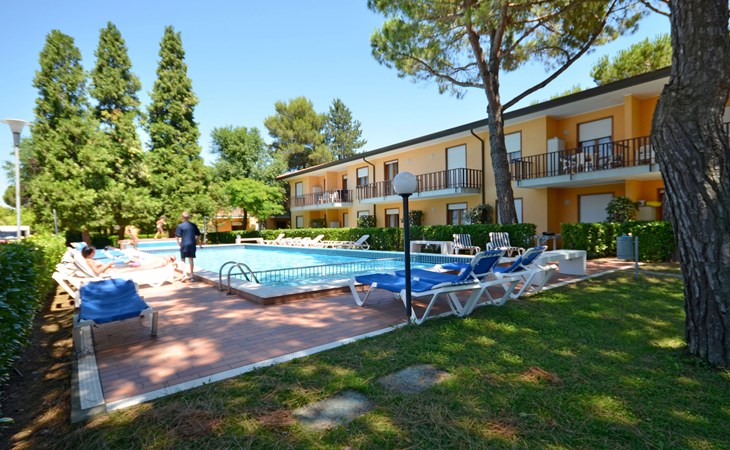 Kleine Ferienanlage "Villaggio Gelsomini", auf 2 Stockwerken. 20 Wohnungen in der Residenz. Im Ortsteil Bibione-Spiaggia, 1 km vom Zentrum von Bibione, 13 km vom Zentrum von Lignano, 100 km vom Zentrum von Venezia, 1.3 km vom Meer. Zur Mitbenutzung: Grundstück (eingezäunt), Garten mit Pflanzen und Bäumen, Schwimmbad (16 x 6 m, saisonale Verfügbarkeit: 15.Mai. - 27.Sep.). Kinderbecken. In der Anlage: Wireless LAN (extra). Fahrradverleih. Öffentliche Parkplätze auf der Strasse. Supermarkt 400 m, Restaurant 650 m, Bushaltestelle 400 m, Bahnstation "Latisana (Milano-Venezia-Triest)" 21 km, Sandstrand 1.3 km, Thermalbad "Bibione Thermae" 2.2 km. Golfplatz (18 Loch) 11 km. Nahe gelegene Sehenswürdigkeiten: Oasi Naturalistica Val Grande - Bibione. Der Besitzer akzeptiert keine Gruppen. Strandservice: Von ca. Anfang Mai bis ca. Ende September sind jeweils 1 Liegestuhl, 1 Sonnenliege und 1 Sonnenschirm pro Wohnung im Mietpreis enthalten. Shuttleservice: Von ca. 23.05.-11.09. kostenloser Shuttlebus zum Strandabschnitt 'Un Nuovo Posto al Sole' (täglich im 30-Minuten-Rhythmus, von 8-19 h).