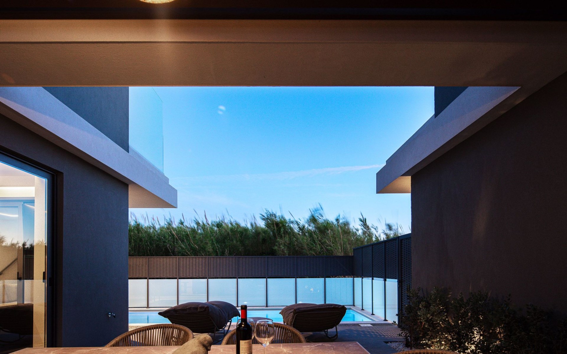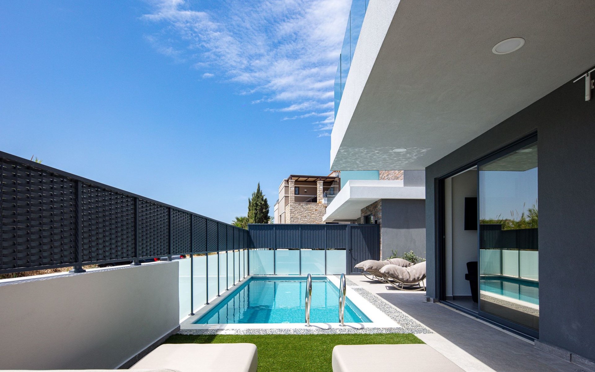 Der 120 Quadratmeter große private Außenbereich der Villa ist für unbeschwerte Freizeit und Komfort ausgelegt. Der 20 m² große private Pool ist umgeben von einer Liegewiese mit 2 Sonnenliegen, 2 langen Stühlen und Beistelltischen zum Entspannen in der Sonne. Eine Dusche am Pool steht Ihnen ebenfalls zur Verfügung. Genießen Sie Ihre Mahlzeiten im Freien unter dem von einer Pergola beschatteten Essbereich, neben einer voll ausgestatteten Grillecke mit Elektrogrill und Spüle - ideal für die Zubereitung frischer Mahlzeiten und das Beisammensein mit Ihren Lieben.