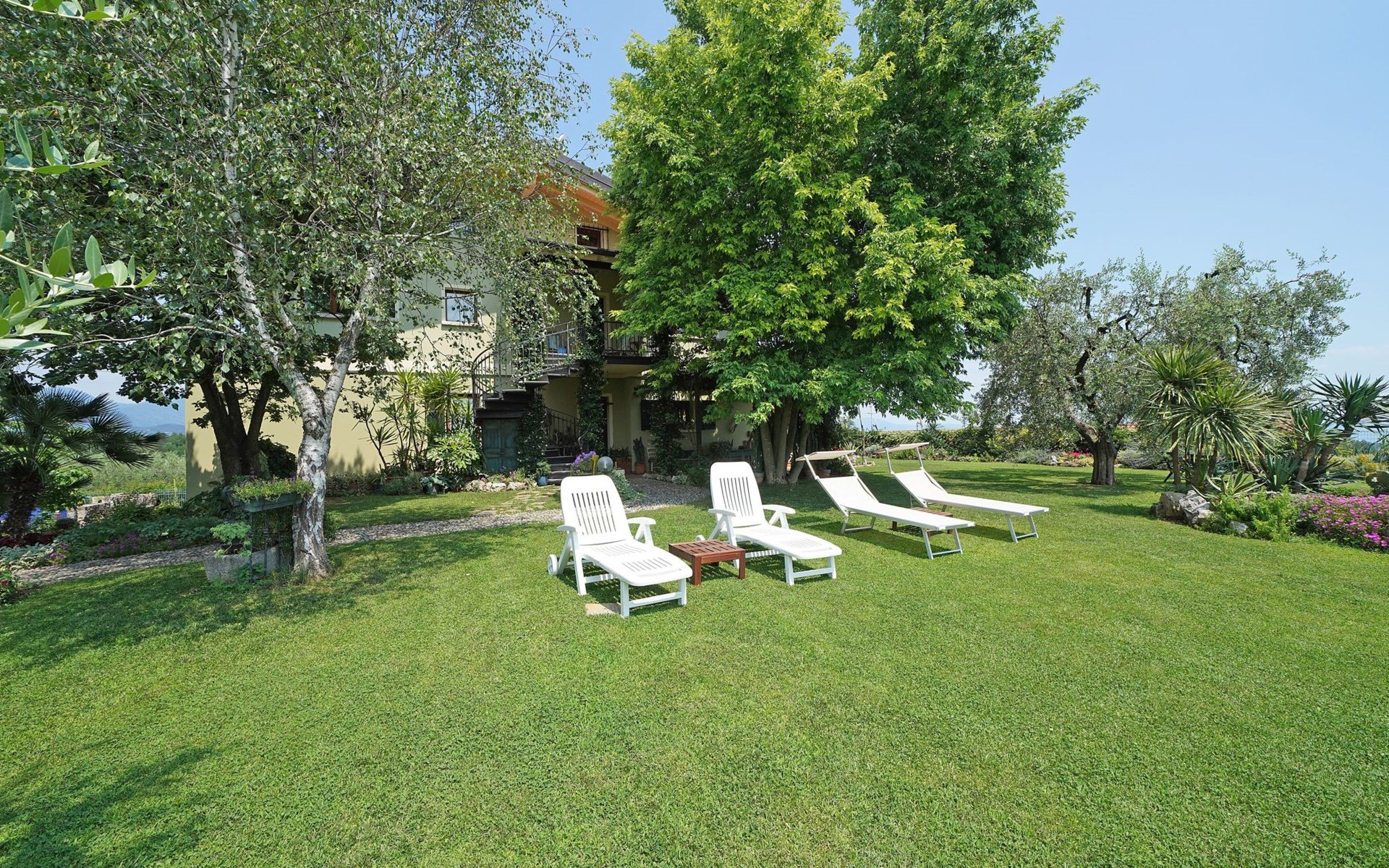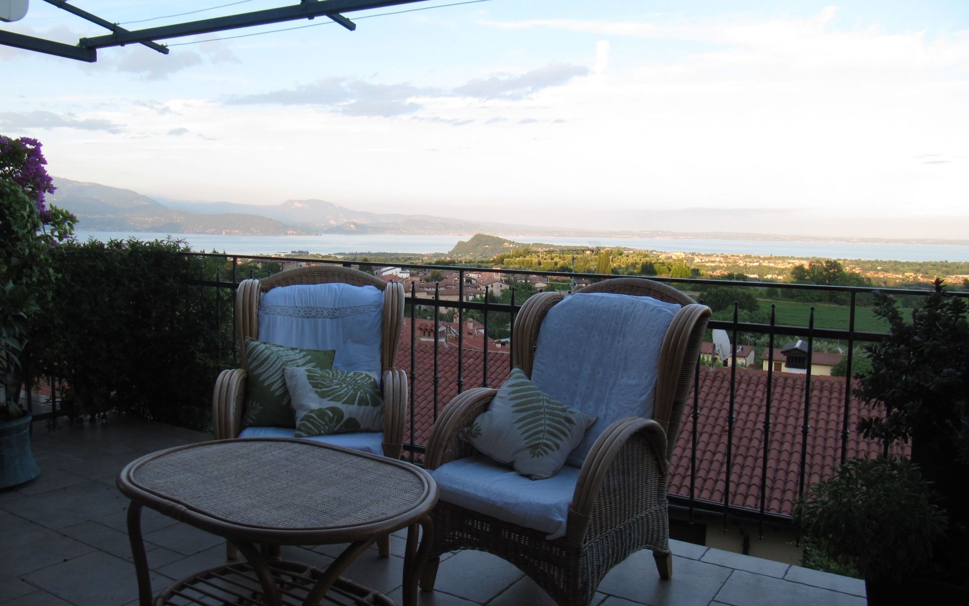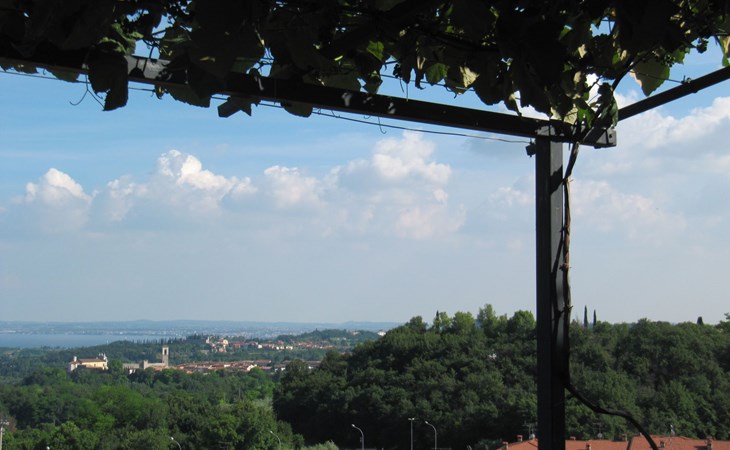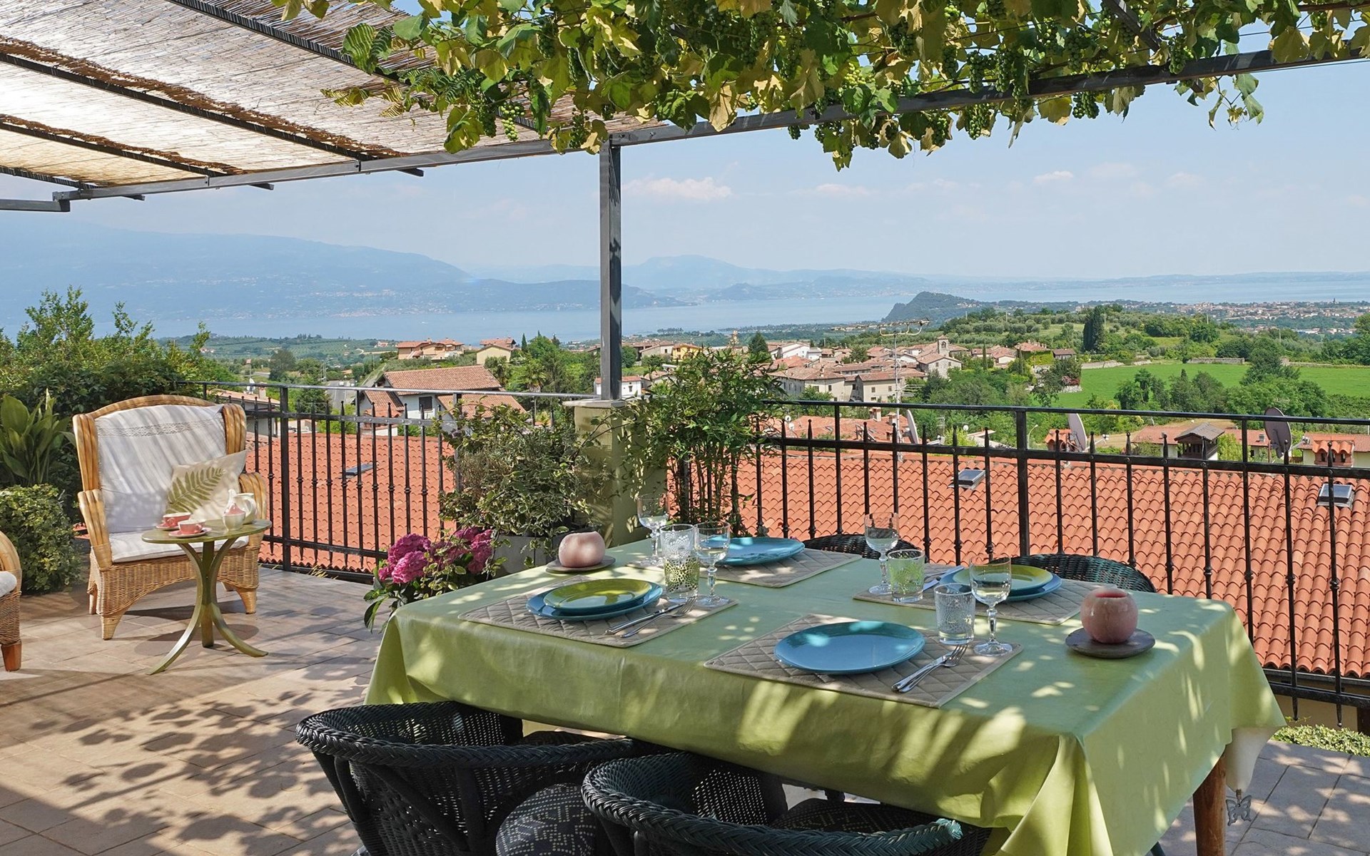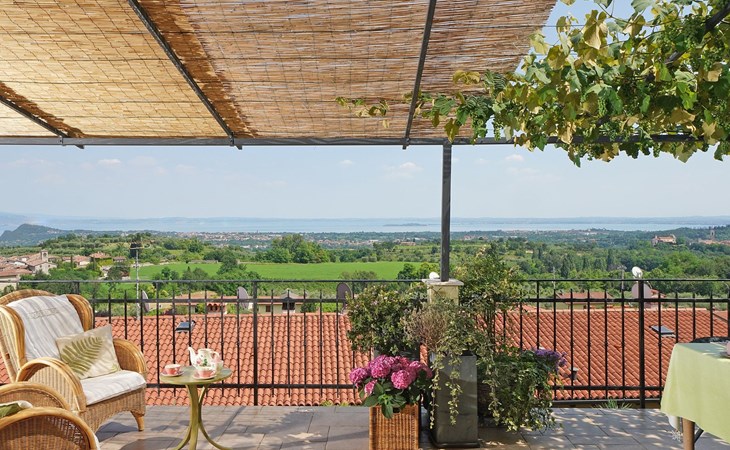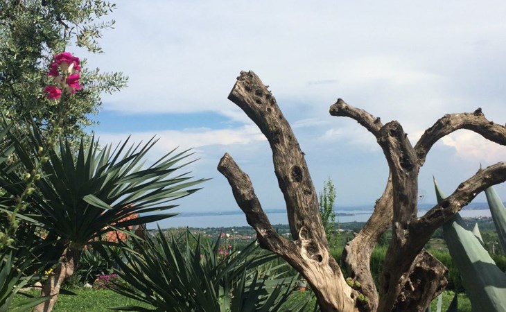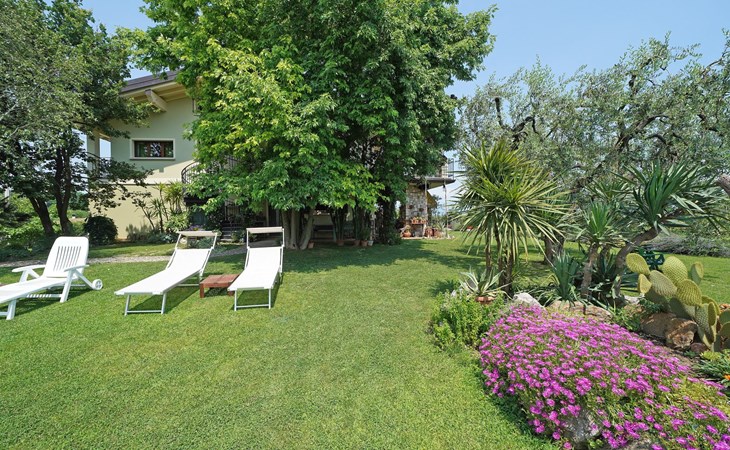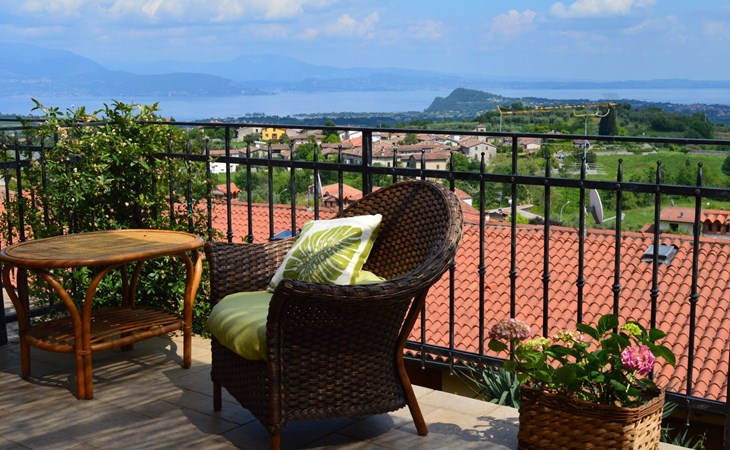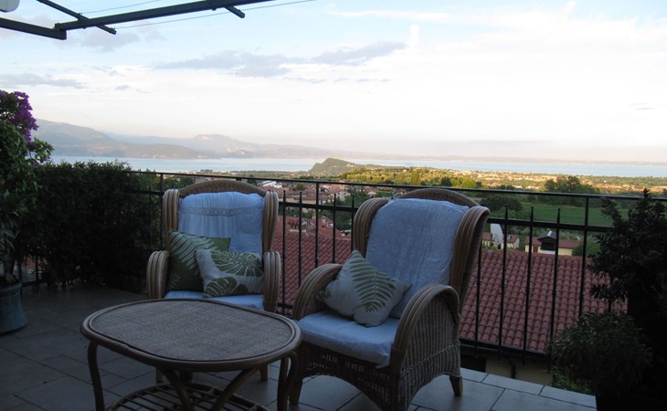 Die Wohnung "TERRAZZE SUL GARDA" ist fantastisch und einzigartig; sie befindet sich im ersten und letzten Stock eines zweistöckigen Hauses, ist durch einen separaten Eingang zu erreichen und ist von einem großen und gepflegten Garten umgeben. Die Wohnung ist dank der hohen Holzdecken und großen Fenster sehr hell. Sie ist ca. 100 qm groß und öffnet sich zu einer ca. 40 qm großen Terrasse, von der aus man einen der schönsten Ausblicke auf den Gardasee und die Valtenesi-Hügel genießen kann. Die Wohnung ist mit modernen Annehmlichkeiten wie Geschirrspüler, TV, Heizung, Internet usw. ausgestattet, aber mit antiken Möbeln eingerichtet. Sie besteht aus 2 Doppelschlafzimmern mit Parkettboden, von denen man Zugang zu einer weiteren Terrasse mit Blick auf die umliegenden Hügel hat; beide haben ein eigenes Bad mit Dusche und Bidet. Ein großes Wohnzimmer mit einer voll ausgestatteten Küchenzeile und einem Entspannungsbereich mit einem Doppelschlafsofa führt auf die über 40 qm große Terrasse, die für Mahlzeiten im Freien ausgestattet ist. Die Wohnung ist ideal für Familien mit 5/6 Personen oder für zwei Paare.