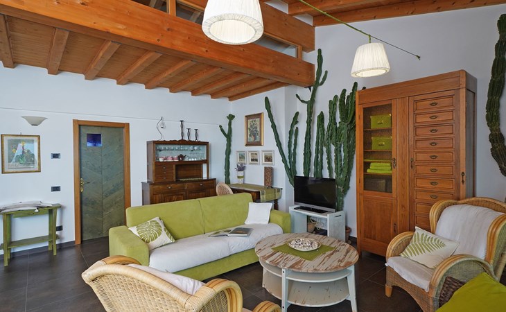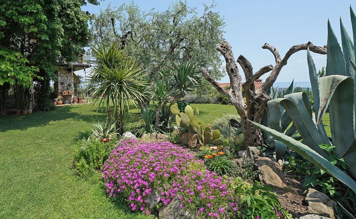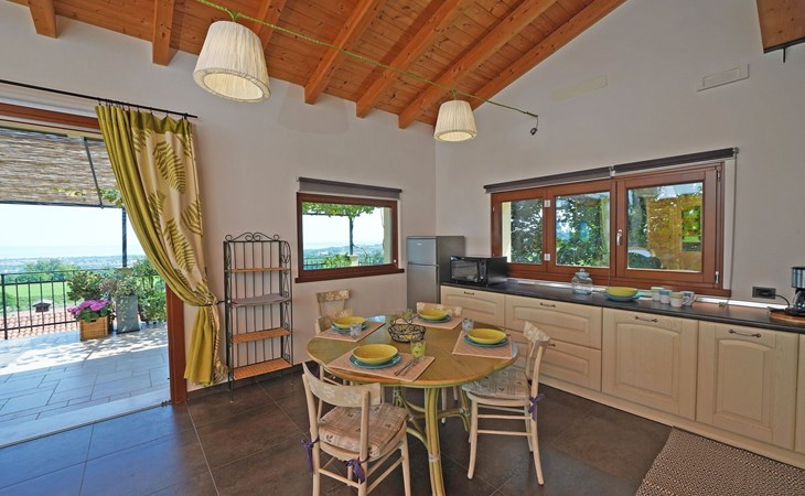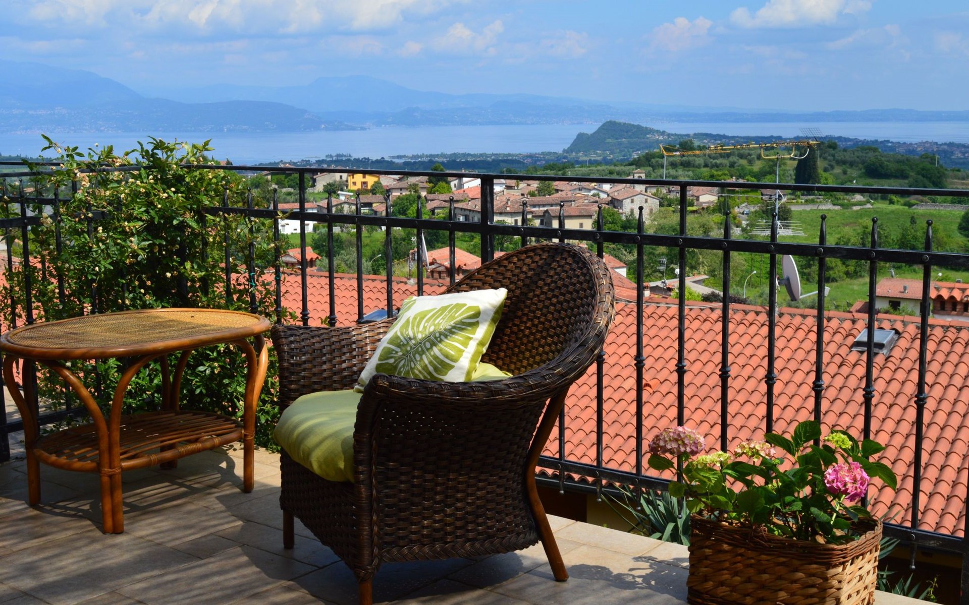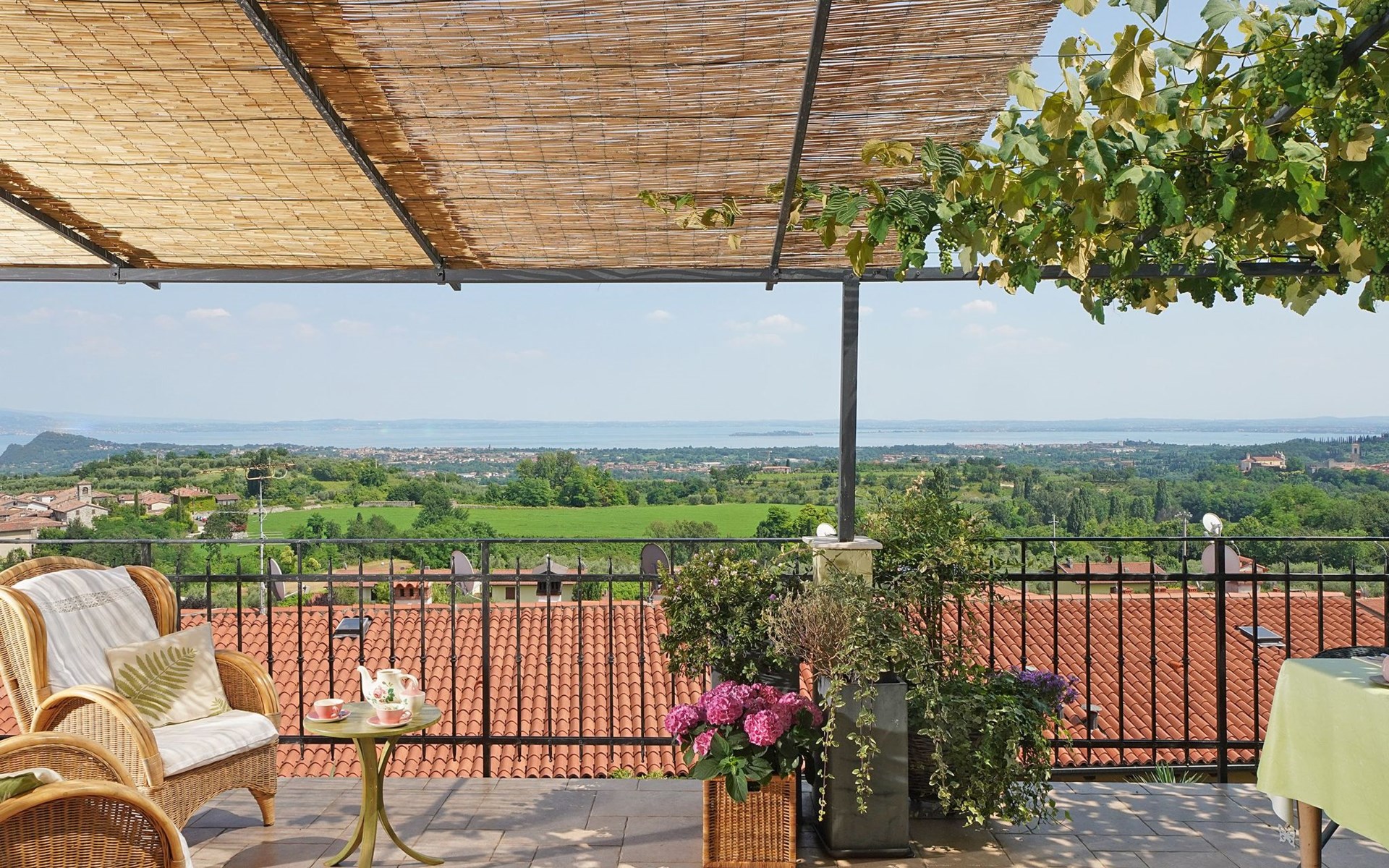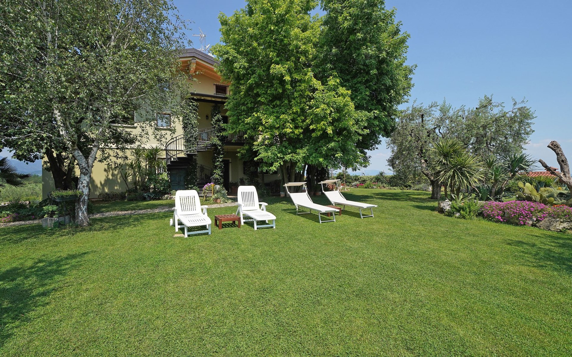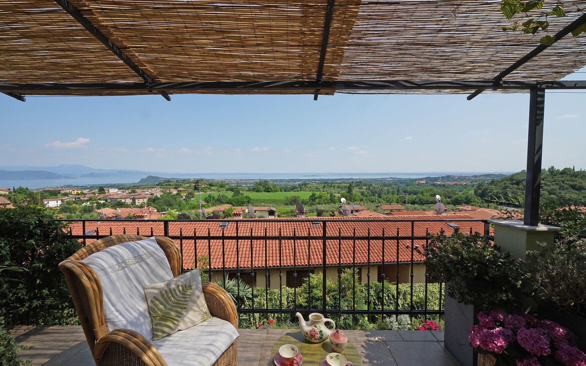 Die Wohnung "TERRAZZE SUL GARDA" ist fantastisch und einzigartig; sie befindet sich im ersten und letzten Stock eines zweistöckigen Hauses, ist durch einen separaten Eingang zu erreichen und ist von einem großen und gepflegten Garten umgeben. Die Wohnung ist dank der hohen Holzdecken und großen Fenster sehr hell. Sie ist ca. 100 qm groß und öffnet sich zu einer ca. 40 qm großen Terrasse, von der aus man einen der schönsten Ausblicke auf den Gardasee und die Valtenesi-Hügel genießen kann. Die Wohnung ist mit modernen Annehmlichkeiten wie Geschirrspüler, TV, Heizung, Internet usw. ausgestattet, aber mit antiken Möbeln eingerichtet. Sie besteht aus 2 Doppelschlafzimmern mit Parkettboden, von denen man Zugang zu einer weiteren Terrasse mit Blick auf die umliegenden Hügel hat; beide haben ein eigenes Bad mit Dusche und Bidet. Ein großes Wohnzimmer mit einer voll ausgestatteten Küchenzeile und einem Entspannungsbereich mit einem Doppelschlafsofa führt auf die über 40 qm große Terrasse, die für Mahlzeiten im Freien ausgestattet ist. Die Wohnung ist ideal für Familien mit 5/6 Personen oder für zwei Paare.