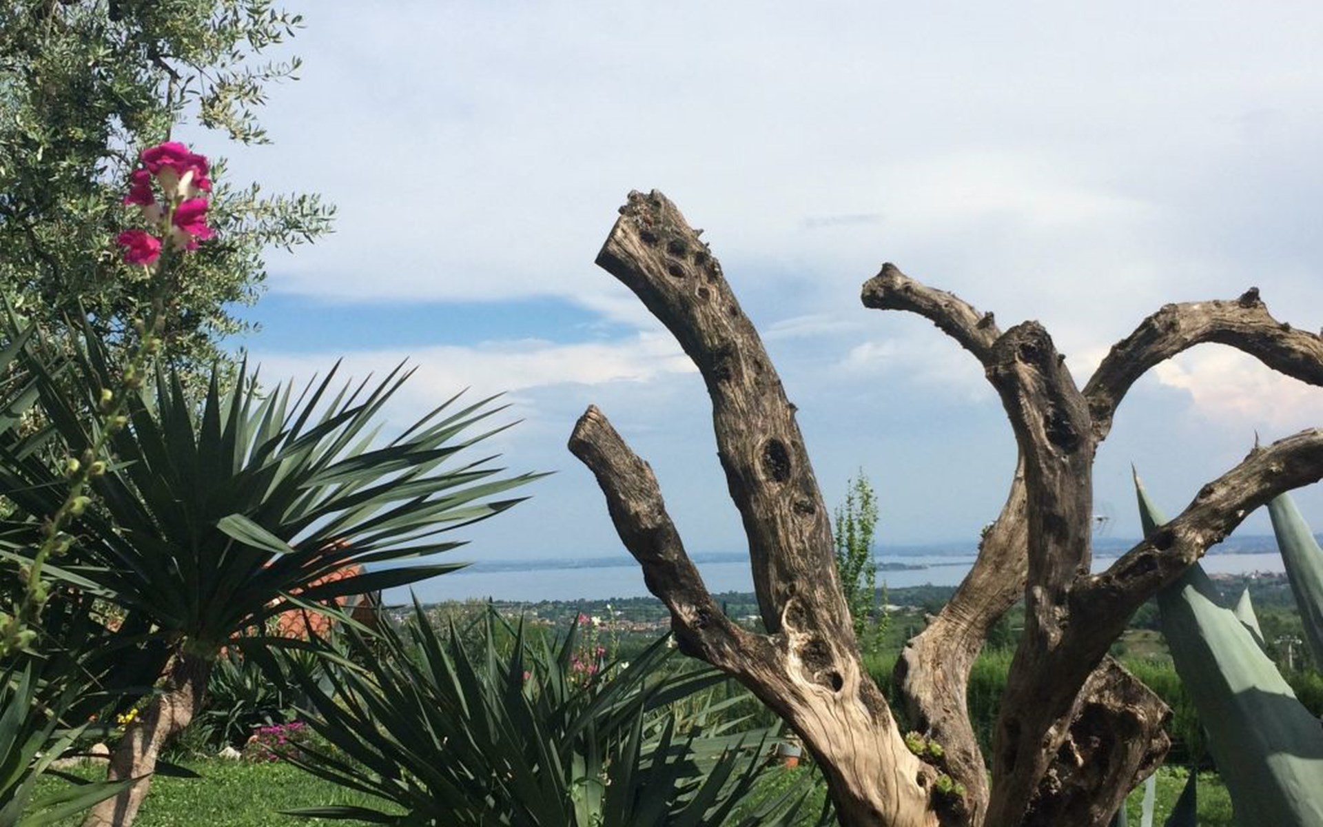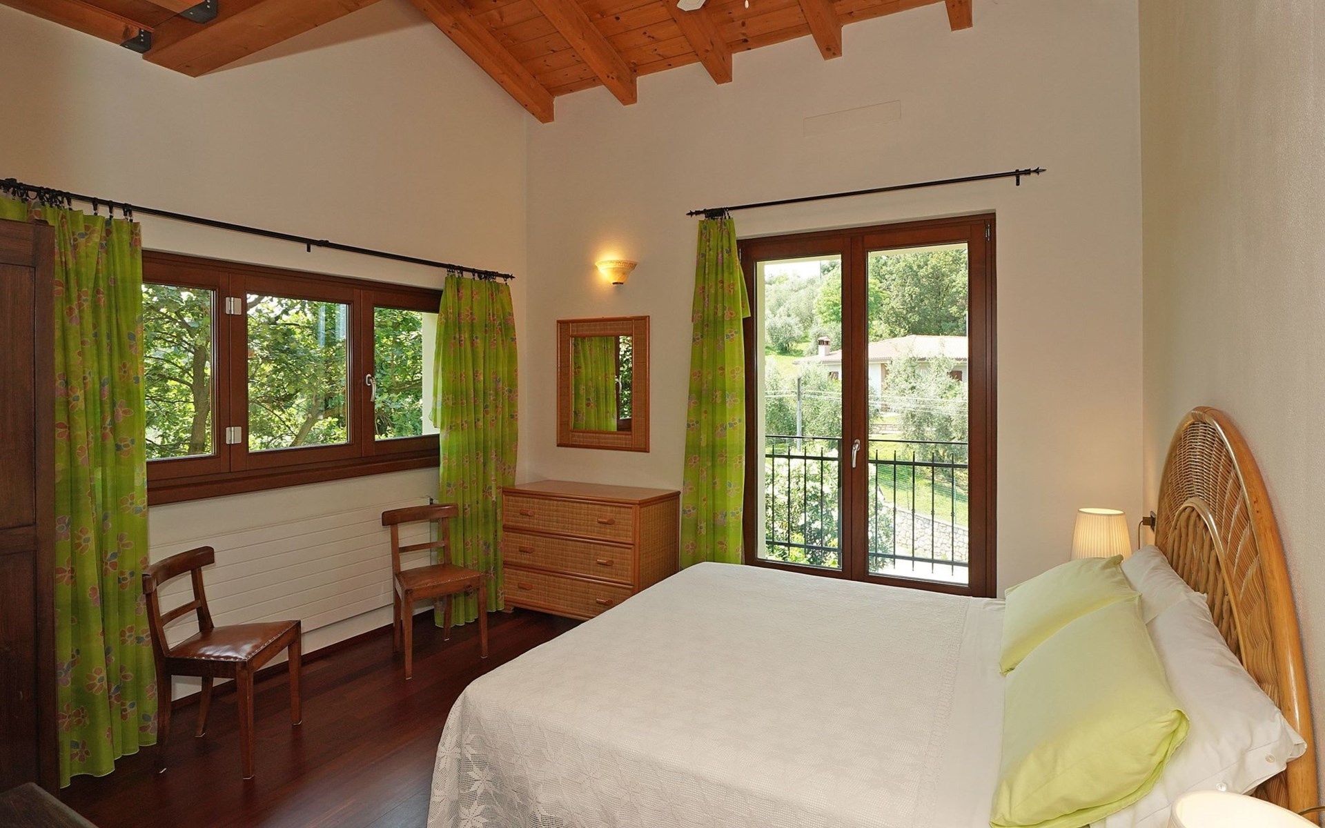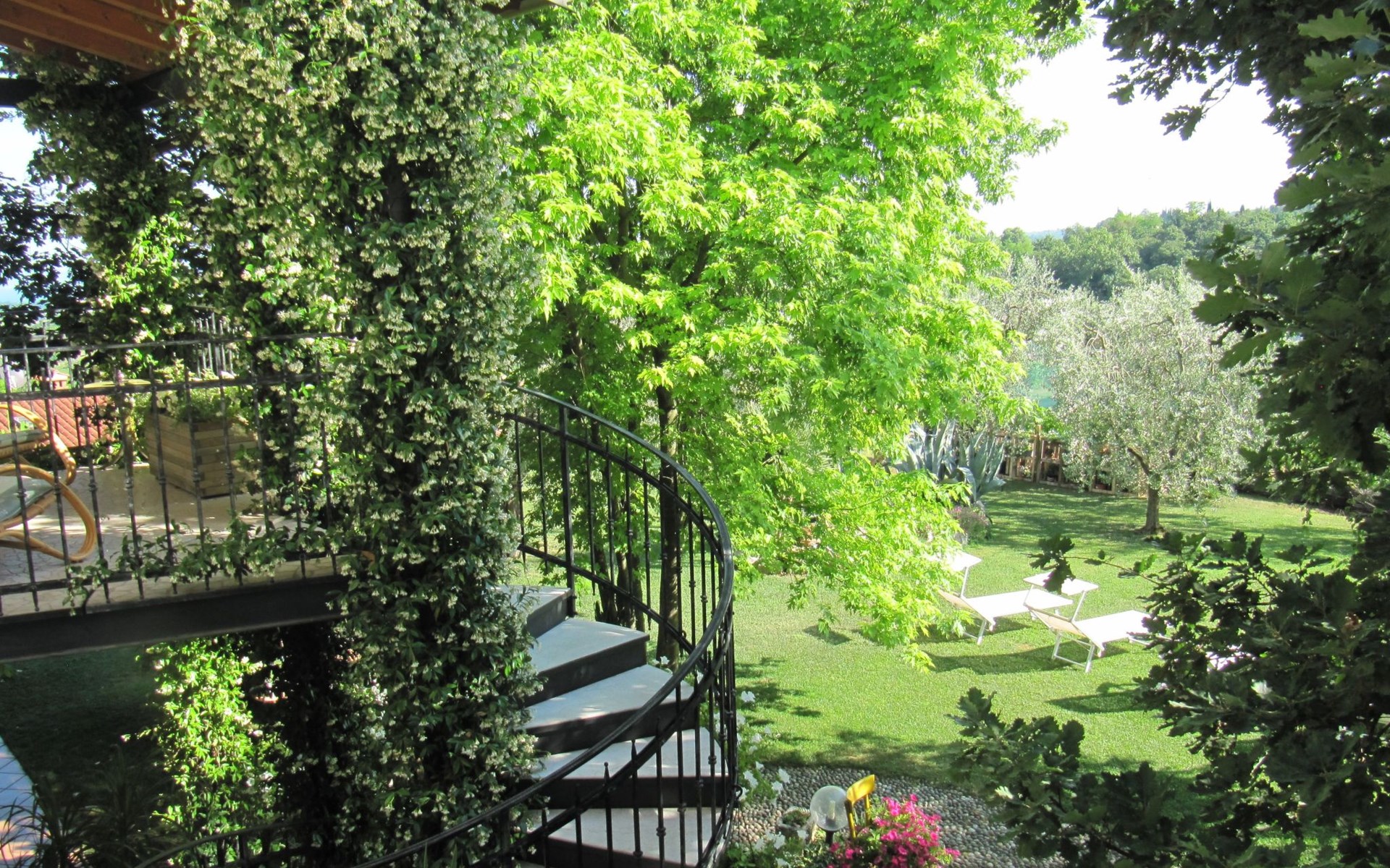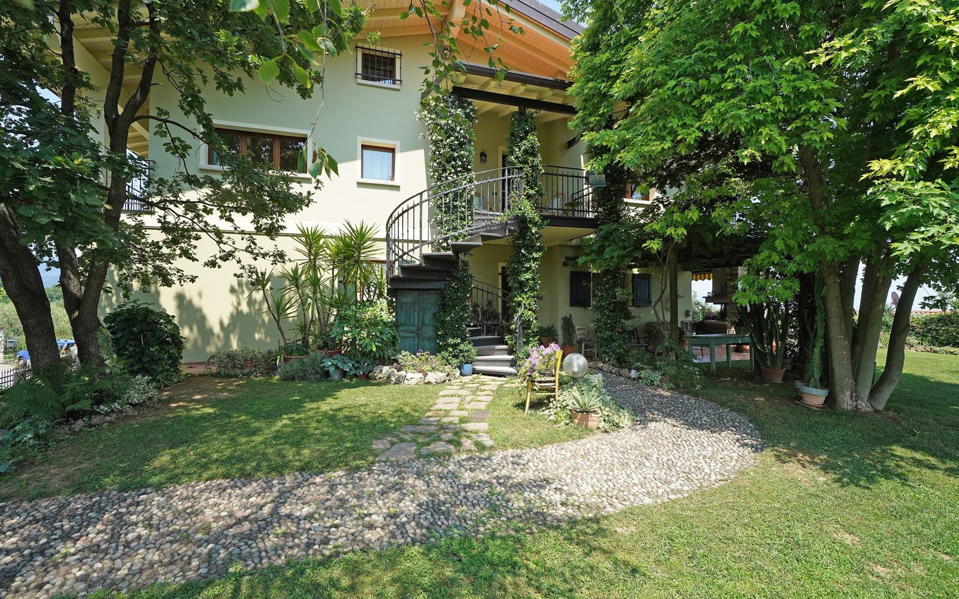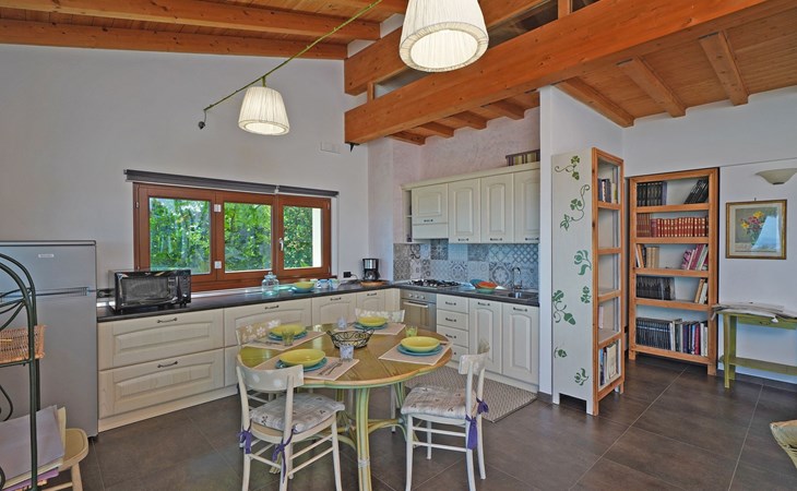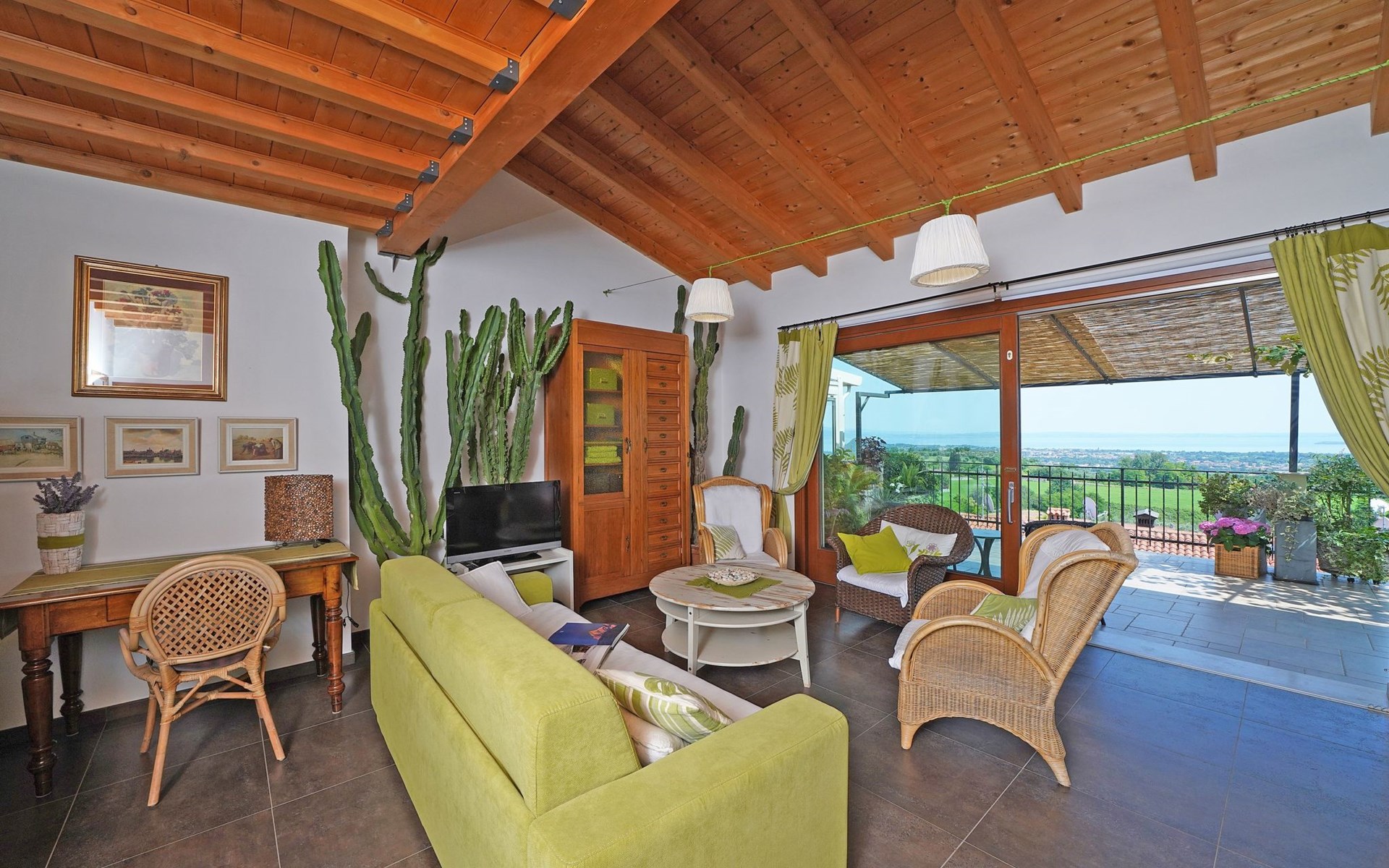 Die Wohnung "TERRAZZE SUL GARDA" ist fantastisch und einzigartig; sie befindet sich im ersten und letzten Stock eines zweistöckigen Hauses, ist durch einen separaten Eingang zu erreichen und ist von einem großen und gepflegten Garten umgeben. Die Wohnung ist dank der hohen Holzdecken und großen Fenster sehr hell. Sie ist ca. 100 qm groß und öffnet sich zu einer ca. 40 qm großen Terrasse, von der aus man einen der schönsten Ausblicke auf den Gardasee und die Valtenesi-Hügel genießen kann. Die Wohnung ist mit modernen Annehmlichkeiten wie Geschirrspüler, TV, Heizung, Internet usw. ausgestattet, aber mit antiken Möbeln eingerichtet. Sie besteht aus 2 Doppelschlafzimmern mit Parkettboden, von denen man Zugang zu einer weiteren Terrasse mit Blick auf die umliegenden Hügel hat; beide haben ein eigenes Bad mit Dusche und Bidet. Ein großes Wohnzimmer mit einer voll ausgestatteten Küchenzeile und einem Entspannungsbereich mit einem Doppelschlafsofa führt auf die über 40 qm große Terrasse, die für Mahlzeiten im Freien ausgestattet ist. Die Wohnung ist ideal für Familien mit 5/6 Personen oder für zwei Paare.