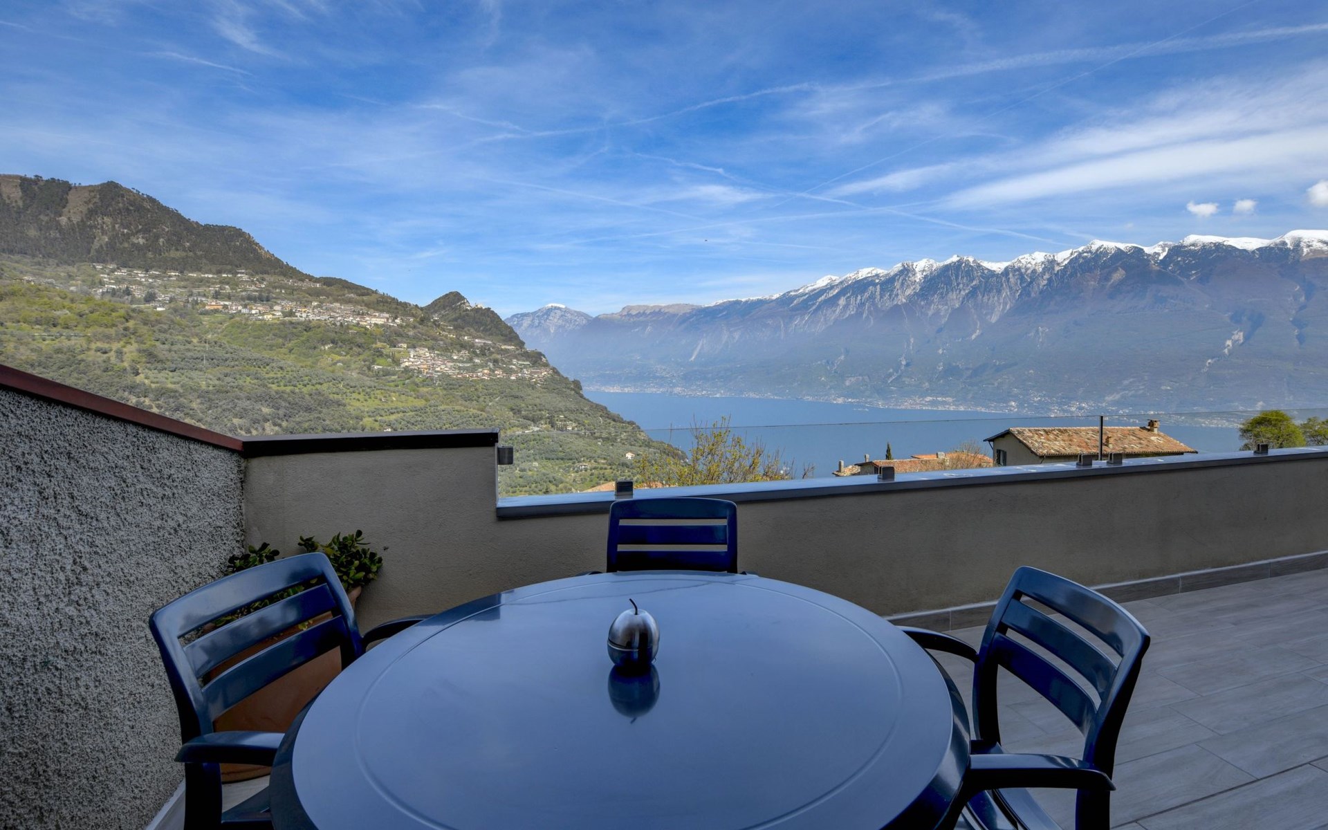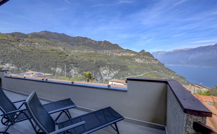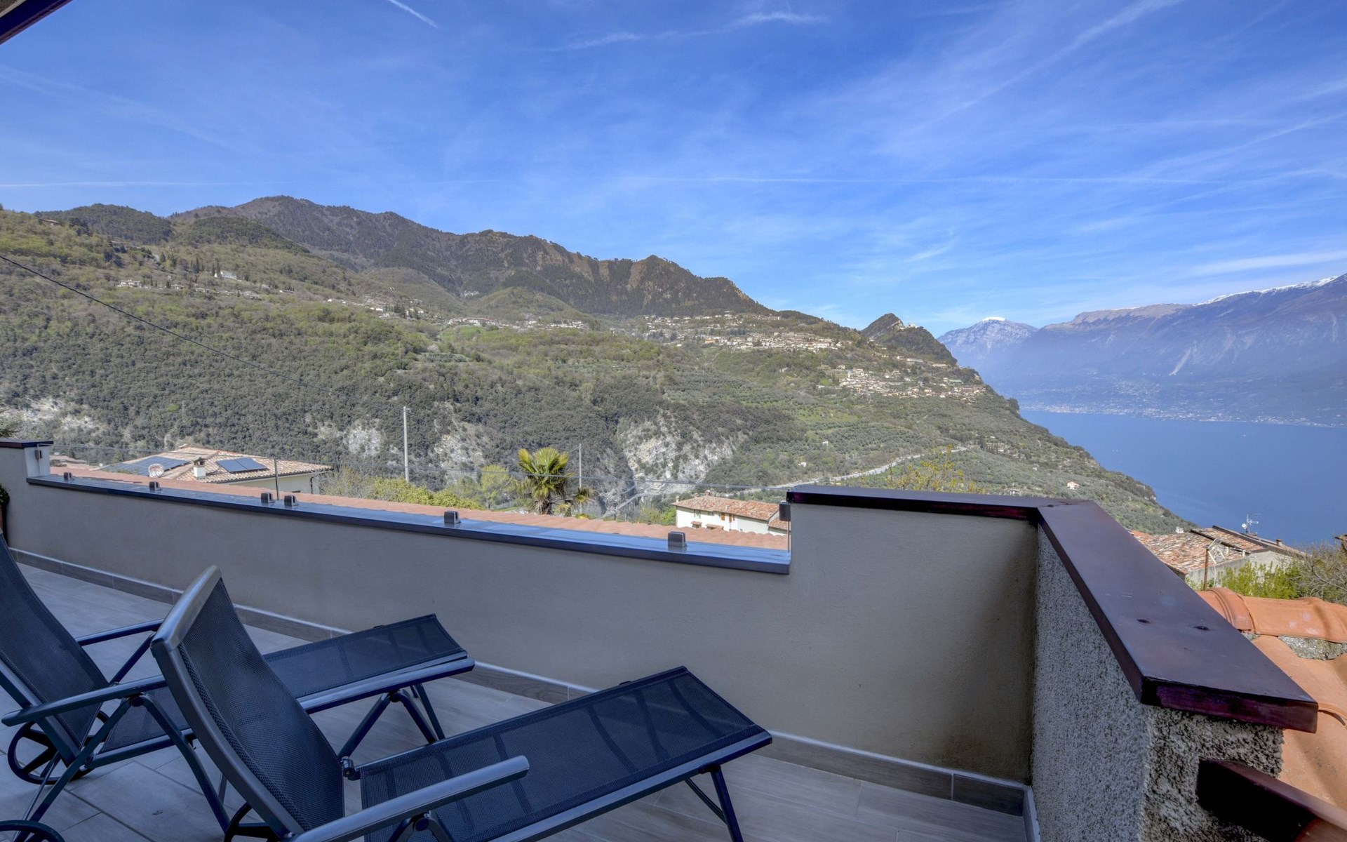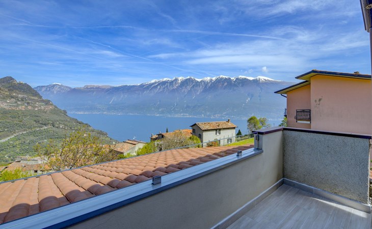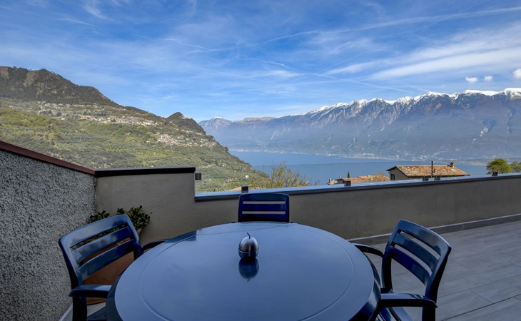 Von der Wohnküche aus gelangt man auf die große Terrasse, die mit Sonnenschirm, Stühlen und Tisch ausgestattet ist und von der aus man einen herrlichen Blick auf den Gardasee, das historische Zentrum des Ortes, das man in wenigen Minuten zu Fuß erreichen kann, und die Hochebene von Tignale genießen kann.
