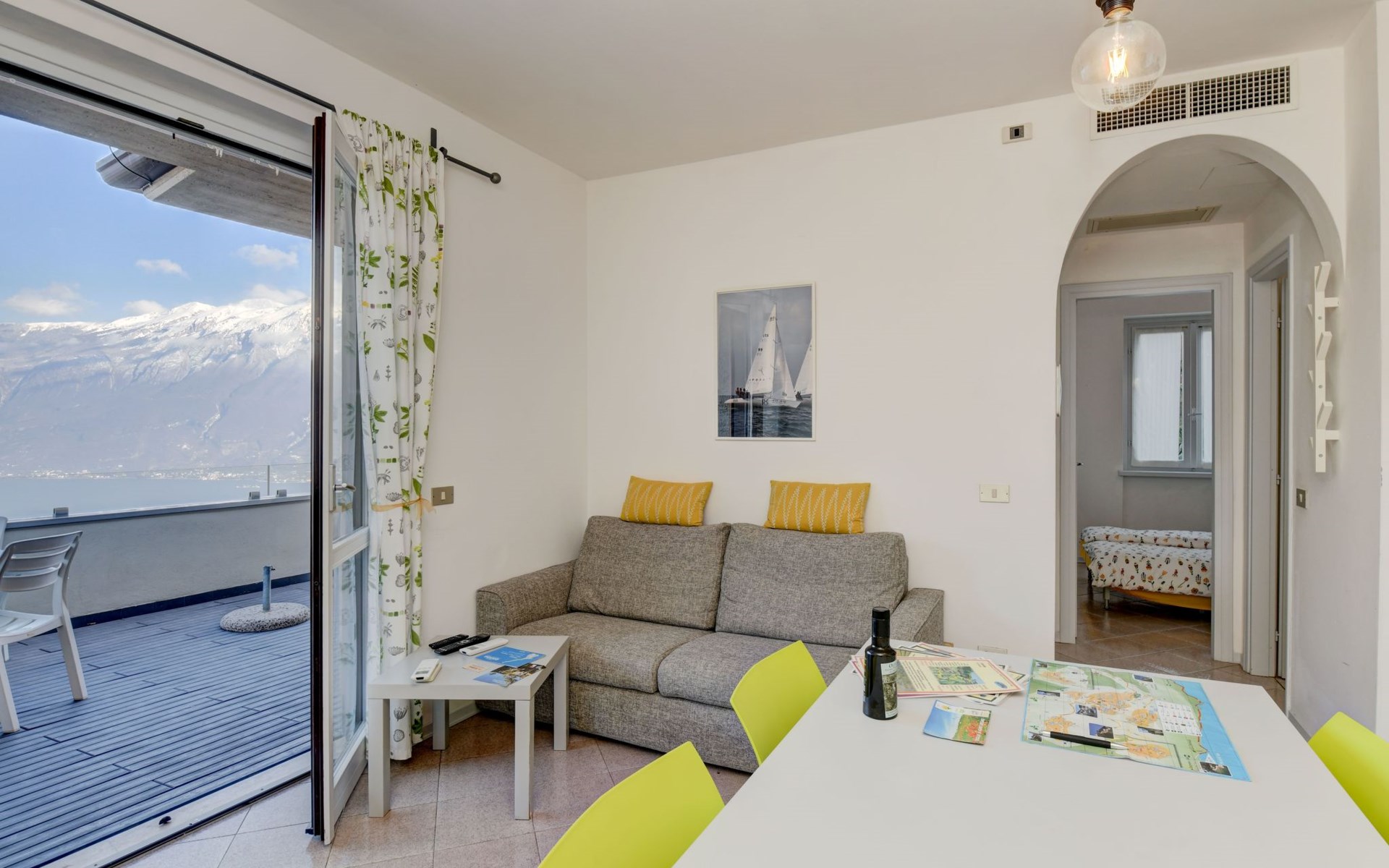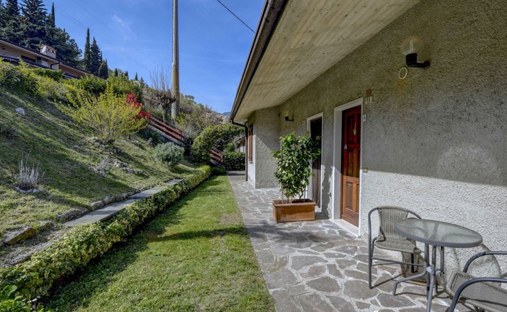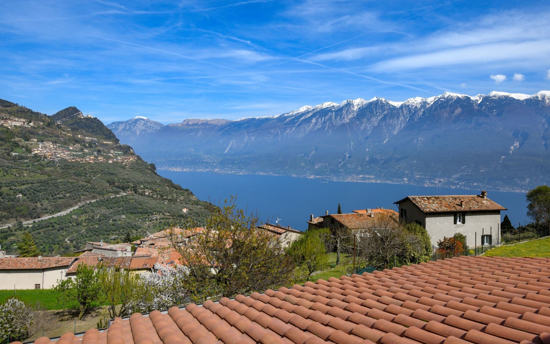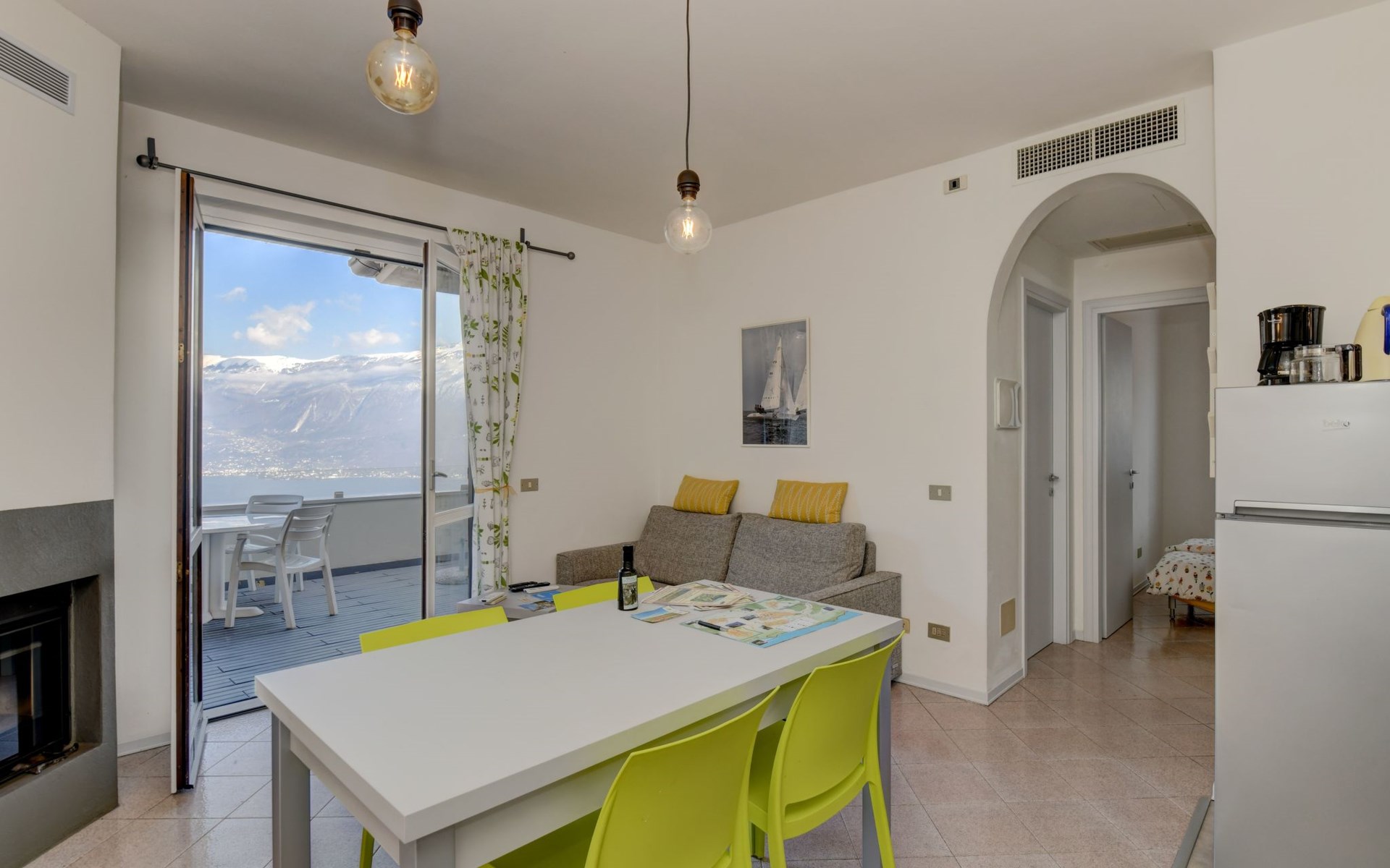 Von der Wohnküche aus gelangt man auf die große Terrasse, die mit Sonnenschirm, Stühlen und Tisch ausgestattet ist und von der aus man einen herrlichen Blick auf den Gardasee, das historische Zentrum des Ortes, das man in wenigen Minuten zu Fuß erreichen kann, und die Hochebene von Tignale genießen kann.