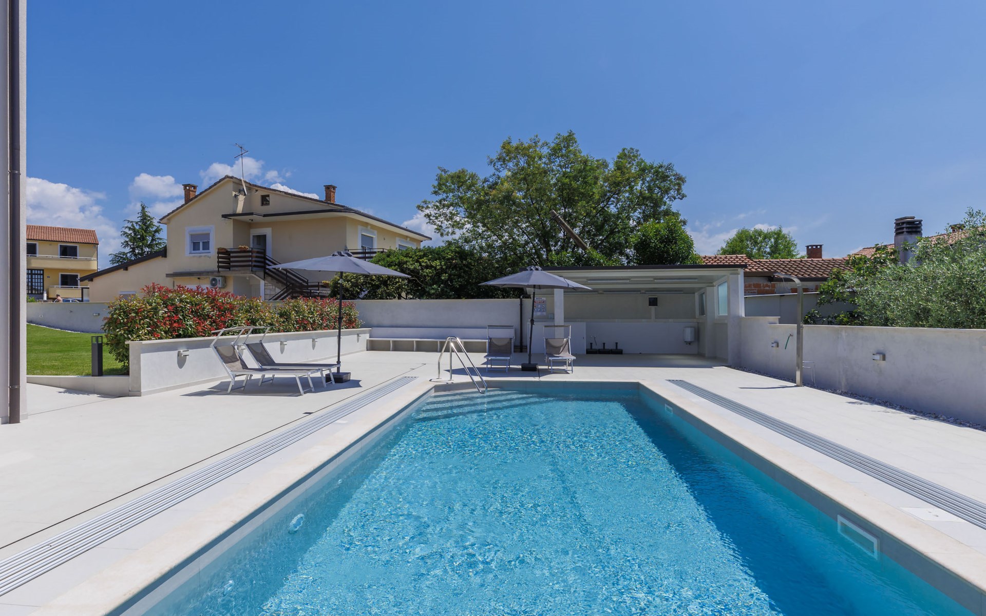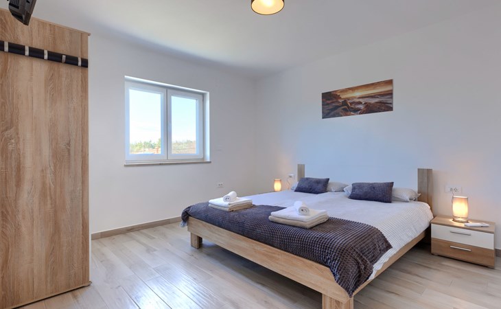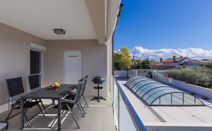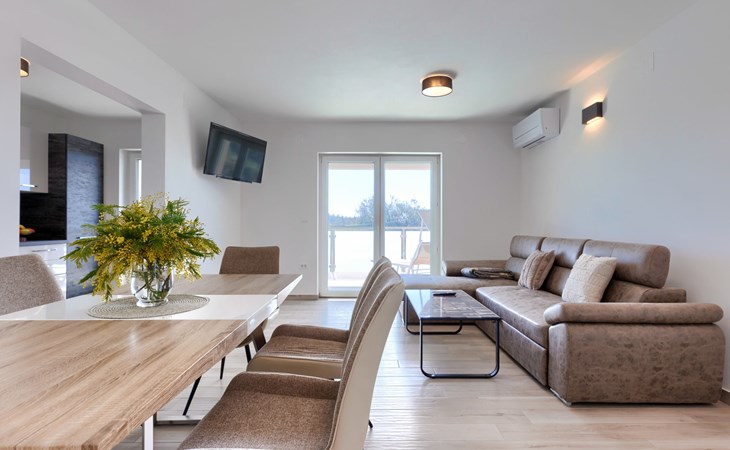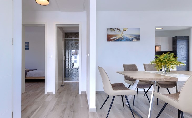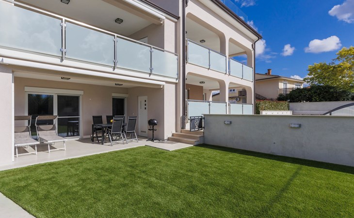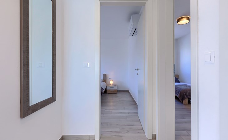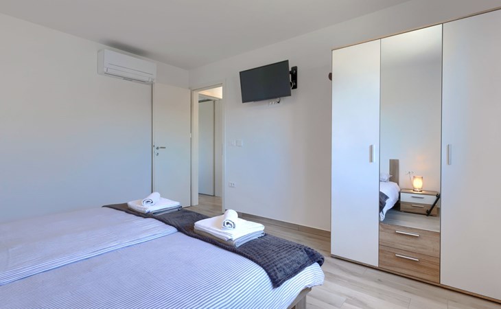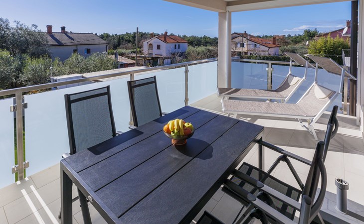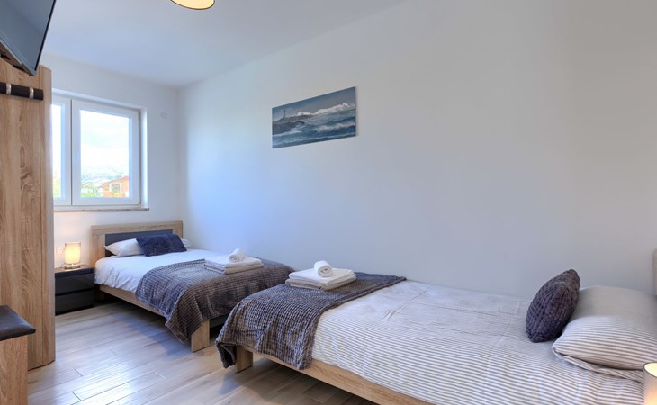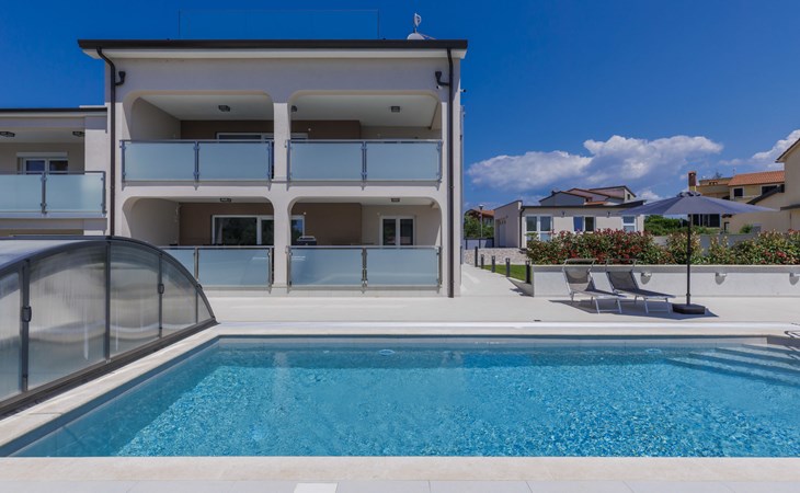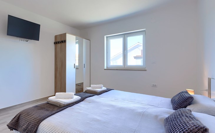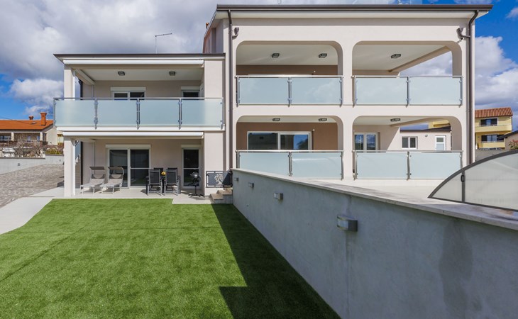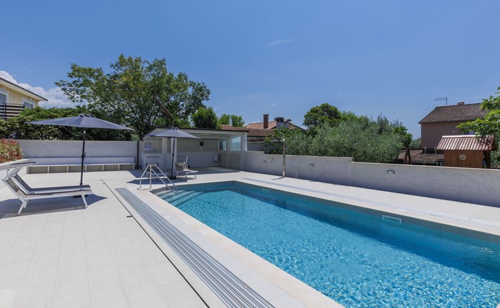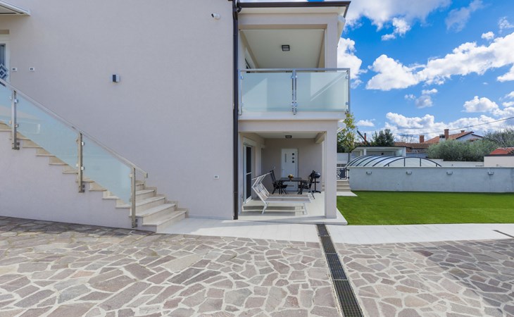 Murine 3 km von Umag: Mehrfamilienhaus "Villa Galici", Baujahr 2022. Im Weiler Galići, 1 km vom Zentrum von Murine, sonnige Lage, 2.5 km vom Meer, 2.5 km vom Strand. Zur Mitbenutzung: Grundstück 1'000 m2 mit Rasen, Schwimmbad eckig beheizt (10 x 5 m, 150 cm tief, saisonale Verfügbarkeit: 01.Jan. - 31.Dez.) mit Innentreppe und Rollladenabdeckung. Aussendusche. Im Hause: Internetzugang, Tischfussball. Parkplatz beim Haus auf dem Grundstück. Einkaufsgeschäft 1.5 km, Restaurant 800 m, Bushaltestelle 4.1 km, Kieselstrand 2.5 km, Felsstrand 2.5 km. Wanderwege ab Haus 100 m, Radweg 150 m. Der Besitzer akzeptiert keine Jugendgruppen.