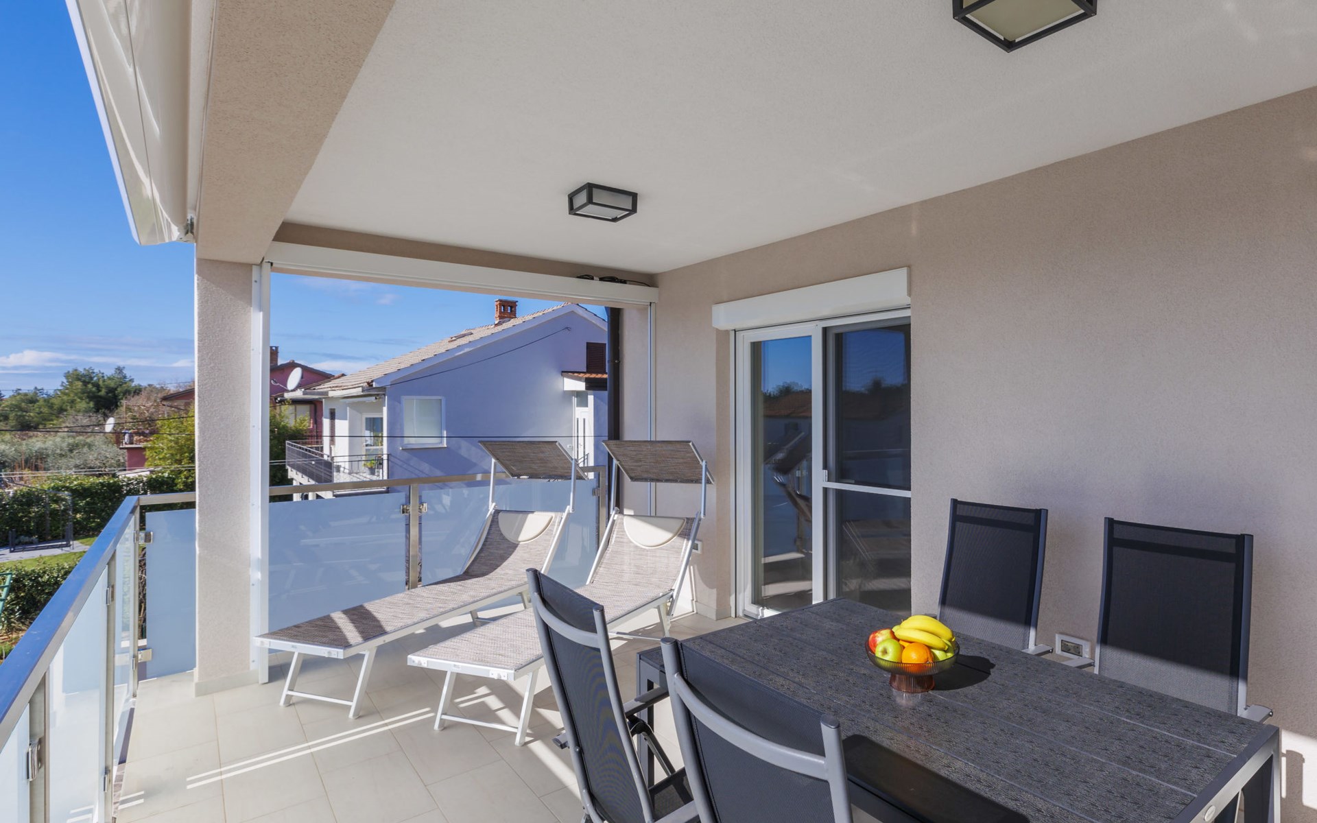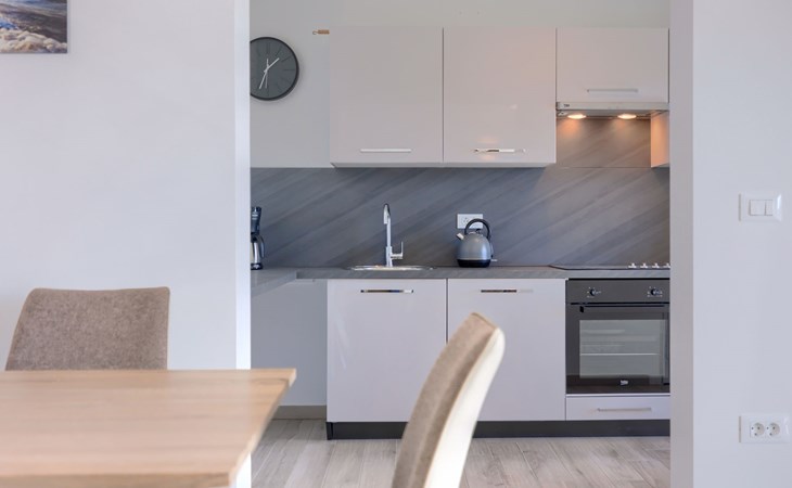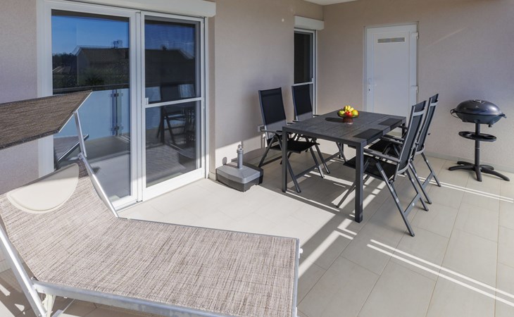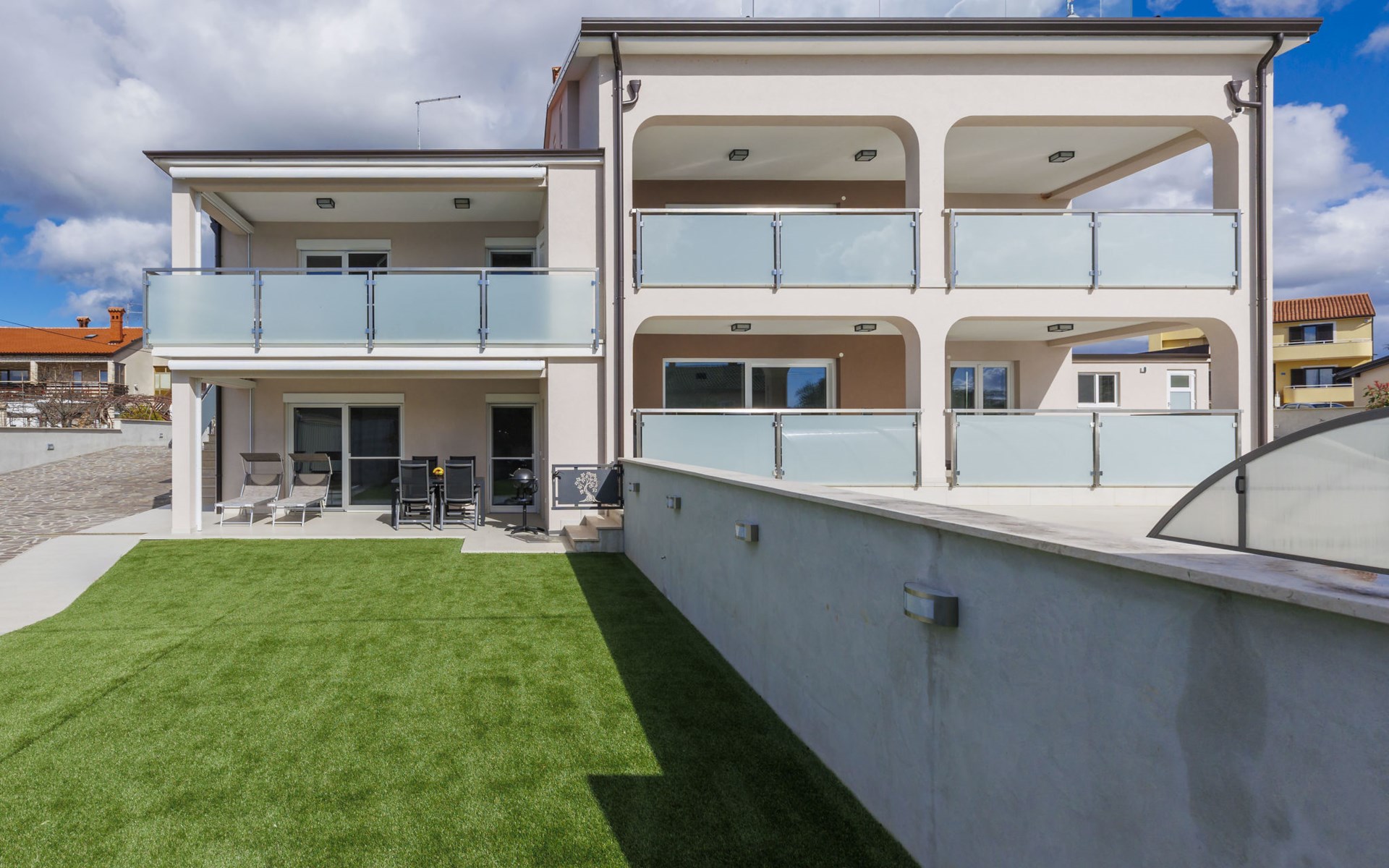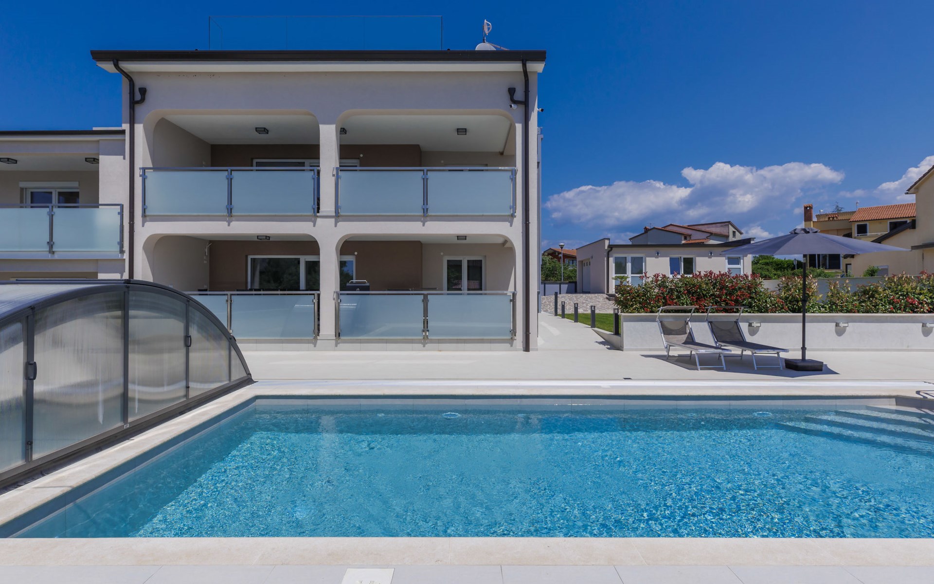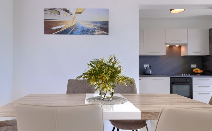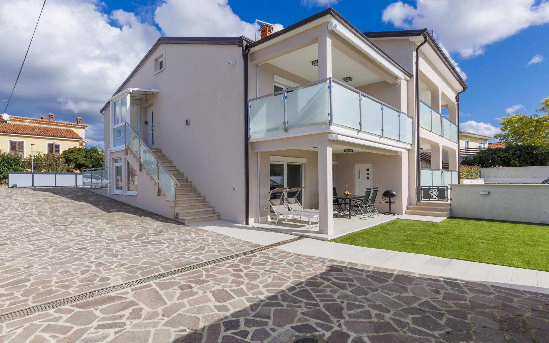 Murine 3 km von Umag: Mehrfamilienhaus "Villa Galici", Baujahr 2022. Im Weiler Galići, 1 km vom Zentrum von Murine, sonnige Lage, 2.5 km vom Meer, 2.5 km vom Strand. Zur Mitbenutzung: Grundstück 1'000 m2 mit Rasen, Schwimmbad eckig beheizt (10 x 5 m, 150 cm tief, saisonale Verfügbarkeit: 01.Jan. - 31.Dez.) mit Innentreppe und Rollladenabdeckung. Aussendusche. Im Hause: Internetzugang, Tischfussball. Parkplatz beim Haus auf dem Grundstück. Einkaufsgeschäft 1.5 km, Restaurant 800 m, Bushaltestelle 4.1 km, Kieselstrand 2.5 km, Felsstrand 2.5 km. Wanderwege ab Haus 100 m, Radweg 150 m. Der Besitzer akzeptiert keine Jugendgruppen.