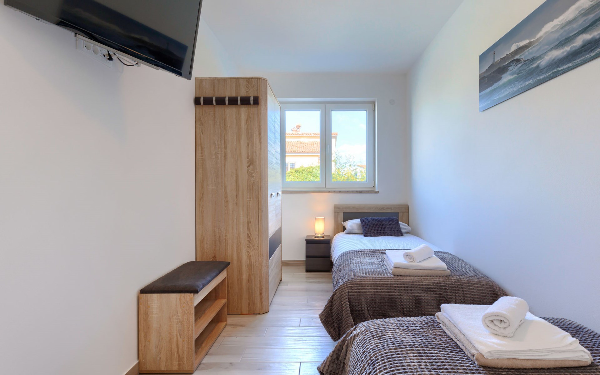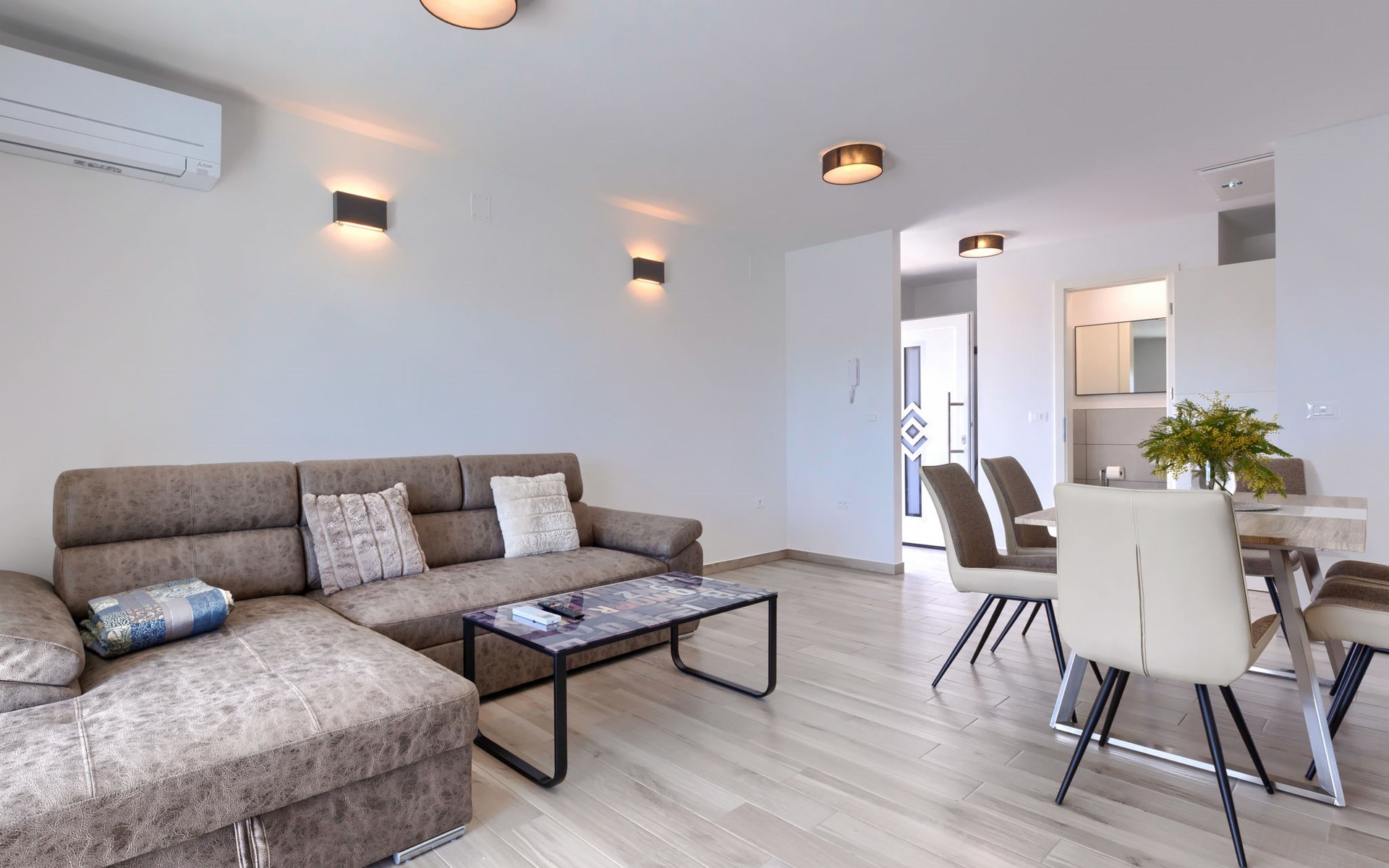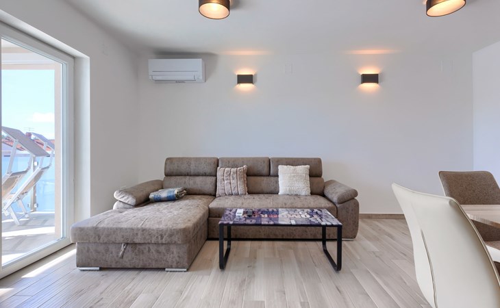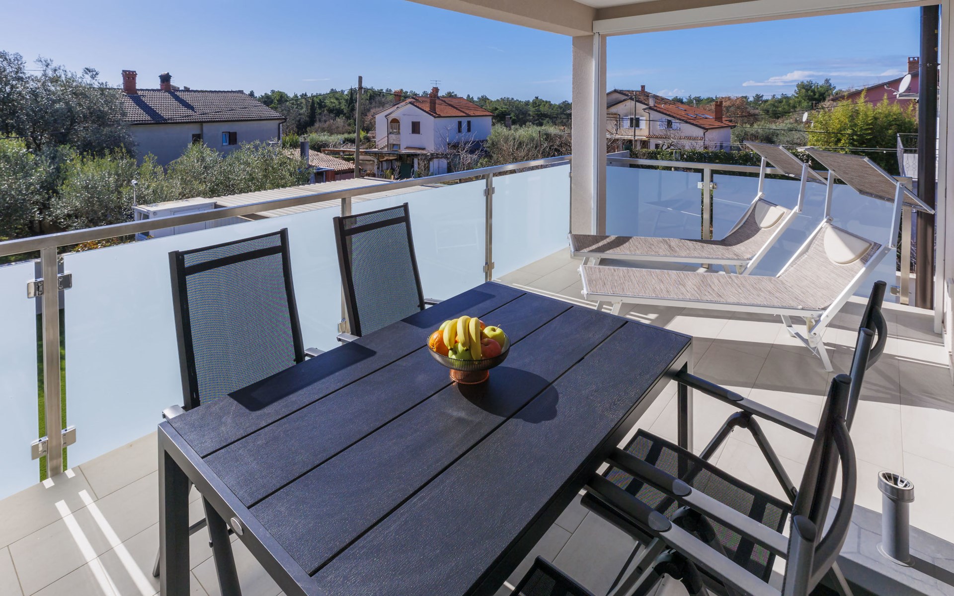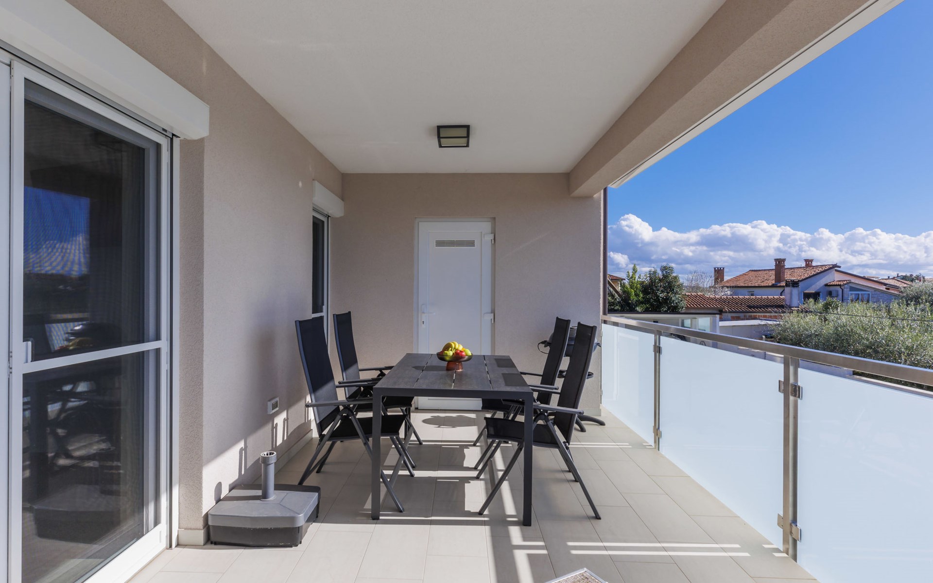 Murine 3 km von Umag: Mehrfamilienhaus "Villa Galici", Baujahr 2022. Im Weiler Galići, 1 km vom Zentrum von Murine, sonnige Lage, 2.5 km vom Meer, 2.5 km vom Strand. Zur Mitbenutzung: Grundstück 1'000 m2 mit Rasen, Schwimmbad eckig beheizt (10 x 5 m, 150 cm tief, saisonale Verfügbarkeit: 01.Jan. - 31.Dez.) mit Innentreppe und Rollladenabdeckung. Aussendusche. Im Hause: Internetzugang, Tischfussball. Parkplatz beim Haus auf dem Grundstück. Einkaufsgeschäft 1.5 km, Restaurant 800 m, Bushaltestelle 4.1 km, Kieselstrand 2.5 km, Felsstrand 2.5 km. Wanderwege ab Haus 100 m, Radweg 150 m. Der Besitzer akzeptiert keine Jugendgruppen.