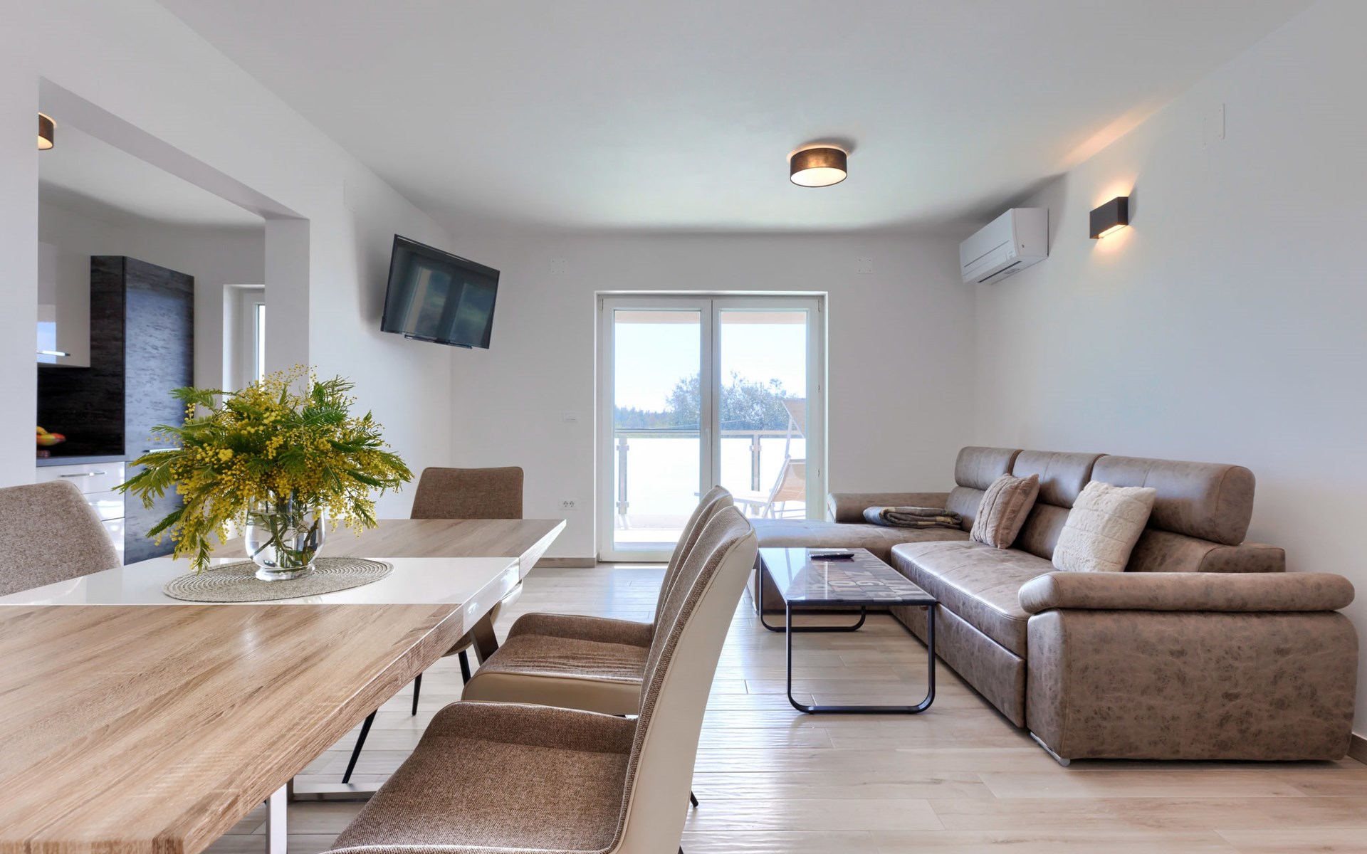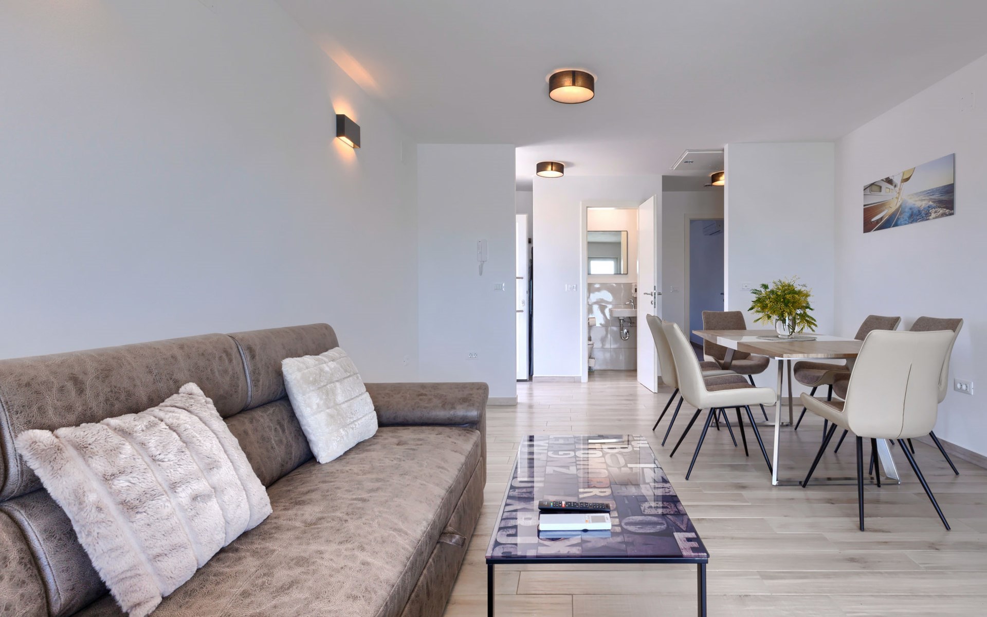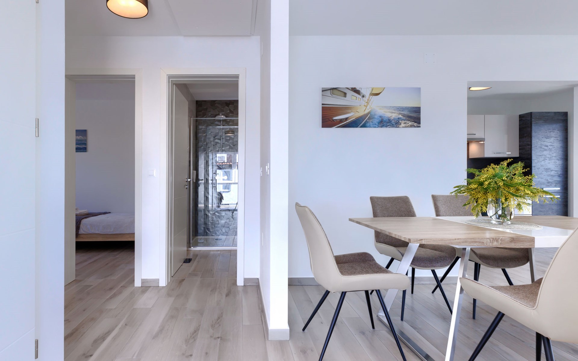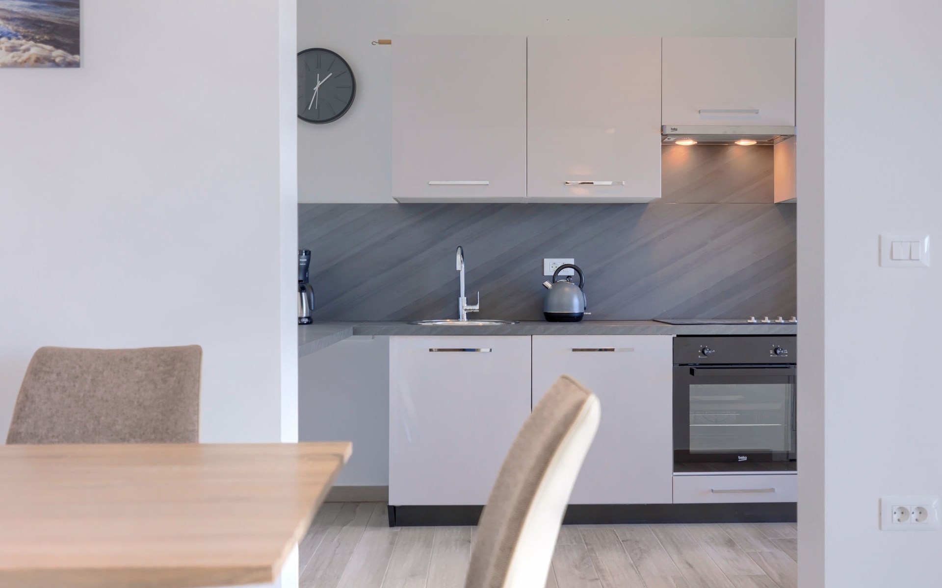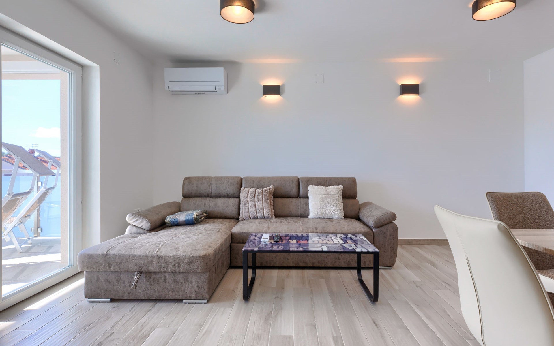 Murine 3 km von Umag: Mehrfamilienhaus "Villa Galici", Baujahr 2022. Im Weiler Galići, 1 km vom Zentrum von Murine, sonnige Lage, 2.5 km vom Meer, 2.5 km vom Strand. Zur Mitbenutzung: Grundstück 1'000 m2 mit Rasen, Schwimmbad eckig beheizt (10 x 5 m, 150 cm tief, saisonale Verfügbarkeit: 01.Jan. - 31.Dez.) mit Innentreppe und Rollladenabdeckung. Aussendusche. Im Hause: Internetzugang, Tischfussball. Parkplatz beim Haus auf dem Grundstück. Einkaufsgeschäft 1.5 km, Restaurant 800 m, Bushaltestelle 4.1 km, Kieselstrand 2.5 km, Felsstrand 2.5 km. Wanderwege ab Haus 100 m, Radweg 150 m. Der Besitzer akzeptiert keine Jugendgruppen.