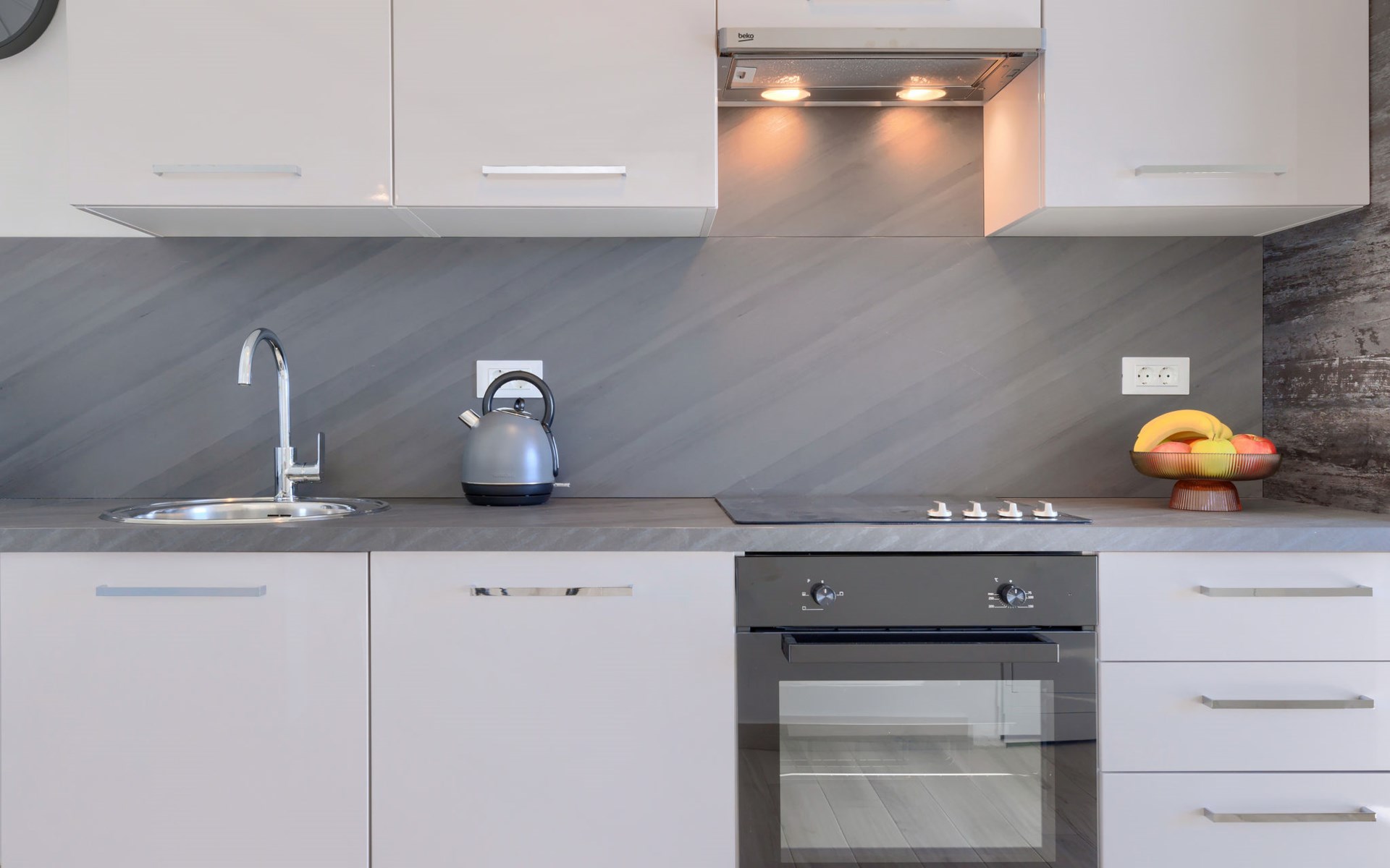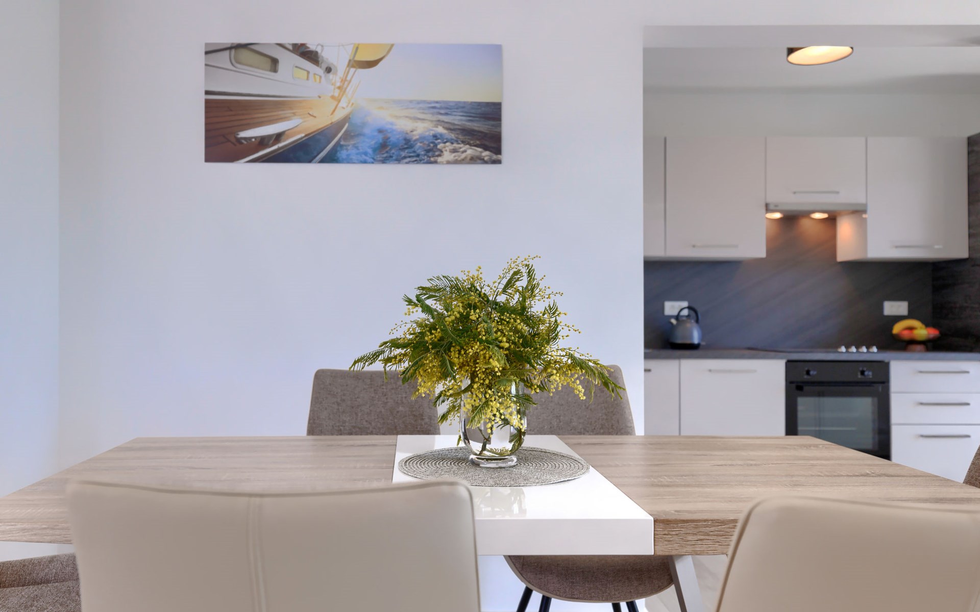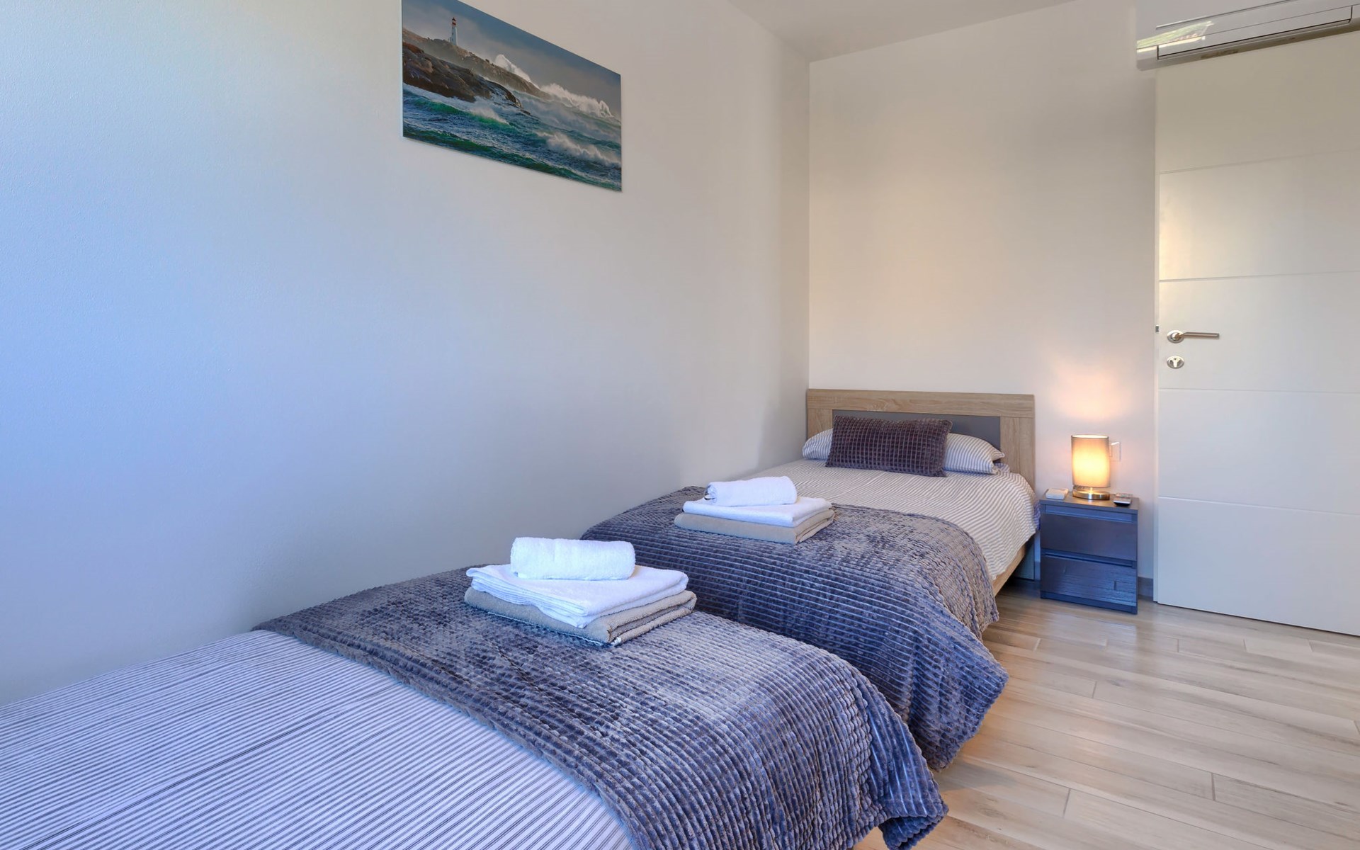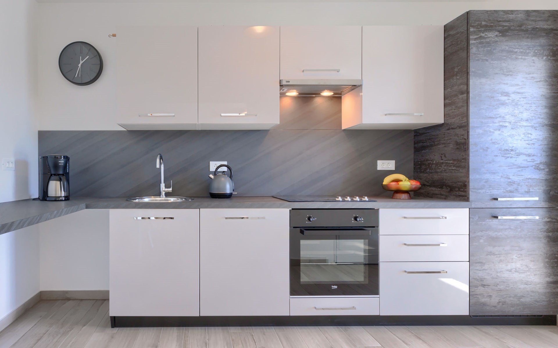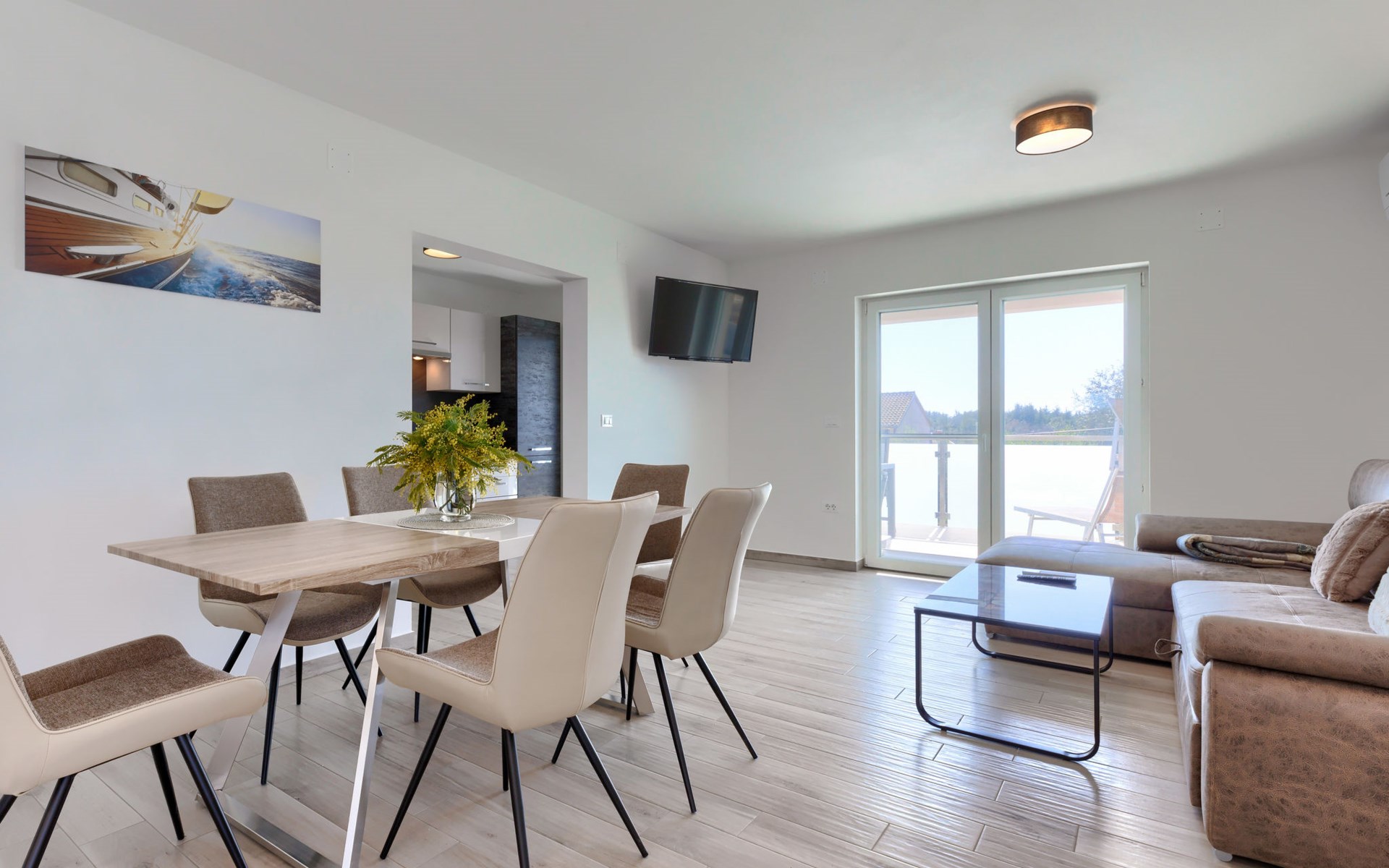 Murine 3 km von Umag: Mehrfamilienhaus "Villa Galici", Baujahr 2022. Im Weiler Galići, 1 km vom Zentrum von Murine, sonnige Lage, 2.5 km vom Meer, 2.5 km vom Strand. Zur Mitbenutzung: Grundstück 1'000 m2 mit Rasen, Schwimmbad eckig beheizt (10 x 5 m, 150 cm tief, saisonale Verfügbarkeit: 01.Jan. - 31.Dez.) mit Innentreppe und Rollladenabdeckung. Aussendusche. Im Hause: Internetzugang, Tischfussball. Parkplatz beim Haus auf dem Grundstück. Einkaufsgeschäft 1.5 km, Restaurant 800 m, Bushaltestelle 4.1 km, Kieselstrand 2.5 km, Felsstrand 2.5 km. Wanderwege ab Haus 100 m, Radweg 150 m. Der Besitzer akzeptiert keine Jugendgruppen.