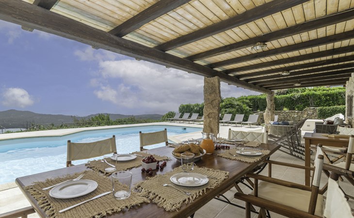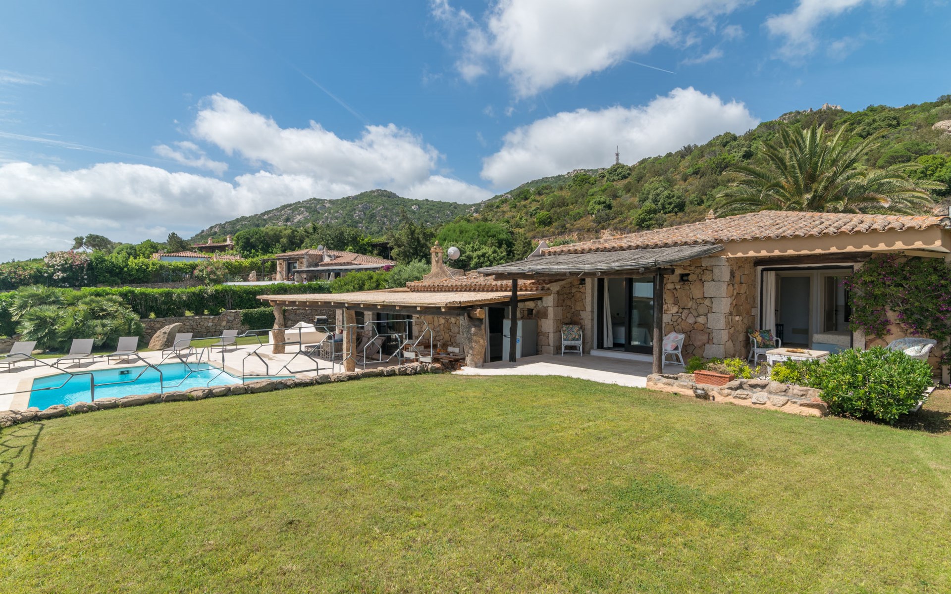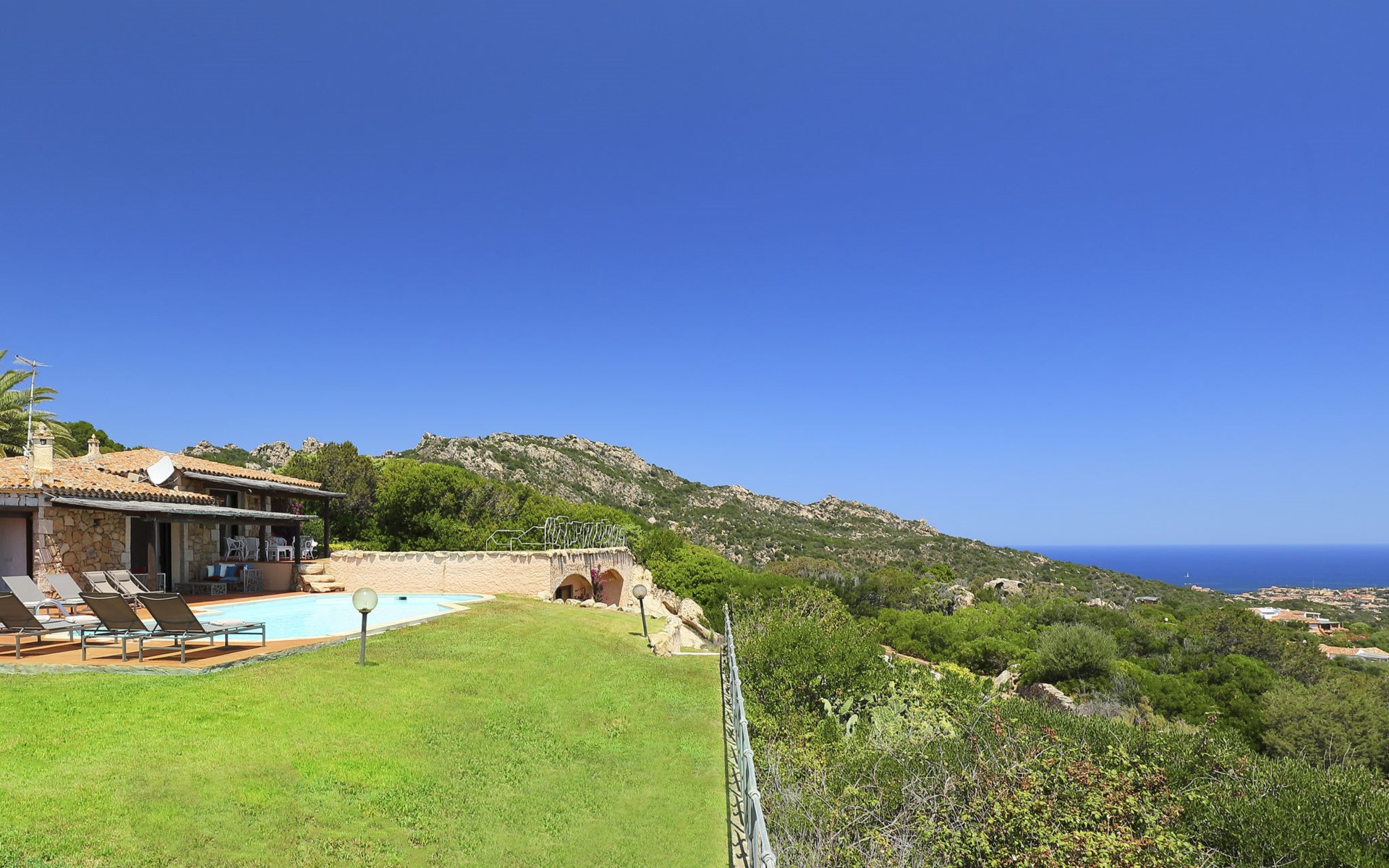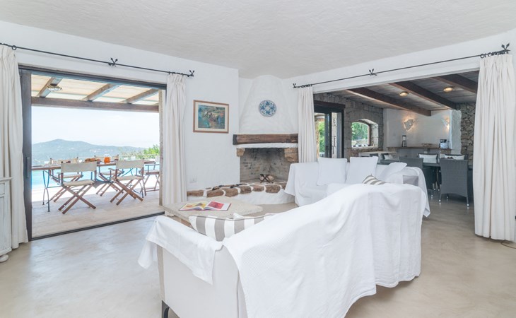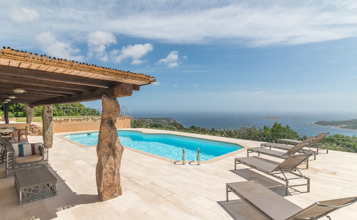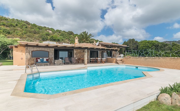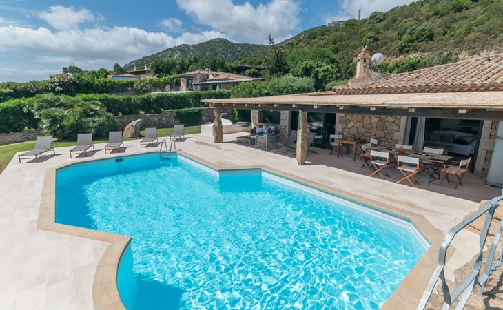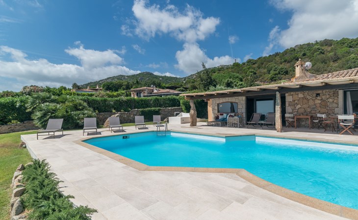 Pantogia: Luxuriöse Villa "Paradiso", auf 2 Stockwerken. 2 km vom Zentrum von Porto Cervo, ruhige, sonnige, erhöhte Lage am Hang, im Villenviertel, 2 km vom Meer. Zur Alleinbenutzung: Grundstück 2'000 m2, Garten 1'500 m2, Schwimmbad (9 x 13 m, 160 - 180 cm tief, saisonale Verfügbarkeit: 07.Mai. - 30.Sep.). Aussendusche, Sitzplatz (15 m2), Gartenmöbel, Grill. Zufahrt bis zum Haus. Parkplatz auf dem Grundstück, öffentliche Parkplätze auf der Strasse. Supermarkt 2 km, Restaurant 1 km, Bar 1 km, Bushaltestelle 1.5 km, Sandstrand 2 km. Sporthafen 3 km. Nahe gelegene Sehenswürdigkeiten: Olbia 30 km, Golfo Aranci 30 km, Palau 30 km, S Teresa di Gallura 50 km. Bitte beachten: Fahrzeug empfohlen.