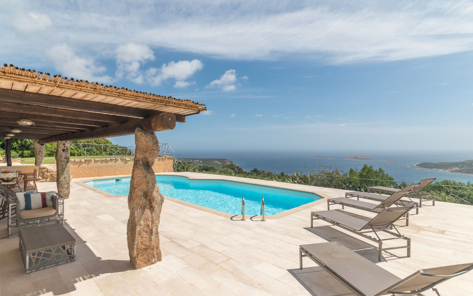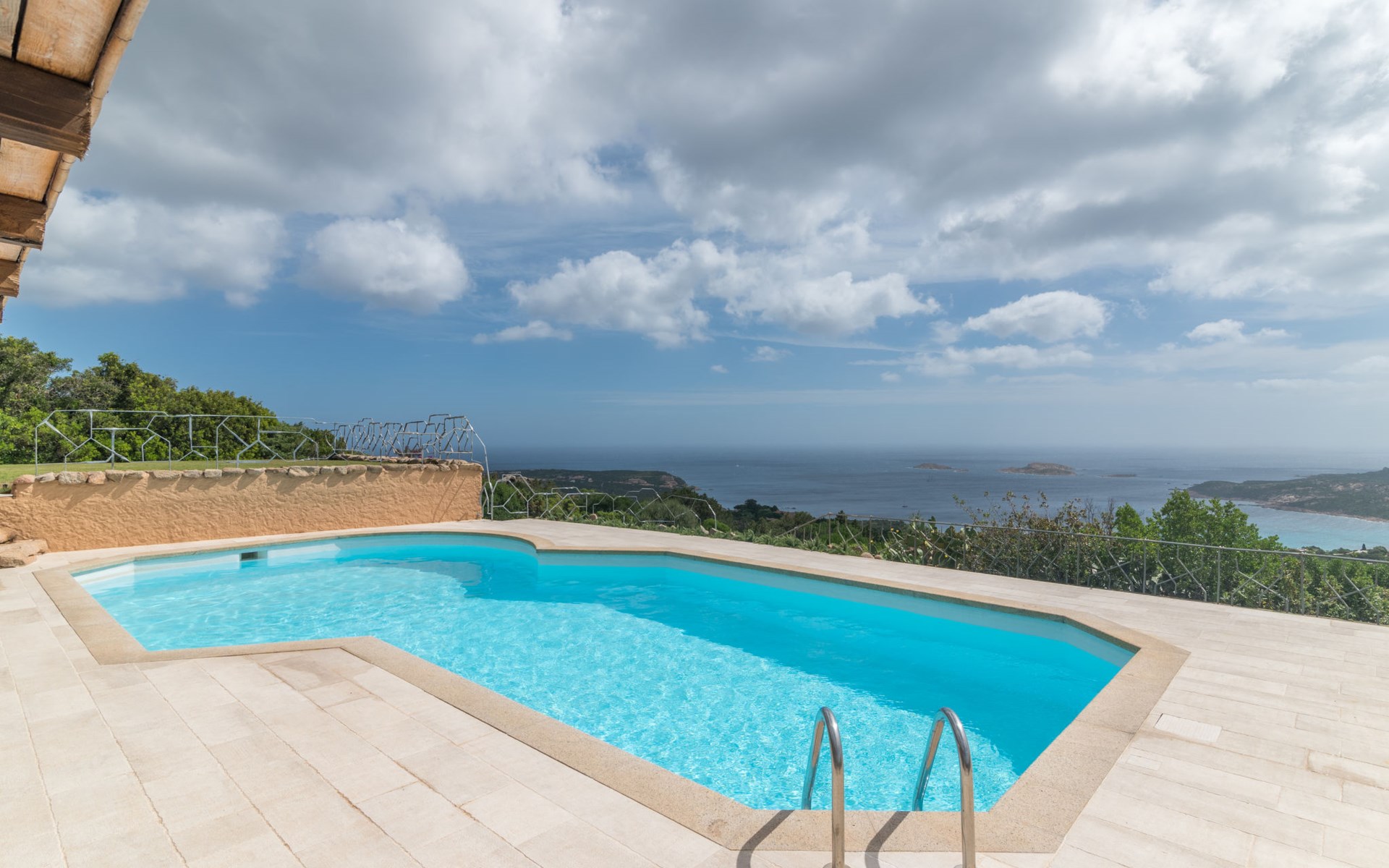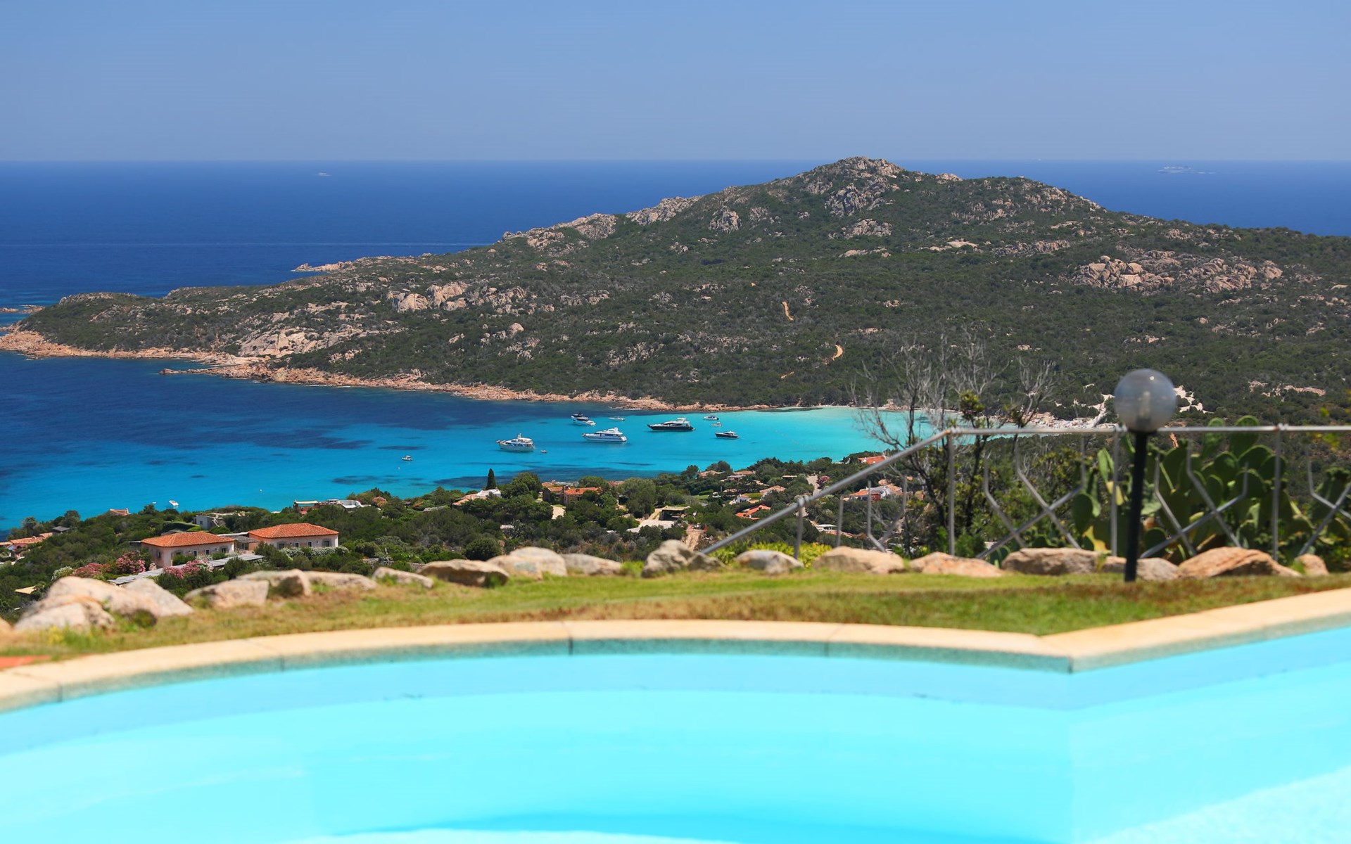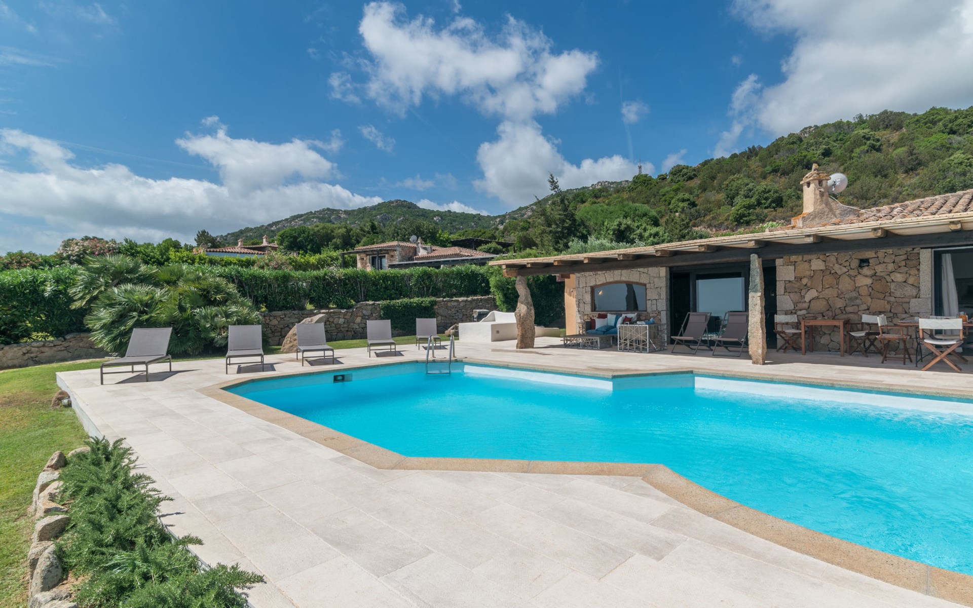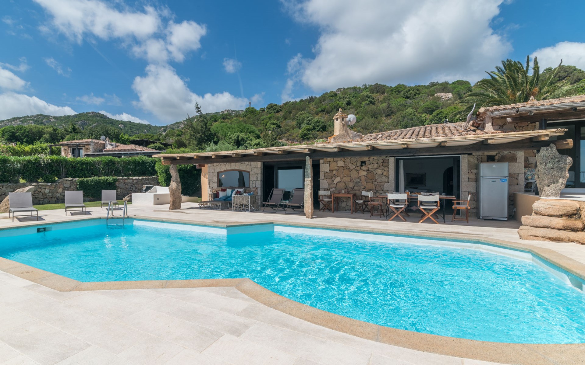 Pantogia: Luxuriöse Villa "Paradiso", auf 2 Stockwerken. 2 km vom Zentrum von Porto Cervo, ruhige, sonnige, erhöhte Lage am Hang, im Villenviertel, 2 km vom Meer. Zur Alleinbenutzung: Grundstück 2'000 m2, Garten 1'500 m2, Schwimmbad (9 x 13 m, 160 - 180 cm tief, saisonale Verfügbarkeit: 07.Mai. - 30.Sep.). Aussendusche, Sitzplatz (15 m2), Gartenmöbel, Grill. Zufahrt bis zum Haus. Parkplatz auf dem Grundstück, öffentliche Parkplätze auf der Strasse. Supermarkt 2 km, Restaurant 1 km, Bar 1 km, Bushaltestelle 1.5 km, Sandstrand 2 km. Sporthafen 3 km. Nahe gelegene Sehenswürdigkeiten: Olbia 30 km, Golfo Aranci 30 km, Palau 30 km, S Teresa di Gallura 50 km. Bitte beachten: Fahrzeug empfohlen.