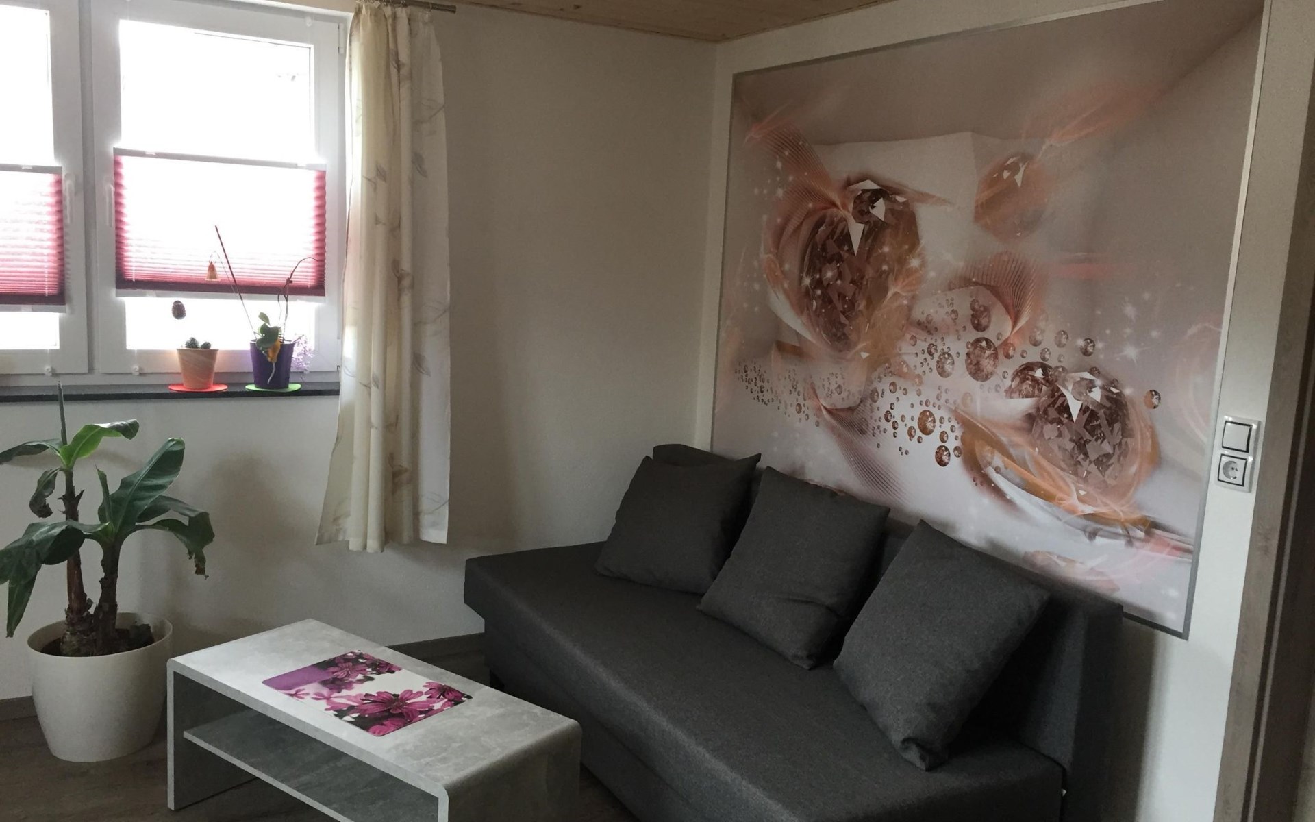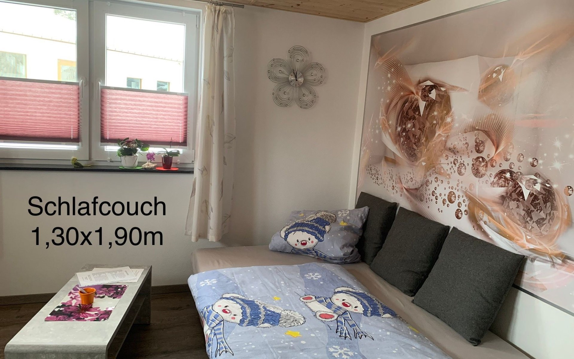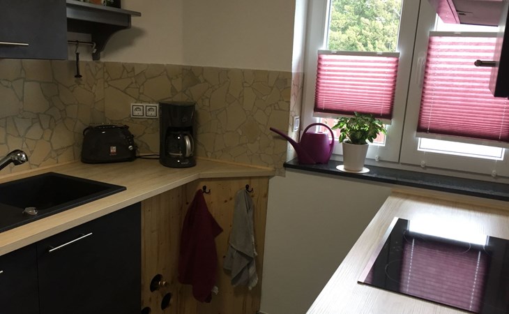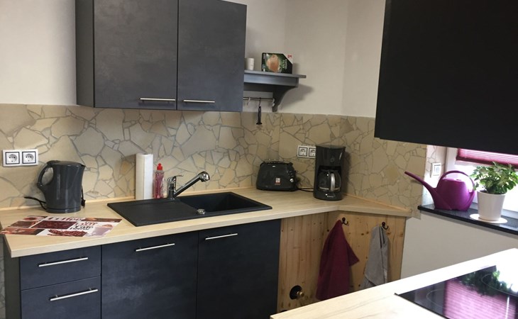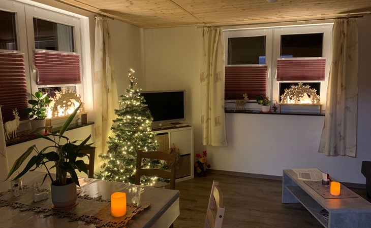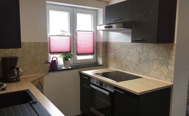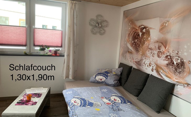 Die Ferienwohnung ist ebenerdig, nur 2 Stufen vor der Haustür sind zu bewältigen. Danach gelangt man in einen gemeinsam (von Vermieter und Mieter) genutzten Vorraum, bevor man die Ferienwohnung mit separatem abschließbaren Eingang betritt. So hat man im Erdgeschoss die Wohnung nur für sich. Wir als Vermieter wohnen in der oberen Etage. Manchmal kann es passieren, dass ihr von unserer Katze oder unserem kleinen Hund begrüßt werdet.Ihr findet in unserer Ferienwohnung eine Küche, ein Wohnzimmer mit Esstisch, ein Schlafzimmer und ein Badezimmer mit Badewanne. Im Schlafzimmer ist außerdem genug Platz für ein mitgebrachtes Babyreisebett.Fenster und Türen sollten beim Verlassen der Wohnung bitte immer geschlossen sein.Ein großes Doppelbett im Schlafzimmer für 2 Erwachsene und eine Schlafcouch im Wohnzimmer, diese hat eine Liegefläche von Bettmaß (Breite): 130 cm Bettmaß (Länge): 191 cm.Für 2 Erwachsene Personen eventuell zu eng aber für 2 Kinder ideal oder eine erwachsene Person. Ein Hochstuhl und Sitzaufsatz (Kleinkind) für das WC vorhanden.