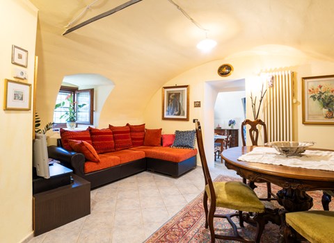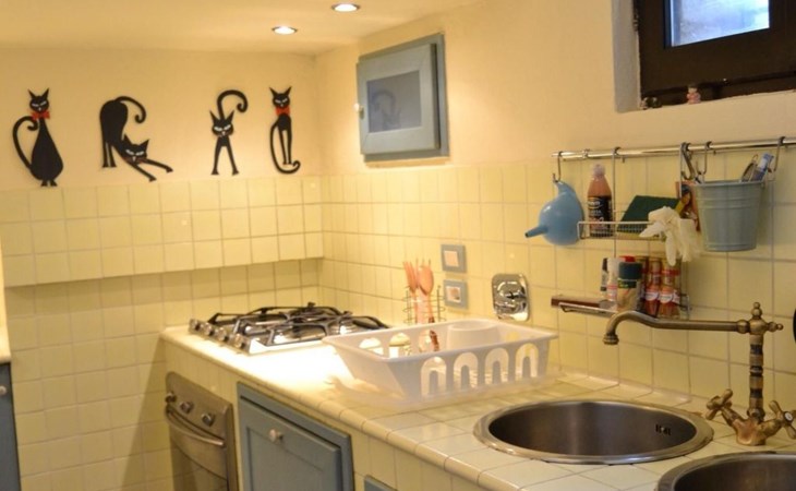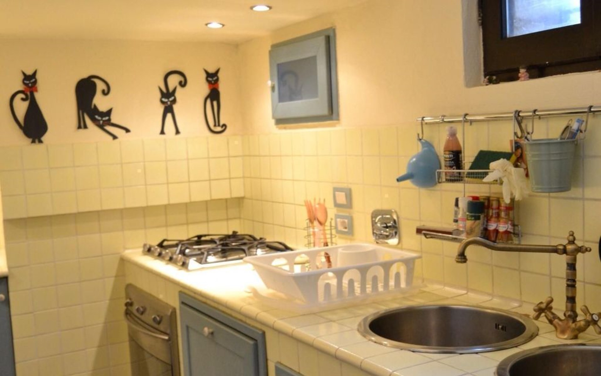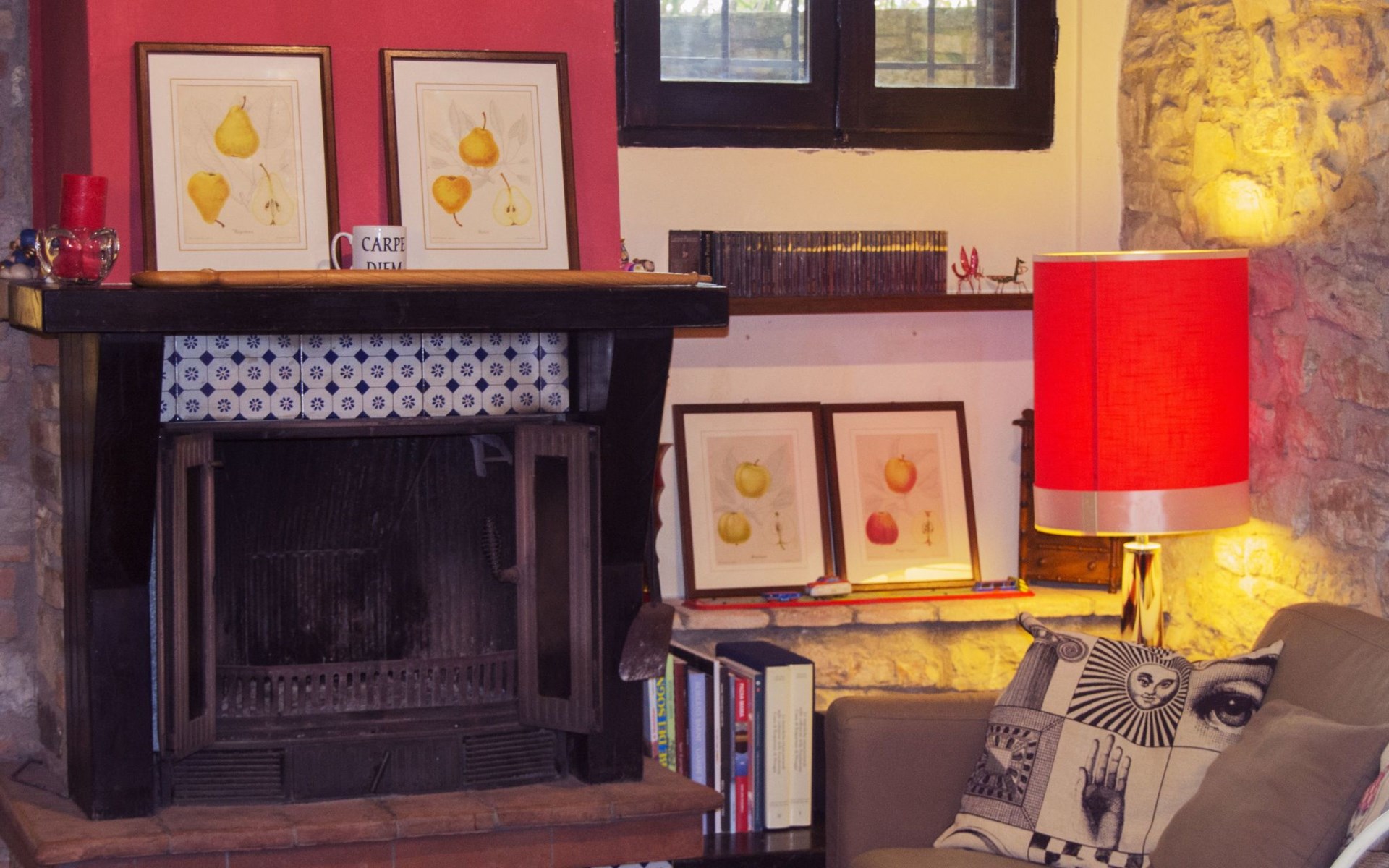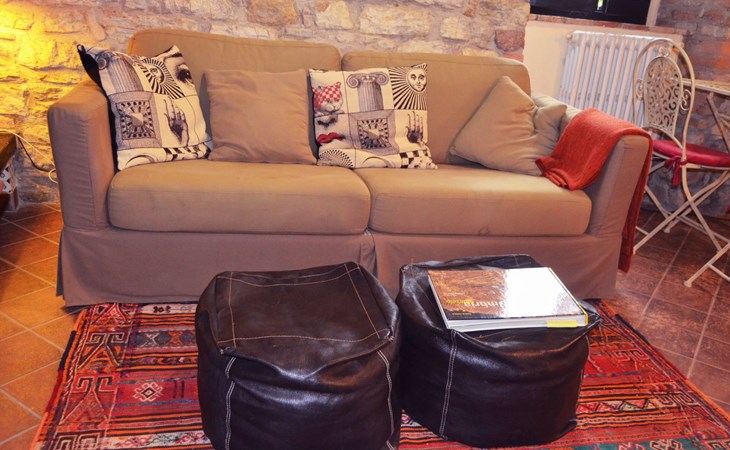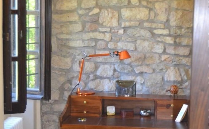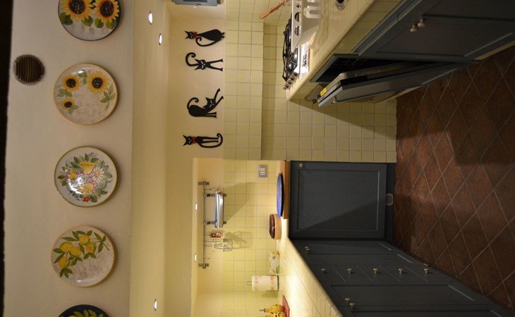 Die Wohnfläche erstreckt sich über zwei Ebenen. Im Erdgeschoss (ca. 40 m²) befinden sich eine Küche und ein Wohnzimmer mit einem Kamin, einer Schlafcouch für zwei Personen, einem Esstisch und einem Fernseher. Die Küche ist mit Backofen, Gasherd, Wasserkocher, Geschirrspüler und Kühlschrank mit Gefrierfach ausgestattet. Außerdem gibt es im Erdgeschoss ein kleines Gästebad und einen Abstellraum. Im ersten Stock (ca. 40 m²), den man über eine alte, schmale und etwas steile Treppe erreicht, befinden sich ein Schlafzimmer mit Doppelbett, ein Arbeitszimmer mit Schreibtisch und ein Bad mit Dusche. Es besteht die Möglichkeit, im Schlaf- oder Arbeitszimmer ein Klappbett aufzustellen. Die steinernen Innenwände im Erdgeschoss und im ersten Stock schaffen eine gemütliche Atmosphäre. Die Terrakottafliesen im Erdgeschoss wurden von Hand verlegt.