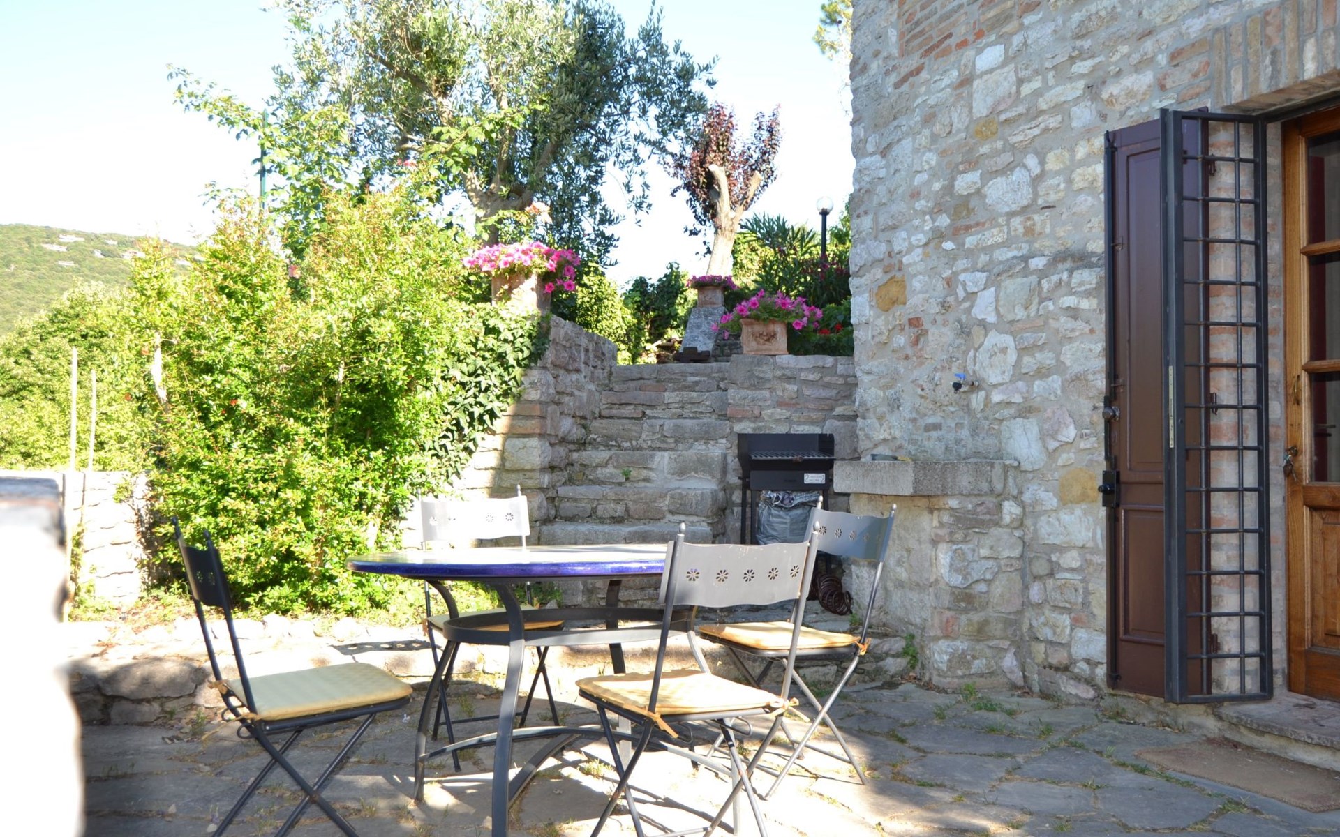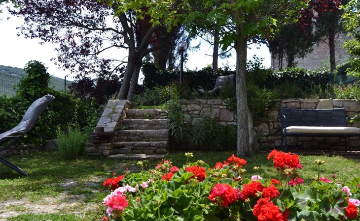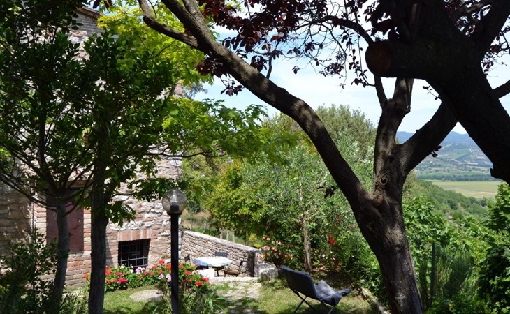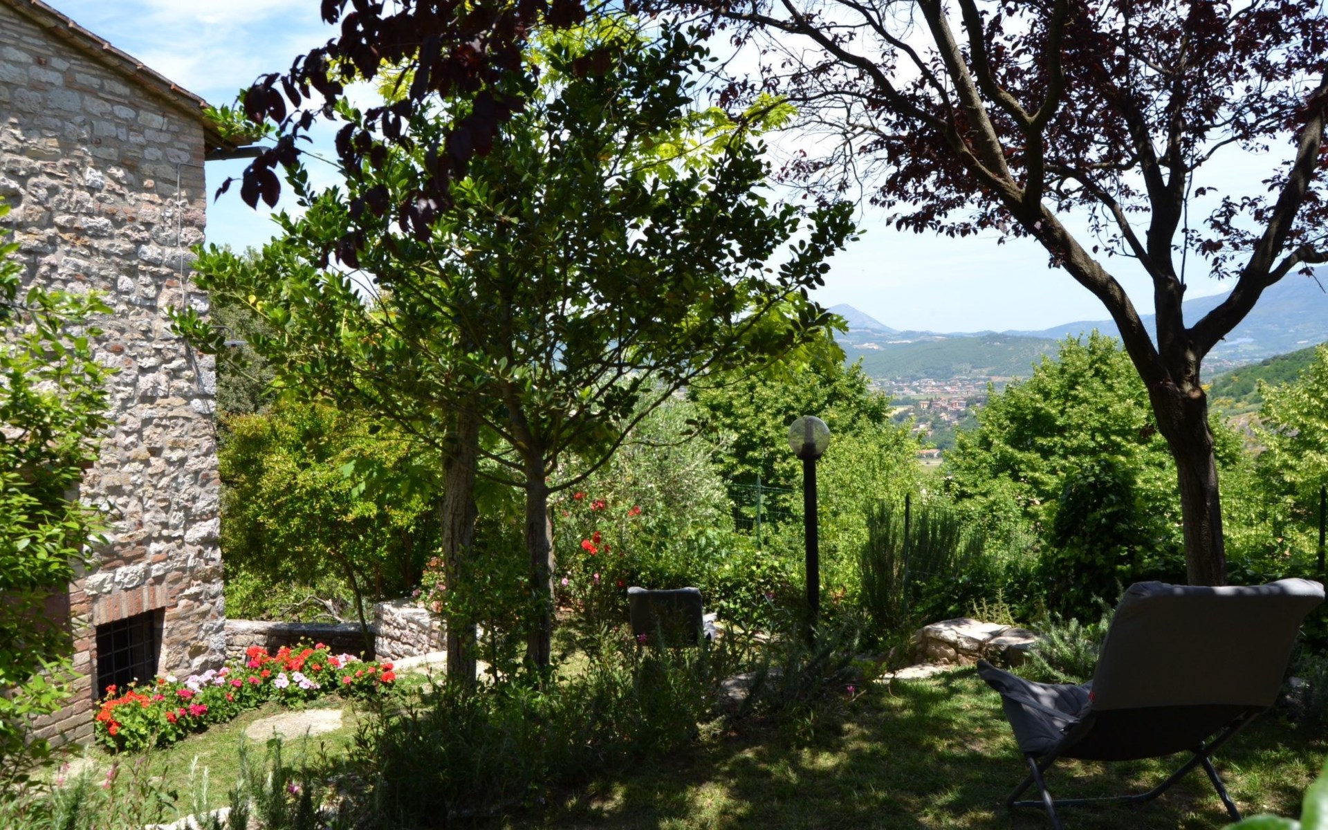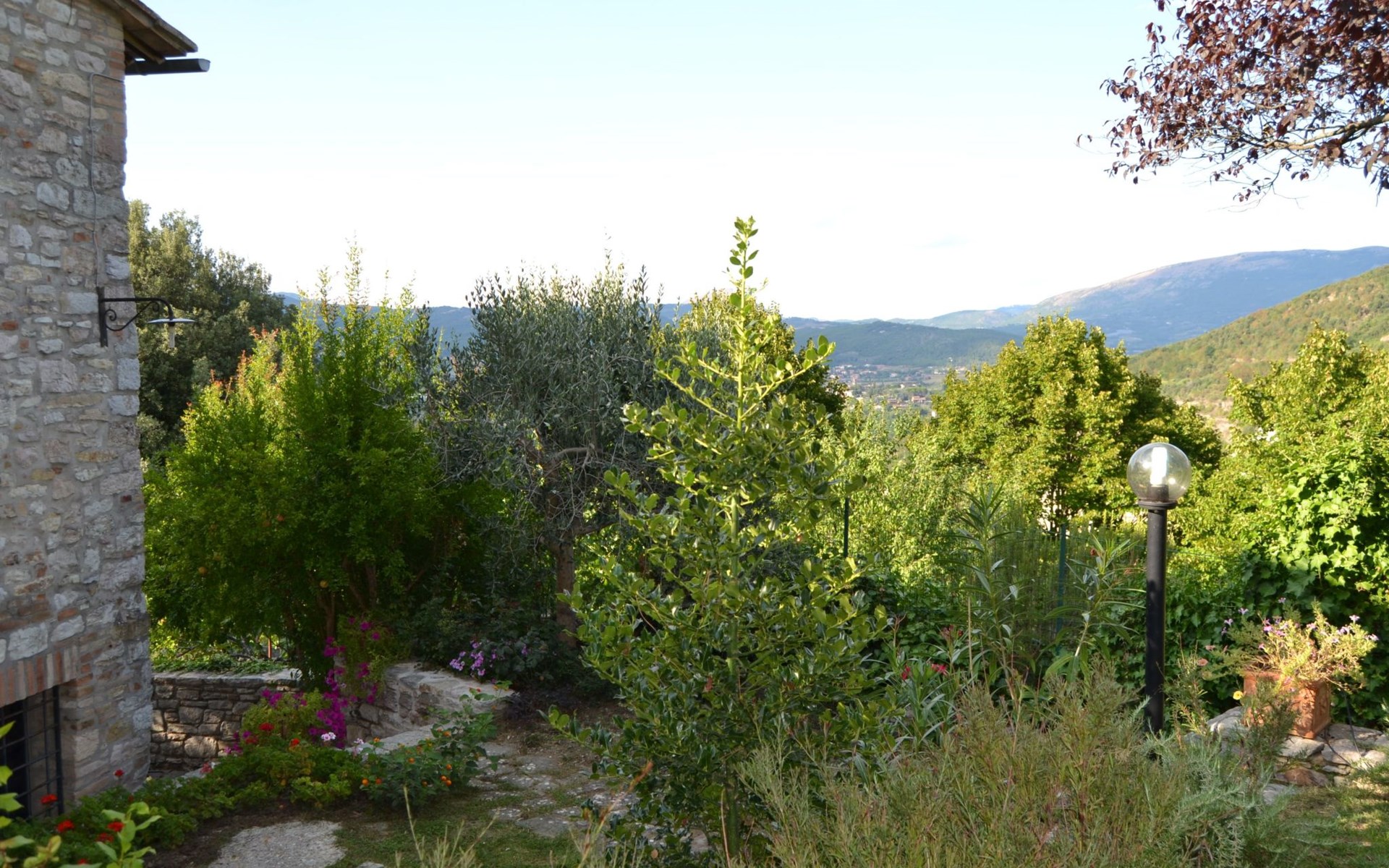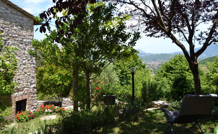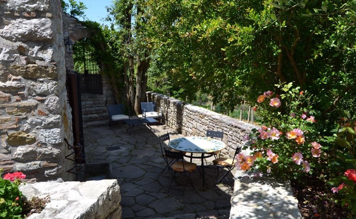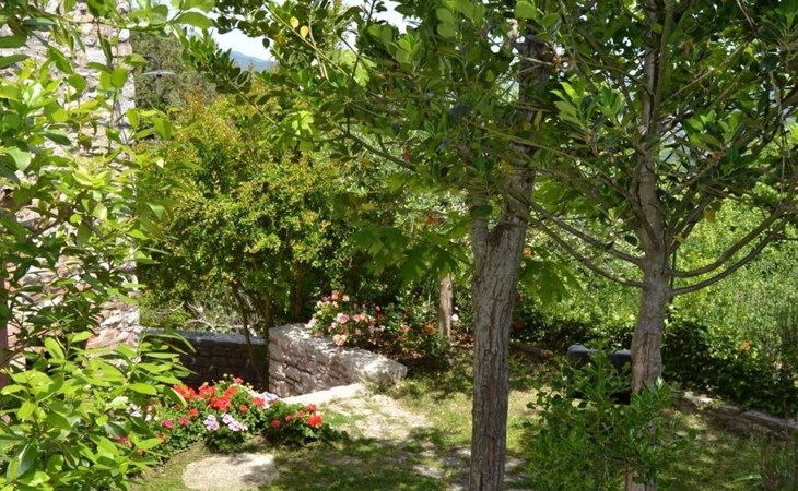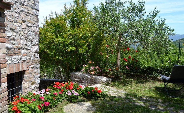 Das Ferienhaus ist auf drei Seiten von einem terrassenförmigen, teilweise gepflasterten Garten umgeben. Der Garten bietet einen schönen Blick auf das Tal und die umliegenden Hügel und ist mit einem Sofa, zwei Sesseln, einem Tisch und zwei Liegestühlen ausgestattet. Es gibt einige schattige Plätze im Garten.