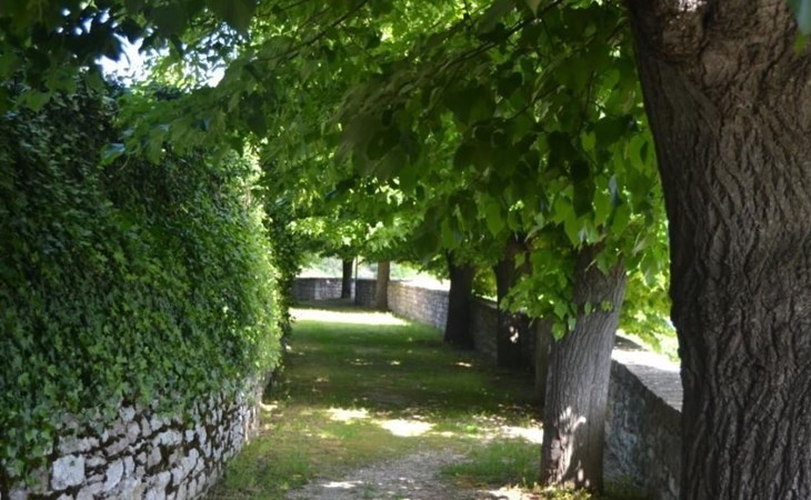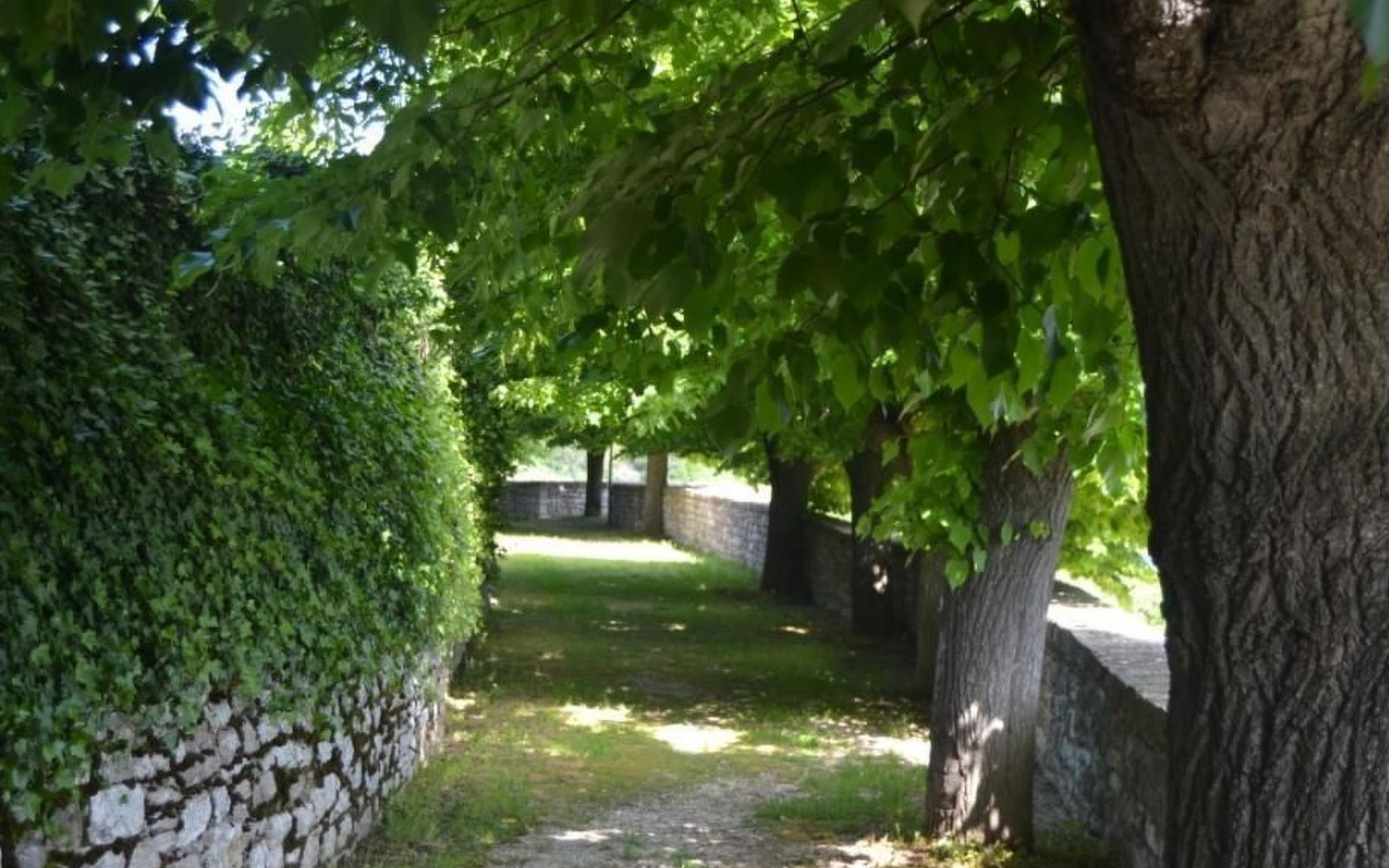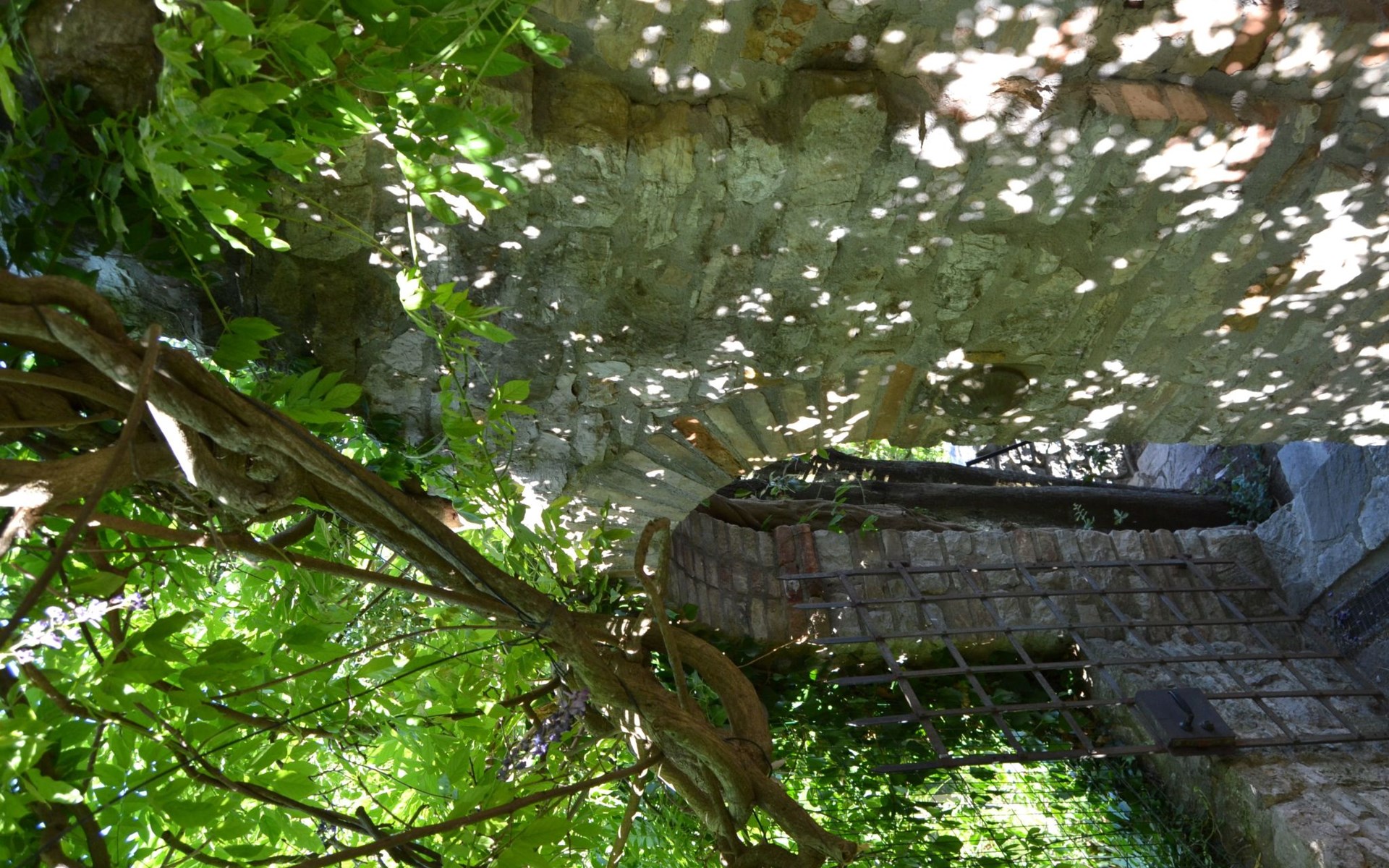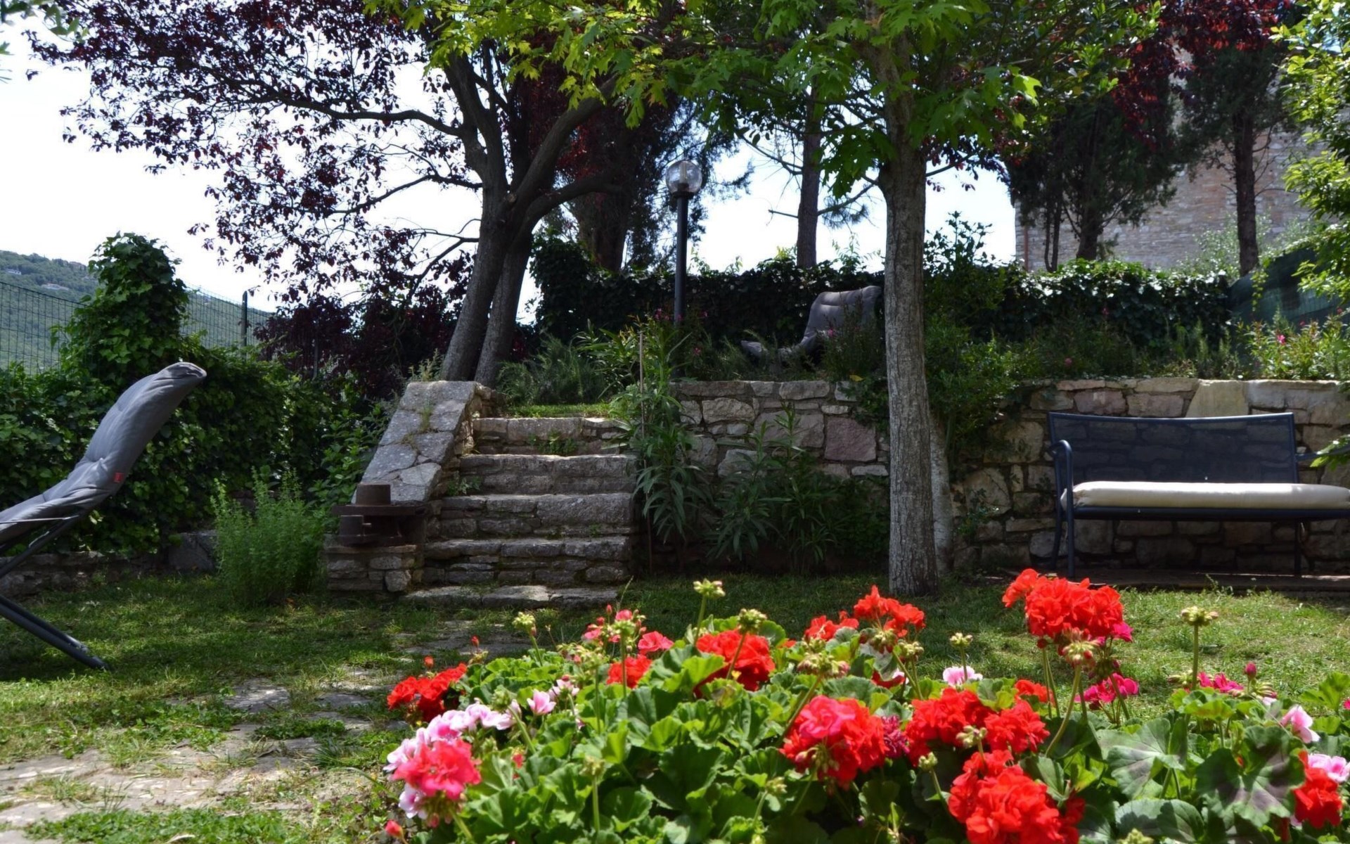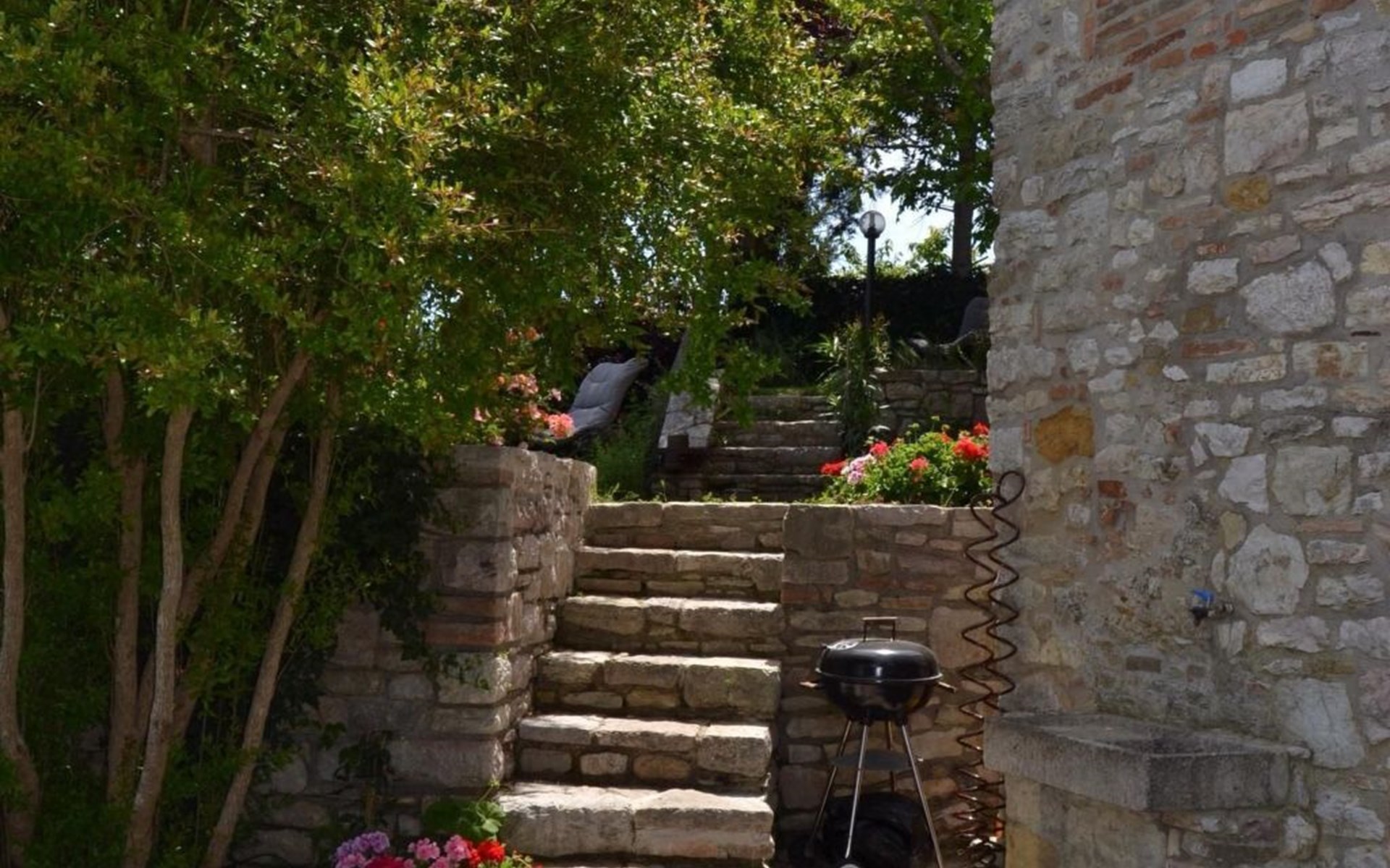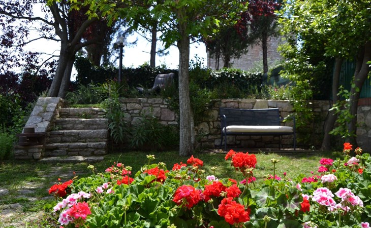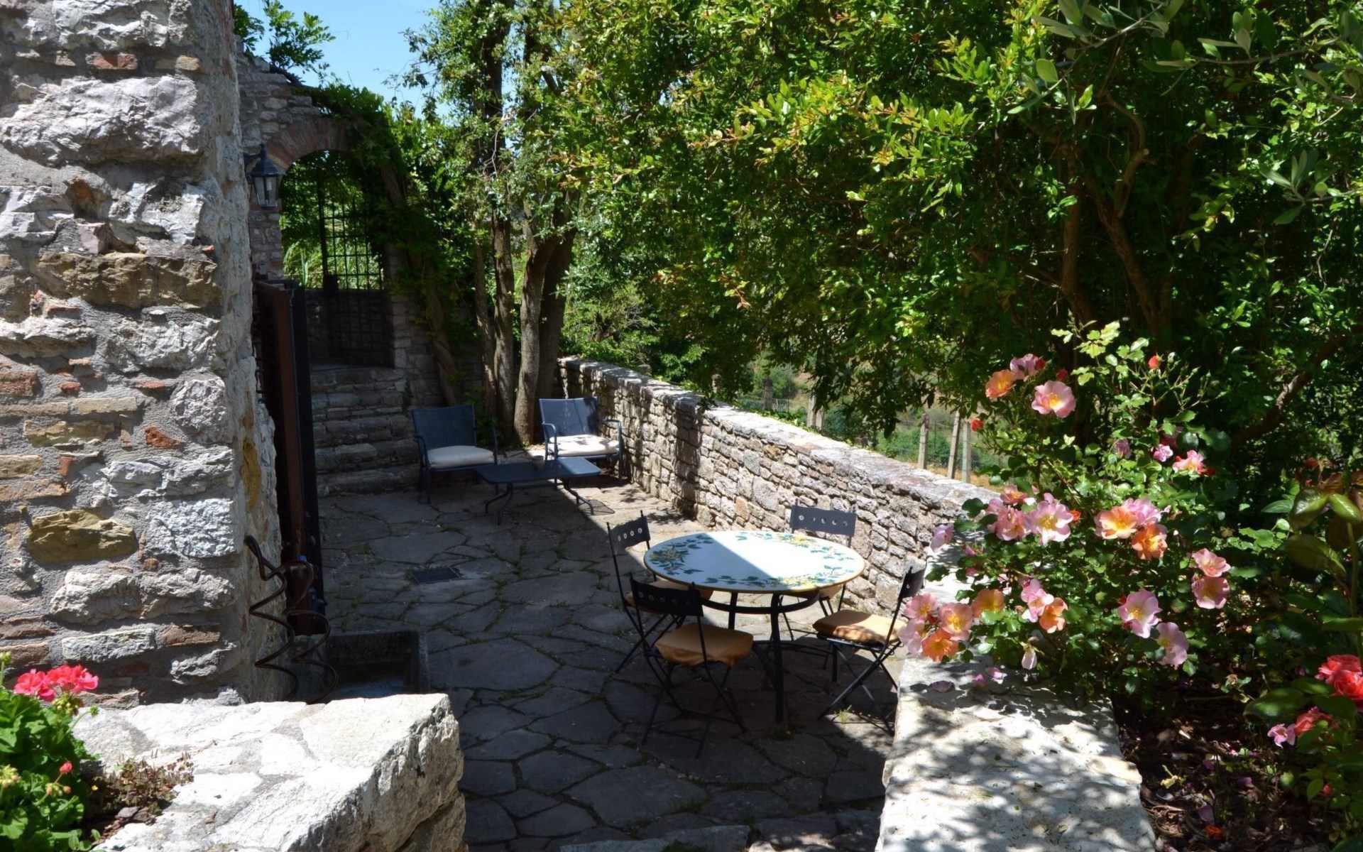 Das Ferienhaus ist auf drei Seiten von einem terrassenförmigen, teilweise gepflasterten Garten umgeben. Der Garten bietet einen schönen Blick auf das Tal und die umliegenden Hügel und ist mit einem Sofa, zwei Sesseln, einem Tisch und zwei Liegestühlen ausgestattet. Es gibt einige schattige Plätze im Garten.