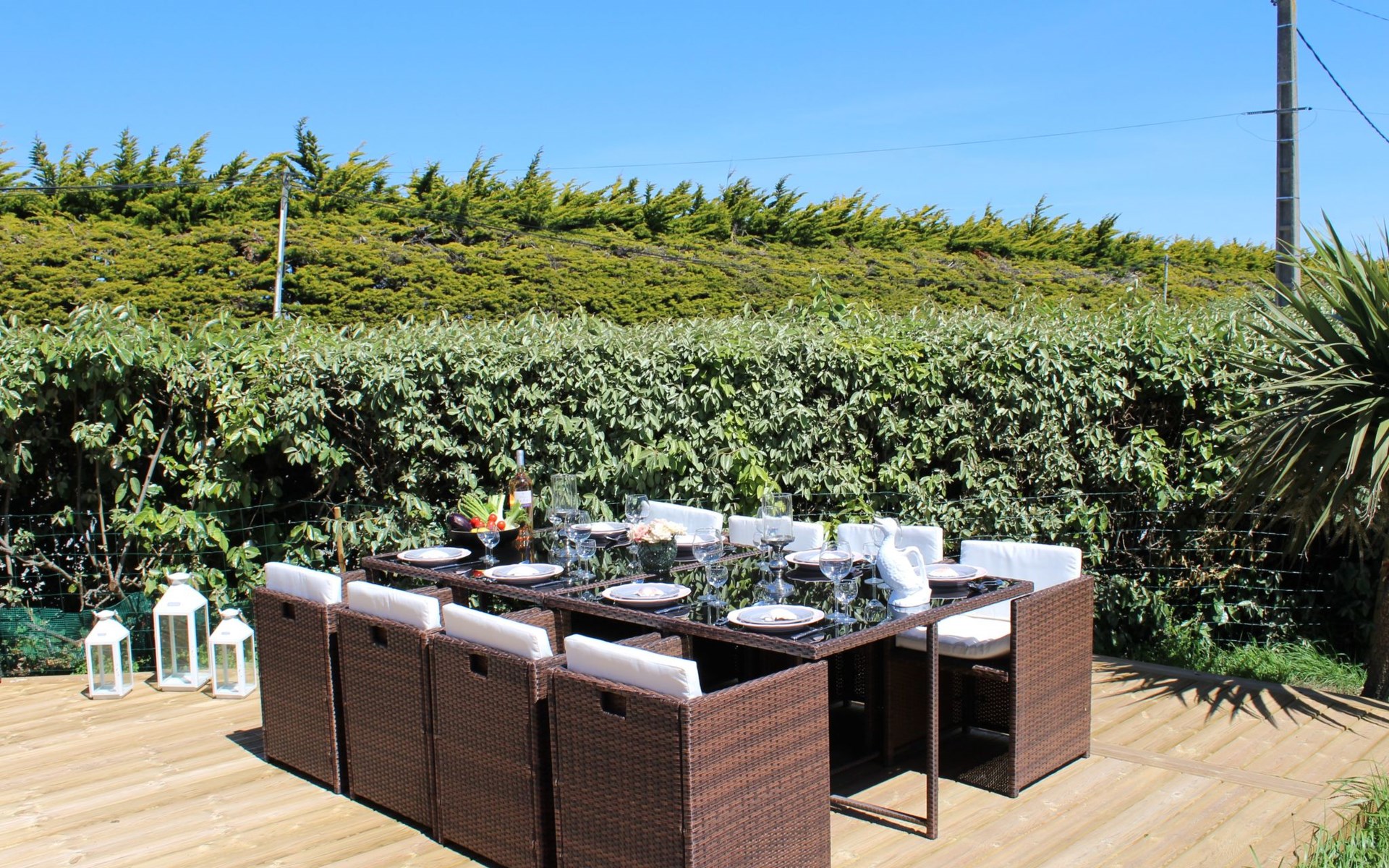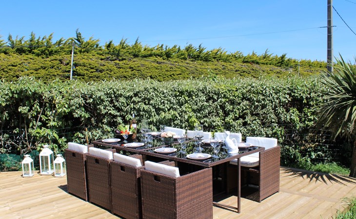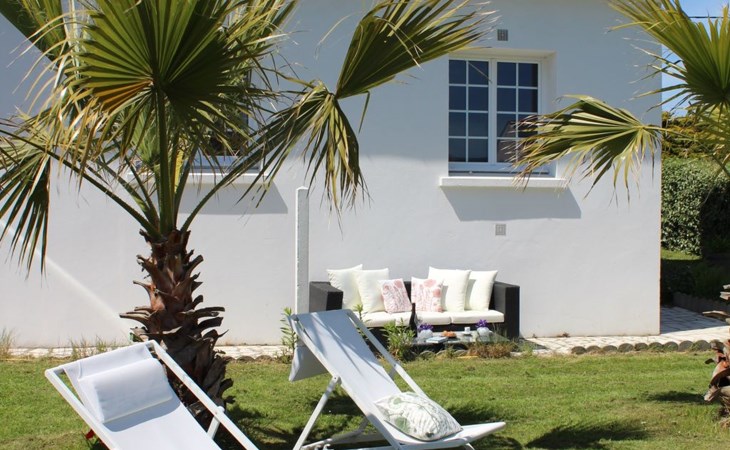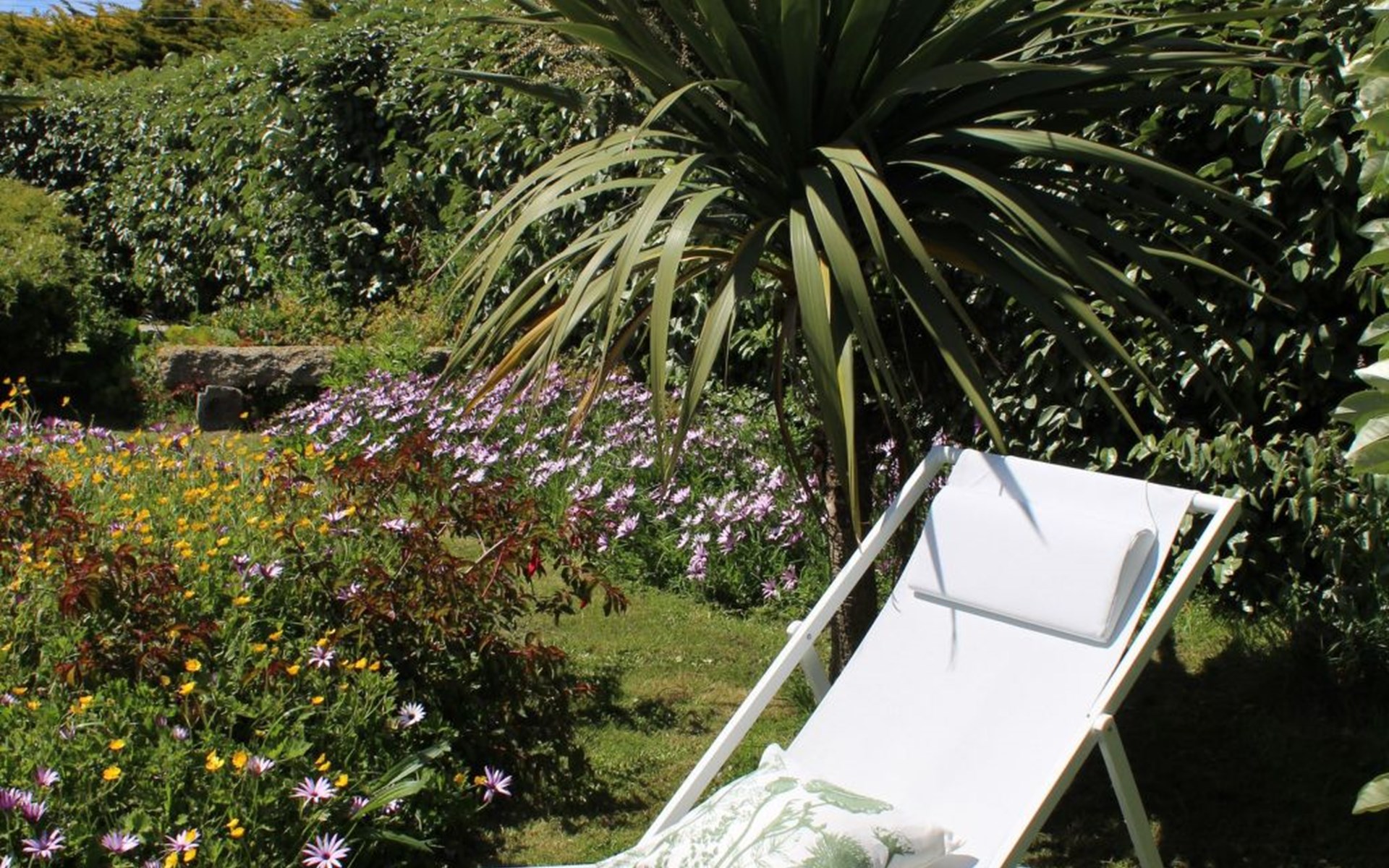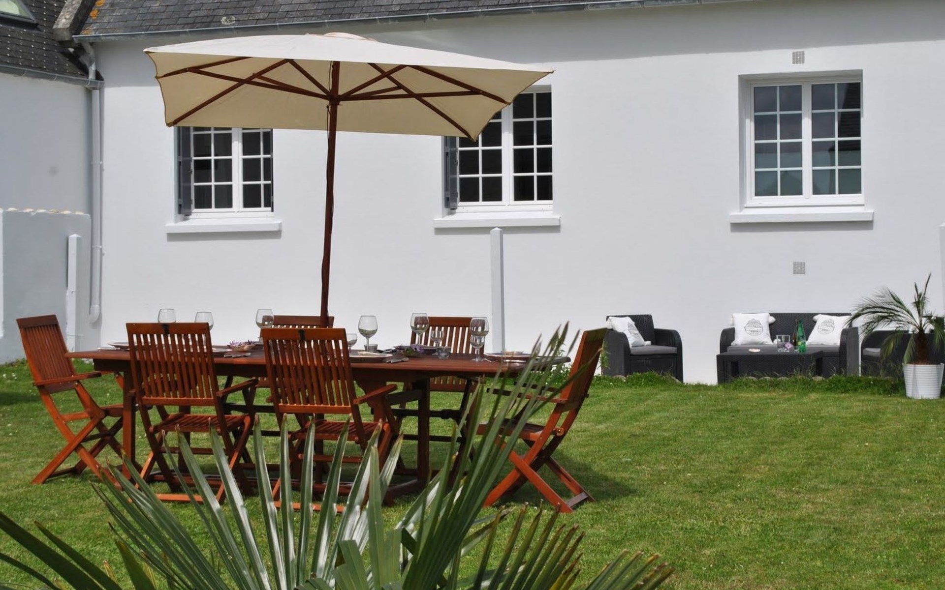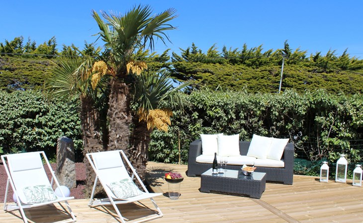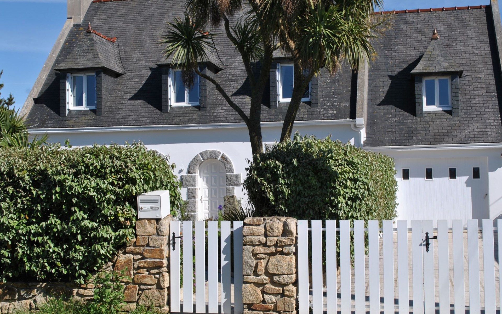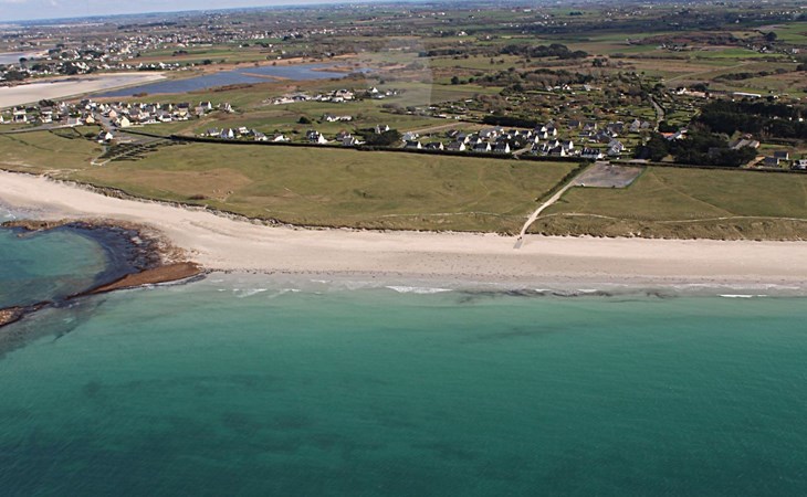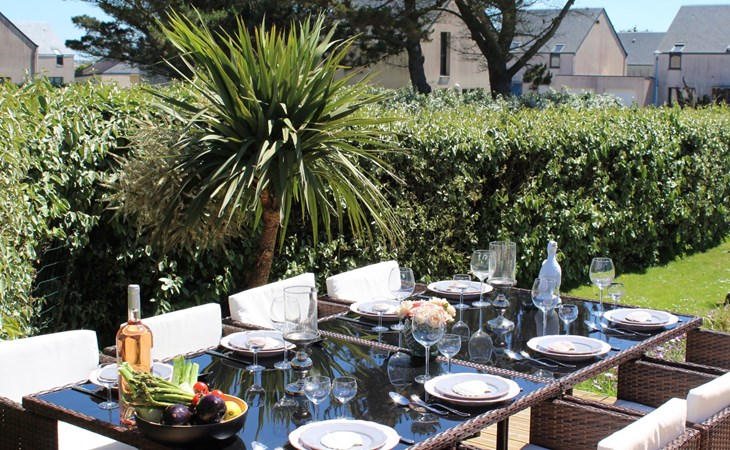 Das Grundstück liegt in der ersten Meerreihe direkt an der großen und hohen Düne Vougot. Sie gehen durch das Gartentor und gelangen nach 10 Metern zu einem direkten Zugang durch die mehr als drei Meter hohe Dünenhecke.Das Grundstück selbst ist komplett eingezäunt. Vor dem Haus in Westausrichtung befindet sich seit 2020 ein riesiges Holzdeck (50m²) mit einer Terrasse, großzügigen und bequemem Terrassenmobiliar in Rattanoptik. So können Sie gerne am Mittag oder Abend viele Sonnenstunden dort verbringen und das Meer hören und riechen und hinter der Düne erahnen.Östlich des Hauses gibt es eine gepflegte Rasenfläche, die zum Beispiel an windarmen Tagen für eine Runde Badminton genutzt werden kann. Sollte es einmal vom Meer her zu windig sein, dann bietet eine zweite kleinere Terrasse in Südost-Ausrichtung und mit dem Windschutz des Hauses und des SPA Bereichs eine ruhige und geschützte Alternative.Auf dem eingezäunten Grundstück befinden sich zwei hauseigene Stellplätze. Sie können Ihre(n) PKW aber auch gerne vor oder neben dem Grundstück abstellen.Die Pflanzen auf dem Grundstück spiegeln die Vielfalt der Flora der Bretagne wider, sie finden eine Reihe bunt leuchtender Hortensien, mehrere Arten von Palmen, ein Mandarinenbusch sowie einen großen oft viel Früchte tragenden Feigenbaum etc.