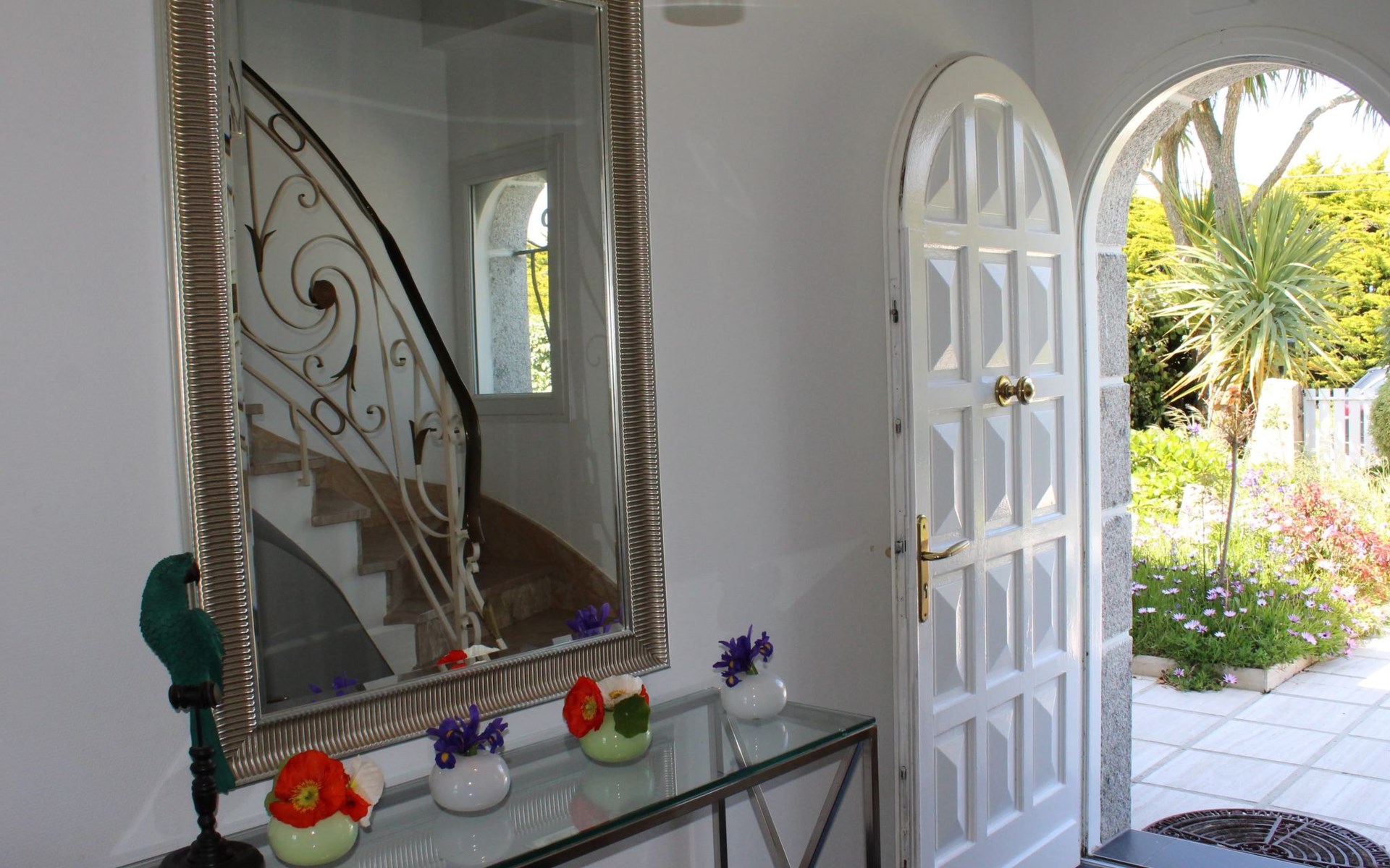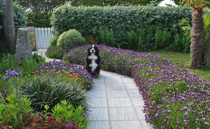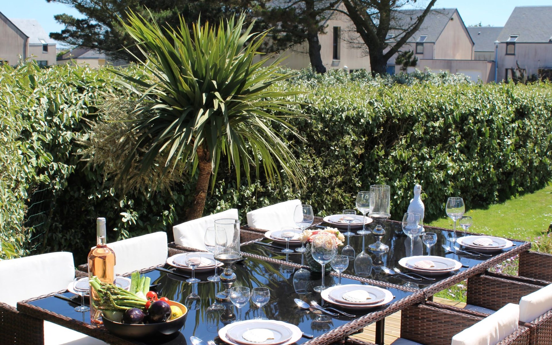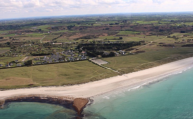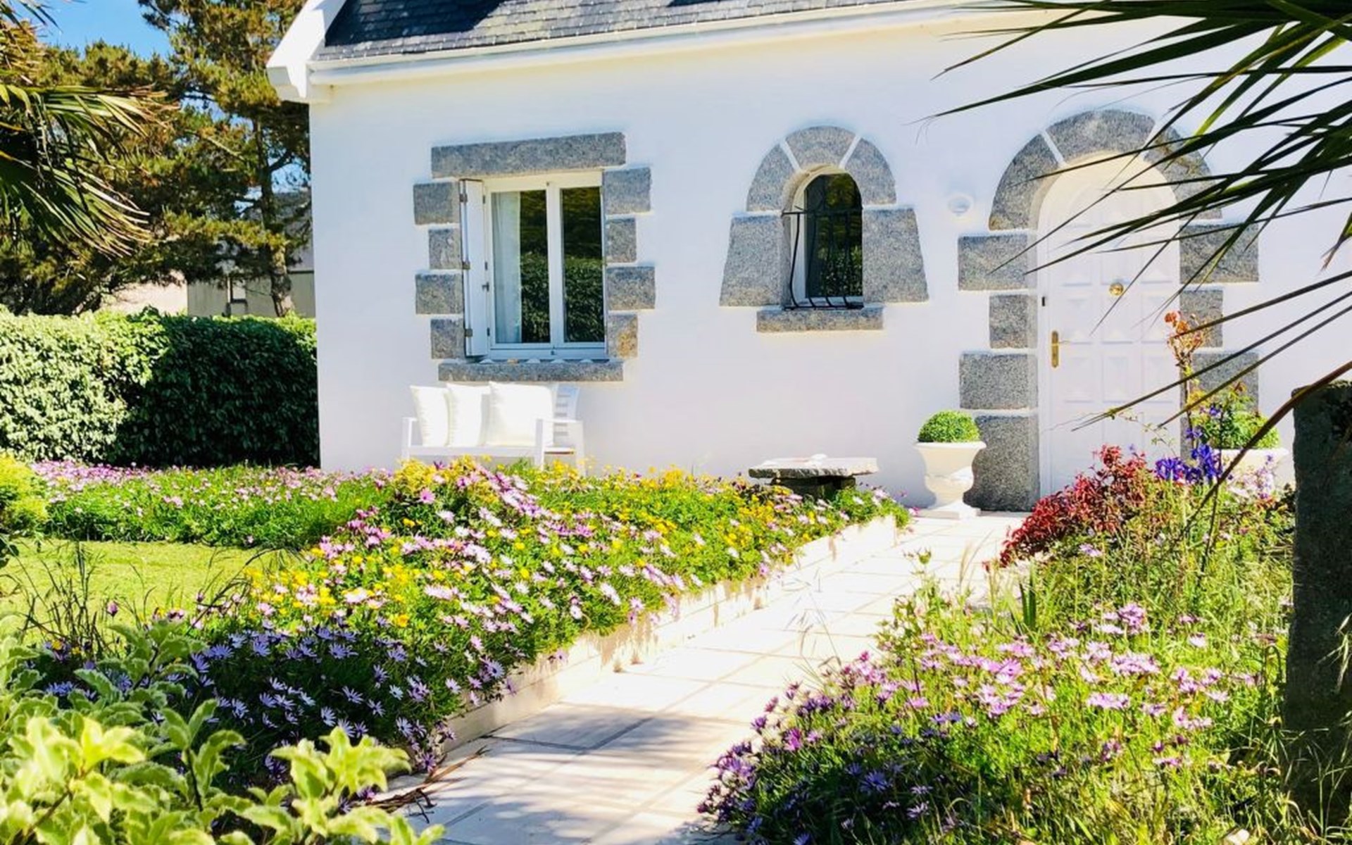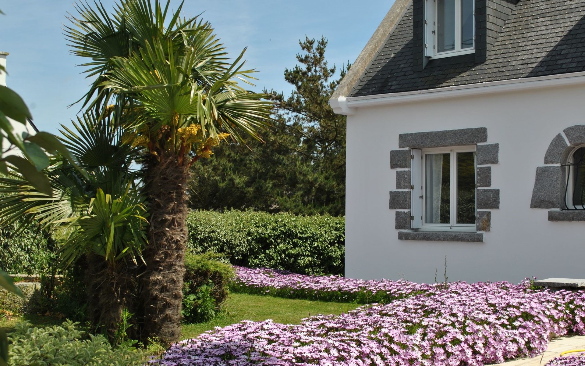Das Grundstück liegt in der ersten Meerreihe direkt an der großen und hohen Düne Vougot. Sie gehen durch das Gartentor und gelangen nach 10 Metern zu einem direkten Zugang durch die mehr als drei Meter hohe Dünenhecke.Das Grundstück selbst ist komplett eingezäunt. Vor dem Haus in Westausrichtung befindet sich seit 2020 ein riesiges Holzdeck (50m²) mit einer Terrasse, großzügigen und bequemem Terrassenmobiliar in Rattanoptik. So können Sie gerne am Mittag oder Abend viele Sonnenstunden dort verbringen und das Meer hören und riechen und hinter der Düne erahnen.Östlich des Hauses gibt es eine gepflegte Rasenfläche, die zum Beispiel an windarmen Tagen für eine Runde Badminton genutzt werden kann. Sollte es einmal vom Meer her zu windig sein, dann bietet eine zweite kleinere Terrasse in Südost-Ausrichtung und mit dem Windschutz des Hauses und des SPA Bereichs eine ruhige und geschützte Alternative.Auf dem eingezäunten Grundstück befinden sich zwei hauseigene Stellplätze. Sie können Ihre(n) PKW aber auch gerne vor oder neben dem Grundstück abstellen.Die Pflanzen auf dem Grundstück spiegeln die Vielfalt der Flora der Bretagne wider, sie finden eine Reihe bunt leuchtender Hortensien, mehrere Arten von Palmen, ein Mandarinenbusch sowie einen großen oft viel Früchte tragenden Feigenbaum etc.