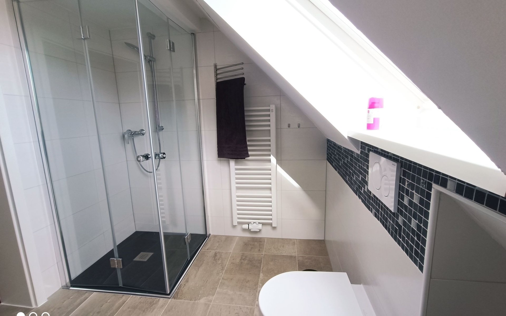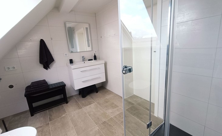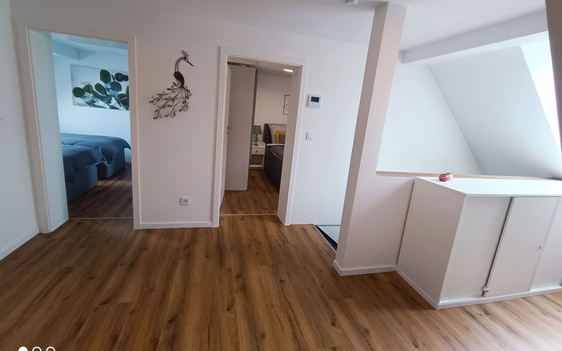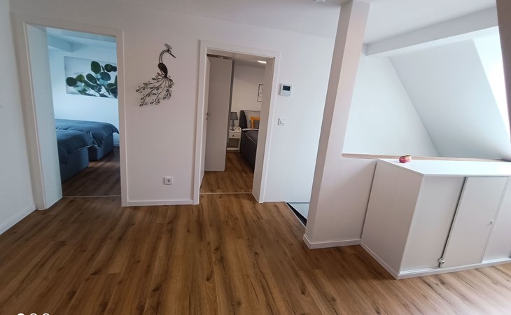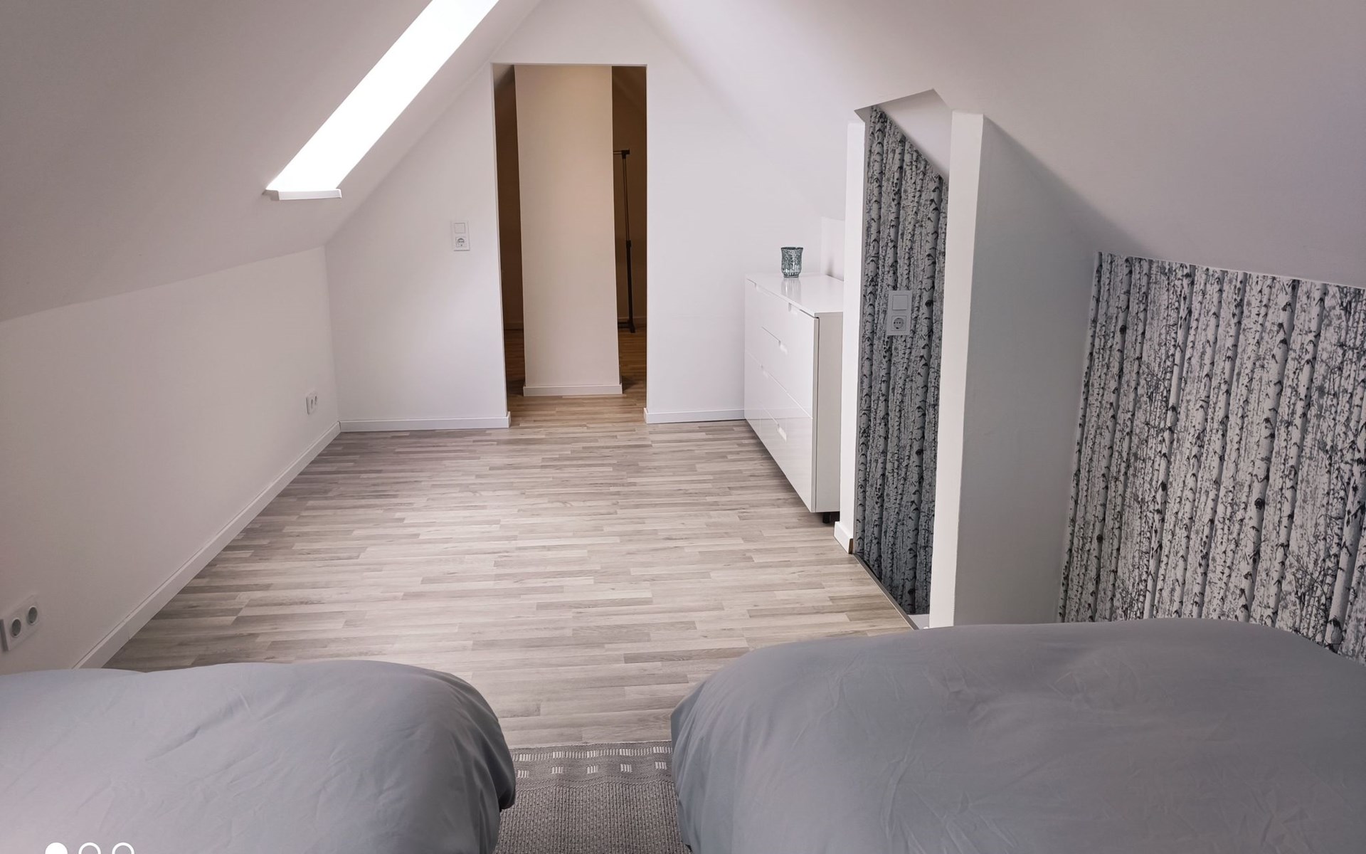 Im Schlafzimmer zwei ist ebenfalls ein großer Kleiderschrank mit Ganzkörperspiegel zu finden und zwei Boxspringbetten mit Topper (Gesamtgröße pro Bett 90cm) = Die Betten können auch zusammengeschoben werden und ergeben eine Liegefläche von 180cm. Das Schlafzimmer 3 befindet sich in der ausgebauten Dachspitze. Hier sind ebenfalls zwei Boxspringbetten mit Topper (Gesamtgröße pro Bett 90cm) vorhanden. Auf Wunsch hätte hier noch ein Zustellbett Platz für eine 7. Person. Ein begehbarer Kleiderschrank bietet genug Stauraum für die Kleidungsstücke.