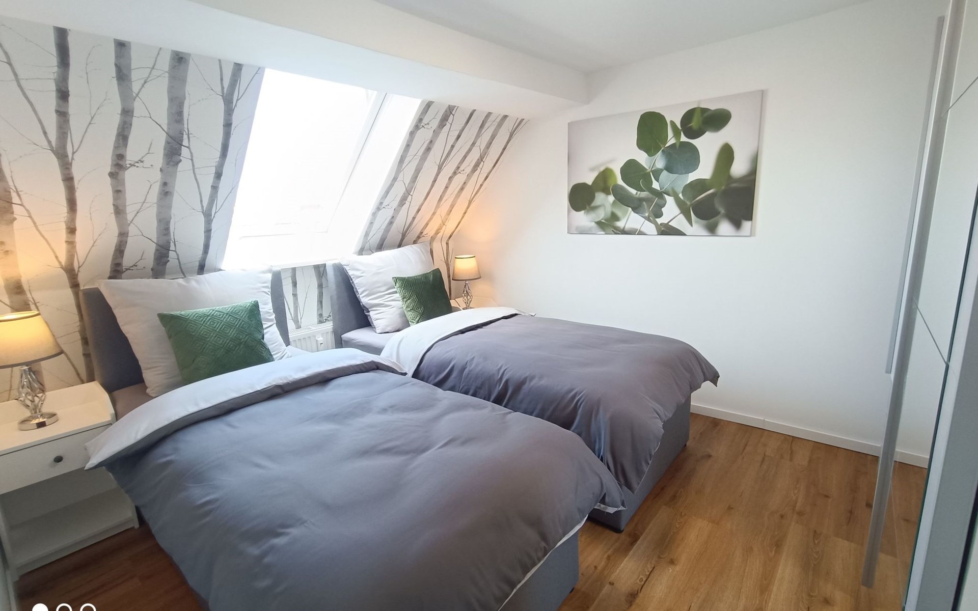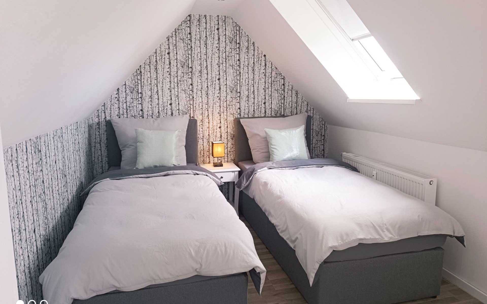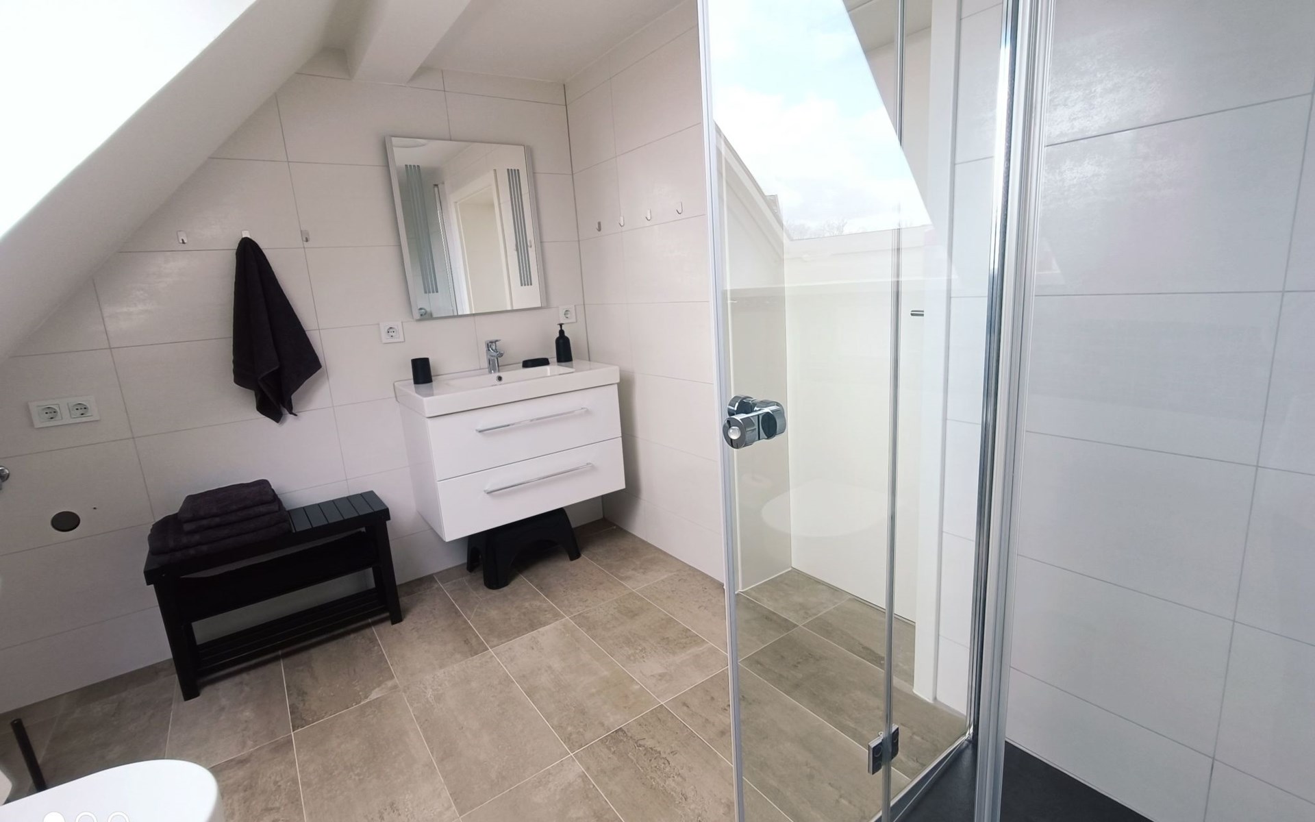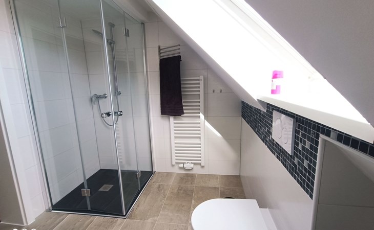 Im Schlafzimmer zwei ist ebenfalls ein großer Kleiderschrank mit Ganzkörperspiegel zu finden und zwei Boxspringbetten mit Topper (Gesamtgröße pro Bett 90cm) = Die Betten können auch zusammengeschoben werden und ergeben eine Liegefläche von 180cm. Das Schlafzimmer 3 befindet sich in der ausgebauten Dachspitze. Hier sind ebenfalls zwei Boxspringbetten mit Topper (Gesamtgröße pro Bett 90cm) vorhanden. Auf Wunsch hätte hier noch ein Zustellbett Platz für eine 7. Person. Ein begehbarer Kleiderschrank bietet genug Stauraum für die Kleidungsstücke.