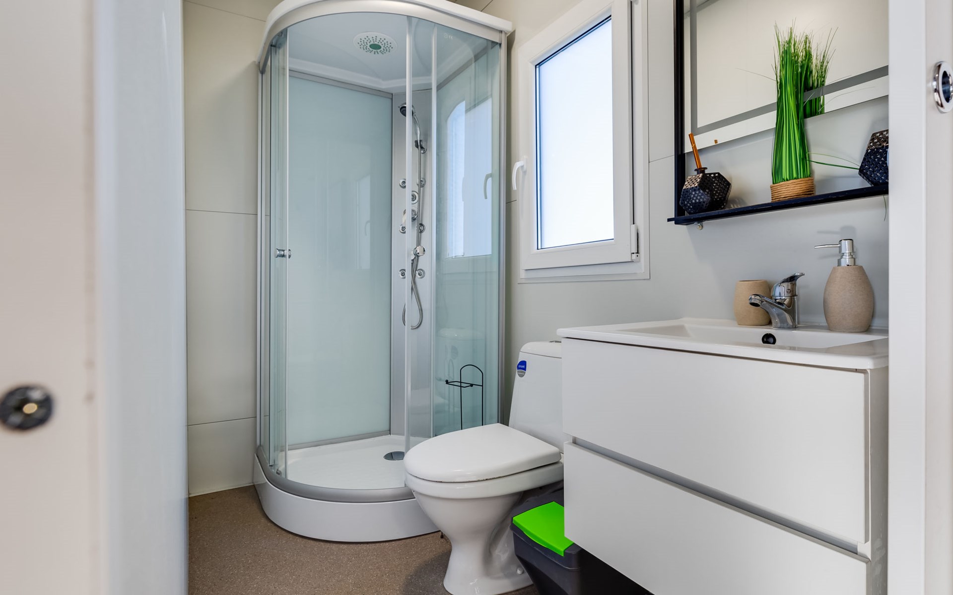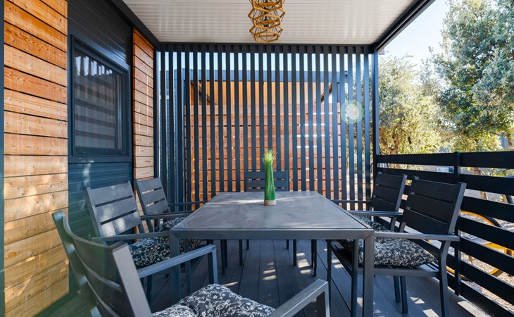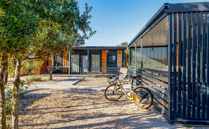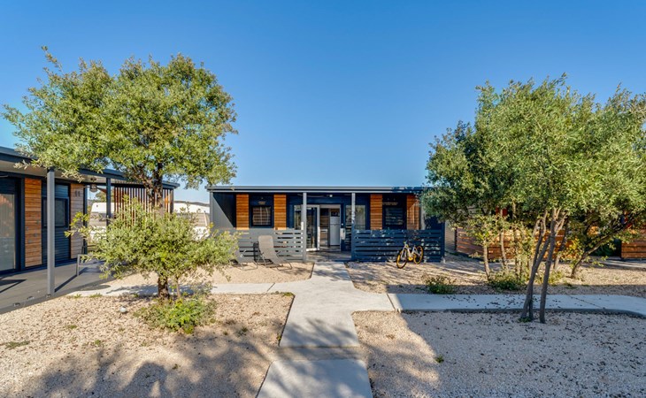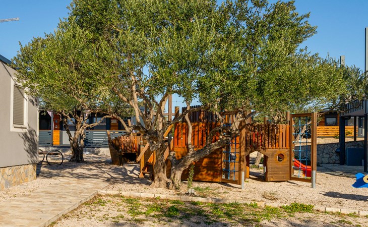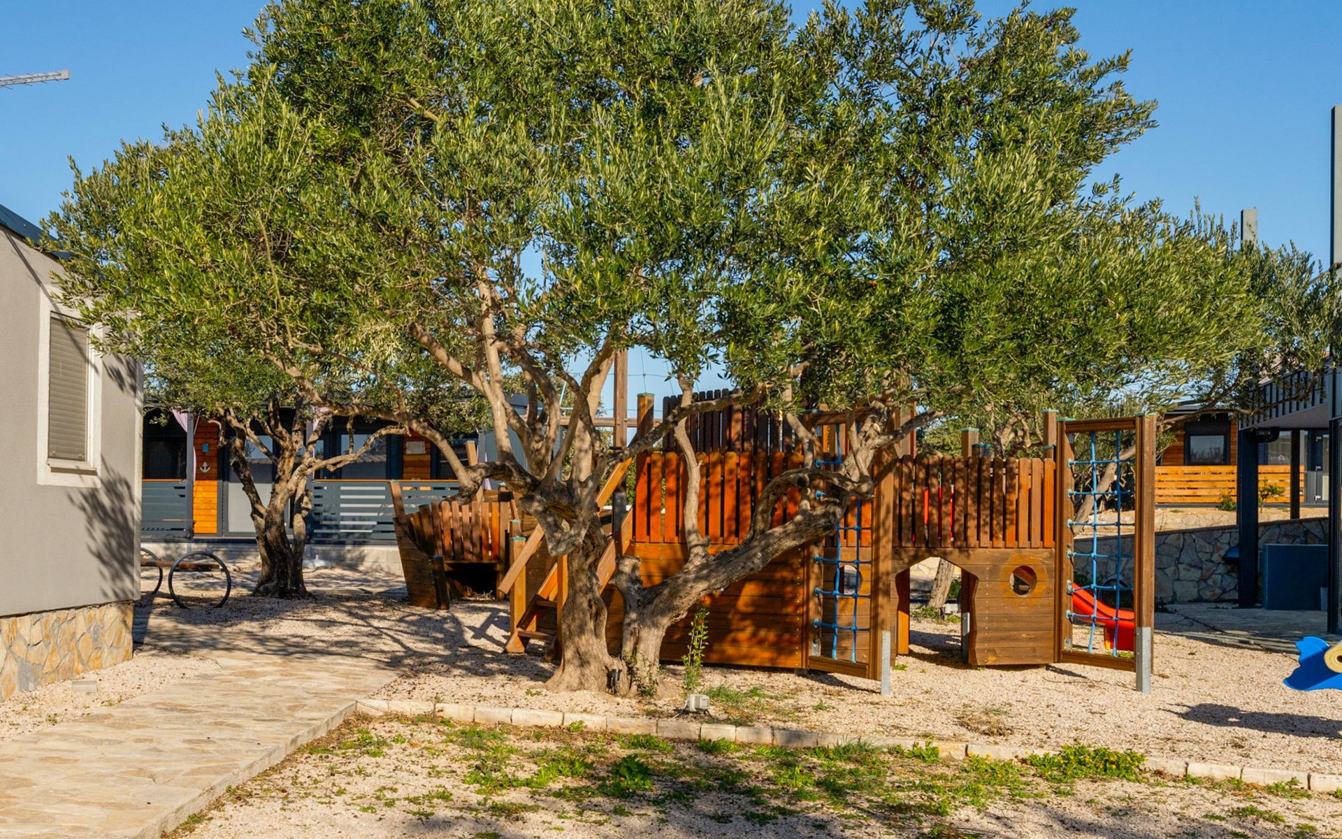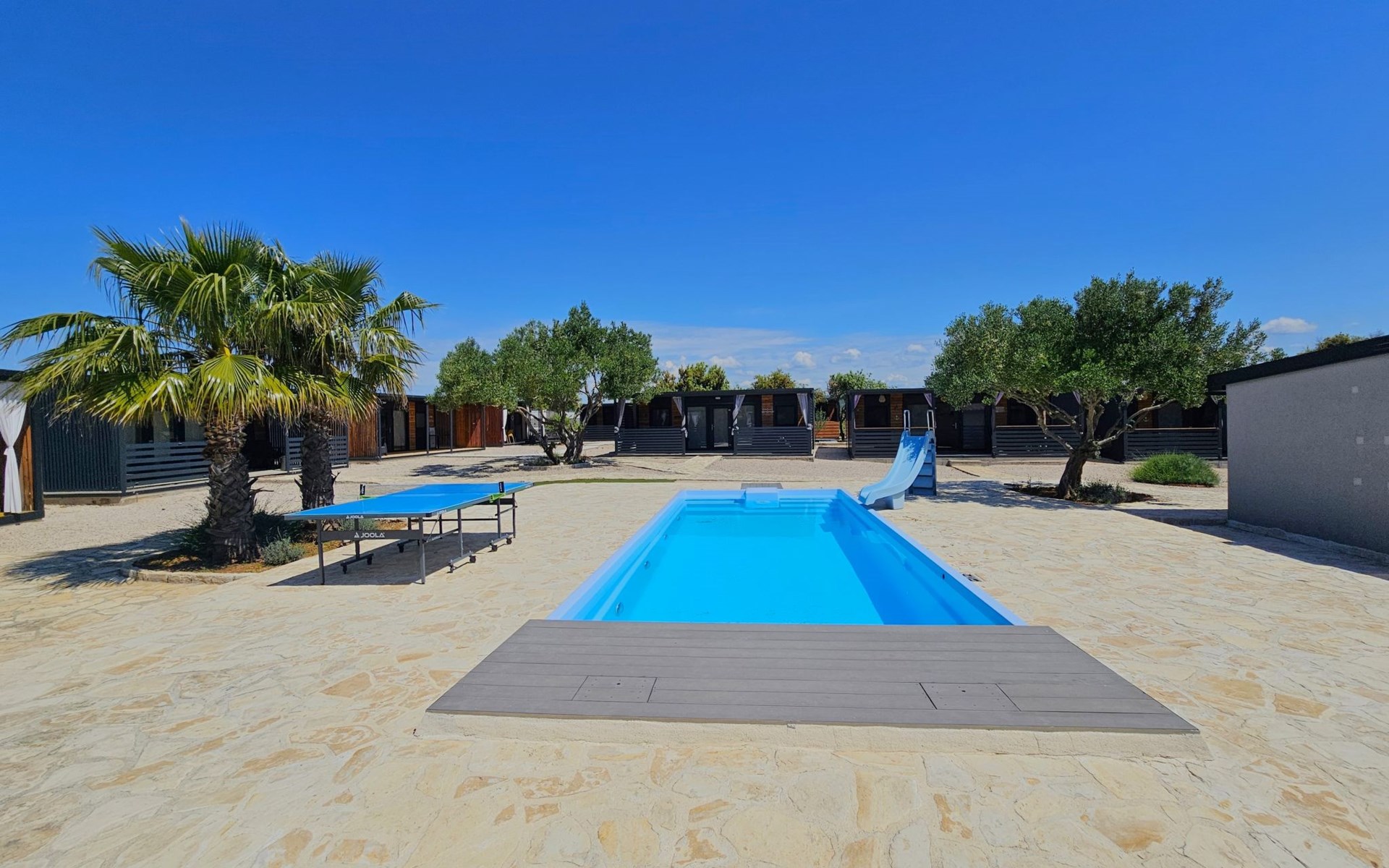 Camping Pirovac: Bungalow "Delux Eco", Baujahr 2023. Sonnige Lage, 150 m vom Meer, 150 m vom Strand. Zur Mitbenutzung: Grundstück mit Bäumen, Schwimmbad beheizt (9 x 4 m, 34 m2, 150 cm tief, saisonale Verfügbarkeit: 01.Mai. - 15.Sep.). Dusche/WC im Poolbereich, Tischtennis, Kinderspielplatz. In der Anlage: Restaurant, Bar, Internetzugang. Parkplatz beim Haus auf dem Grundstück. Einkaufsgeschäft 500 m, Restaurant, Café 20 m, Bushaltestelle 1 km, Kieselstrand, betonierter Strand 150 m. Jacht-Hafen 2 km. Nahe gelegene Sehenswürdigkeiten: NP Krka 33 km, Aquapark 30 km. Bekannte Seen in der Umgebung sind gut erreichbar: Vransko jezero 24 km.