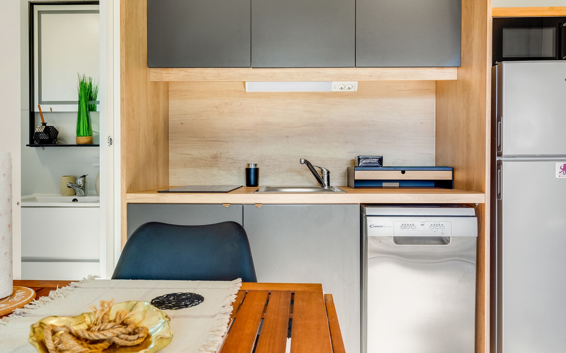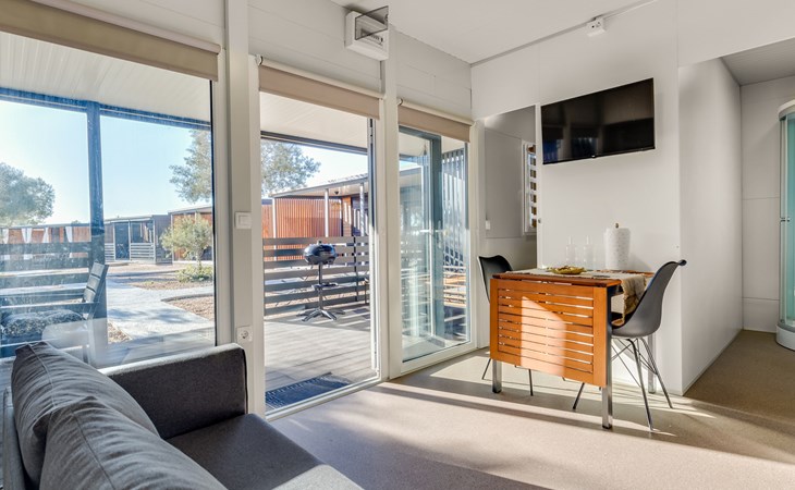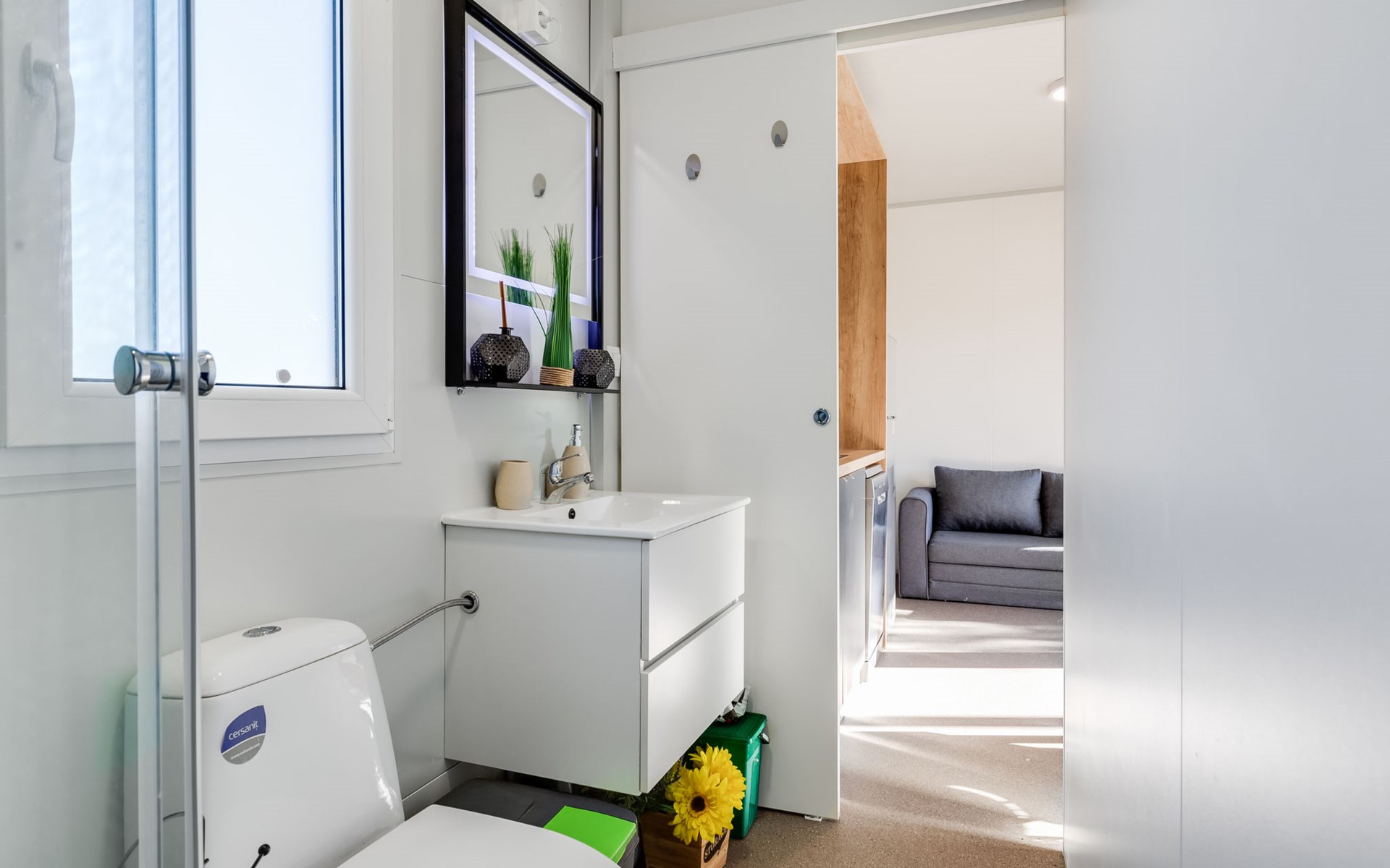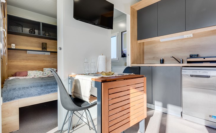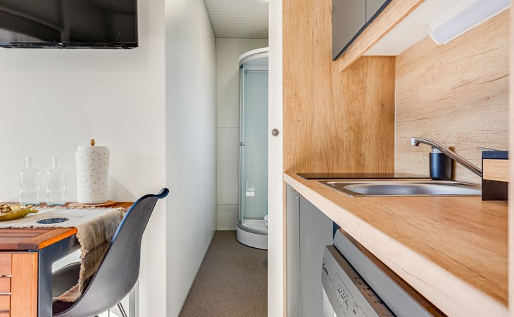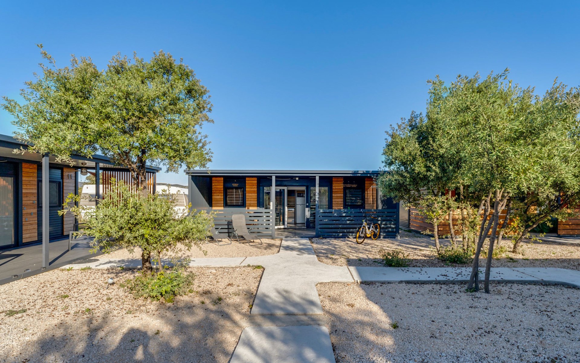 Camping Pirovac: Bungalow "Delux Eco", Baujahr 2023. Sonnige Lage, 150 m vom Meer, 150 m vom Strand. Zur Mitbenutzung: Grundstück mit Bäumen, Schwimmbad beheizt (9 x 4 m, 34 m2, 150 cm tief, saisonale Verfügbarkeit: 01.Mai. - 15.Sep.). Dusche/WC im Poolbereich, Tischtennis, Kinderspielplatz. In der Anlage: Restaurant, Bar, Internetzugang. Parkplatz beim Haus auf dem Grundstück. Einkaufsgeschäft 500 m, Restaurant, Café 20 m, Bushaltestelle 1 km, Kieselstrand, betonierter Strand 150 m. Jacht-Hafen 2 km. Nahe gelegene Sehenswürdigkeiten: NP Krka 33 km, Aquapark 30 km. Bekannte Seen in der Umgebung sind gut erreichbar: Vransko jezero 24 km.