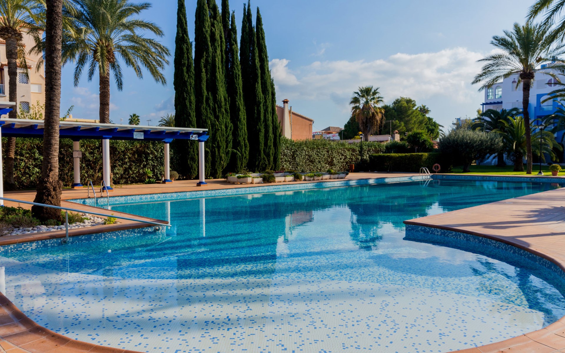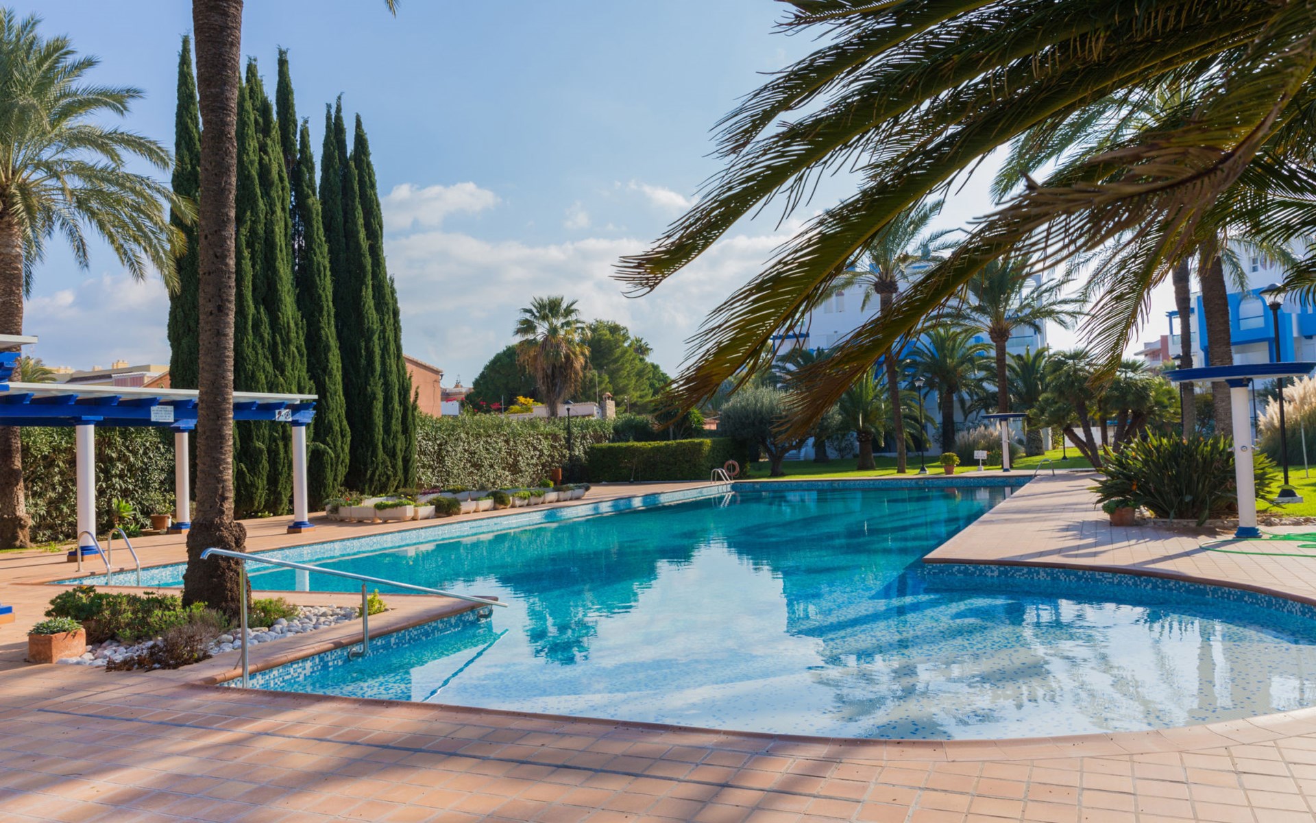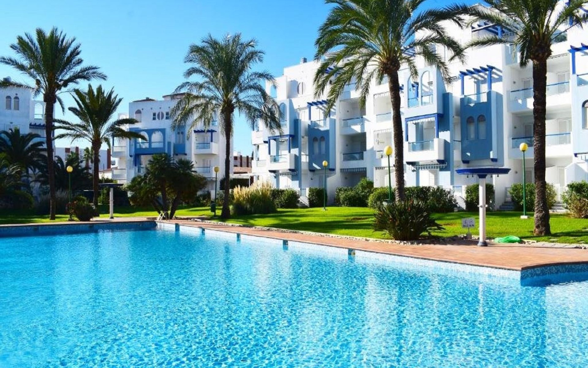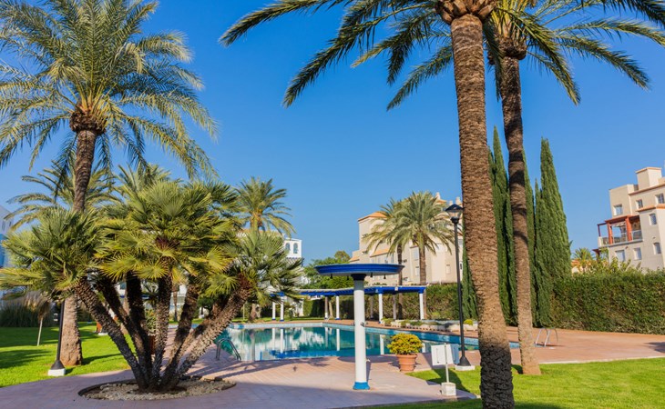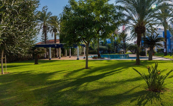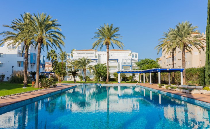 Sehr schönes, gemütliches Appartementhaus "Cala Blanca Denia". Im Ort, 5 km vom Zentrum von Dénia, ruhige, sonnige Lage, vom Meer, 400 m vom Strand. Zur Mitbenutzung: grosser, schöner, gepflegter Garten mit Rasen, Schwimmbad eckig (34 x 15 m, 40 - 180 cm tief, saisonale Verfügbarkeit: 01.Jan. - 31.Dez.). Aussendusche, Parkplatz auf dem Grundstück. Supermarkt 600 m, Restaurant 140 m, Bar 150 m, Bushaltestelle 400 m, Bahnstation 6.5 km, Fähre 6.5 km, Sandstrand "Playa Els Molins" 400 m. Sporthafen 5 km, Surfschule, Segelschule 500 m. Der Besitzer akzeptiert keine Jugendgruppen.