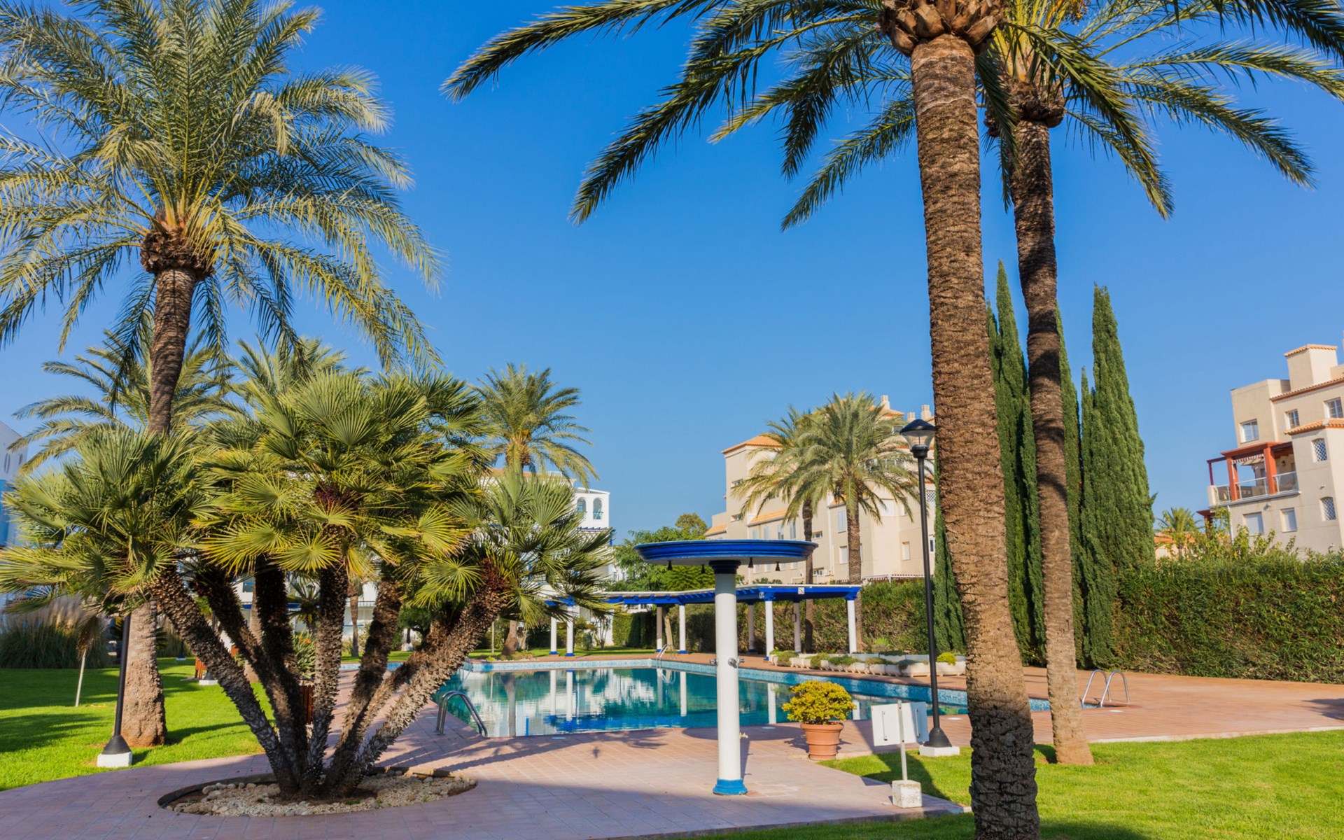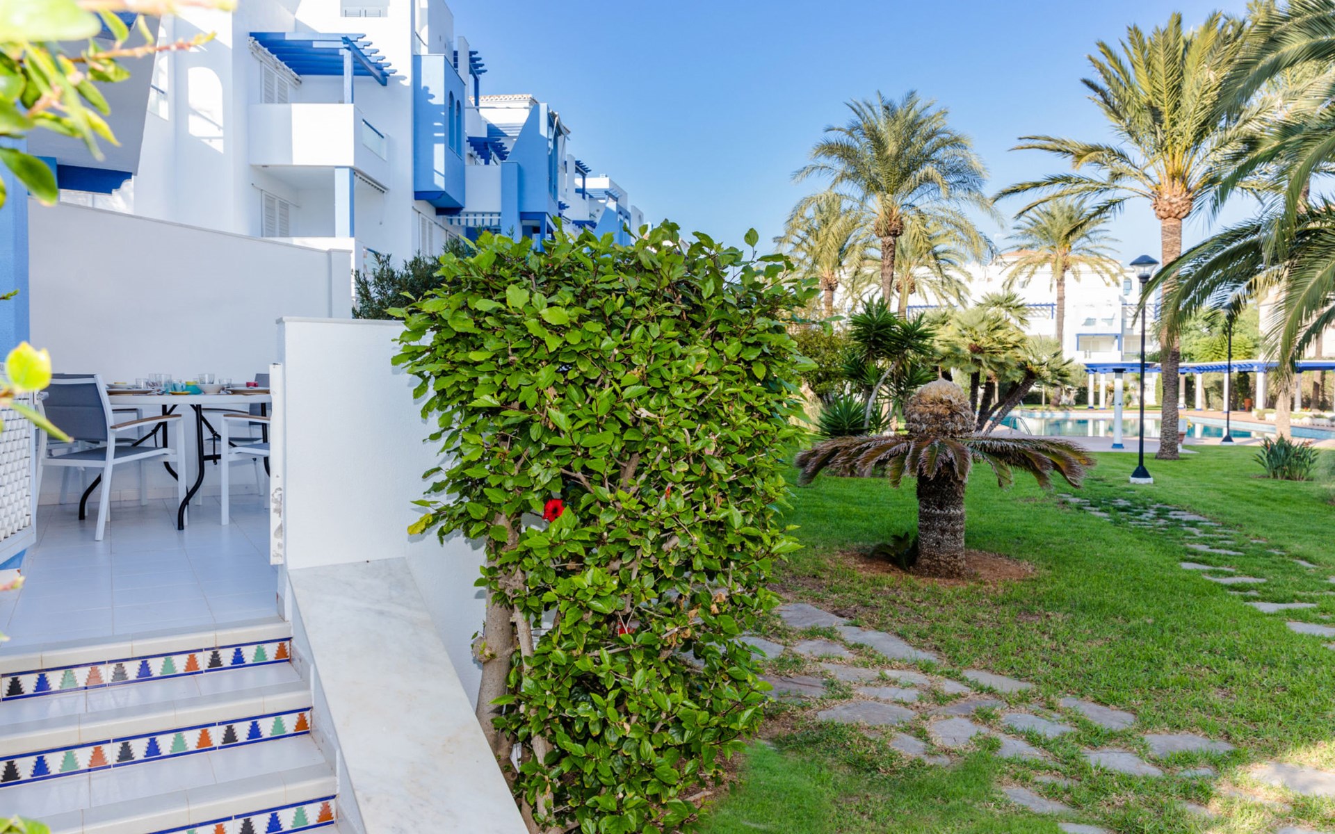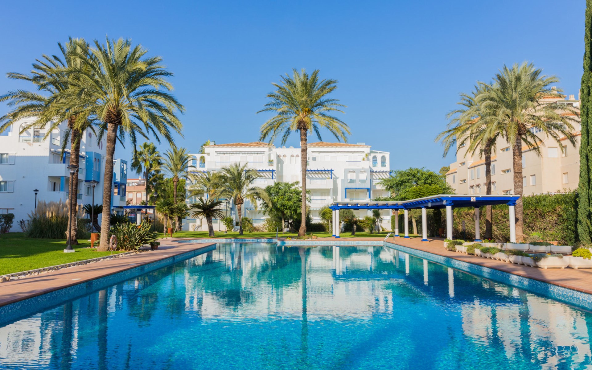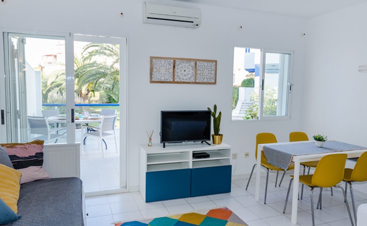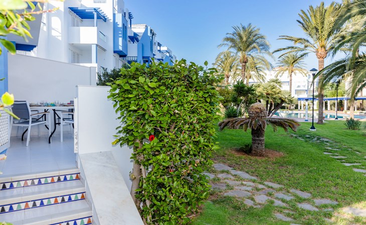 Sehr schönes, gemütliches Appartementhaus "Cala Blanca Denia". Im Ort, 5 km vom Zentrum von Dénia, ruhige, sonnige Lage, vom Meer, 400 m vom Strand. Zur Mitbenutzung: grosser, schöner, gepflegter Garten mit Rasen, Schwimmbad eckig (34 x 15 m, 40 - 180 cm tief, saisonale Verfügbarkeit: 01.Jan. - 31.Dez.). Aussendusche, Parkplatz auf dem Grundstück. Supermarkt 600 m, Restaurant 140 m, Bar 150 m, Bushaltestelle 400 m, Bahnstation 6.5 km, Fähre 6.5 km, Sandstrand "Playa Els Molins" 400 m. Sporthafen 5 km, Surfschule, Segelschule 500 m. Der Besitzer akzeptiert keine Jugendgruppen.