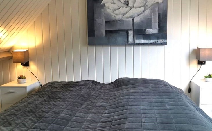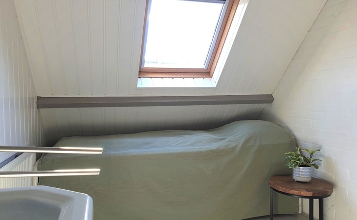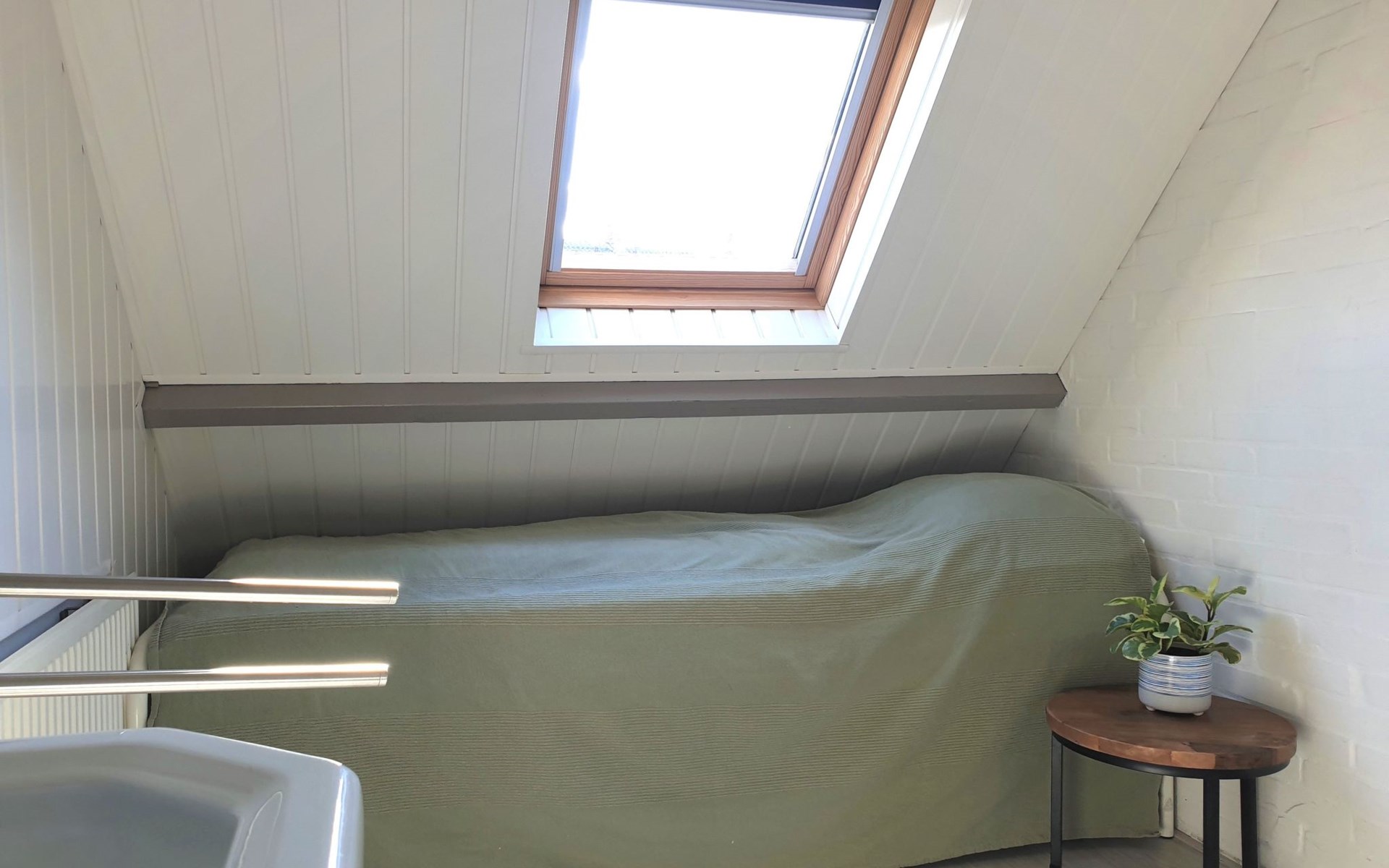 Im Sommerhaus, im Obergeschoss, haben wir ein vorderes Zimmer mit einem Einzelbett und ein Schlafzimmer mit 2 Einzelbetten. Die beiden Zimmer sind durch eine Verbindungstür getrennt.