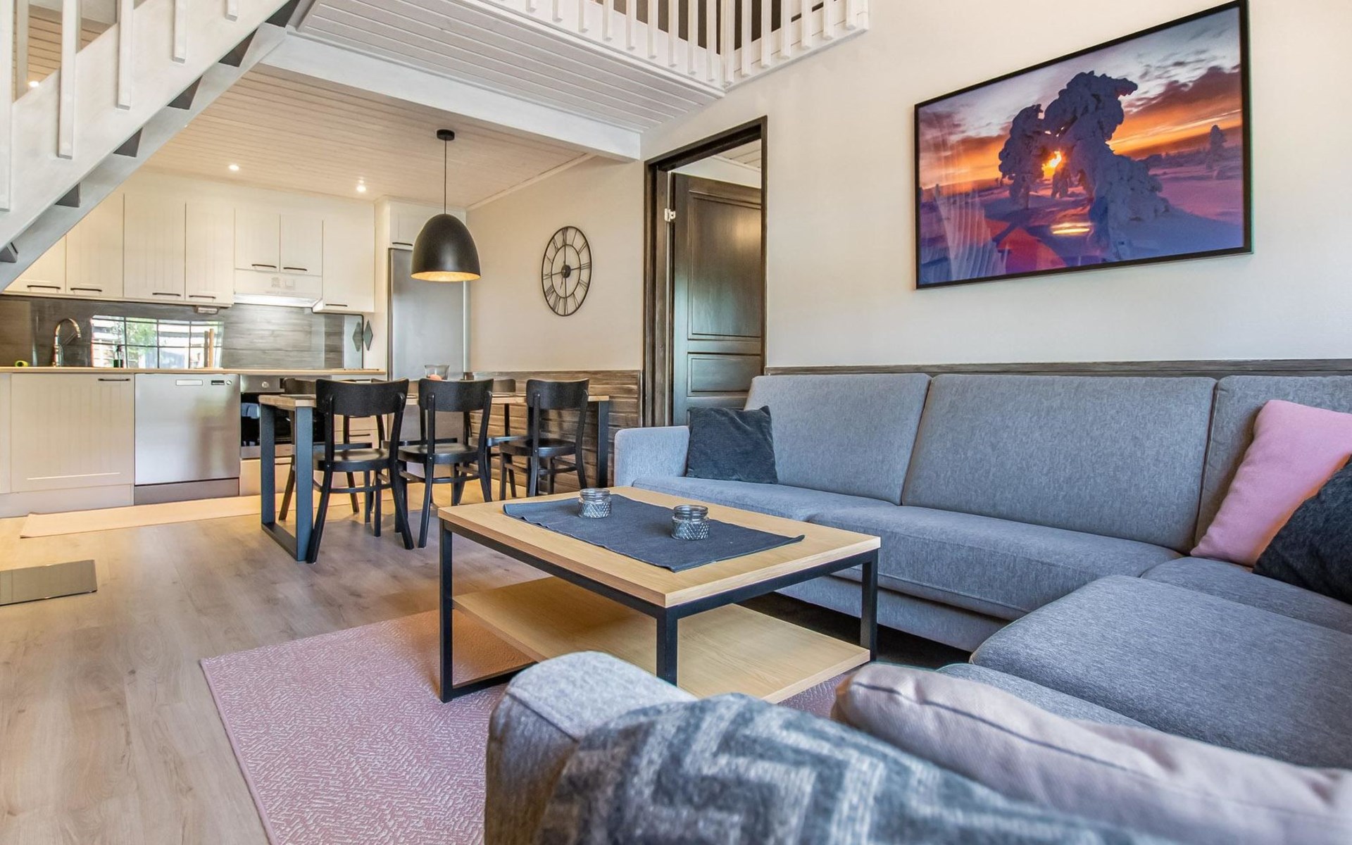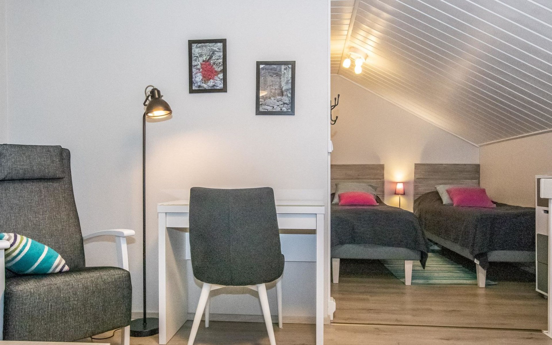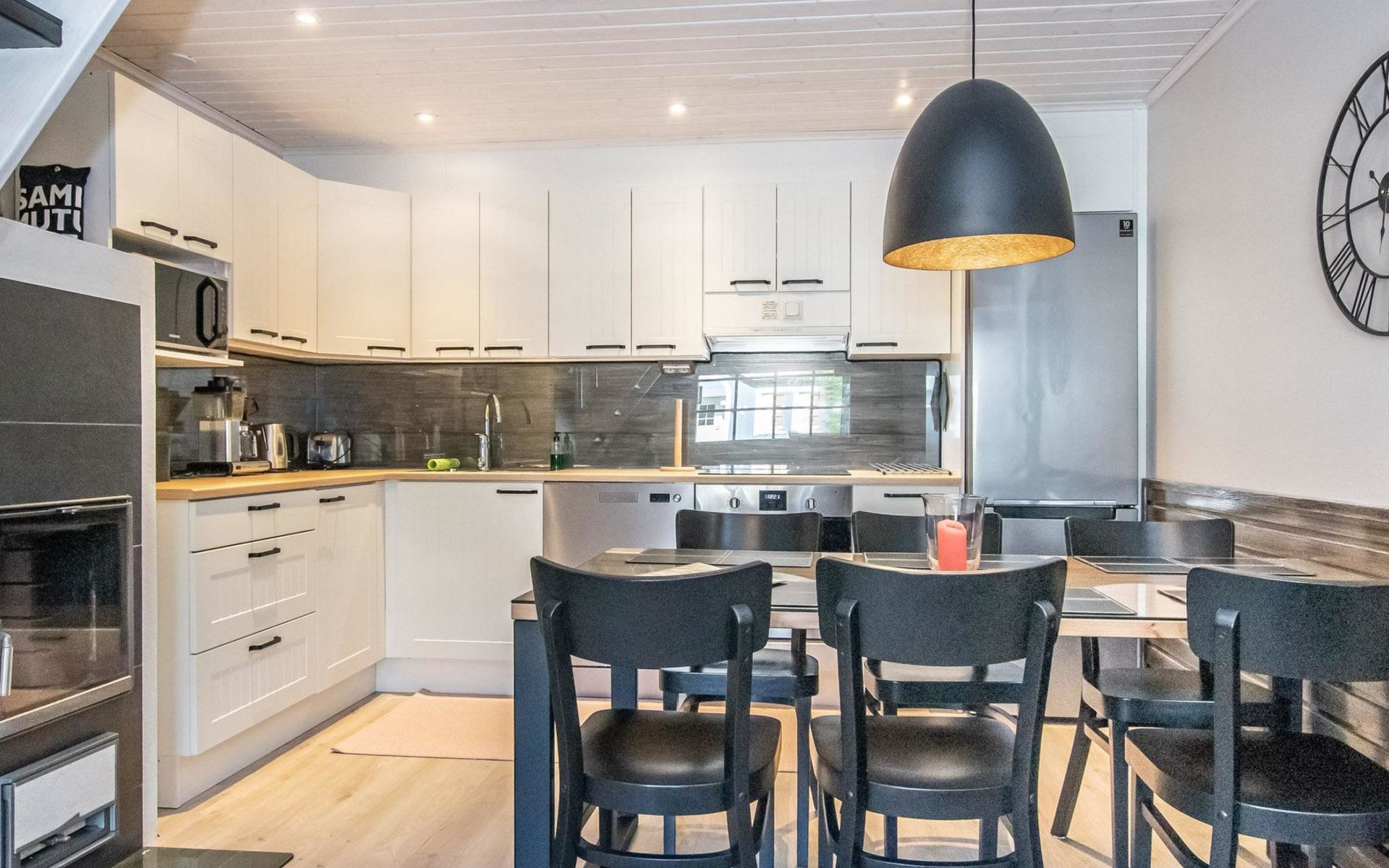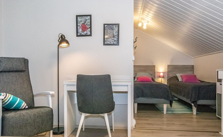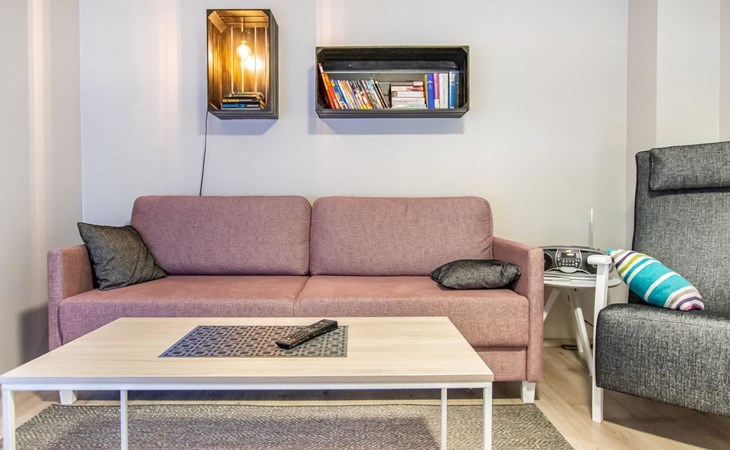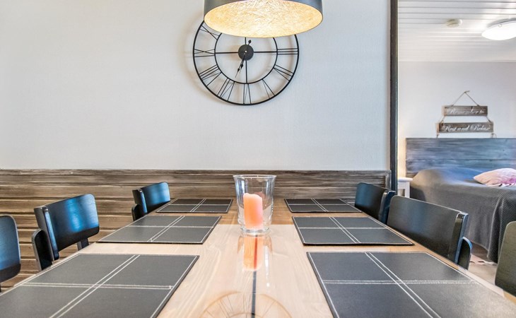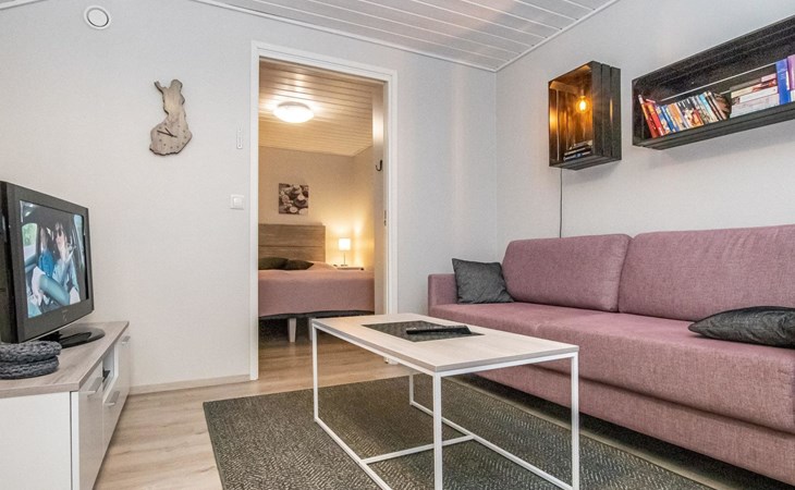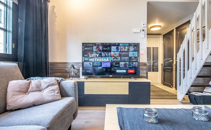 The apartment has a kitchen-living room, which conveniently connects the dining and lounge areas. On the living room side you can relax and watch TV. In the dining area you can enjoy the good atmosphere and the warmth of the fireplace.