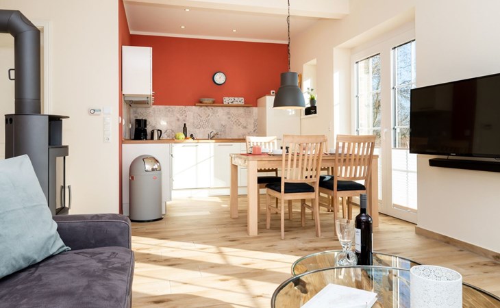 Im Inneren des Hauses erwartet Sie eine wohlige Atmosphäre, unterstützt durch die wärmende Fußbodenheizung, die in jedem Raum für Komfort sorgt. Die technische Ausstattung lässt ebenfalls keine Wünsche offen: Ein Smart-TV lädt zu entspannten Filmabenden ein, während die Waschmaschine zur alleinigen Nutzung sowie eine komplett ausgestattete Küche mit Cerankochfeld, Spülmaschine, Filter-Kaffeemaschine und Wasserkocher Ihnen den Alltag erleichtern. Nicht zu vergessen, der für kinderfreundliche Unterkünfte so wichtige Wickeltisch und der einladende Kamin, der für wohlige Wärme und Gemütlichkeit sorgt.